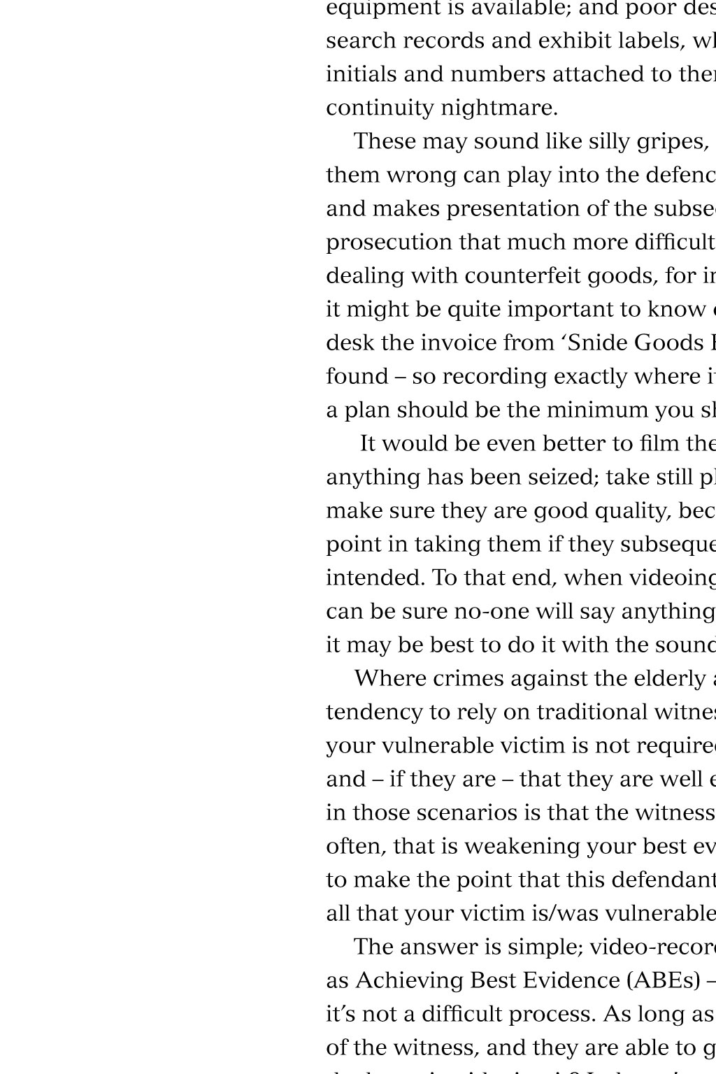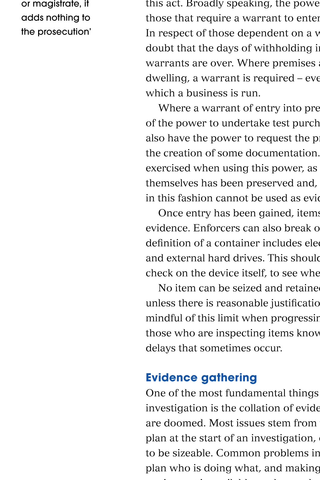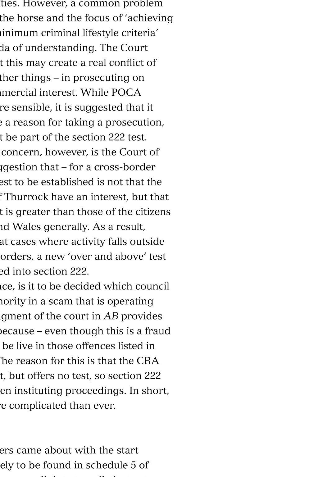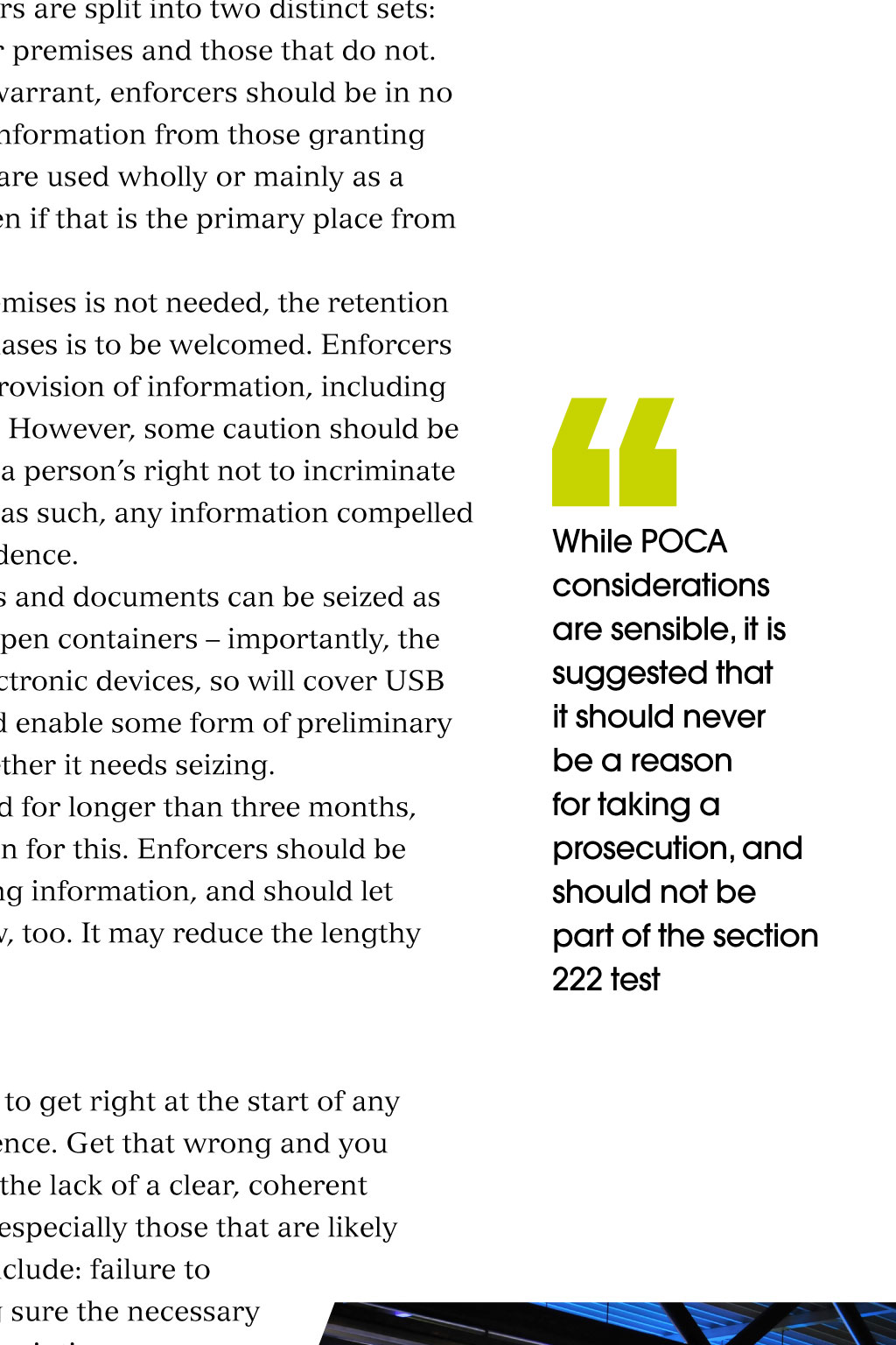 Plenary 3 Getting criminal investigations right in court first time In this feature l memoranda of understanding l cross-border cases CONFERENCE 2017 Start on the right track There are some common errors to avoid when bringing a case to court. Charlene Sumnall reports from the third plenary of Conference Now when looking at cases where activity falls outside the enforcer’s borders, a new ‘over and above’ test has been imported into section 222 Sumnall says: ‘The above is a good example of a poor photo that is neither “use nor ornament” in a criminal prosecution. The subject is supposed to be the clock – not that you can tell that’s what it is. Put before a jury or magistrate, it adds nothing to the prosecution’ Trading standards departments up and down the country are tasked with investigating and prosecuting all manner of offences on increasingly small budgets. As such, the pressure to ‘get it right’ – and get it right from the very start of an investigation – has never been greater. One of the rst things to consider is whether you have a right to bring the proceedings in the rst place. For years, the rst and last word on whether a council could bring enforcement proceedings for offences outside of their local boundaries started and ended with the provisions in section 222 of the Local Government Act 1972 (LGA 72) and the case law that owed from it. It was not always a straightforward issue, and getting it wrong could prove fatal to otherwise perfectly good and strong cases. However, hope was given by paragraph 46 of Schedule 5 of the Consumer Rights Act 2015 (CRA 15), which explicitly stated that ‘a weights and measures authority in England or Wales may bring proceedings for a consumer offence allegedly committed in a part of England or Wales which is outside that authority’s area’. But there was a catch: consumer offences are those explicitly listed in schedules 10 and 11 of the CRA 15, and that list has holes in it – probably the biggest being the lack of the Fraud Act 2006. Then along came the case of R v AB and others [2017] EWCA Crim 534, and headaches again abound. In short, Thurrock entered into an agreement with the Legal Aid Agency (LAA) to prosecute a large-scale fraud in which the LAA was the victim. The defendants – a solicitors’ rm specialising in immigration work – were not based in Thurrock, but in London. As this was a case concerning conspiracy to defraud, the CRA 15 – enabling proceedings to be brought outside of Thurrock’s area – could be of no assistance. The local authority correctly identi ed that it could only act if section 222 LGA 72 permitted such action. It entered into the normal memoranda of understanding that are routine between prosecuting authorities. However, a common problem arose: the cart was again put before the horse and the focus of ‘achieving the Proceeds of Crime Act (POCA) minimum criminal lifestyle criteria’ was mentioned within the memoranda of understanding. The Court of Appeal found that this may create a real con ict of interest – among other things – in prosecuting on the basis of a commercial interest. While POCA considerations are sensible, it is suggested that it should never be a reason for taking a prosecution, and should not be part of the section 222 test. Of greater concern, however, is the Court of Appeal’s suggestion that – for a cross-border case – the test to be established is not that the residents of Thurrock have an interest, but that their interest is greater than those of the citizens of England and Wales generally. As a result, when looking at cases where activity falls outside the enforcer’s borders, a new ‘over and above’ test has been imported into section 222. How, for instance, is it to be decided which council should be lead authority in a scam that is operating nationwide? The judgment of the court in AB provides no assistance, which is unfortunate because – even though this is a fraud case – the same issues may well now be live in those offences listed in schedules 10 and 11 of the CRA 15. The reason for this is that the CRA 15 permits cross-border enforcement, but offers no test, so section 222 LGA 72 still has to be considered when instituting proceedings. In short, section 222 is here to stay and is more complicated than ever. Powers The consolidation of enforcers’ powers came about with the start of CRA 15, and they are now all largely to be found in schedule 5 of this act. Broadly speaking, the powers are split into two distinct sets: those that require a warrant to enter premises and those that do not. In respect of those dependent on a warrant, enforcers should be in no doubt that the days of withholding information from those granting warrants are over. Where premises are used wholly or mainly as a dwelling, a warrant is required – even if that is the primary place from which a business is run. Where a warrant of entry into premises is not needed, the retention of the power to undertake test purchases is to be welcomed. Enforcers also have the power to request the provision of information, including the creation of some documentation. However, some caution should be exercised when using this power, as a person’s right not to incriminate themselves has been preserved and, as such, any information compelled in this fashion cannot be used as evidence. Once entry has been gained, items and documents can be seized as evidence. Enforcers can also break open containers – importantly, the de nition of a container includes electronic devices, so will cover USB and external hard drives. This should enable some form of preliminary check on the device itself, to see whether it needs seizing. No item can be seized and retained for longer than three months, unless there is reasonable justi cation for this. Enforcers should be mindful of this limit when progressing information, and should let those who are inspecting items know, too. It may re