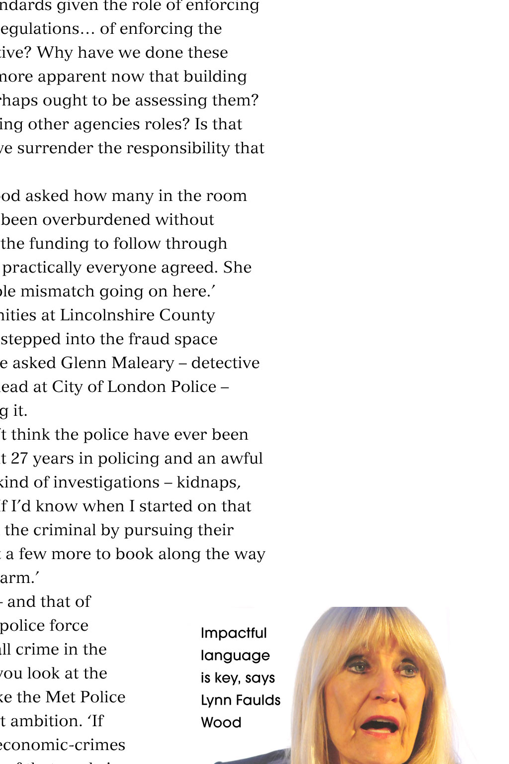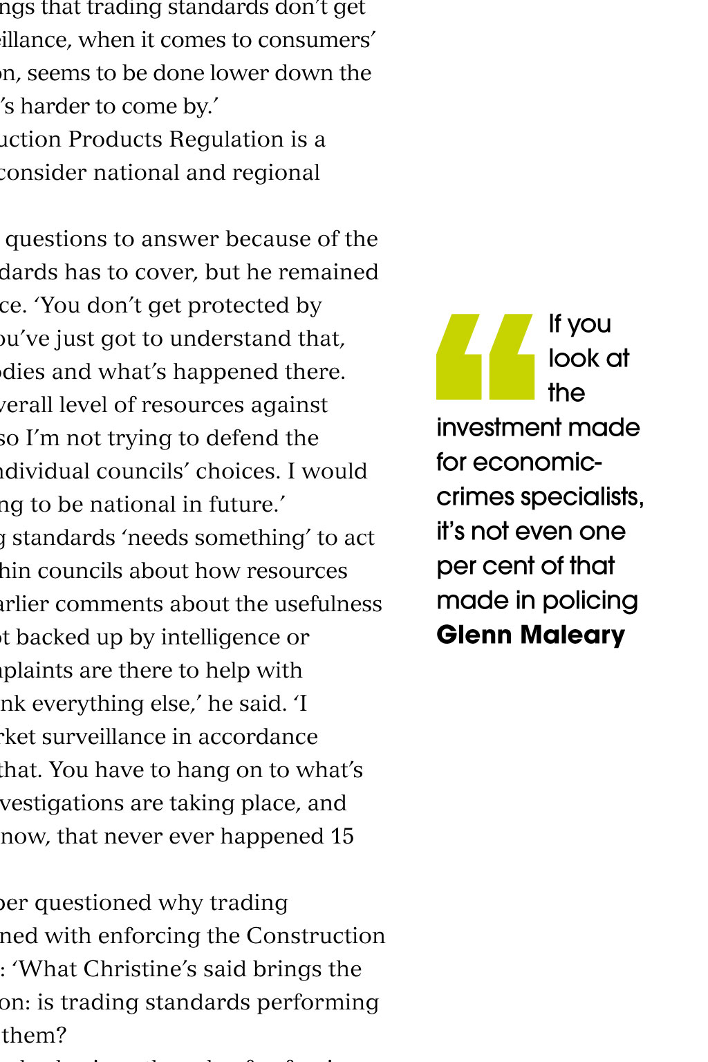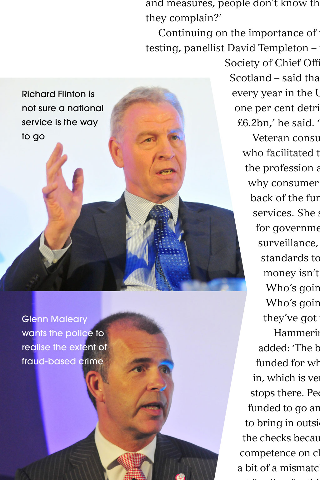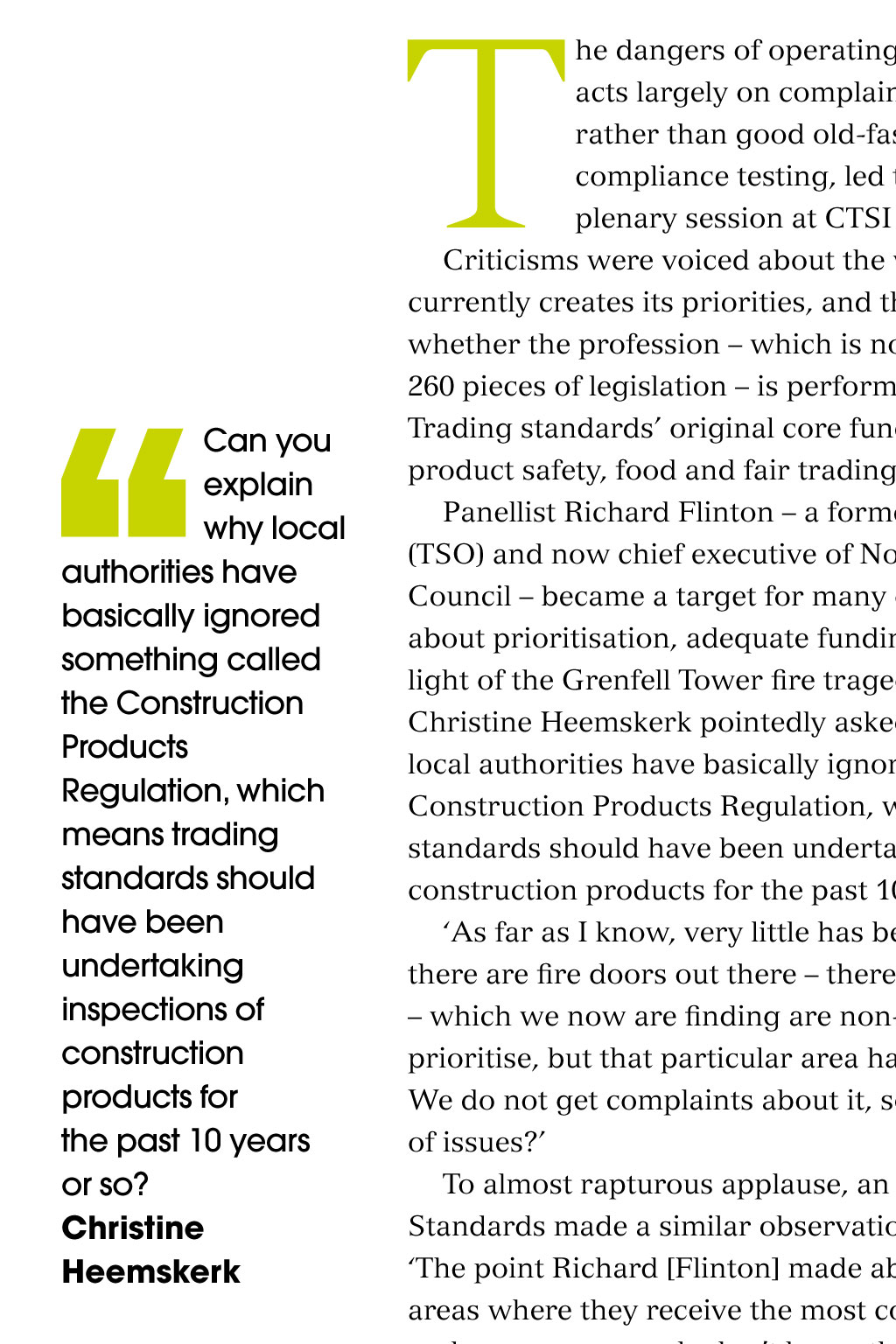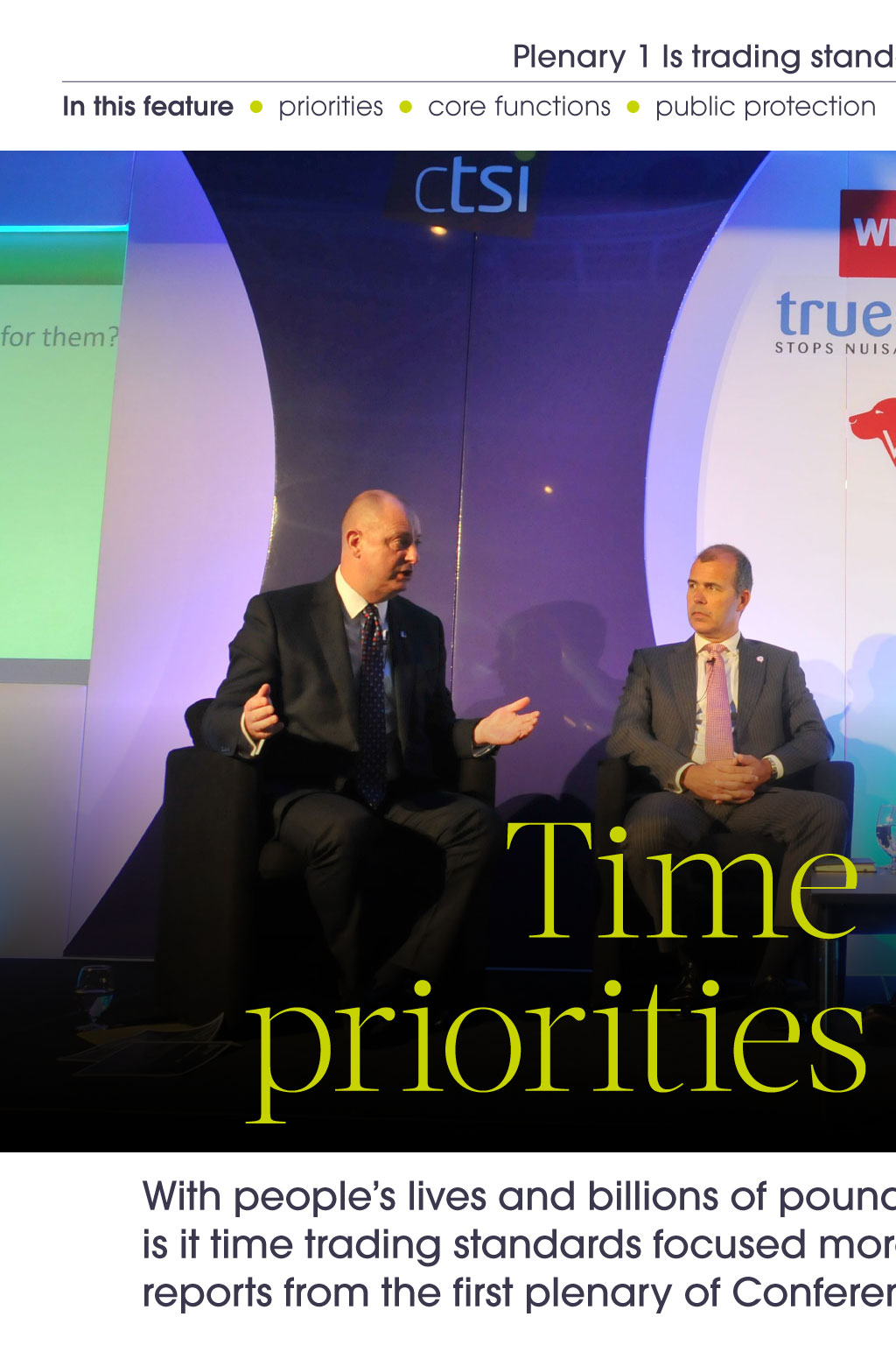 Plenary 1 Is trading standards performing other agencies’ roles? In this feature l priorities l core functions l public protection CONFERENCE 2017 Time to get our priorities straight? With people’s lives and billions of pounds from the UK economy at stake, is it time trading standards focused more on its core functions? Carina Bailey reports from the first plenary of Conference The dangers of operating a trading standards system that acts largely on complaints and intelligence-led priorities, rather than good old-fashioned inspection and compliance testing, led to a lively debate during the rst plenary session at CTSI Conference in Harrogate. Criticisms were voiced about the way trading standards currently creates its priorities, and there was discussion about whether the profession – which is now responsible for more than 260 pieces of legislation – is performing other agencies’ roles. Trading standards’ original core functions were legal metrology, product safety, food and fair trading. Panellist Richard Flinton – a former trading standards of cer (TSO) and now chief executive of North Yorkshire County Council – became a target for many questions from the oor about prioritisation, adequate funding and resourcing. In light of the Grenfell Tower re tragedy, product-safety expert Christine Heemskerk pointedly asked: ‘Can you explain why local authorities have basically ignored something called the Construction Products Regulation, which means trading standards should have been undertaking inspections of construction products for the past 10 years or so? ‘As far as I know, very little has been undertaken, yet there are re doors out there – there are panels out there – which we now are nding are non-compliant. I know you have to prioritise, but that particular area has really seen no action whatsoever. We do not get complaints about it, so how will you prioritise those sorts of issues?’ To almost rapturous applause, an of cer from Derby Trading Standards made a similar observation, but about weights and measures: ‘The point Richard [Flinton] made about resources being directed to areas where they receive the most complaints – well, with weights and measures, people don’t know they’re being ripped off, so how can they complain?’ Continuing on the importance of weights and measures compliance testing, panellist David Templeton – metrology lead of cer for the Society of Chief Of cers of Trading Standards in Scotland – said that the of cial value of goods traded every year in the UK is £622bn. ‘If there was just a one per cent detriment element in that gure, that’s £6.2bn,’ he said. ‘Why are we ignoring that?’ Veteran consumer champion Lynn Faulds Wood, who facilitated the debate, appeared to defend the profession a number of times, querying why consumer protection seemed to fall to the back of the funding queue compared to other services. She said: ‘When I was doing the review for government, and talking about market surveillance, councils often won’t pay for trading standards to make those solutions because the money isn’t around at the moment to do it. Who’s going to take on Whirlpool or Beko? Who’s going to prosecute them – because they’ve got very deep pockets.’ Hammering home her point, Faulds Wood added: ‘The building control people, they get funded for what they do, and they take the money in, which is very nice – but then their responsibility stops there. People like Christine, they don’t get funded to go and do the checks. Maybe they have to bring in outsiders – who they have to pay to do the checks because they don’t have that level of competence on cladding or whatever. So, there seems a bit of a mismatch going on here – health and safety get funding for things that trading standards don’t get at all. Market surveillance, when it comes to consumers’ safety and protection, seems to be done lower down the pile, and the funding’s harder to come by.’ Heemskerk suggested the Construction Products Regulation is a good example of where it is time to consider national and regional enforcement of regulations. Flinton admitted they were tough questions to answer because of the ‘sheer breadth’ of what trading standards has to cover, but he remained wary about creating a national service. ‘You don’t get protected by moving to another level,’ he said. ‘You’ve just got to understand that, I think, by looking at other public bodies and what’s happened there. There is clearly an issue about the overall level of resources against such a spectrum of responsibilities, so I’m not trying to defend the government or anything – or even individual councils’ choices. I would just be wary about wishing everything to be national in future.’ Flinton also suggested that trading standards ‘needs something’ to act as a ‘wake up to decision-makers within councils about how resources are allocated’, and he defended his earlier comments about the usefulness of lots of compliance testing that’s not backed up by intelligence or complaints. ‘I think it’s right that complaints are there to help with prioritisation, but I didn’t say we’d junk everything else,’ he said. ‘I talked about being able to do the market surveillance in accordance with that core work. I absolutely get that. You have to hang on to what’s good about the profession as well. Investigations are taking place, and prosecutions are happening now, that never ever happened 15 years ago.’ Another audience member questioned why trading standards had been burdened with enforcing the Construction Products Regulation at all: ‘What Christine’s said brings the debate back to the question: is trading standards performing other agencies’ roles for them? ‘Why was trading standards given the role of enforcing Construction Product Regulations... of enforcing the Recreation Craft Directive? Why have we done these things when 