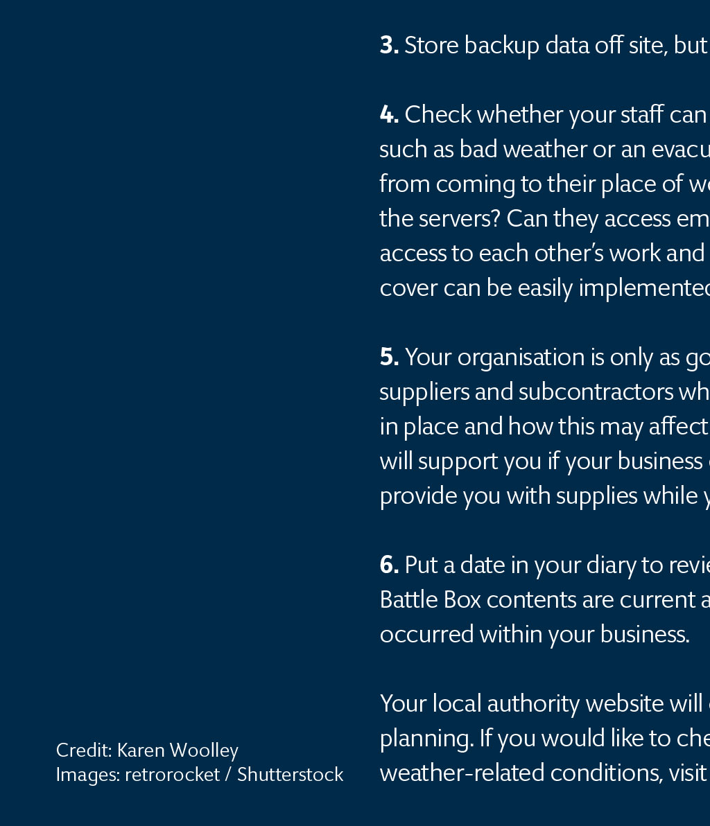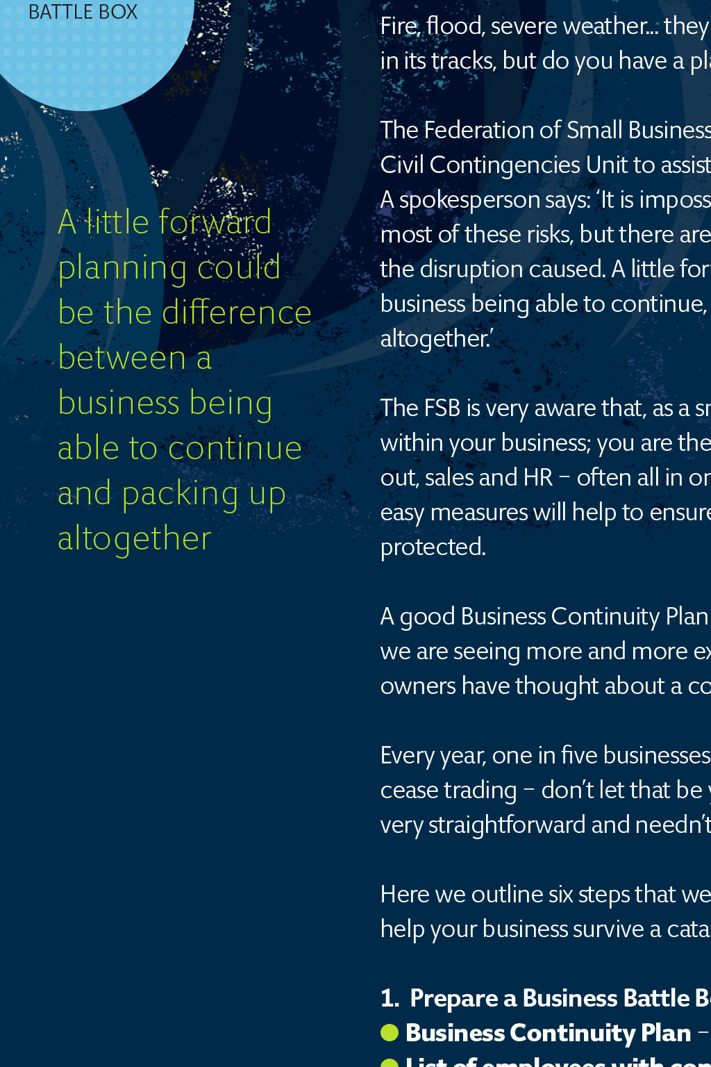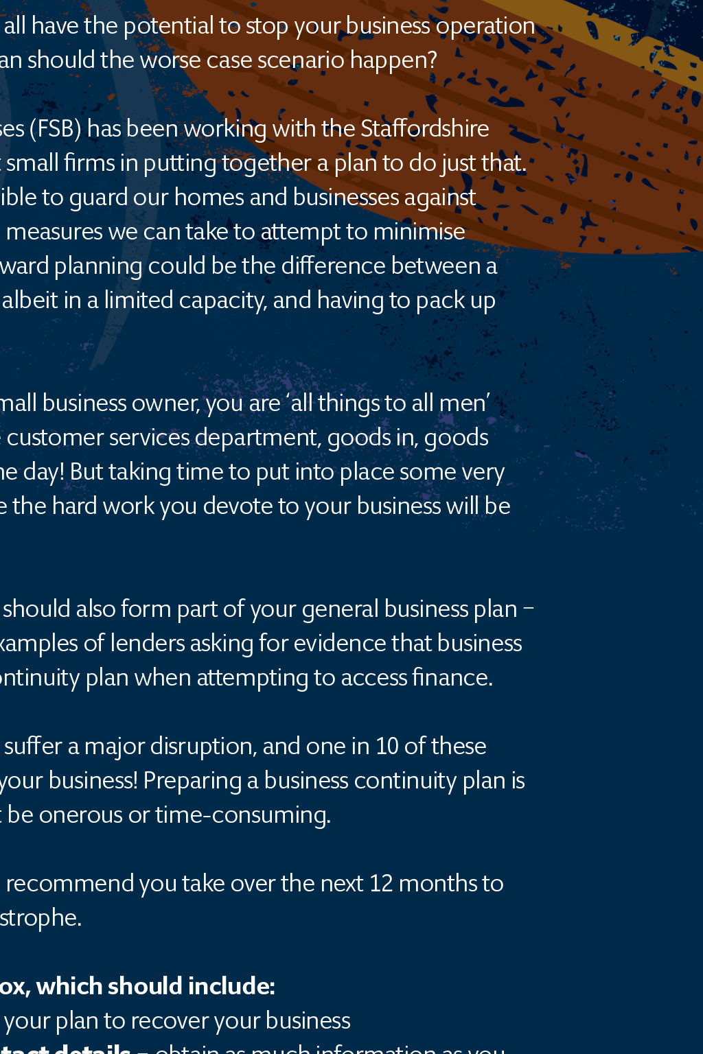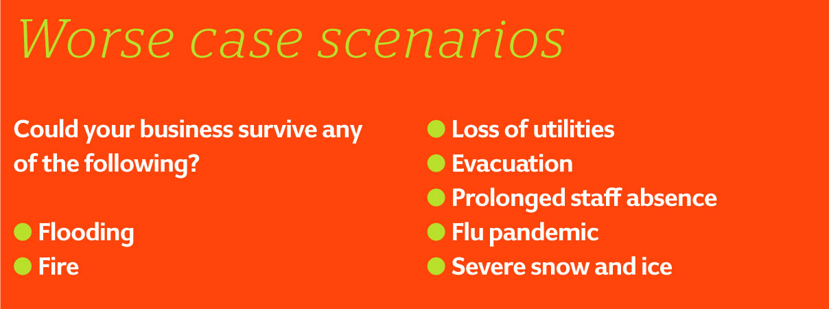autumn 2015 BUSINESS BATTLE BOx WEatHErInG tHE Storm Do you have a plan to stay in business should the worst happen? BUSINESS BATTLE BOx Fire, flood, severe weather... they all have the potential to stop your business operation in its tracks, but do you have a plan should the worse case scenario happen? The Federation of Small Businesses (FSB) has been working with the Staffordshire Civil Contingencies Unit to assist small firms in putting together a plan to do just that. A spokesperson says: It is impossible to guard our homes and businesses against most of these risks, but there are measures we can take to attempt to minimise the disruption caused. A little forward planning could be the difference between a business being able to continue, albeit in a limited capacity, and having to pack up altogether. A little forward planning could be the difference between a business being able to continue and packing up altogether The FSB is very aware that, as a small business owner, you are all things to all men within your business; you are the customer services department, goods in, goods out, sales and HR often all in one day! But taking time to put into place some very easy measures will help to ensure the hard work you devote to your business will be protected. A good Business Continuity Plan should also form part of your general business plan we are seeing more and more examples of lenders asking for evidence that business owners have thought about a continuity plan when attempting to access finance. Every year, one in five businesses suffer a major disruption, and one in 10 of these cease trading dont let that be your business! Preparing a business continuity plan is very straightforward and neednt be onerous or time-consuming. Here we outline six steps that we recommend you take over the next 12 months to help your business survive a catastrophe. 1. prepare a business battle box, which should include: l Business Continuity Plan your plan to recover your business l List of employees with contact details obtain as much information as you can, include email addresses and next-of-kin details l List of customer and supplier details l Insurance company details and your insurance certificate, along with copies of certificates for other business-related insurances you hold (for example, public/employer liability) l Financial and banking information l Contact details, including account numbers, for utility companies l Latest stock and equipment inventory l Formulas and trade secrets l Headed stationery l Building site plan, including location of gas, electricity and water shut-off points l Engineering plans and drawings l Local Authority contact details WoRSe CaSe SCenaRIoS You should also include: computer back-up disks/USB sticks to ensure you can plug and trade at a different location; spare keys/security codes/disposable camera, which can be useful for recording evidence in an insurance claim. This is not an exhaustive list, there may be other documents/items/equipment specific to your business that need to be included. But working through this list will help you to identify other items of importance. Make sure this box is secure and kept off site, and check the box every six to 12 months. 2. Identify the critical activities for your business that need to continue during an emergency, such as payroll, then identify the employees or other input to support that activity. Ensure that they are not a Single Point of Failure that is, a part of a system that, if it fails, will stop the entire system from working. If necessary, train other staff in these procedures so they can act as a backup when others are absent. 3. Store backup data off site, but ensure that all staff know the secondary location. 4. Check whether your staff can work remotely if an incident, such as bad weather or an evacuation event, prevents them from coming to their place of work. Do they need access to the servers? Can they access emails? Ensure that all staff have access to each others work and stored documents so that cover can be easily implemented. fInd out moRe Should you wish to discuss emergency planning and business continuity issues further, contact Karen Woolley on 01332 517176 or via email. 5. Your organisation is only as good as those on whom it depends. Discuss with your suppliers and subcontractors whether they have a robust business continuity plan in place and how this may affect your business. Also, discuss with them how they will support you if your business experiences an emergency for example, will they provide you with supplies while you get things up and running again? 6. Put a date in your diary to review these steps every six to 12 months, to ensure your Battle Box contents are current and still in line with any changes that might have occurred within your business. Credit: Karen Woolley Images: retrorocket / Shutterstock Your local authority website will carry further advice and information on emergency planning. If you would like to check the risks to your premises from flooding and other weather-related conditions, visit the Environment Agencys website. Worse case scenarios Could your business survive any of the following? l flooding l fire l loss of utilities l evacuation l prolonged staff absence l flu pandemic l Severe snow and ice