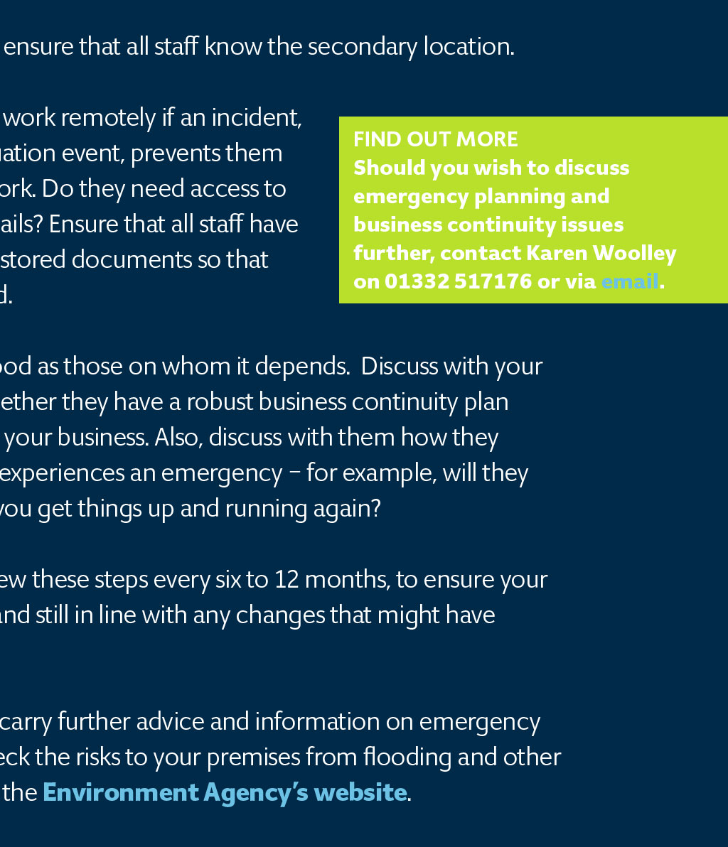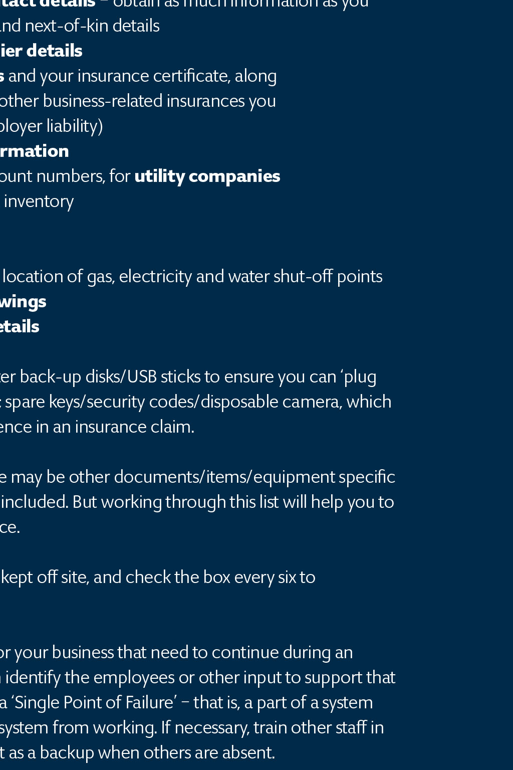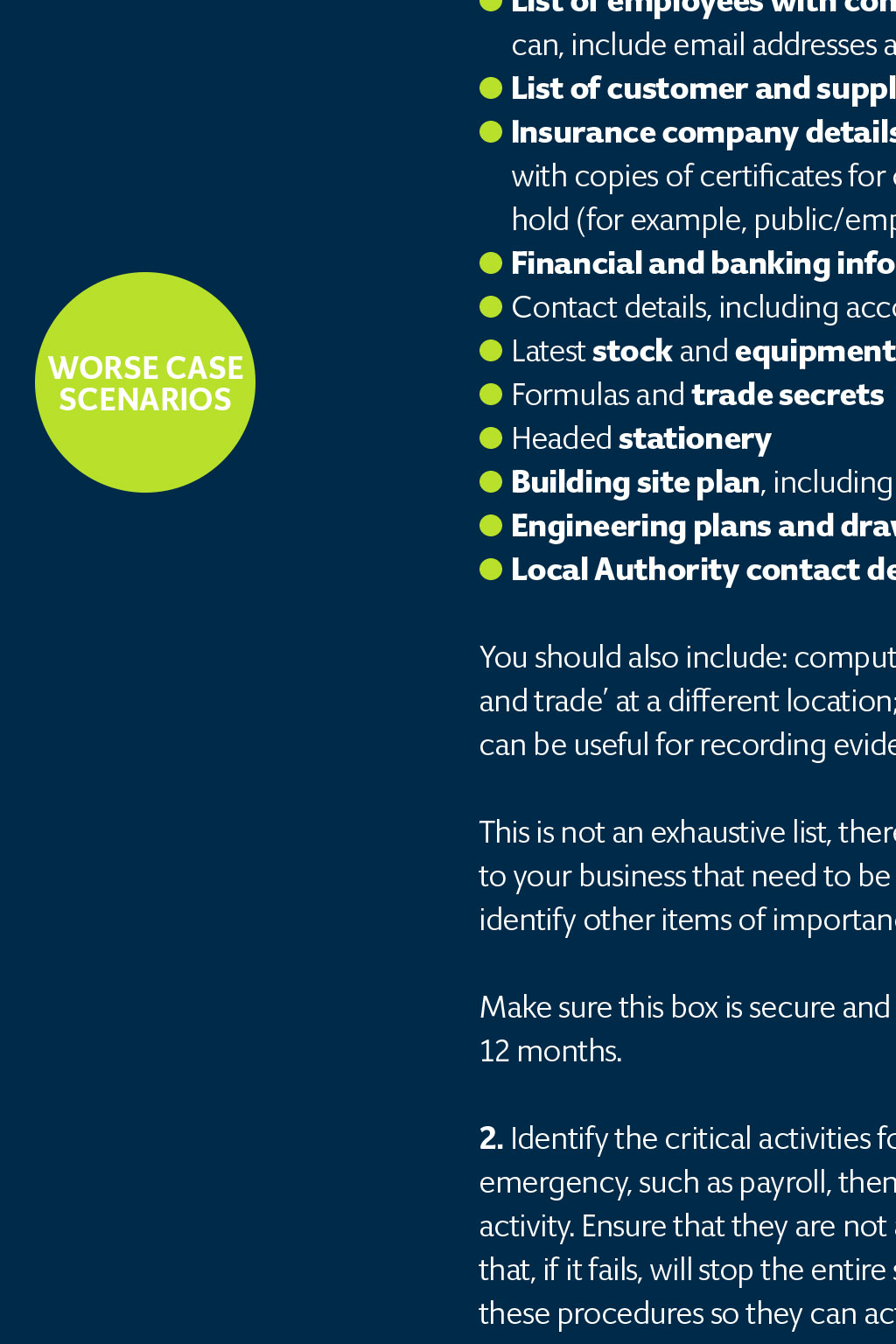 autumn 2015 BUSINESS BATTLE BOx WEatHErInG tHE Storm Do you have a plan to stay in business should the worst happen? BUSINESS BATTLE BOx Fire, flood, severe weather... they all have the potential to stop your business operation in its tracks, but do you have a plan should the worse case scenario happen? The Federation of Small Businesses (FSB) has been working with the Staffordshire Civil Contingencies Unit to assist small firms in putting together a plan to do just that. A spokesperson says: It is impossible to guard our homes and businesses against most of these risks, but there are measures we can take to attempt to minimise the disruption caused. A little forward planning could be the difference between a business being able to continue, albeit in a limited capacity, and having to pack up altogether. A little forward planning could be the difference between a business being able to continue and packing up altogether The FSB is very aware that, as a small business owner, you are all things to all men within your business; you are the customer services department, goods in, goods out, sales and HR often all in one day! But taking time to put into place some very easy measures will help to ensure the hard work you devote to your business will be protected. A good Business Continuity Plan should also form part of your general business plan we are seeing more and more examples of lenders asking for evidence that business owners have thought about a continuity plan when attempting to access finance. Every year, one in five businesses suffer a major disruption, and one in 10 of these cease trading dont let that be your business! Preparing a business continuity plan is very straightforward and neednt be onerous or time-consuming. Here we outline six steps that we recommend you take over the next 12 months to help your business survive a catastrophe. 1. prepare a business battle box, which should include: l Business Continuity Plan your plan to recover your business l List of employees with contact details obtain as much information as you can, include email addresses and next-of-kin details l List of customer and supplier details l Insurance company details and your insurance certificate, along with copies of certificates for other business-related insurances you hold (for example, public/employer liability) l Financial and banking information l Contact details, including account numbers, for utility companies l Latest stock and equipment inventory l Formulas and trade secrets l Headed stationery l Building site plan, including location of gas, electricity and water shut-off points l Engineering plans and drawings l Local Authority contact details WoRSe CaSe SCenaRIoS You should also include: computer back-up disks/USB sticks to ensure you can plug and trade at a different location; spare keys/security codes/disposable camera, which can be useful for recording evidence in an insurance claim. This is not an exhaustive list, there may be other documents/items/equipment specific to your business that need to be included. But working through this list will help you to identify other items of importance. Make sure this box is secure and kept off site, and check the box every six to 12 months. 2. Identify the critical activities for your business that need to continue during an emergency, such as payroll, then identify the employees or other input to support that activity. Ensure that they are not a Single Point of Failure that is, a part of a system that, if it fails, will stop the entire system from working. If necessary, train other staff in these procedures so they can act as a backup when others are absent. 3. Store backup data off site, but ensure that all staff know the secondary location. 4. Check whether your staff can work remotely if an incident, such as bad weather or an evacuation event, prevents them from coming to their place of work. Do they need access to the servers? Can they access emails? Ensure that all staff have access to each others work and stored documents so that cover can be easily implemented. fInd out moRe Should you wish to discuss emergency planning and business continuity issues further, contact Karen Woolley on 01332 517176 or via email. 5. Your organisation is only as good as those on whom it depends. Discuss with your suppliers and subcontractors whether they have a robust business continuity plan in place and how this may affect your business. Also, discuss with them how they will support you if your business experiences an emergency for example, will they provide you with supplies while you get things up and running again? 6. Put a date in your diary to review these steps every six to 12 months, to ensure your Battle Box contents are current and still in line with any changes that might have occurred within your business. Credit: Karen Woolley Images: retrorocket / Shutterstock Your local authority website will carry further advice and information on emergency planning. If you would like to check the risks to your premises from flooding and other weather-related conditions, visit the Environment Agencys website. Worse case scenarios Could your business survive any of the following? l flooding l fire l loss of utilities l evacuation l prolonged staff absence l flu pandemic l Severe snow and ice