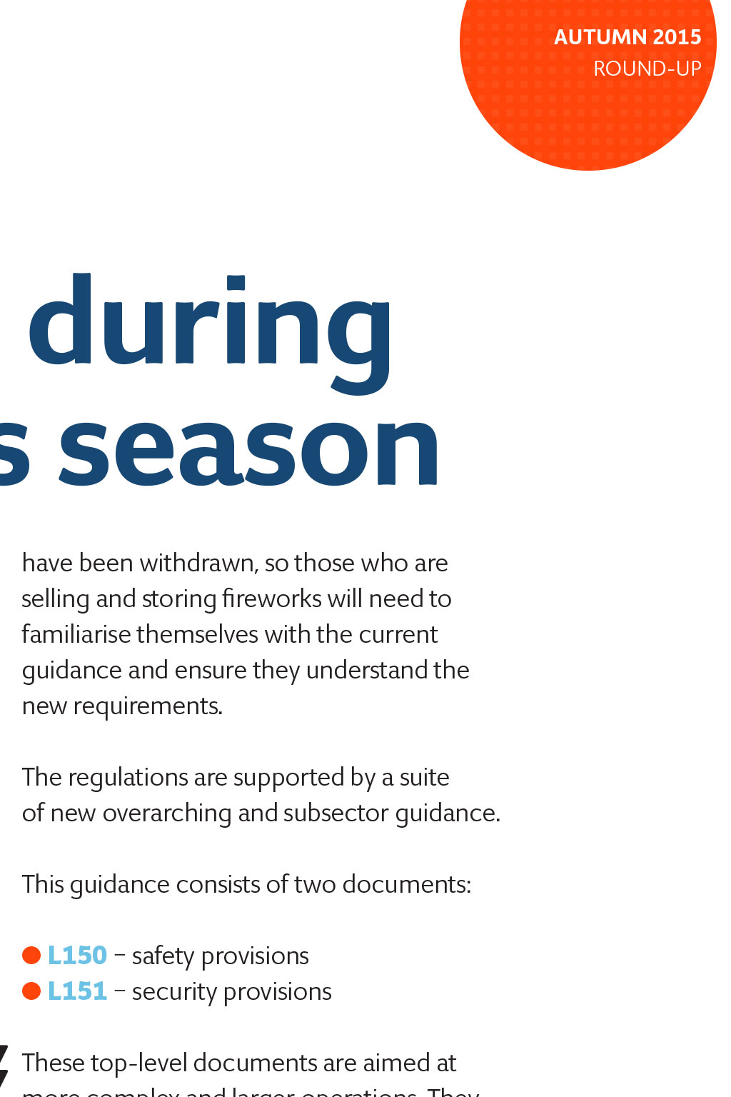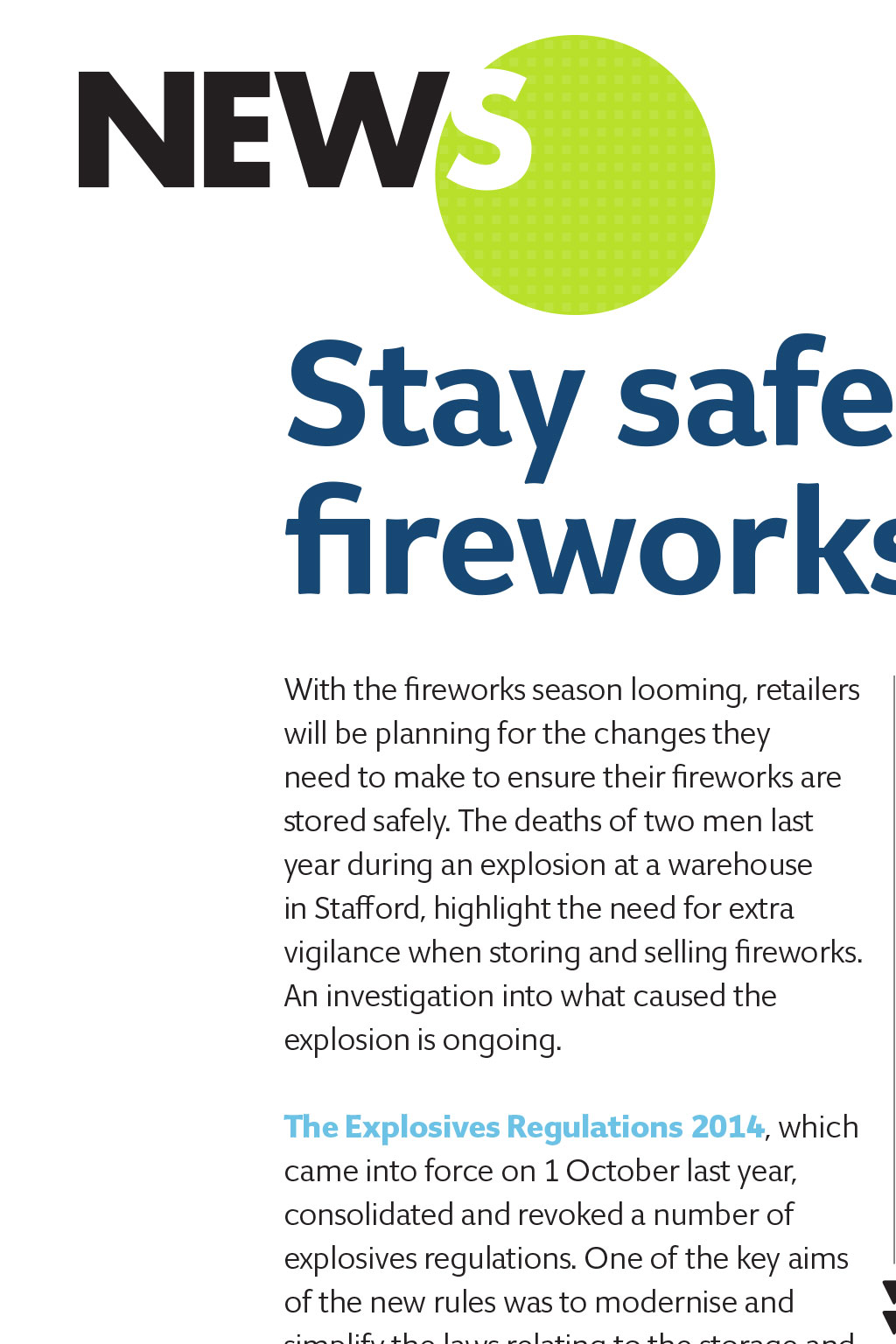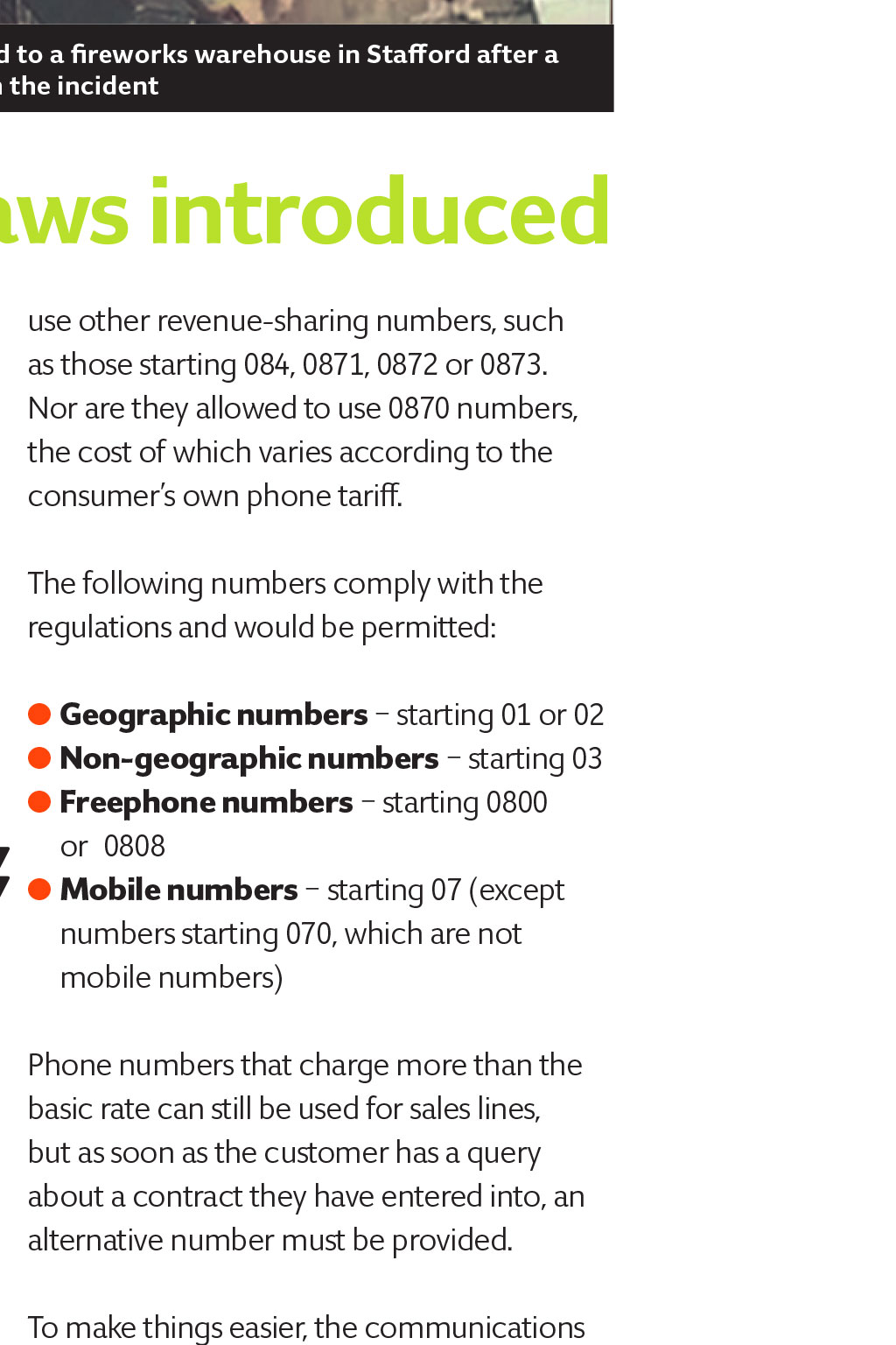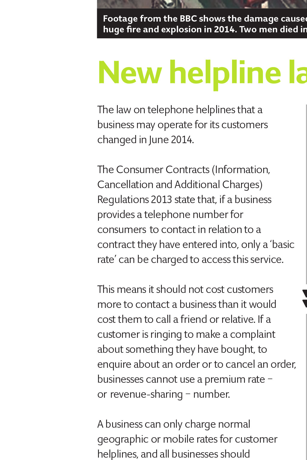autumn 2015 ROUND-UP Stay safe during fireworks season With the fireworks season looming, retailers will be planning for the changes they need to make to ensure their fireworks are stored safely. The deaths of two men last year during an explosion at a warehouse in Stafford, highlight the need for extra vigilance when storing and selling fireworks. An investigation into what caused the explosion is ongoing. have been withdrawn, so those who are selling and storing fireworks will need to familiarise themselves with the current guidance and ensure they understand the new requirements. The regulations are supported by a suite of new overarching and subsector guidance. This guidance consists of two documents: The Explosives Regulations 2014, which came into force on 1 October last year, consolidated and revoked a number of explosives regulations. One of the key aims of the new rules was to modernise and simplify the laws relating to the storage and manufacture of explosives. ROUND-UP The regulations brought together the requirements of health and safety-related explosives legislation, into a framework based around common topics, such as authorisation, safety, security and placing products on the market. The approved codes of practice provided under the old regulations the Manufacture and Storage of Explosives Regulations 2005 l L150 safety provisions l L151 security provisions These top-level documents are aimed at more complex and larger operations. They also contain overarching technical guidance and background information that will help all duty holders to comply with the safety and security provisions in the regulations. Anyone storing or selling fireworks should contact their Local Trading Standards Service or Local Fire Service to obtain further advice. Credit: Tony Shore Images: BBC News Credit: Stuart Powell Images: Ryan Ladbrook / Shutterstock footage from the bbC shows the damage caused to a fireworks warehouse in Stafford after a huge fire and explosion in 2014. two men died in the incident new helpline laws introduced The law on telephone helplines that a business may operate for its customers changed in June 2014. The Consumer Contracts (Information, Cancellation and Additional Charges) Regulations 2013 state that, if a business provides a telephone number for consumersto contact in relation to a contract they have entered into, only a basic rate can be charged to access this service. This means it should not cost customers more to contact a business than it would cost them to call a friend or relative. If a customer is ringing to make a complaint about something they have bought, to enquire about an order or to cancel an order, businesses cannot use a premium rate or revenue-sharing number. A business can only charge normal geographic or mobile rates for customer helplines, and all businesses should check carefully whether their phone line costs consumers more than basic rates. Consumers who are charged more than the basic rate are entitled to claim back any overcharge. In addition to numbers beginning 09, business helplines are not permitted to use other revenue-sharing numbers, such as those starting 084, 0871, 0872 or 0873. Nor are they allowed to use 0870 numbers, the cost of which varies according to the consumers own phone tariff. The following numbers comply with the regulations and would be permitted: l Geographic numbers starting 01 or 02 l Non-geographic numbers starting 03 l Freephone numbers starting 0800 or0808 l Mobile numbers starting 07 (except numbers starting 070, which are not mobile numbers) Phone numbers that charge more than the basic rate can still be used for sales lines, but as soon as the customer has a query about a contract they have entered into, an alternative number must be provided. To make things easier, the communications regulator in the UK, Ofcom, has ensured that anyone wishing to change from an 0845 number can have access to an 0345, so the only change necessary is the substitution of the digit 3 for 8 in the prefix. Credit: Sylvia Rook Images: La1n / Shutterstock ConSumeR RIghtS aCt RemIndeR Businesses are reminded that they have until 1 October 2015 to implement the new provisions outlined in the Consumer Rights Act 2015. To find out more, and to learn how these changes may affect you, see the Bytes and rights article published in the Summer 2015 edition of TSBN.