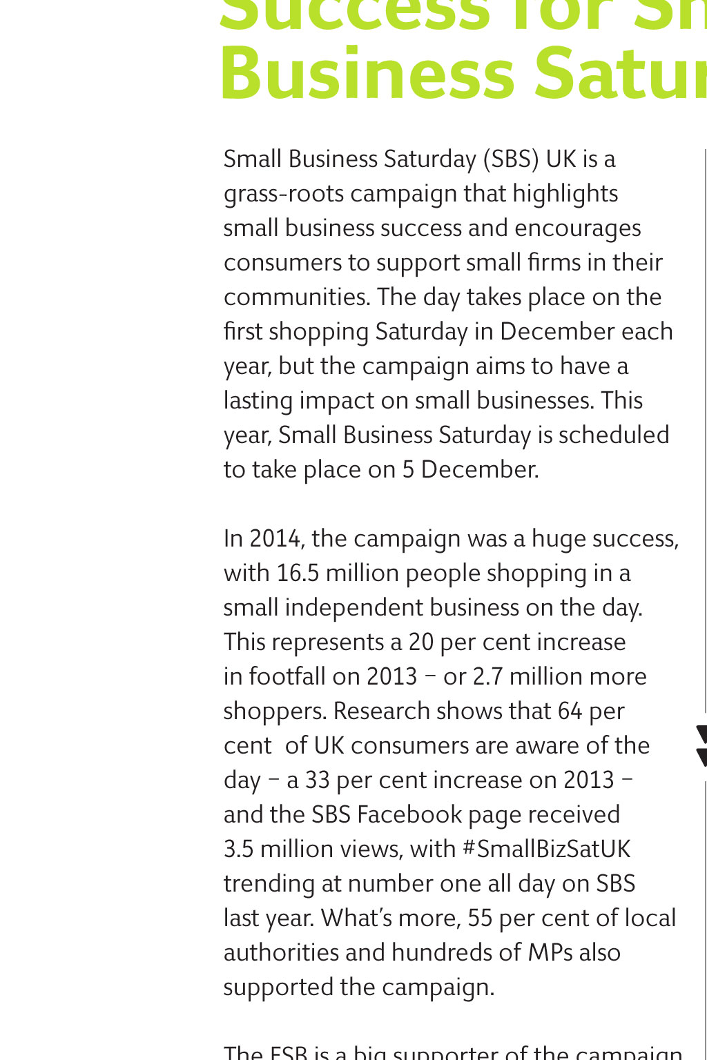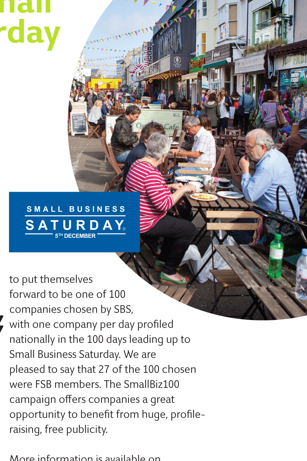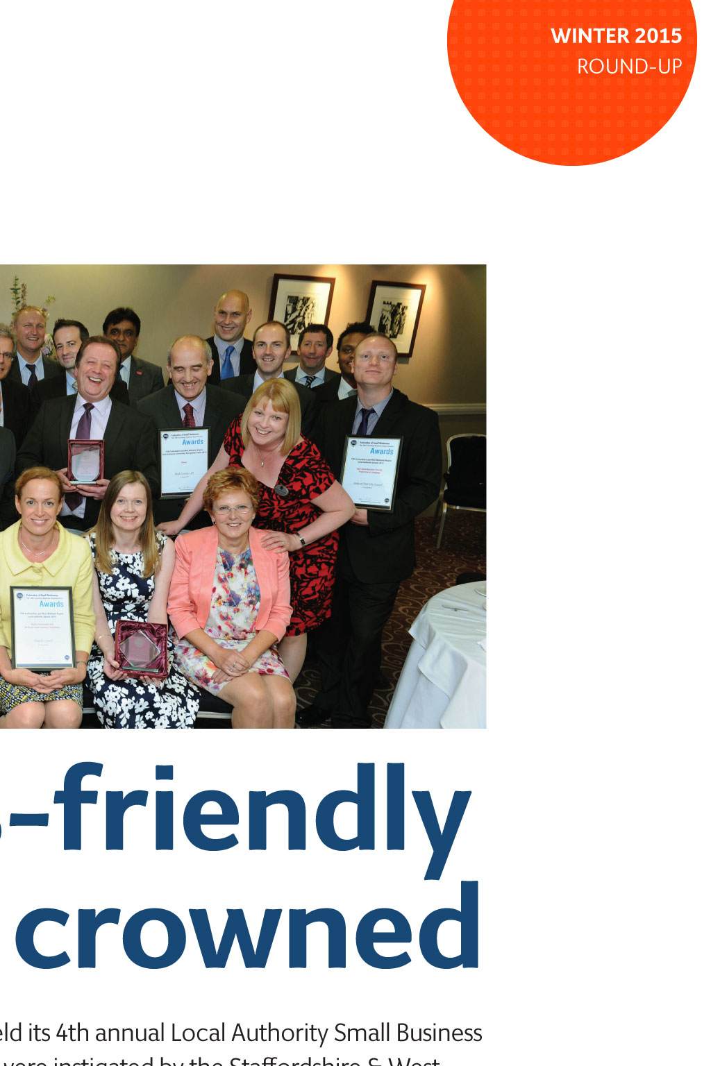 The Federation of Small Businesses (FSB) held its 4th annual Local Authority Small Business Friendly Awards in October. The accolades were instigated by the Staffordshire & West Midlands region of the FSB, to recognise and celebrate the great – often unsung – work of the 14 local authorities across the region on behalf of its members and other small businesses. This year, they incorporated a special Local Enterprise Partnership (LEP) recognition award to highlight the close working relationship the FSB has – not only with the councils, but also with LEPs in the region. The winners of the Local Authority Awards were: l Best Small Business-friendly rocurement Policy – Sandwell Metropolitan Borough Council l Best Small Business-friendly Programme or Campaign – Stoke-on-Trent City Council. Highly commended awards in this section went to Dudley Metropolitan Borough Council, Walsall Council and Wolverhampton City Council l Best All-round Small Business-Friendliness – Tamworth Borough Council. A highly commended award went to Walsall Council The LEP Recognition Award went to the Black Country LEP, with a highly commended award going to the Stoke & Staffordshire LEP. Karen Woolley, development manager for the FSB, said: ‘Yet again, we were put through our paces in judging the entries this year, such was the outstanding calibre of the projects and campaigns put forward. As a result, we awarded a number of highly commended awards – in addition to our winners – to enable us officially to recognise the truly excellent work that is being delivered by our crucial partners across the region. ‘This year, we also invited our three Local Enterprise Partnerships to put forward up to three projects each that had been specifically designed to encourage and support micro and small businesses; also that had not only considered – but positively succeeded in – supporting and developing the local small business community. Again, the calibre of the projects was staggering. ‘What has become clear through this awards process, year on year, is that – even though public sector budgets are being squeezed, and resources are diminishing – the FSB’s engagement with the local authorities across the region continues to go from strength to strength. Our relationship with the LEPs has also gathered momentum and we can confidently say we are pleased and proud to be in partnership with them. The commitment and drive among all of our crucial partners to help small businesses to survive and prosper has never been more evident than through these awards. ‘It is great to see that the projects awarded at this event covered four of the FSB’s five main lobbying priorities: procurement (celebrating the contribution made by small firms and encouraging consumers and commissioners to think small first); business support (creating the right onditions for businesses to start up and grow); employability and skills (ensuring local labour markets serve the interests of small businesses); and rural and town centres (developing the right local conditions to support businesses in rural and urban areas). This tells us that all of our partners understand the needs and barriers to growth for our members and other small firms – and it is incredibly reassuring to see the amount of work and effort going into these key areas. ‘It gave us immense pleasure to recognise the incredible hard work that goes on to ensure that the life blood of our local economies not only survive, but thrive. We thank all of the councils and LEPs that put forward nominations. We can’t wait to see what they come up with next year!’ winter 2015 Round-up Business-friendly councils crowned Success for Small Business Saturday Small Business Saturday (SBS) UK is a grass-roots campaign that highlights small business success and encourages consumers to support small firms in their communities. The day takes place on the first shopping Saturday in December each year, but the campaign aims to have a lasting impact on small businesses. This year, Small Business Saturday is scheduled to take place on 5 December. In 2014, the campaign was a huge success, with 16.5 million people shopping in a small independent business on the day. This represents a 20 per cent increase in footfall on 2013 – or 2.7 million more shoppers. Research shows that 64 per cent of UK consumers are aware of the day – a 33 per cent increase on 2013 – and the SBS Facebook page received 3.5 million views, with #SmallBizSatUK trending at number one all day on SBS last year. What’s more, 55 per cent of local authorities and hundreds of MPs also supported the campaign. The FSB is a big supporter of the campaign and works closely with the organisers to make each year bigger and better. Part of the campaign is SmallBiz100 – small firms from across the UK are encouraged to put themselves forward to be one of 100 companies chosen by SBS, with one company per day profiled nationally in the 100 days leading up to Small Business Saturday. We are pleased to say that 27 of the 100 chosen were FSB members. The SmallBiz100 campaign offers companies a great opportunity to benefit from huge, profileraising, free publicity. More information is available on Small Business Saturday online.