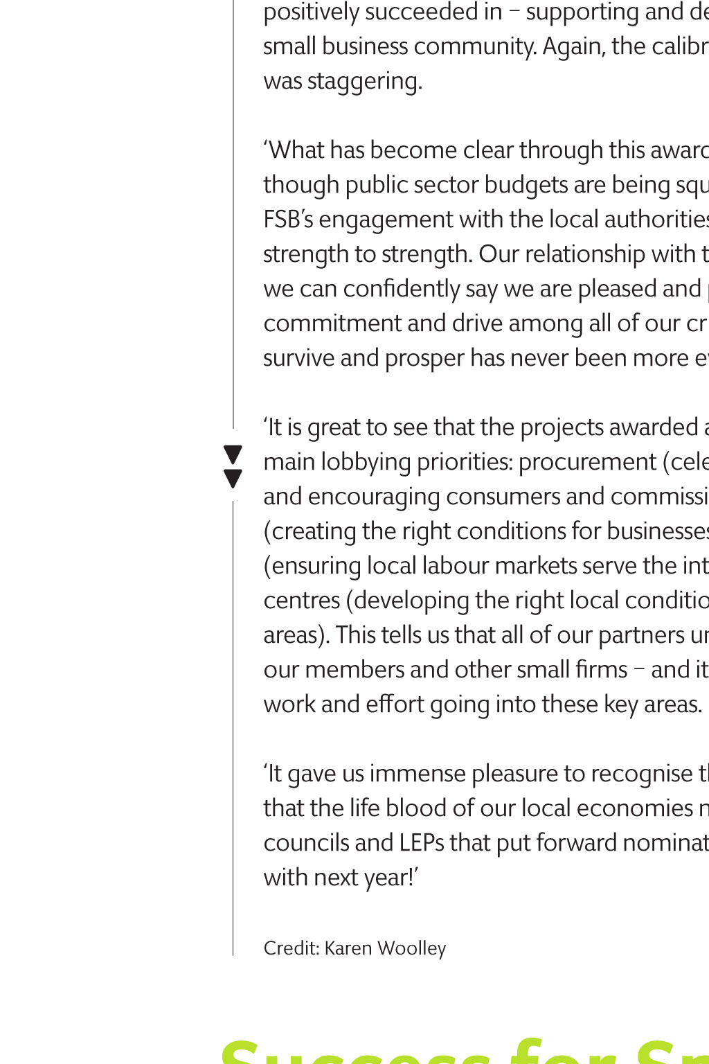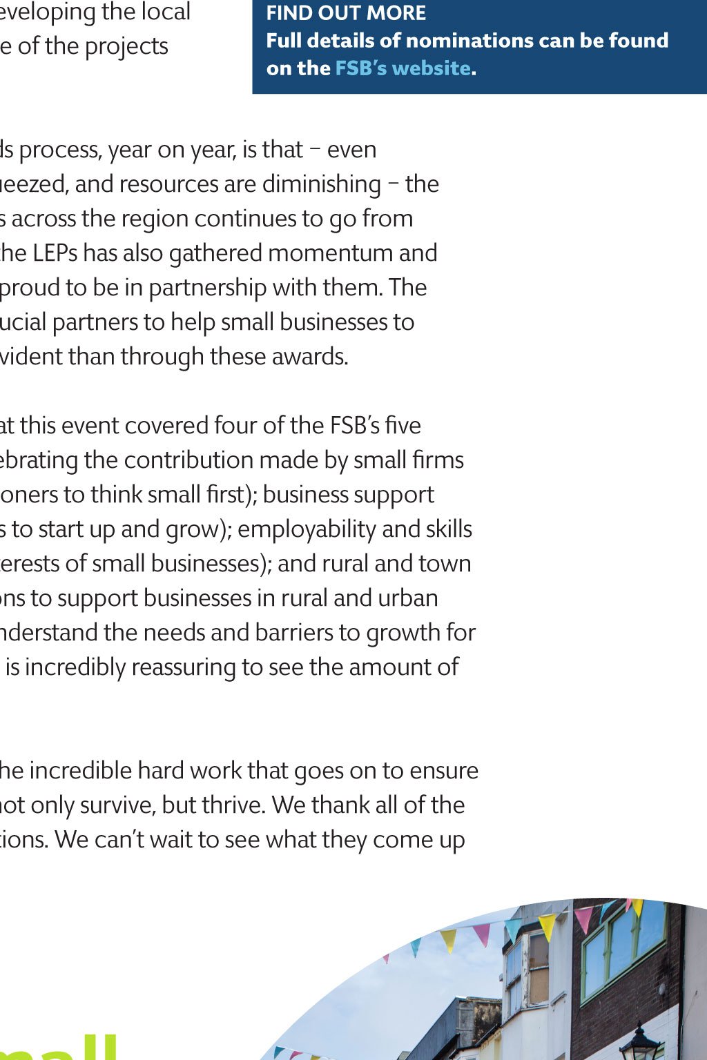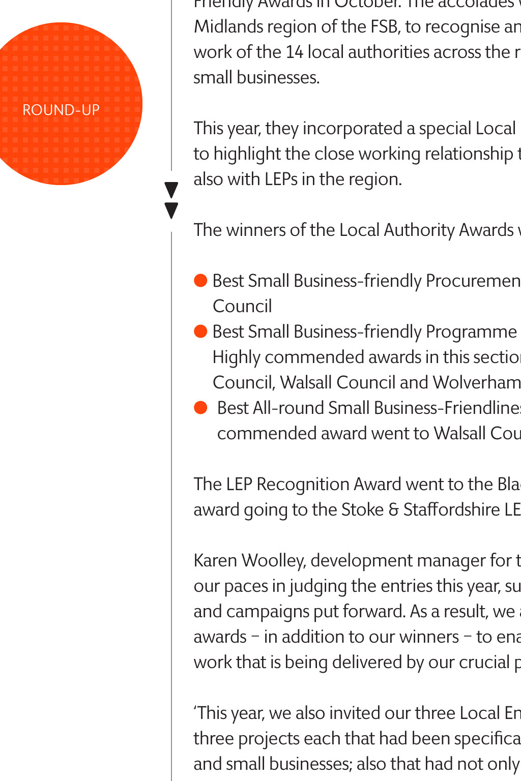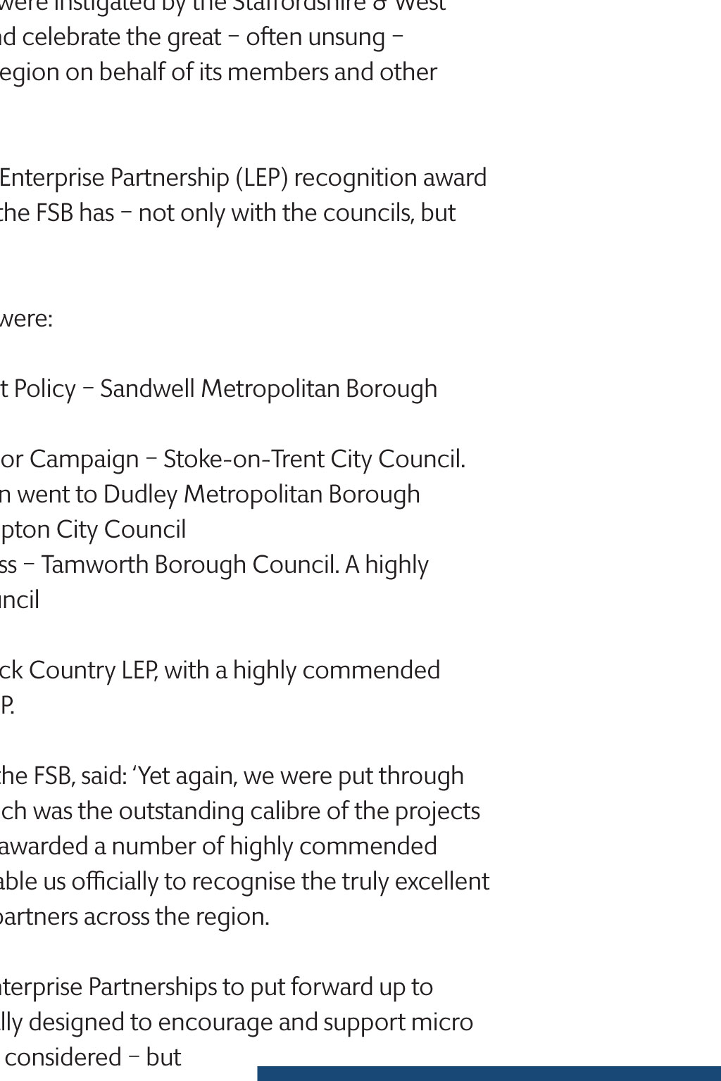 The Federation of Small Businesses (FSB) held its 4th annual Local Authority Small Business Friendly Awards in October. The accolades were instigated by the Staffordshire & West Midlands region of the FSB, to recognise and celebrate the great – often unsung – work of the 14 local authorities across the region on behalf of its members and other small businesses. This year, they incorporated a special Local Enterprise Partnership (LEP) recognition award to highlight the close working relationship the FSB has – not only with the councils, but also with LEPs in the region. The winners of the Local Authority Awards were: l Best Small Business-friendly rocurement Policy – Sandwell Metropolitan Borough Council l Best Small Business-friendly Programme or Campaign – Stoke-on-Trent City Council. Highly commended awards in this section went to Dudley Metropolitan Borough Council, Walsall Council and Wolverhampton City Council l Best All-round Small Business-Friendliness – Tamworth Borough Council. A highly commended award went to Walsall Council The LEP Recognition Award went to the Black Country LEP, with a highly commended award going to the Stoke & Staffordshire LEP. Karen Woolley, development manager for the FSB, said: ‘Yet again, we were put through our paces in judging the entries this year, such was the outstanding calibre of the projects and campaigns put forward. As a result, we awarded a number of highly commended awards – in addition to our winners – to enable us officially to recognise the truly excellent work that is being delivered by our crucial partners across the region. ‘This year, we also invited our three Local Enterprise Partnerships to put forward up to three projects each that had been specifically designed to encourage and support micro and small businesses; also that had not only considered – but positively succeeded in – supporting and developing the local small business community. Again, the calibre of the projects was staggering. ‘What has become clear through this awards process, year on year, is that – even though public sector budgets are being squeezed, and resources are diminishing – the FSB’s engagement with the local authorities across the region continues to go from strength to strength. Our relationship with the LEPs has also gathered momentum and we can confidently say we are pleased and proud to be in partnership with them. The commitment and drive among all of our crucial partners to help small businesses to survive and prosper has never been more evident than through these awards. ‘It is great to see that the projects awarded at this event covered four of the FSB’s five main lobbying priorities: procurement (celebrating the contribution made by small firms and encouraging consumers and commissioners to think small first); business support (creating the right onditions for businesses to start up and grow); employability and skills (ensuring local labour markets serve the interests of small businesses); and rural and town centres (developing the right local conditions to support businesses in rural and urban areas). This tells us that all of our partners understand the needs and barriers to growth for our members and other small firms – and it is incredibly reassuring to see the amount of work and effort going into these key areas. ‘It gave us immense pleasure to recognise the incredible hard work that goes on to ensure that the life blood of our local economies not only survive, but thrive. We thank all of the councils and LEPs that put forward nominations. We can’t wait to see what they come up with next year!’ winter 2015 Round-up Business-friendly councils crowned Success for Small Business Saturday Small Business Saturday (SBS) UK is a grass-roots campaign that highlights small business success and encourages consumers to support small firms in their communities. The day takes place on the first shopping Saturday in December each year, but the campaign aims to have a lasting impact on small businesses. This year, Small Business Saturday is scheduled to take place on 5 December. In 2014, the campaign was a huge success, with 16.5 million people shopping in a small independent business on the day. This represents a 20 per cent increase in footfall on 2013 – or 2.7 million more shoppers. Research shows that 64 per cent of UK consumers are aware of the day – a 33 per cent increase on 2013 – and the SBS Facebook page received 3.5 million views, with #SmallBizSatUK trending at number one all day on SBS last year. What’s more, 55 per cent of local authorities and hundreds of MPs also supported the campaign. The FSB is a big supporter of the campaign and works closely with the organisers to make each year bigger and better. Part of the campaign is SmallBiz100 – small firms from across the UK are encouraged to put themselves forward to be one of 100 companies chosen by SBS, with one company per day profiled nationally in the 100 days leading up to Small Business Saturday. We are pleased to say that 27 of the 100 chosen were FSB members. The SmallBiz100 campaign offers companies a great opportunity to benefit from huge, profileraising, free publicity. More information is available on Small Business Saturday online.
