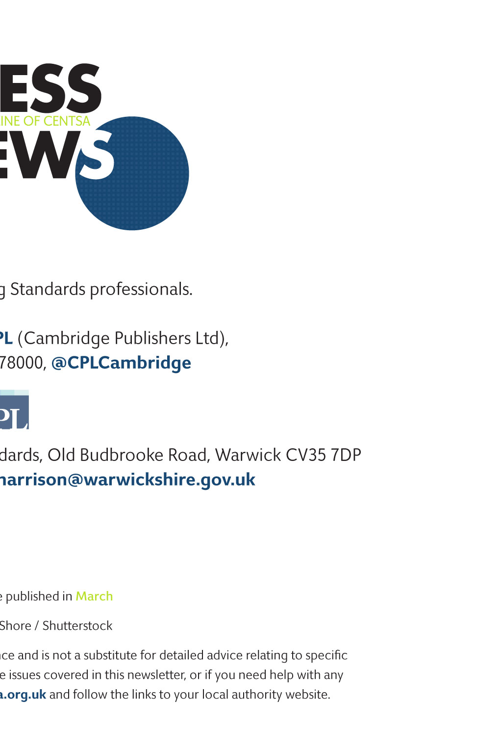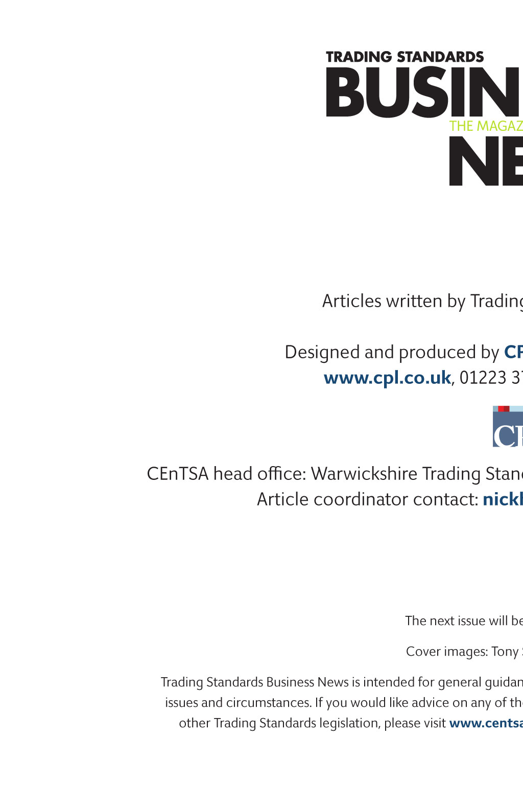 loNDoN eDitioN Articles written by Trading Standards professionals. designed and produced by cPl (Cambridge Publishers Ltd), www.cpl.co.uk, 01223 378000, @cPlcambridge CEnTSA head office: Warwickshire Trading Standards, old Budbrooke Road, Warwick CV35 7dP Article coordinator contact: nickharrison@warwickshire.gov.uk The next issue will be published in March 2017 Cover images: Georgii Shipin / Shutterstock Trading Standards Business News is intended for general guidance and is not a substitute for detailed advice relating to specific issues and circumstances. If you would like advice on any of the issues covered in this newsletter, or if you need help with any other Trading Standards legislation, please visit www.centsa.org.uk and follow the links to your local authority website.