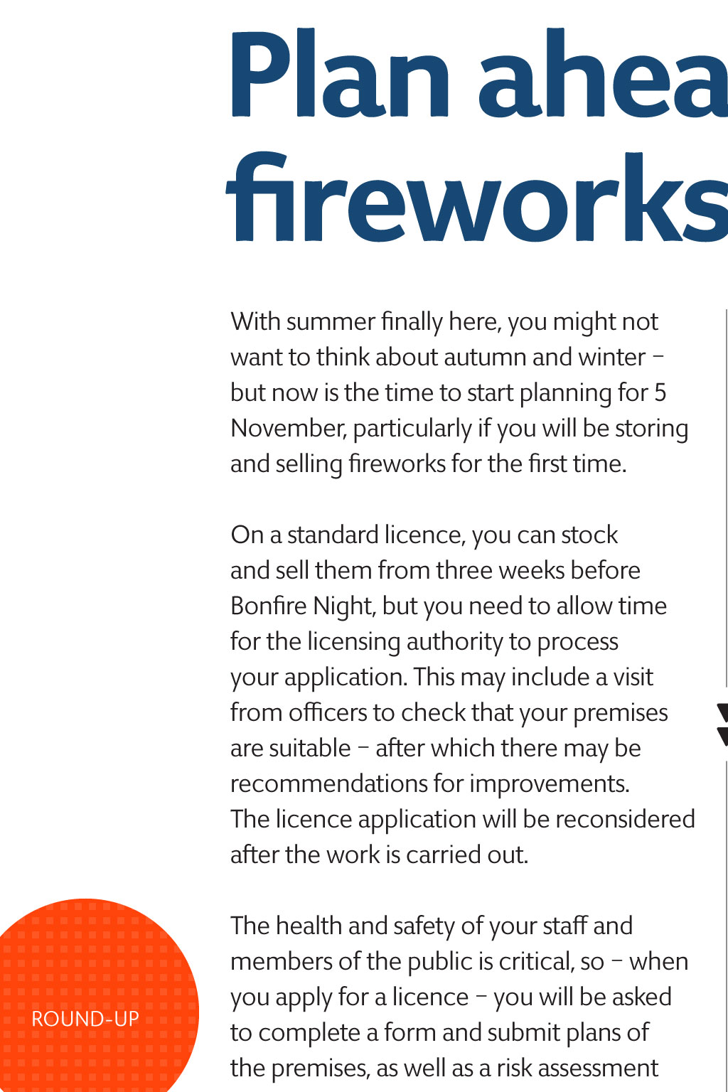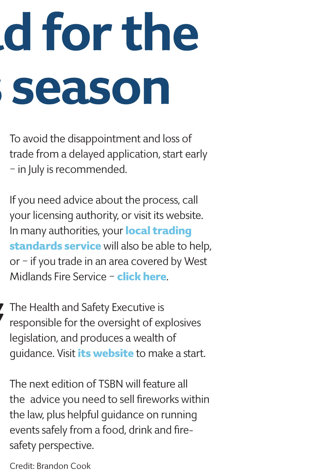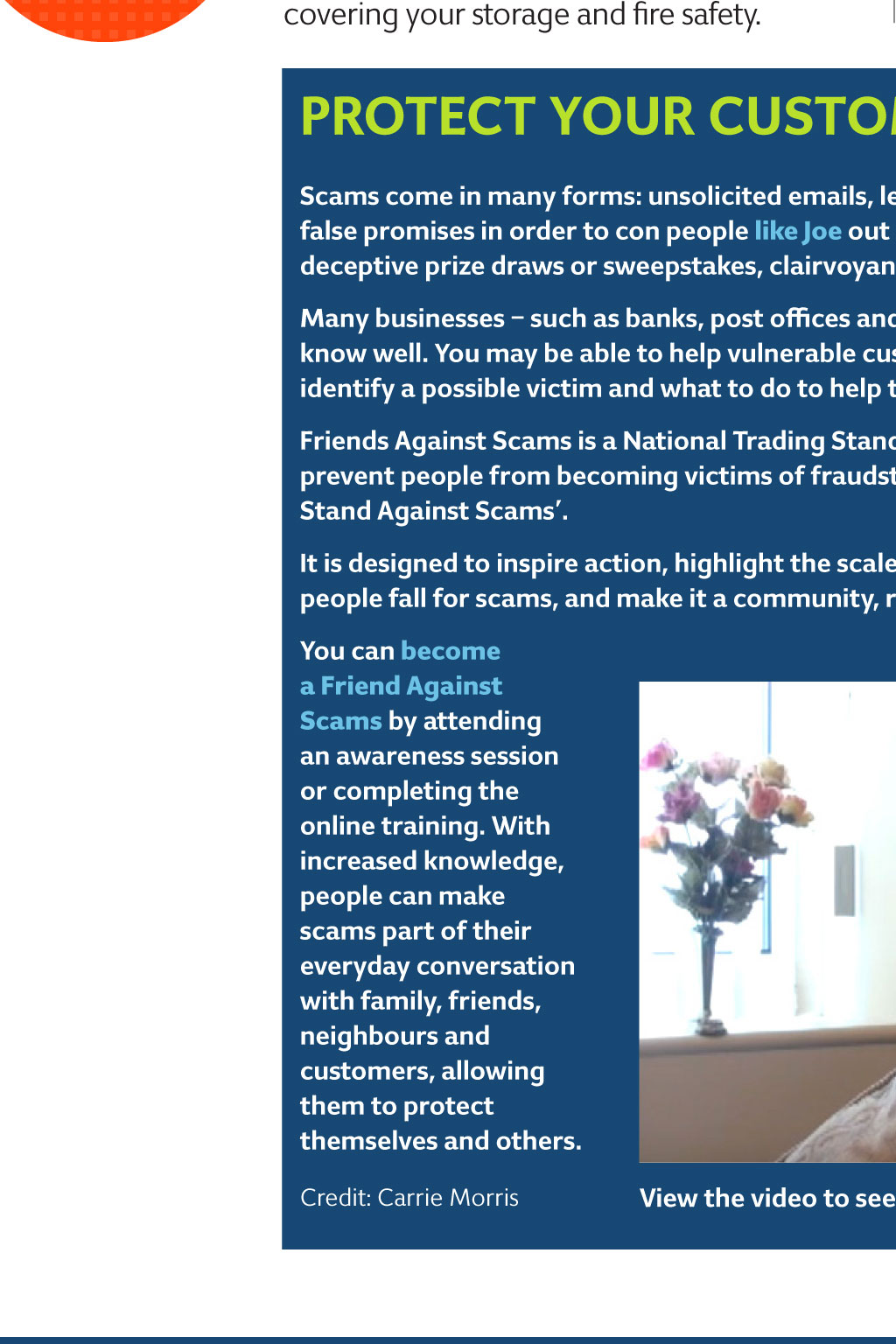summer 2017 round-uP plan ahead for the fireworks season With summer finally here, you might not want to think about autumn and winter but now is the time to start planning for 5 November, particularly if you will be storing and selling fireworks for the first time. on a standard licence, you can stock and sell them from three weeks before Bonfire Night, but you need to allow time for the licensing authority to process your application. This may include a visit from officers to check that your premises are suitable after which there may be recommendations for improvements. The licence application will be reconsidered after the work is carried out. RouNd-uP The health and safety of your staff and members of the public is critical, so when you apply for a licence you will be asked to complete a form and submit plans of the premises, as well as a risk assessment covering your storage and fire safety. To avoid the disappointment and loss of trade from a delayed application, start early in July is recommended. If you need advice about the process, call your licensing authority, or visit its website. In many authorities, your local trading standards service will also be able to help, or if you trade in an area covered by West Midlands Fire Service click here. The Health and Safety Executive is responsible for the oversight of explosives legislation, and produces a wealth of guidance. Visit its website to make a start. The next edition of TSBN will feature all theadvice you need to sell fireworks within the law, plus helpful guidance on running events safely from a food, drink and firesafety perspective. Credit: Brandon Cook iStock.com /Nikada proteCt your CuStomerS againSt SCamS Scams come in many forms: unsolicited emails, letters, telephone calls or in person all making false promises in order to con people like Joe out of money. the most common are fake lotteries, deceptive prize draws or sweepstakes, clairvoyants, computer cons, and romance scams. many businesses such as banks, post offices and newsagents have regulars that they get to know well. you may be able to help vulnerable customers by learning more about scams, how to identify a possible victim and what to do to help them. friends against Scams is a national trading Standards Scams team initiative, which aims to prevent people from becoming victims of fraudsters by empowering communities to take a Stand against Scams. it is designed to inspire action, highlight the scale of the problem, change the perceptions of why people fall for scams, and make it a community, regional and national issue. you can become a Friend Against scams by attending an awareness session or completing the online training. With increased knowledge, people can make scams part of their everyday conversation with family, friends, neighbours and customers, allowing them to protect themselves and others. Credit: Carrie Morris view the video to see how a call-blocker is helping Joe, 86, to feel safer for further information please contact your local trading Standards Service