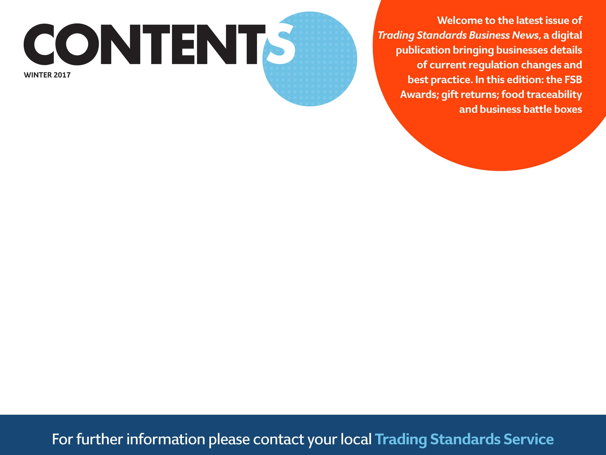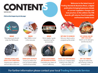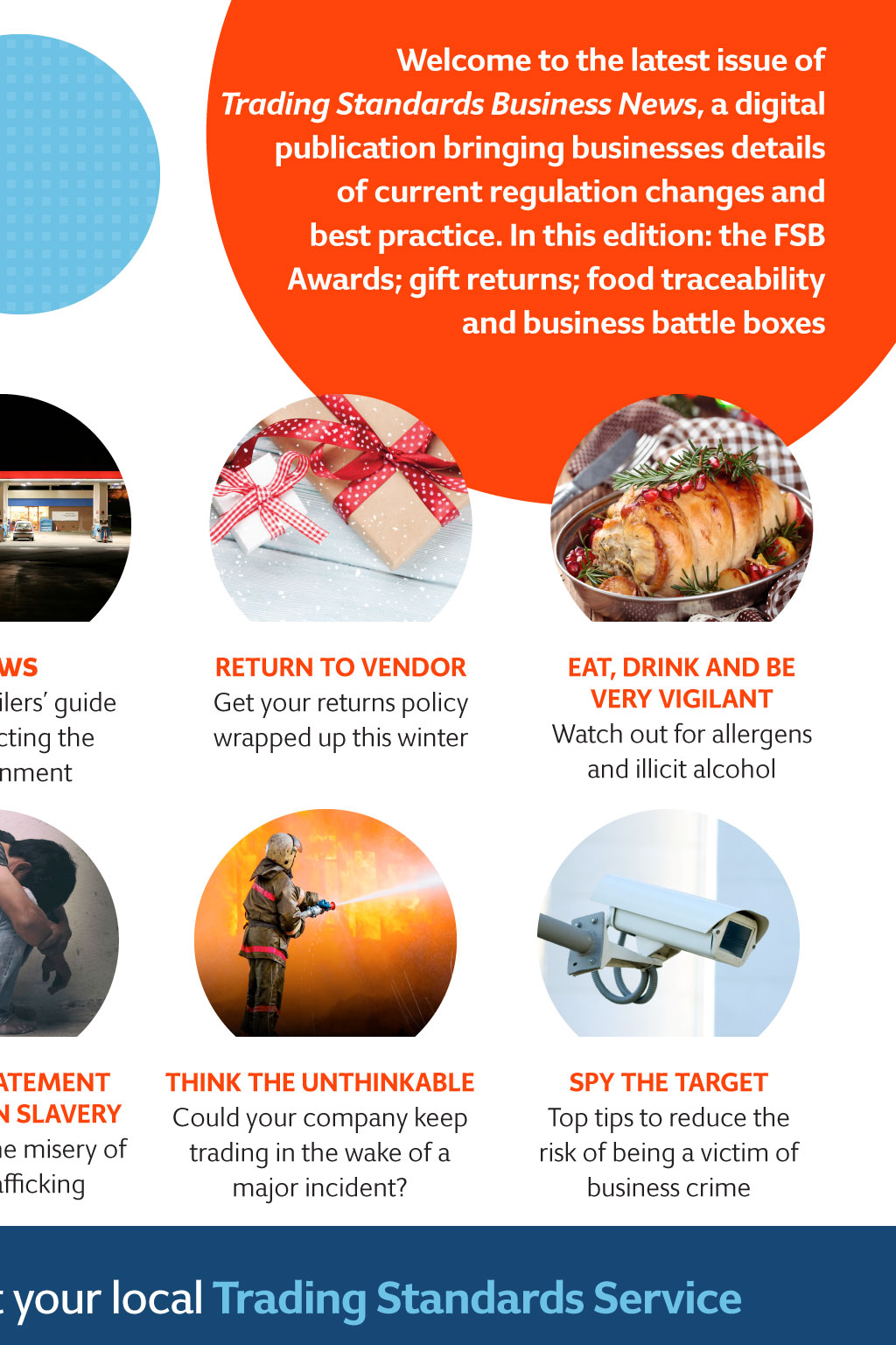 Welcome to the latest issue of Trading Standards Business News, a digital publication bringing businesses details of current regulation changes and best practice. in this edition: the FSB awards; gift returns; food traceability and business battle boxes Winter 2017 Click on the images to go to the page news Five reasons you should enter the FSB Awards driving home (and aWay) For ChriStmaS Keeping your customers and you safe on the road news Bear MEES in mind in the new year Farm gate to plate Ensure you follow the rules on animal welfare and food traceability news Petrol retailers guide to protecting the environment make a Statement on modern Slavery Combating the misery of human trafficking return to vendor Get your returns policy wrapped up this winter think the unthinkaBle Could your company keep trading in the wake of a major incident? eat, drink and Be very vigilant Watch out for allergens and illicit alcohol Spy the target Top tips to reduce the risk of being a victim of business crime For further information please contact your local trading Standards Service
