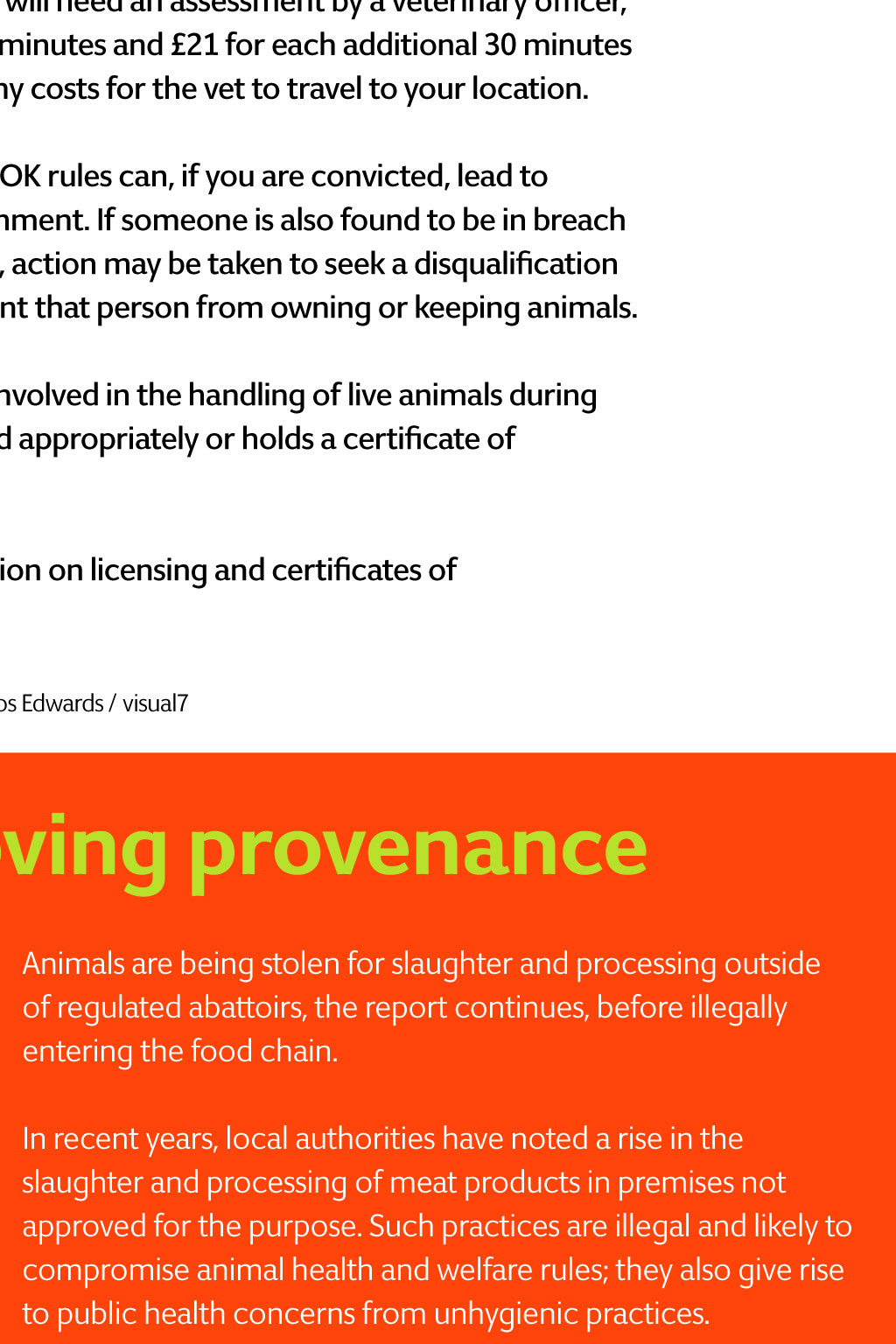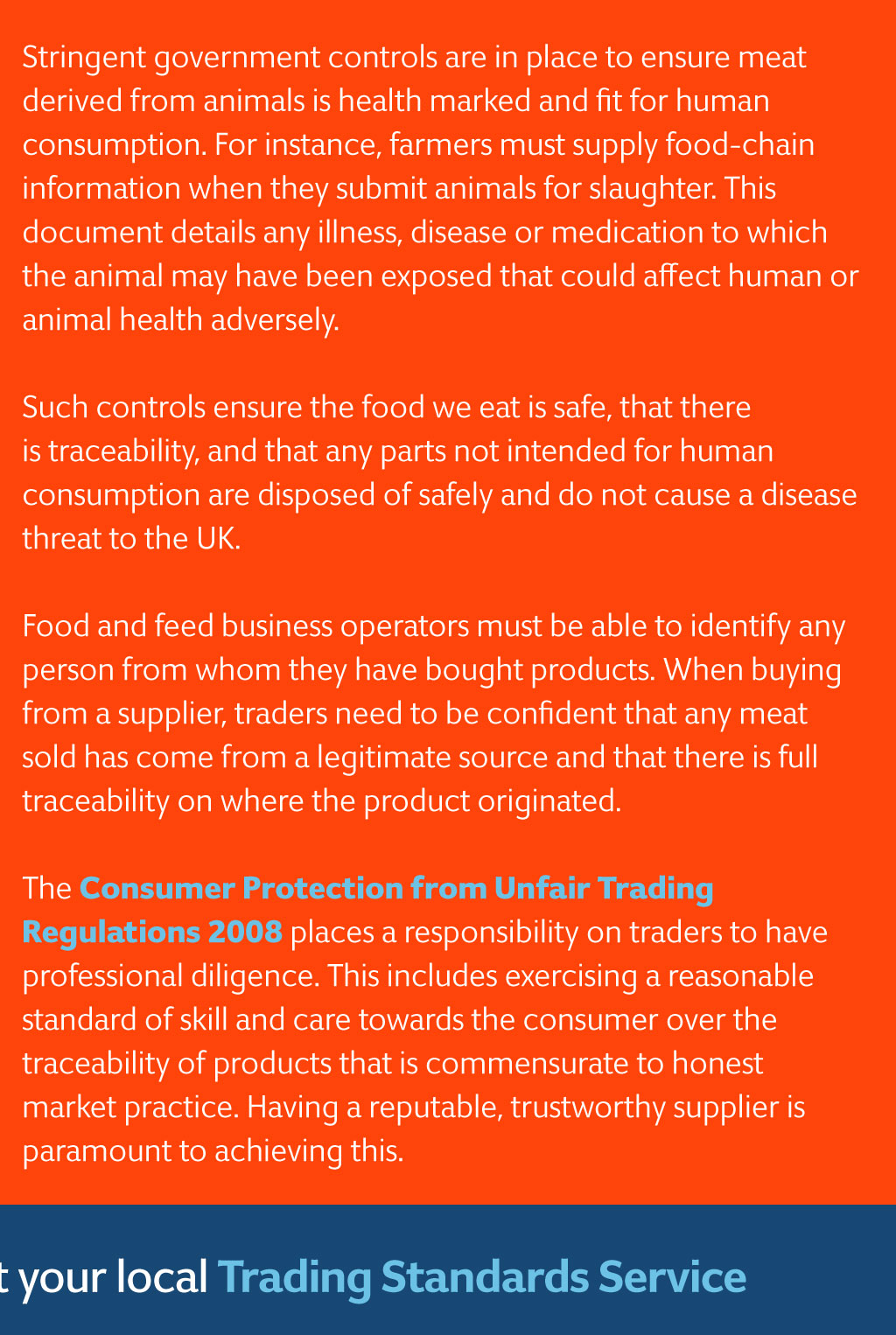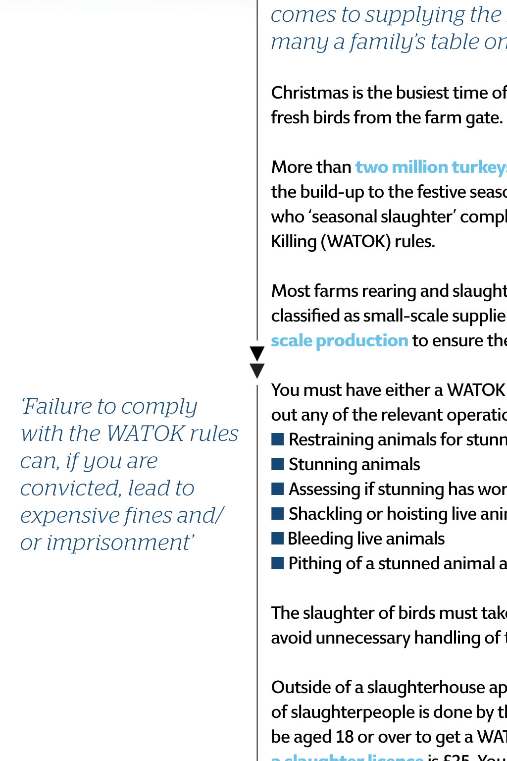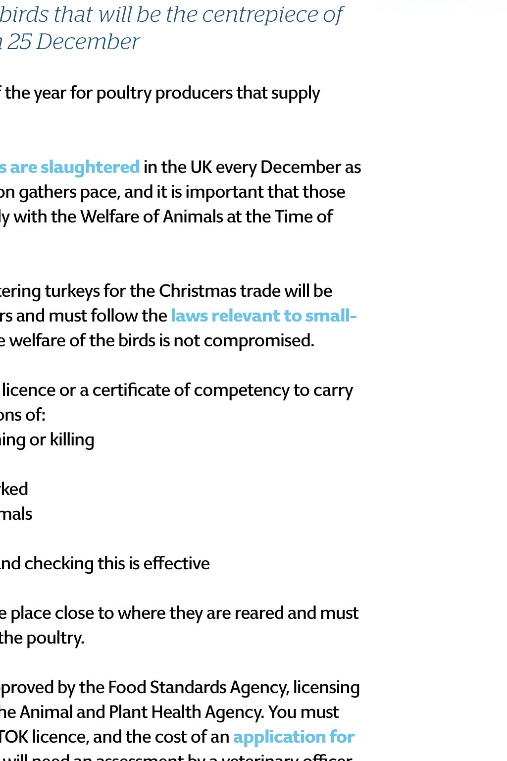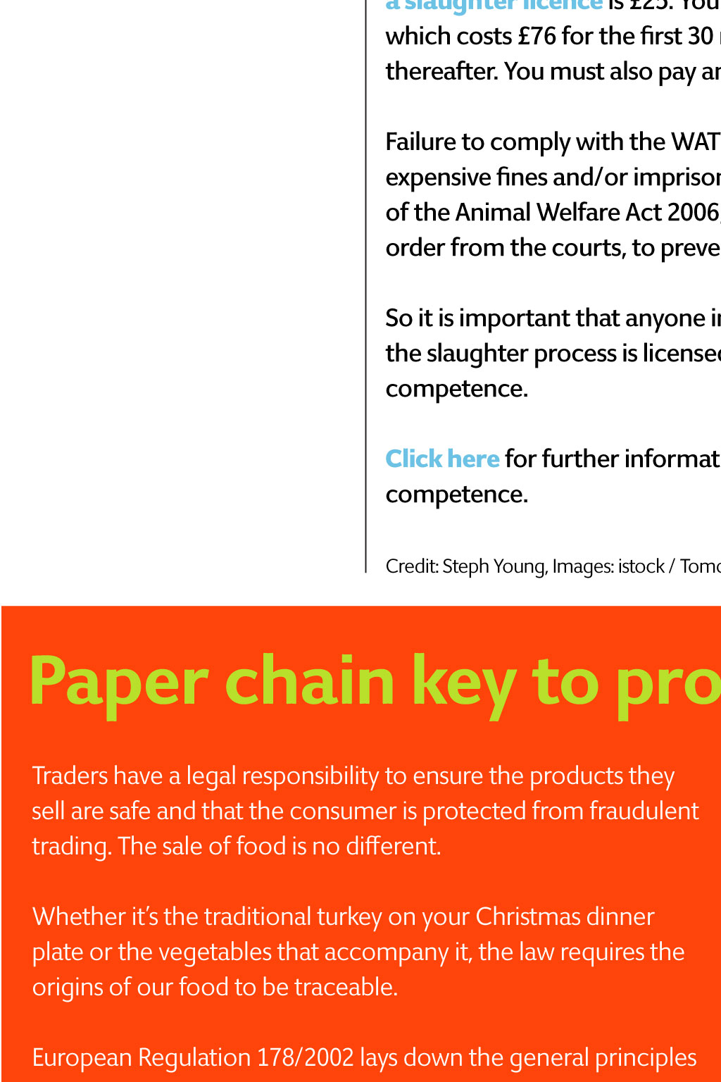 Winter 2017 AnIMAL WELFArE Farm gate to plate Poultry farms must ensure they follow the rules when it comes to supplying the birds that will be the centrepiece of many a familys table on 25 December Christmas is the busiest time of the year for poultry producers that supply fresh birds from the farm gate. More than two million turkeys are slaughtered in the uK every december as the build-up to the festive season gathers pace, and it is important that those who seasonal slaughter comply with the Welfare of Animals at the time of Killing (WAtoK) rules. Most farms rearing and slaughtering turkeys for the Christmas trade will be classified as small-scale suppliers and must follow the laws relevant to smallscale production to ensure the welfare of the birds is not compromised. Failure to comply with the WATOK rules can, if you are convicted, lead to expensive fines and/ or imprisonment You must have either a WAtoK licence or a certificate of competency to carry out any of the relevant operations of: n Restraining animals for stunning or killing n Stunning animals n Assessing if stunning has worked n Shackling or hoisting live animals n Bleeding live animals n pithing of a stunned animal and checking this is effective the slaughter of birds must take place close to where they are reared and must avoid unnecessary handling of the poultry. outside of a slaughterhouse approved by the Food Standards Agency, licensing of slaughterpeople is done by the Animal and plant Health Agency. You must be aged 18 or over to get a WAtoK licence, and the cost of an application for a slaughter licence is 25. You will need an assessment by a veterinary officer, which costs 76 for the first 30 minutes and 21 for each additional 30 minutes thereafter. You must also pay any costs for the vet to travel to your location. Failure to comply with the WAtoK rules can, if you are convicted, lead to expensive fines and/or imprisonment. if someone is also found to be in breach of the Animal Welfare Act 2006, action may be taken to seek a disqualification order from the courts, to prevent that person from owning or keeping animals. So it is important that anyone involved in the handling of live animals during the slaughter process is licensed appropriately or holds a certificate of competence. Click here for further information on licensing and certificates of competence. Credit: Steph Young, Images: istock / Tomos Edwards / visual7 paper chain key to proving provenance Traders have a legal responsibility to ensure the products they sell are safe and that the consumer is protected from fraudulent trading. The sale of food is no different. Animals are being stolen for slaughter and processing outside of regulated abattoirs, the report continues, before illegally entering the food chain. Whether its the traditional turkey on your Christmas dinner plate or the vegetables that accompany it, the law requires the origins of our food to be traceable. In recent years, local authorities have noted a rise in the slaughter and processing of meat products in premises not approved for the purpose. Such practices are illegal and likely to compromise animal health and welfare rules; they also give rise to public health concerns from unhygienic practices. European regulation 178/2002 lays down the general principles for food safety and food law; particularly, it requires that the traceability of food, feed, food-producing animals, and any other substance intended to be or expected to be incorporated into a food or feed shall be established at all stages of production, processing and distribution. The nFus Rural Crime Report for 2017 states that livestock thefts cost the uK economy more than 2m each year. Stringent government controls are in place to ensure meat derived from animals is health marked and fit for human consumption. For instance, farmers must supply food-chain information when they submit animals for slaughter. This document details any illness, disease or medication to which the animal may have been exposed that could affect human or animal health adversely. Such controls ensure the food we eat is safe, that there is traceability, and that any parts not intended for human consumption are disposed of safely and do not cause a disease threat to the uK. Food and feed business operators must be able to identify any person from whom they have bought products. When buying from a supplier, traders need to be confident that any meat sold has come from a legitimate source and that there is full traceability on where the product originated. The Consumer Protection from Unfair Trading Regulations 2008 places a responsibility on traders to have professional diligence. This includes exercising a reasonable standard of skill and care towards the consumer over the traceability of products that is commensurate to honest market practice. Having a reputable, trustworthy supplier is paramount to achieving this. For further information, please contact your local trading Standards Service