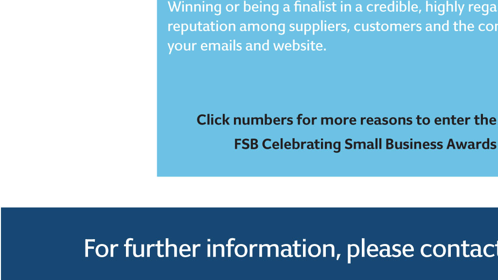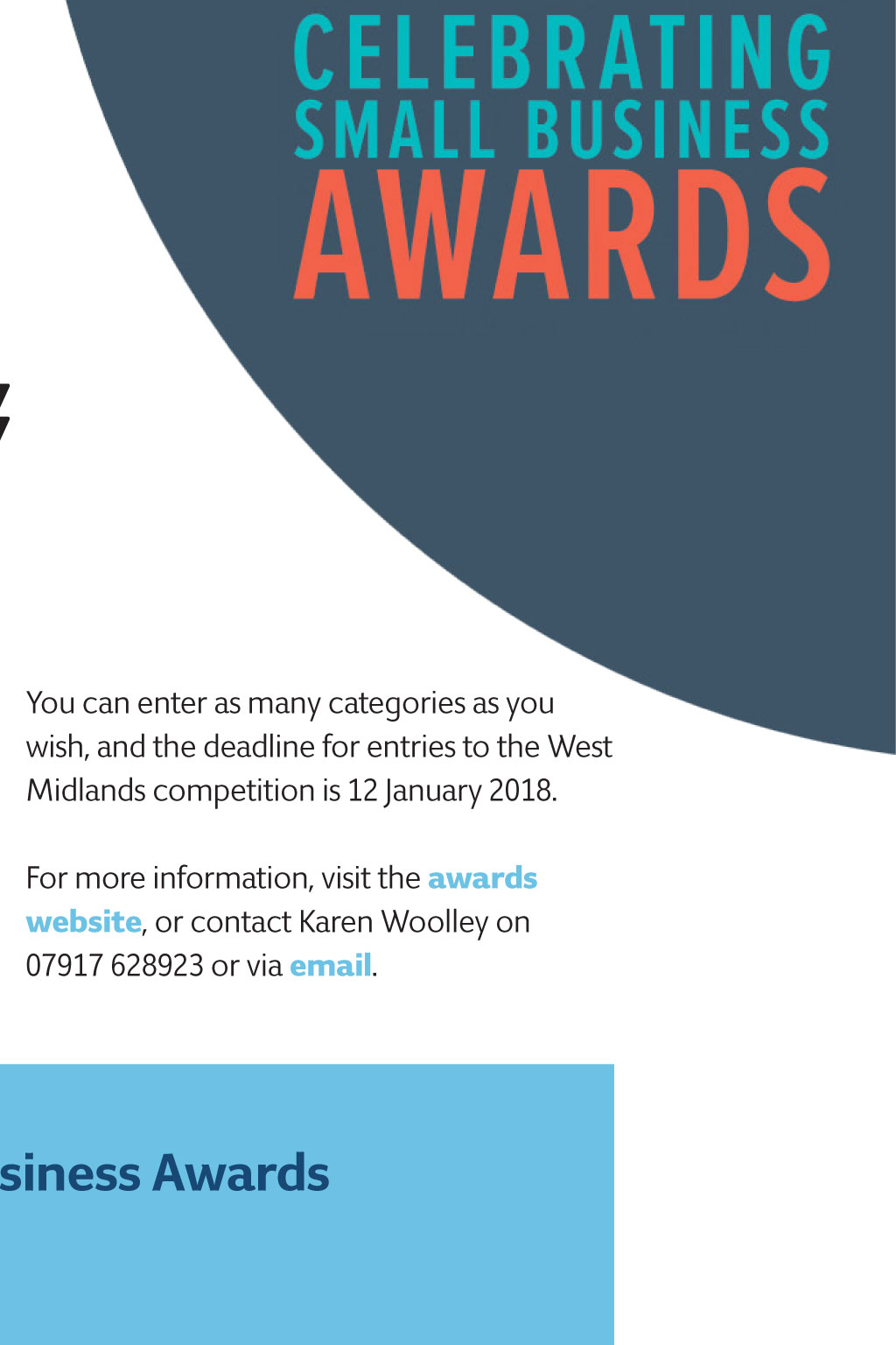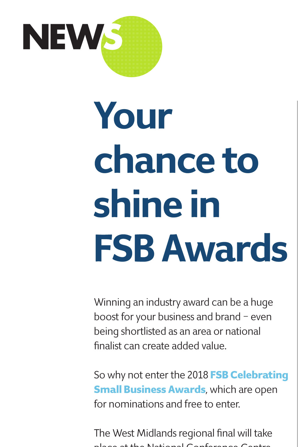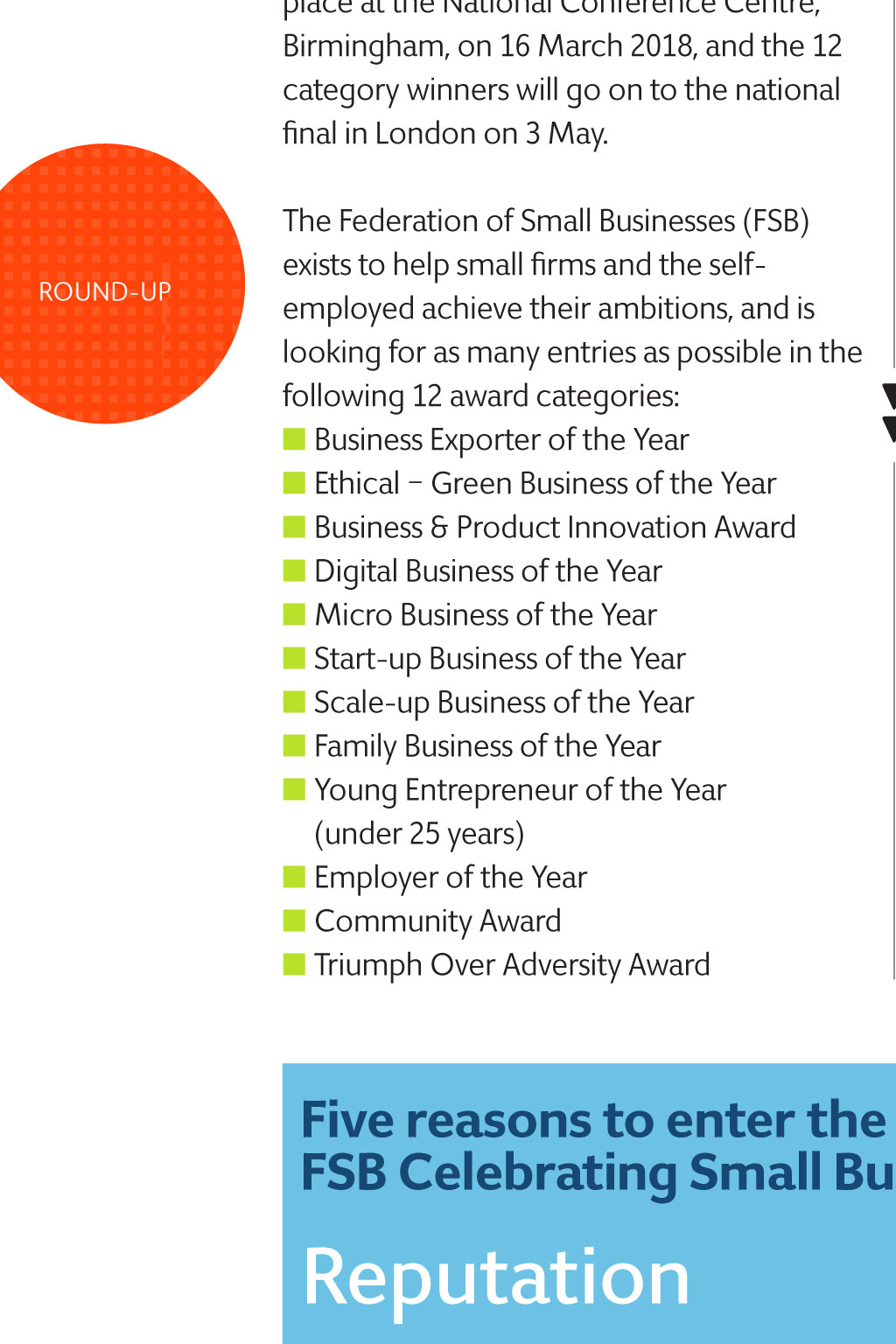 WinteR 2017 Round-up your chance to shine in FSB awards Winning an industry award can be a huge boost for your business and brand even being shortlisted as an area or national finalist can create added value. So why not enter the 2018 FsB Celebrating small Business Awards, which are open for nominations and free to enter. The West Midlands regional final will take place at the national Conference Centre, Birmingham, on 16 March 2018, and the 12 category winners will go on to the national final in London on 3 May. round-uP The Federation of Small Businesses (FSB) exists to help small firms and the selfemployed achieve their ambitions, and is looking for as many entries as possible in the following 12 award categories: n Business Exporter of the Year n Ethical Green Business of the Year n Business & Product Innovation Award n digital Business of the Year n Micro Business of the Year n Start-up Business of the Year n Scale-up Business of the Year n Family Business of the Year n Young Entrepreneur of the Year (under 25 years) n Employer of the Year n Community Award n Triumph over Adversity Award You can enter as many categories as you wish, and the deadline for entries to the West Midlands competition is 12 January 2018. For more information, visit the awards website, or contact Karen Woolley on 07917 628923 or via email. Five reasons to enter the FSB Celebrating Small Business awards Reputation Winning or being a finalist in a credible, highly regarded business award will enhance your businesss reputation among suppliers, customers and the community. You can display your award status on your emails and website. talent and motivation its a huge boost to your employees morale if youre shortlisted or win. it brings a sense of pride anda renewed commitment to the company and is a great way to attract new talent. Media coverage its a good news story. You can tell local and industry media about your achievement to get coverage in newspapers and the broadcast media. if you win a uK-wide award, you could benefit from national press coverage too. Social media profile entering a business award gives you a ready-made social media campaign from announcing that youre applying, through to the award ceremony. Remember to include photos where you can, and use the official awards hashtag to reach a wider audience. FSB has more than 50,000 followers on twitter alone @FsB_Voice #FsBAwARDs new contacts Award ceremonies are a fantastic way to meet new business contacts face to face, both regionally and nationally. As well as being useful, networking at a prestigious event is really enjoyable.Click numbers for more reasons to enter the FSB Celebrating Small Business awards 1 2 3 4 5 For further information, please contact your local trading Standards Service