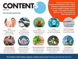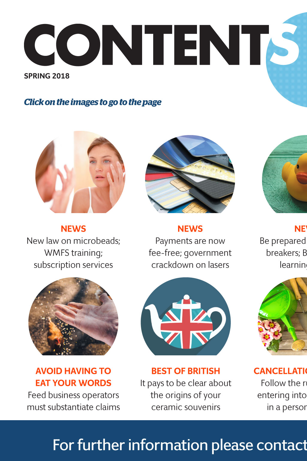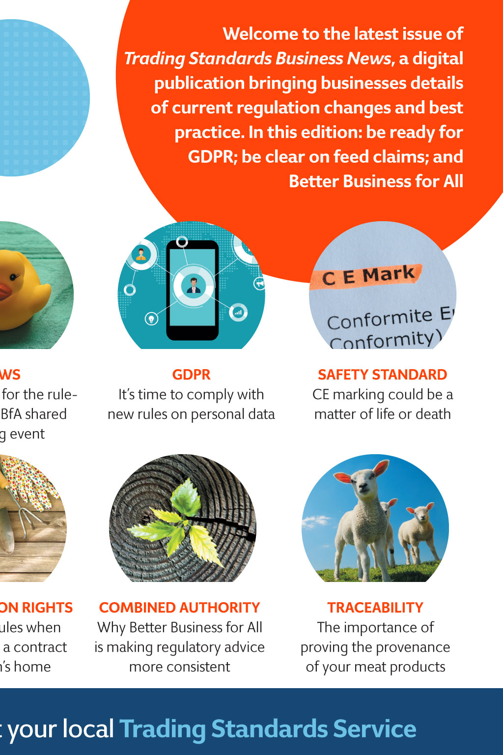 Welcome to the latest issue of Trading Standards Business News, adigital publication bringing businesses details of current regulation changes and best practice. In this edition: be ready for GDPR; be clear on feed claims; and Better Business for All spring 2018 Click on the images to go to the page news New law on microbeads; WMFS training; subscription services news Payments are now fee-free; government crackdown on lasers Avoid having to eat your words Feed business operators must substantiate claims best of british It pays to be clear about the origins of your ceramic souvenirs news Be prepared for the rulebreakers; BBfA shared learning event Cancellation rights Follow the rules when entering into a contract in a persons home GDPR Its time to comply with new rules on personal data combined authority Why Better Business for All is making regulatory advice more consistent Safety standard CE marking could be a matter of life or death traceability The importance of proving the provenance of your meat products For further information please contact your local Trading Standards Service
