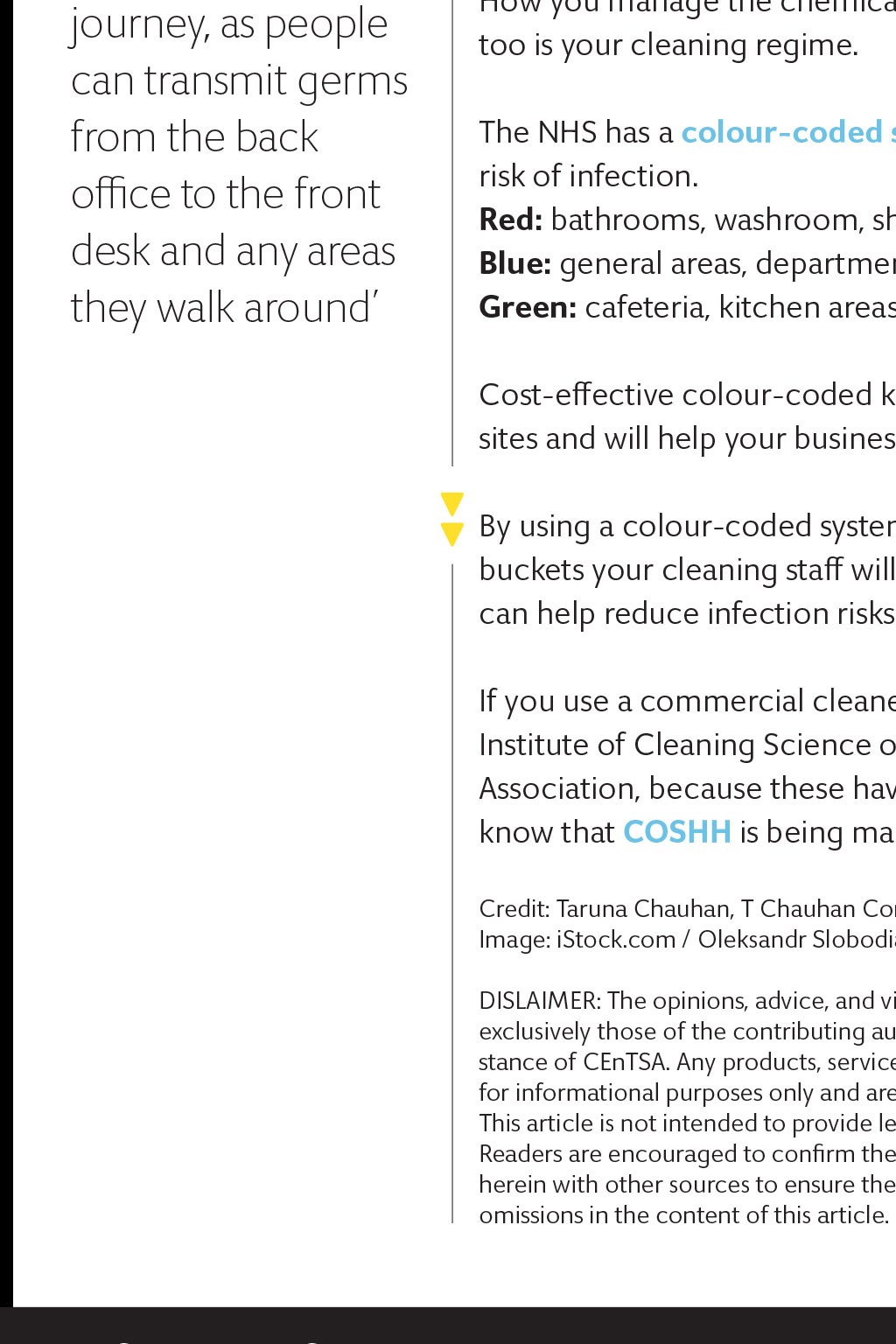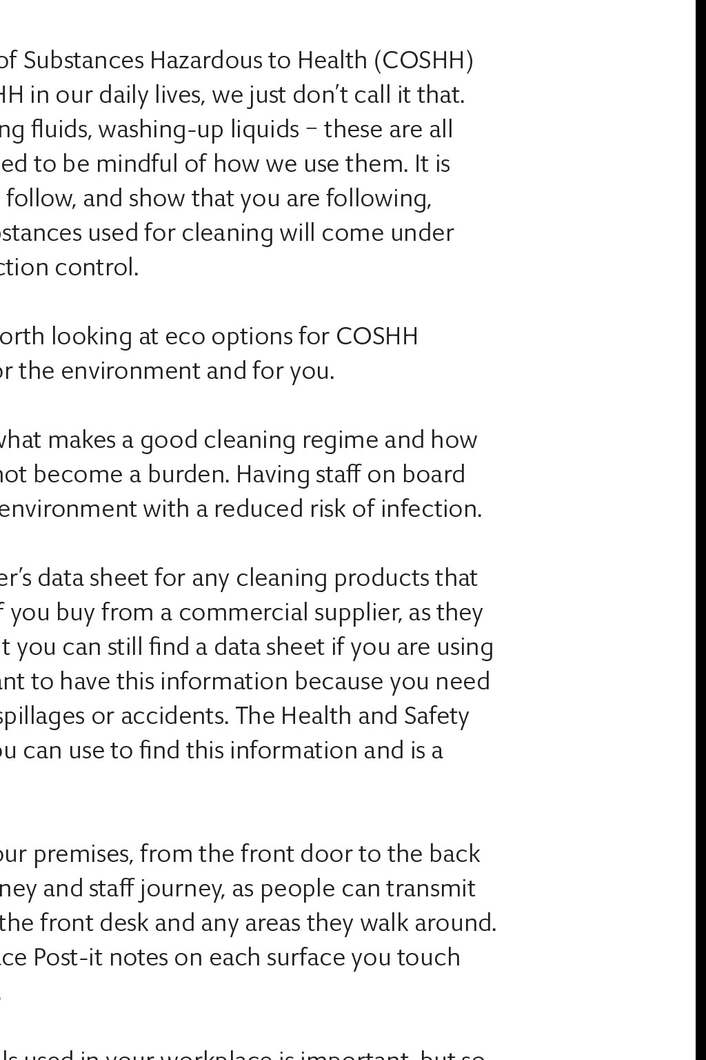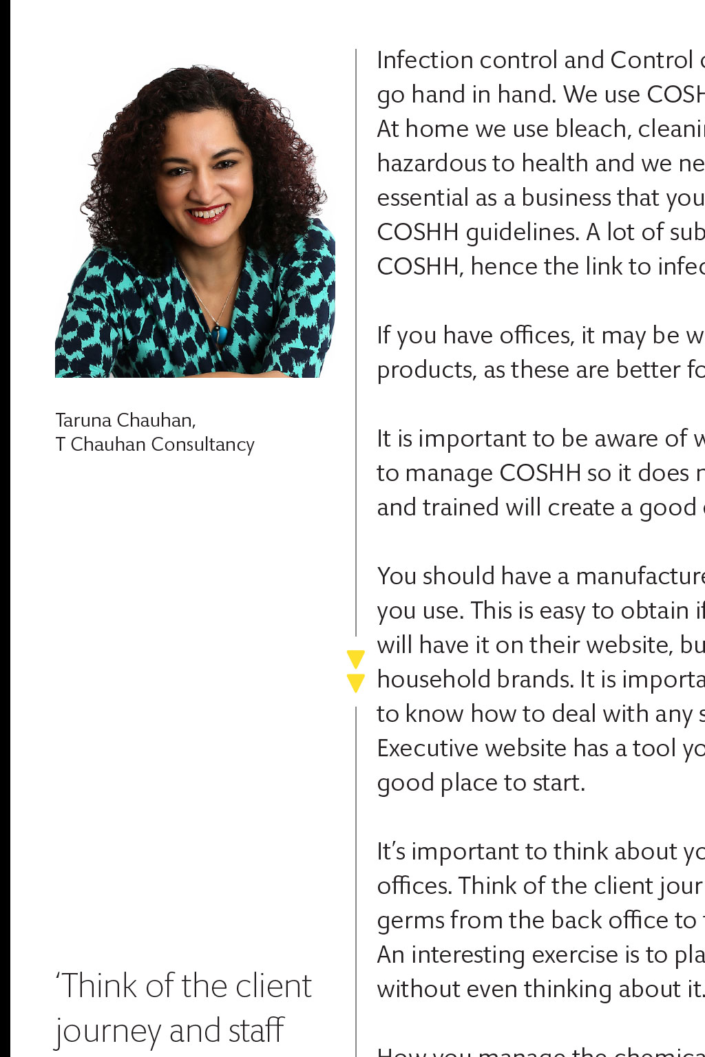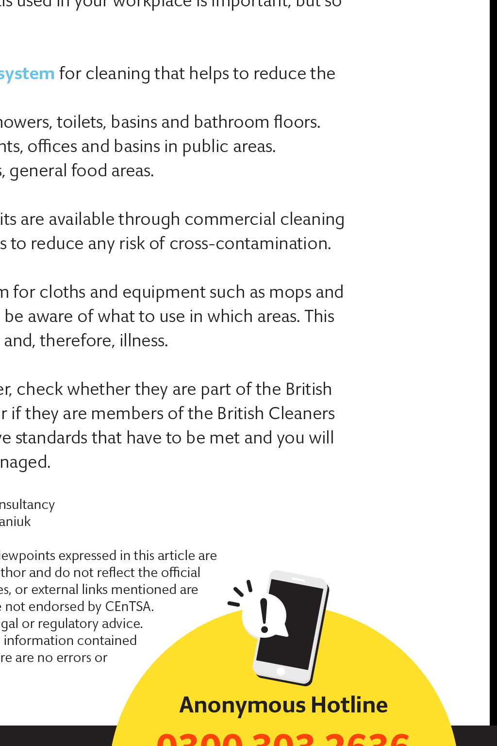 Our first contribution for our new feature where we turn the spotlight on YOU is from Taruna Chauhan, from T Chauhan Consultancy, who takes a look at infection control and Control of Substances Hazardous to Health (COSHH) Infection control and Control of Substances Hazardous to Health (COSHH) go hand in hand. We use COSHH in our daily lives, we just dont call it that. At home we use bleach, cleaning fluids, washing-up liquids these are all hazardous to health and we need to be mindful of how we use them. It is essential as a business that you follow, and show that you are following, COSHH guidelines. A lot of substances used for cleaning will come under COSHH, hence the link to infection control. If you have offices, it may be worth looking at eco options for COSHH products, as these are better for the environment and for you. Taruna Chauhan, T Chauhan Consultancy It is important to be aware of what makes a good cleaning regime and how to manage COSHH so it does not become a burden. Having staff on board and trained will create a good environment with a reduced risk of infection. You should have a manufacturers data sheet for any cleaning products that you use. This is easy to obtain if you buy from a commercial supplier, as they will have it on their website, but you can still find a data sheet if you are using household brands. It is important to have this information because you need to know how to deal with any spillages or accidents. The Health and Safety Executive website has a tool you can use to find this information and is a good place to start. Think of the client journey and staff journey, as people can transmit germs from the back office to the front desk and any areas they walk around Its important to think about your premises, from the front door to the back offices. Think of the client journey and staff journey, as people can transmit germs from the back office to the front desk and any areas they walk around. An interesting exercise is to place Post-it notes on each surface you touch without even thinking about it. How you manage the chemicals used in your workplace is important, but so too is your cleaning regime. The NHS has a colour-coded system for cleaning that helps to reduce the risk of infection. Red: bathrooms, washroom, showers, toilets, basins and bathroom floors. Blue: general areas, departments, offices and basins in public areas. Green: cafeteria, kitchen areas, general food areas. Cost-effective colour-coded kits are available through commercial cleaning sites and will help your business to reduce any risk of cross-contamination. By using a colour-coded system for cloths and equipment such as mops and buckets your cleaning staff will be aware of what to use in which areas. This can help reduce infection risks and, therefore, illness. If you use a commercial cleaner, check whether they are part of the British Institute of Cleaning Science or if they are members of the British Cleaners Association, because these have standards that have to be met and you will know that COSHH is being managed. Credit: Taruna Chauhan, T Chauhan Consultancy Image: iStock.com / Oleksandr Slobodianiuk DISLAIMER: The opinions, advice, and viewpoints expressed in this article are exclusively those of the contributing author and do not reflect the official stance of CEnTSA. Any products, services, or external links mentioned are for informational purposes only and are not endorsed by CEnTSA. This article is not intended to provide legal or regulatory advice. Readers are encouraged to confirm the information contained herein with other sources to ensure there are no errors or omissions in the content of this article. Anonymous Hotline For further information, please contact your local Trading Standards Service For up-to-date news stories and information, follow us on 0300 303 2636 Is your sector being undermined by unscrupulous traders operating outside the law? Report them via Trading Standards Anonymous Hotline or online and help level the playing field for honest businesses.