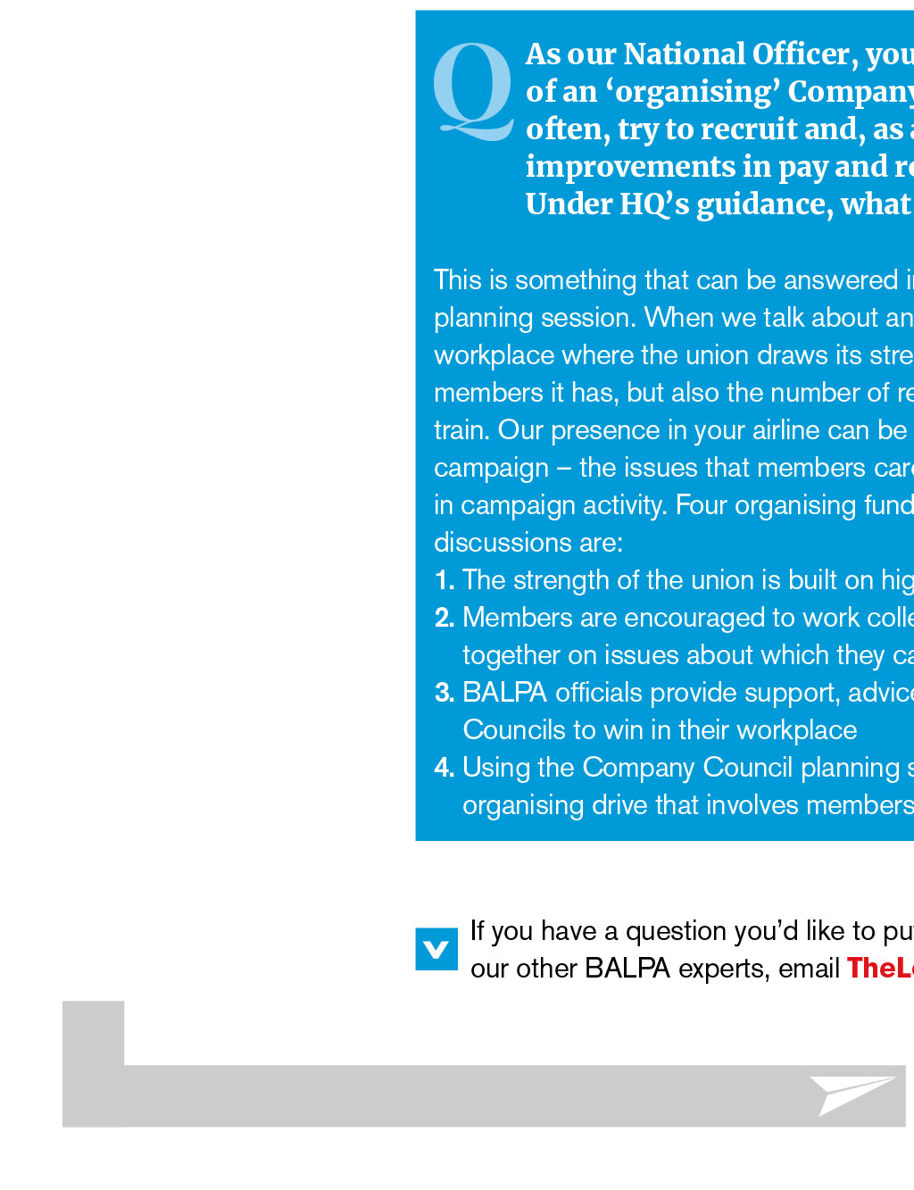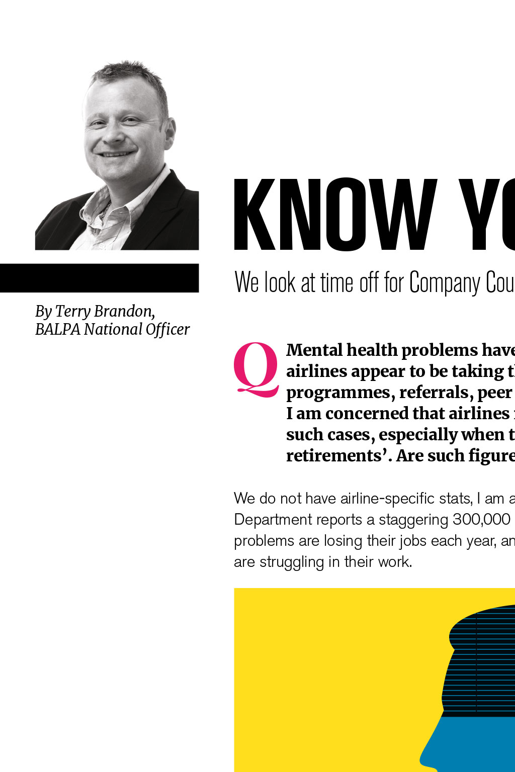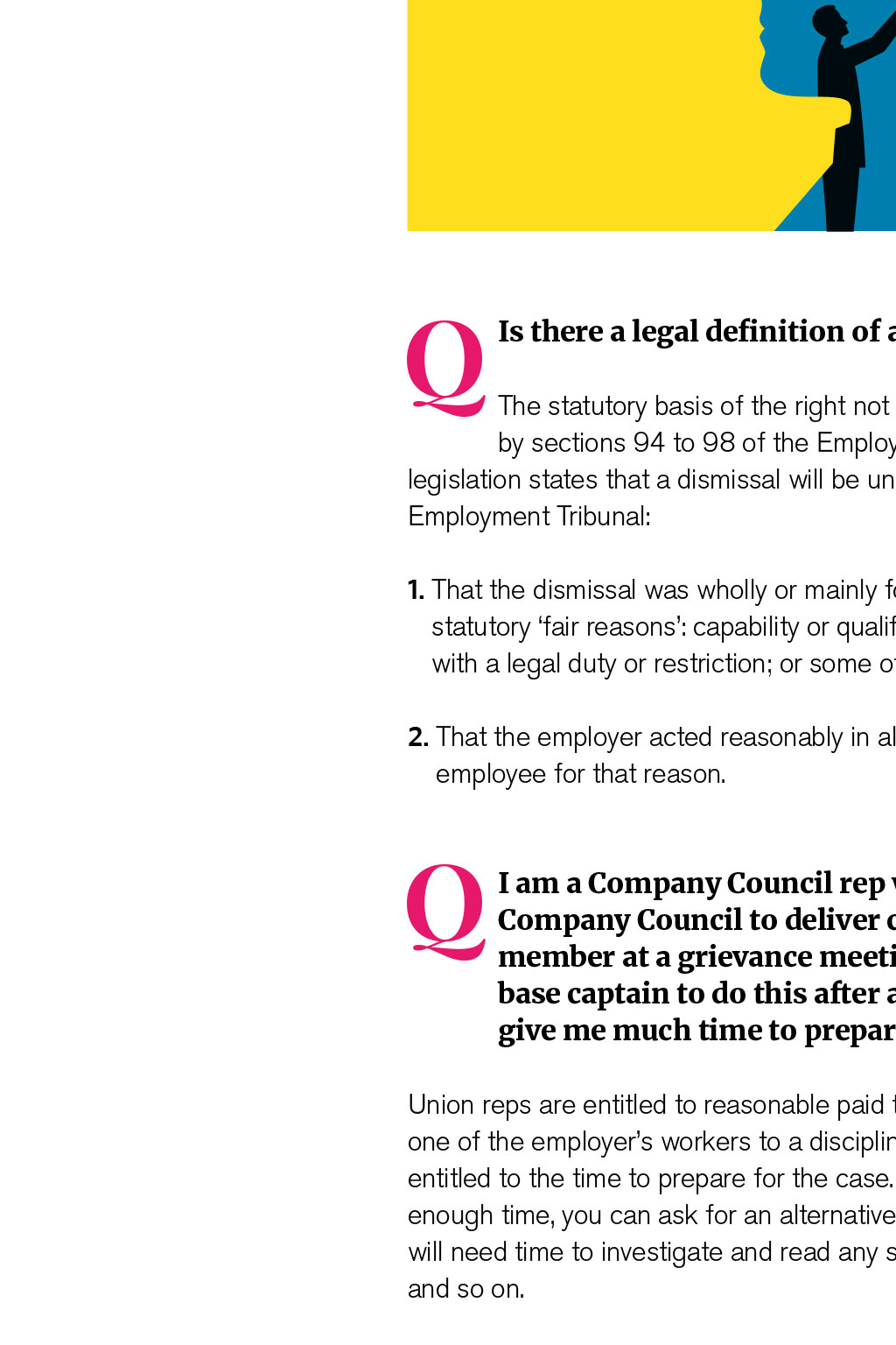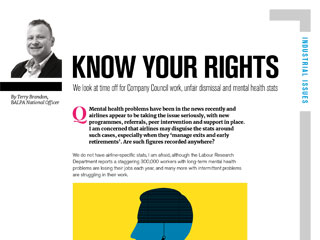 We look at time off for Company Council work, unfair dismissal and mental health stats By Terry Brandon, BALPA National Officer Q Mental health problems have been in the news recently and airlines appear to be taking the issue seriously, with new programmes, referrals, peer intervention and support in place. I am concerned that airlines may disguise the stats around such cases, especially when they manage exits and early retirements. Are such figures recorded anywhere? We do not have airline-specific stats, I am afraid, although the Labour Research Department reports a staggering 300,000 workers with long-term mental health problems are losing their jobs each year, and many more with intermittent problems are struggling in their work. Q Is there a legal definition of an unfair and fair dismissal? The statutory basis of the right not to be unfairly dismissed is covered by sections 94 to 98 of the Employment Rights Act 1996. In short, the legislation states that a dismissal will be unfair unless the employer can satisfy an Employment Tribunal: 1. That the dismissal was wholly or mainly for one of the five statutory fair reasons: capability or qualification; conduct; redundancy; to comply with a legal duty or restriction; or some other substantial reason. 2. That the employer acted reasonably in all the circumstances by dismissing the employer for that reason. Q I am a Company Council rep who has been appointed by the Company Council to deliver casework. I am supporting a member at a grievance meeting, but have been asked by my base captain to do this after a four-sector day; this does not give me much time to prepare. What is normal practice? Union reps are entitled to reasonable paid time off in working hours to accompany one of the employers workers to a discipline or grievance meeting. You are also entitled to the time to prepare for the case. If you do not feel you have been given enough time, you can ask for an alternative date. Even if the case hearing is short, you will need time to investigate and read any supporting documents, policies, procedures and so on. Q As our National Officer, you have asked us to become more of an organising Company Council. We communicate often, try to recruit and, as a solid team, have negotiated improvements in pay and rostering over the past year. Under HQs guidance, what else can we do? This is something that can be answered in more detail at our CC business planning session. When we talk about an organised workplace, we mean a workplace where the union draws its strength from not just the number of members it has, but also the number of reps and activists we support and train. Our presence in your airline can be measured by the issues on which we campaign the issues that members care about. We seek collective involvement in campaign activity. Four organising fundamentals worth factoring in CC discussions are: 1. The strength of the union is built on high levels of membership and activity 2. Members are encouraged to work collectively and have the chance to campaign together on issues about which they care 3. BALPA officials provide support, advice and leadership to assist Company Councils to win in their workplace 4. Using the Company Council planning session, we agree a recruitment and organising drive that involves members and sets clear achievable targets. If you have a question youd like to put to Terry or any of our other BALPA experts, email TheLog@balpa.org INDUSTRIAL ISSUES KNOW YOUR RIGHTS