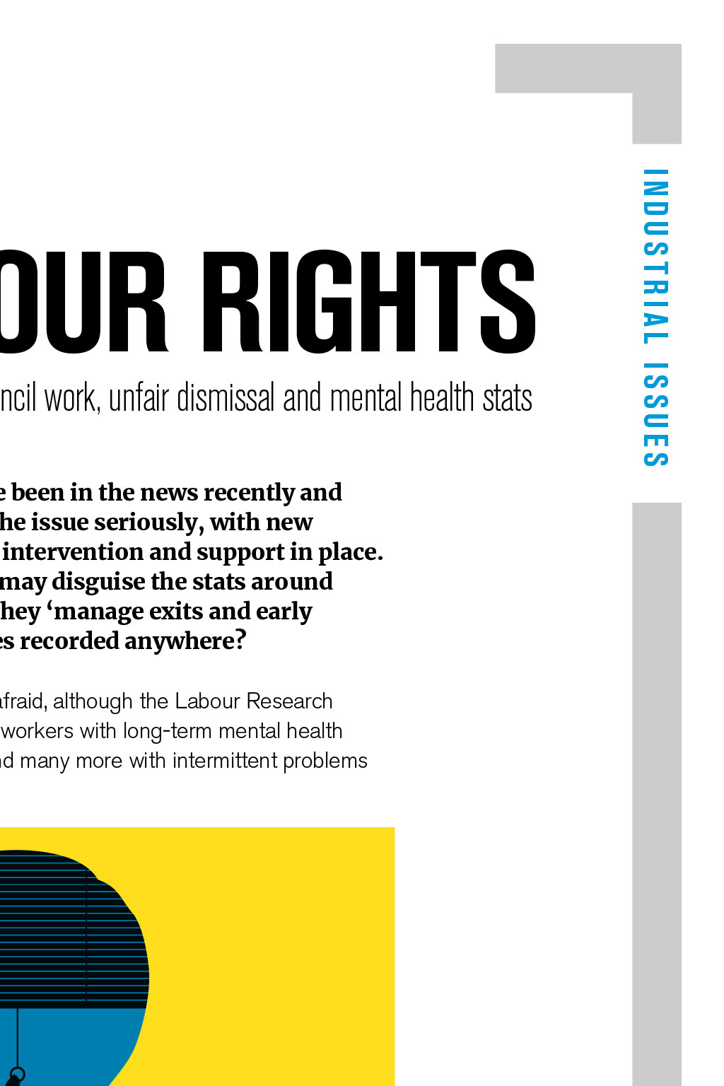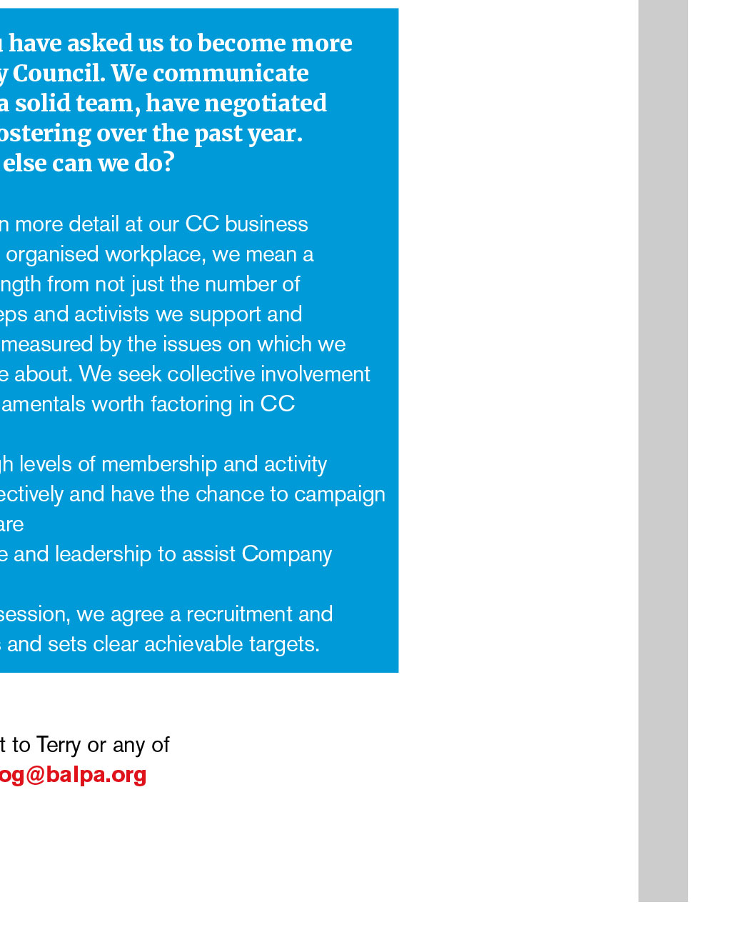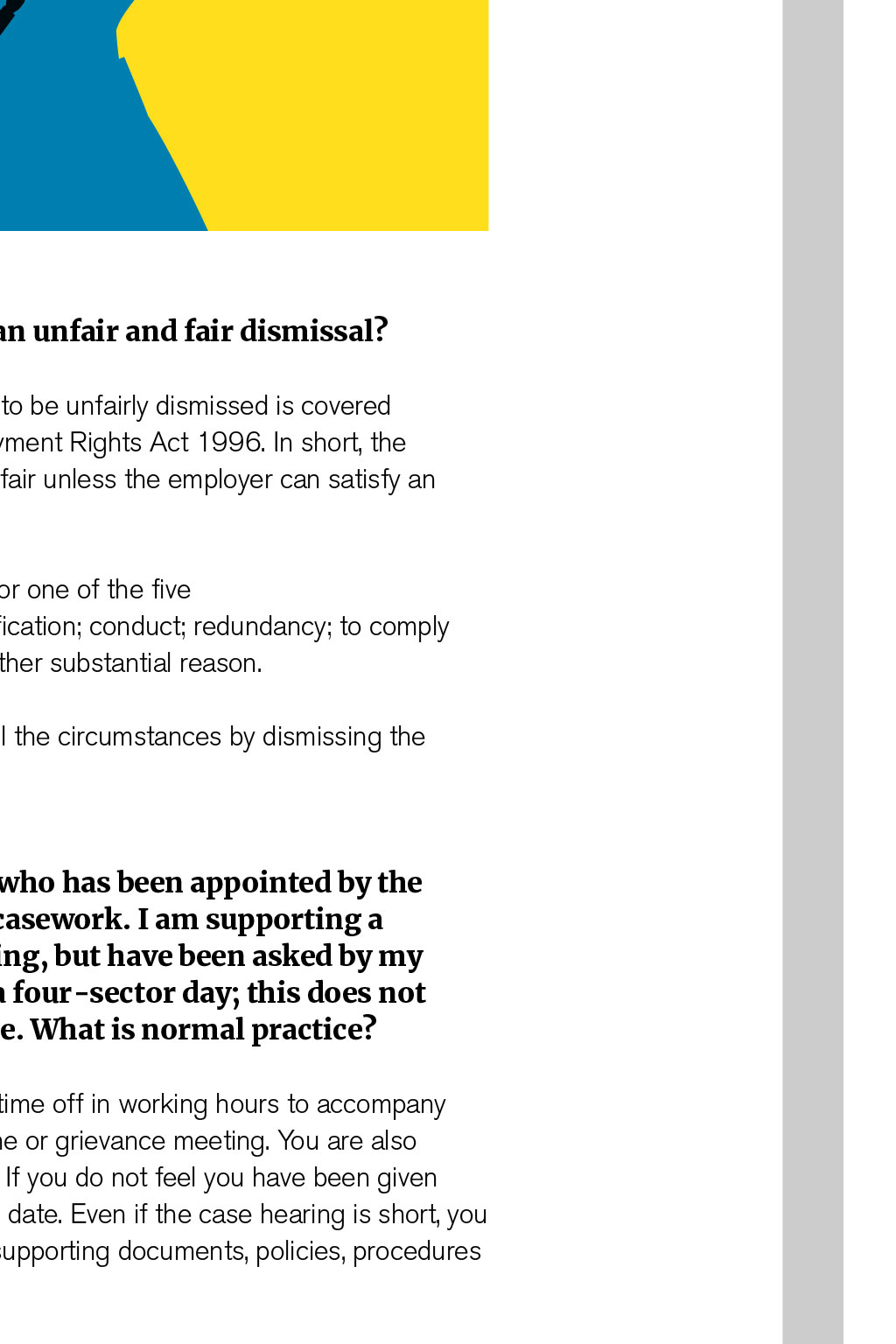 We look at time off for Company Council work, unfair dismissal and mental health stats By Terry Brandon, BALPA National Officer Q Mental health problems have been in the news recently and airlines appear to be taking the issue seriously, with new programmes, referrals, peer intervention and support in place. I am concerned that airlines may disguise the stats around such cases, especially when they manage exits and early retirements. Are such figures recorded anywhere? We do not have airline-specific stats, I am afraid, although the Labour Research Department reports a staggering 300,000 workers with long-term mental health problems are losing their jobs each year, and many more with intermittent problems are struggling in their work. Q Is there a legal definition of an unfair and fair dismissal? The statutory basis of the right not to be unfairly dismissed is covered by sections 94 to 98 of the Employment Rights Act 1996. In short, the legislation states that a dismissal will be unfair unless the employer can satisfy an Employment Tribunal: 1. That the dismissal was wholly or mainly for one of the five statutory fair reasons: capability or qualification; conduct; redundancy; to comply with a legal duty or restriction; or some other substantial reason. 2. That the employer acted reasonably in all the circumstances by dismissing the employer for that reason. Q I am a Company Council rep who has been appointed by the Company Council to deliver casework. I am supporting a member at a grievance meeting, but have been asked by my base captain to do this after a four-sector day; this does not give me much time to prepare. What is normal practice? Union reps are entitled to reasonable paid time off in working hours to accompany one of the employers workers to a discipline or grievance meeting. You are also entitled to the time to prepare for the case. If you do not feel you have been given enough time, you can ask for an alternative date. Even if the case hearing is short, you will need time to investigate and read any supporting documents, policies, procedures and so on. Q As our National Officer, you have asked us to become more of an organising Company Council. We communicate often, try to recruit and, as a solid team, have negotiated improvements in pay and rostering over the past year. Under HQs guidance, what else can we do? This is something that can be answered in more detail at our CC business planning session. When we talk about an organised workplace, we mean a workplace where the union draws its strength from not just the number of members it has, but also the number of reps and activists we support and train. Our presence in your airline can be measured by the issues on which we campaign the issues that members care about. We seek collective involvement in campaign activity. Four organising fundamentals worth factoring in CC discussions are: 1. The strength of the union is built on high levels of membership and activity 2. Members are encouraged to work collectively and have the chance to campaign together on issues about which they care 3. BALPA officials provide support, advice and leadership to assist Company Councils to win in their workplace 4. Using the Company Council planning session, we agree a recruitment and organising drive that involves members and sets clear achievable targets. If you have a question youd like to put to Terry or any of our other BALPA experts, email TheLog@balpa.org INDUSTRIAL ISSUES KNOW YOUR RIGHTS