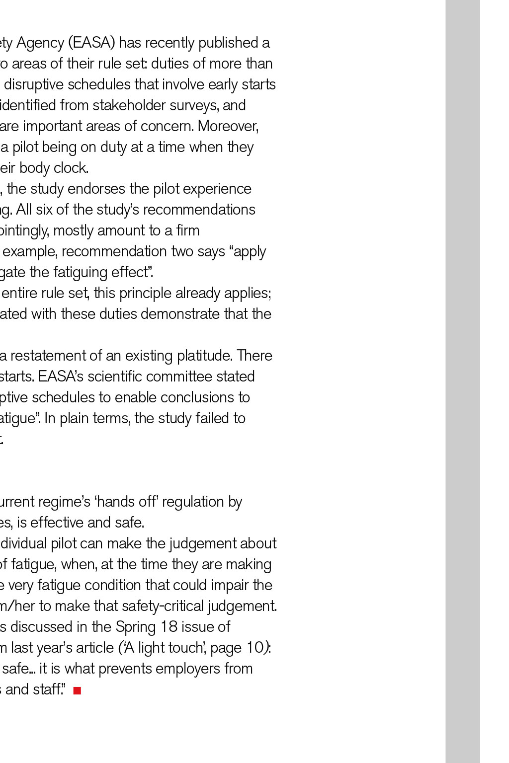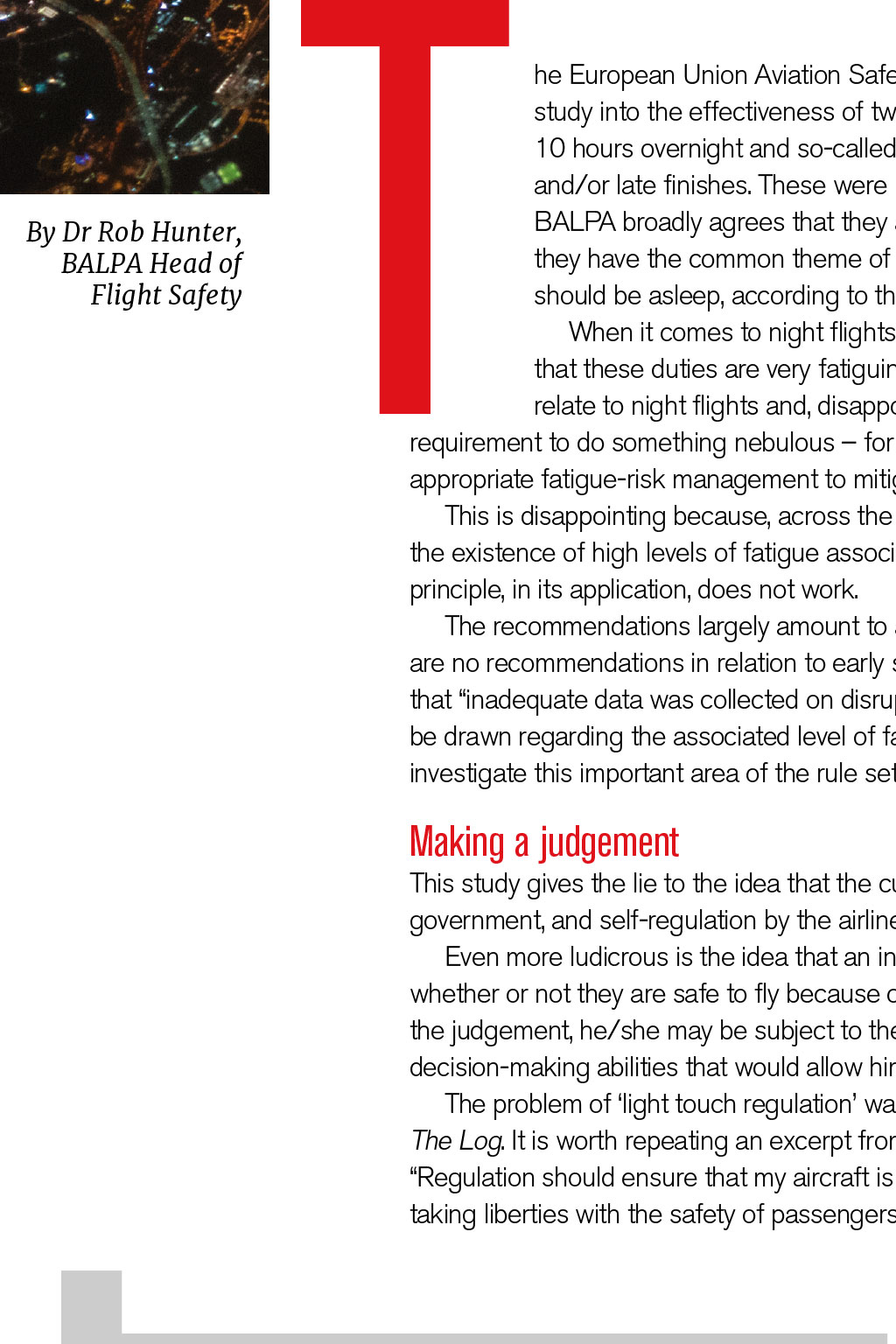 TIMING ISSUES By Dr Rob Hunter, BALPA Head of Flight Safety T he European Union Aviation Safety Agency (EASA) has recently published a study into the effectiveness of two areas of their rule set: duties of more than 10 hours overnight and so-called disruptive schedules that involve early starts and/or late finishes. These were identified from stakeholder surveys, and BALPA broadly agrees that they are important areas of concern. Moreover, they have the common theme of a pilot being on duty at a time when they should be asleep, according to their body clock. When it comes to night flights, the study endorses the pilot experience that these duties are very fatiguing. All six of the studys recommendations relate to night flights and, disappointingly, mostly amount to a firm requirement to do something nebulous for example, recommendation two says apply appropriate fatigue-risk management to mitigate the fatiguing effect. This is disappointing because, across the entire rule set, this principle already applies; the existence of high levels of fatigue associated with these duties demonstrate that the principle, in its application, does not work. The recommendations largely amount to a restatement of an existing platitude. There are no recommendations in relation to early starts. EASAs scientific committee stated that inadequate data was collected on disruptive schedules to enable conclusions to be drawn regarding the associated level of fatigue. In plain terms, the study failed to investigate this important area of the rule set. Making a judgement This study gives the lie to the idea that the current regimes hands off regulation by government, and self-regulation by the airlines, is effective and safe. Even more ludicrous is the idea that an individual pilot can make the judgement about whether or not they are safe to fly because of fatigue, when, at the time they are making the judgement, he/she may be subject to the very fatigue condition that could impair the decision-making abilities that would allow him/her to make that safety-critical judgement. The problem of light touch regulation was discussed in the Spring 18 issue of The Log. It is worth repeating an excerpt from last years article (A light touch, page 10): Regulation should ensure that my aircraft is safe... it is what prevents employers from taking liberties with the safety of passengers and staff. TECH LOG EASAs Effectiveness of Flight Time Limitation report offers disappointing conclusions