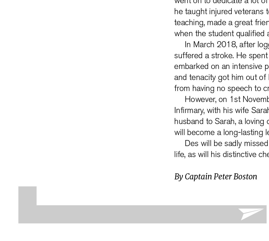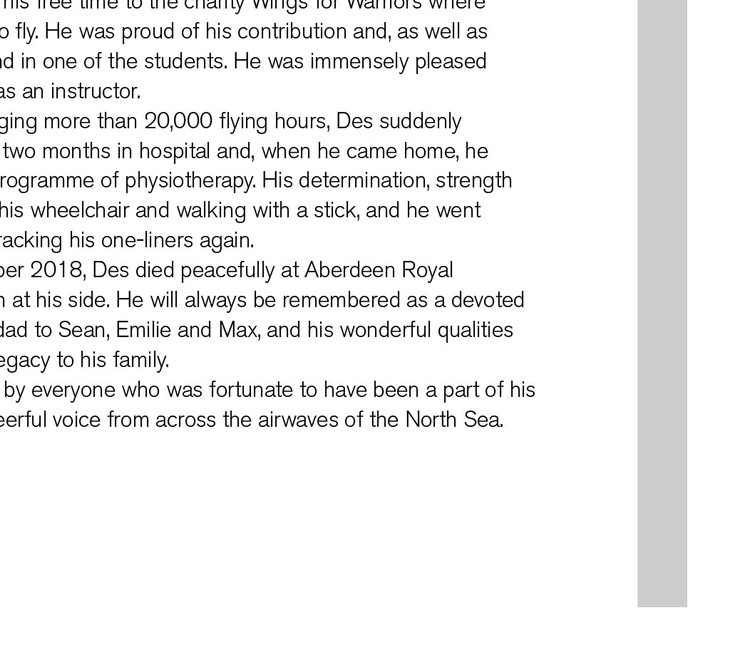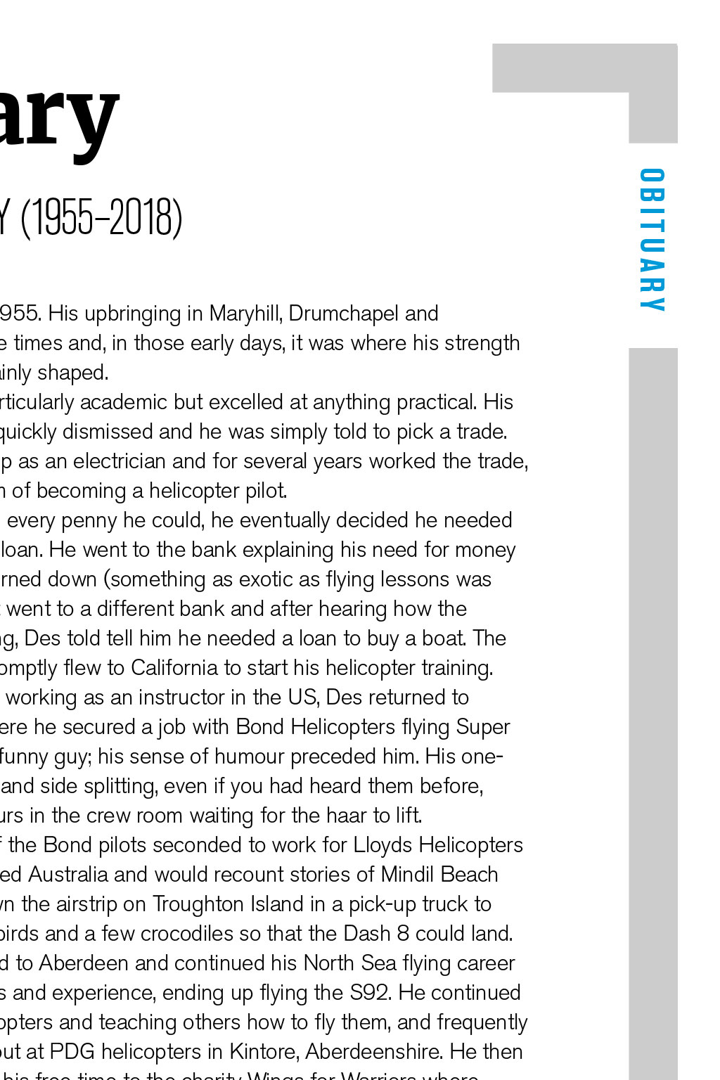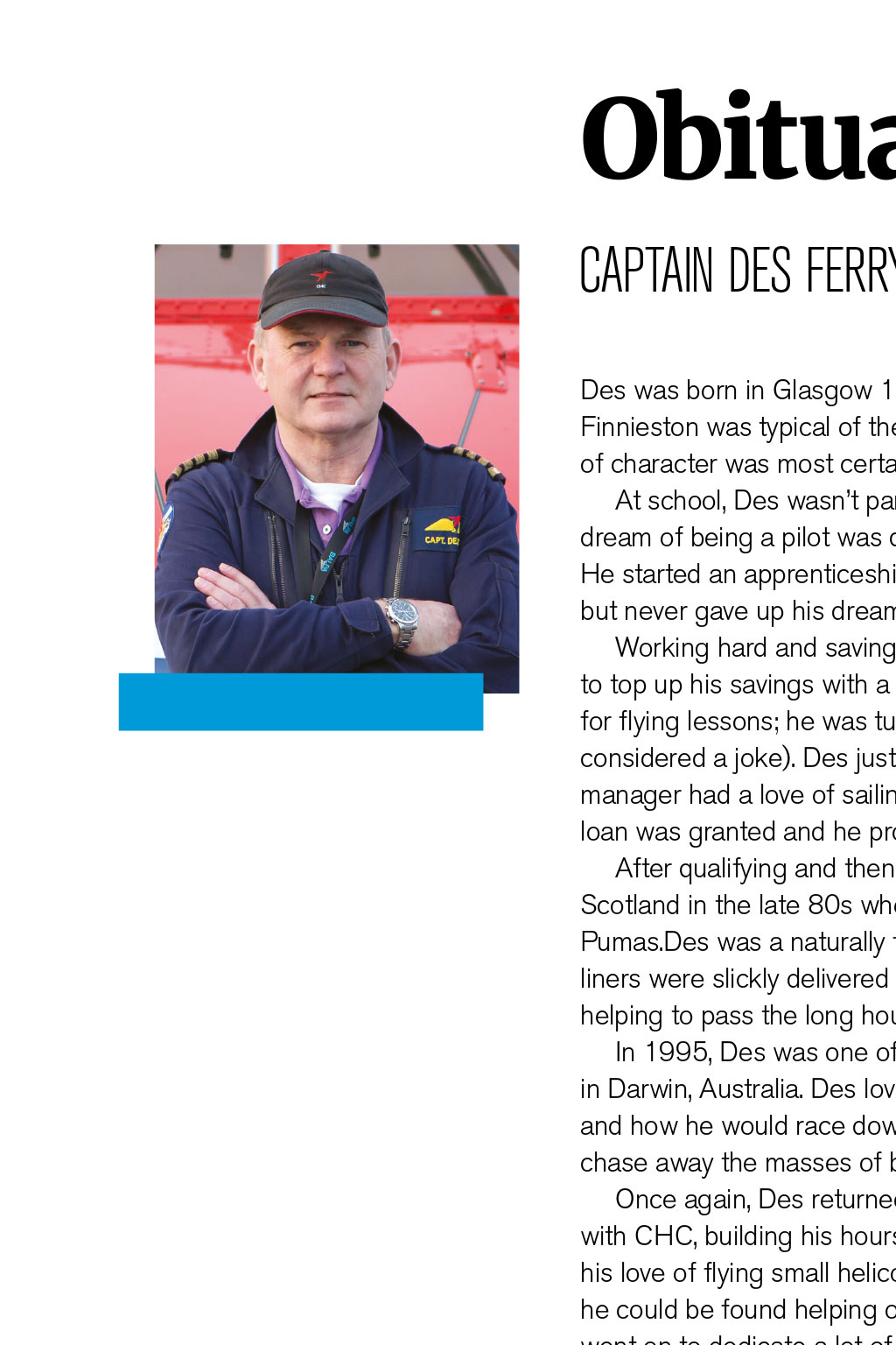 Obituary CAPTAIN DES FERRY (1955–2018) Des was born in Glasgow 1955. His upbringing in Maryhill, Drumchapel and Finnieston was typical of the times and, in those early days, it was where his strength of character was most certainly shaped. At school, Des wasn’t particularly academic but excelled at anything practical. His dream of being a pilot was quickly dismissed and he was simply told to pick a trade. He started an apprenticeship as an electrician and for several years worked the trade, but never gave up his dream of becoming a helicopter pilot. Working hard and saving every penny he could, he eventually decided he needed to top up his savings with a loan. He went to the bank explaining his need for money for flying lessons; he was turned down (something as exotic as flying lessons was considered a joke). Des just went to a different bank and after hearing how the manager had a love of sailing, Des told tell him he needed a loan to buy a boat. The loan was granted and he promptly flew to California to start his helicopter training. After qualifying and then working as an instructor in the US, Des returned to Scotland in the late 80s where he secured a job with Bond Helicopters flying Super Pumas.Des was a naturally funny guy; his sense of humour preceded him. His one- liners were slickly delivered and side splitting, even if you had heard them before, helping to pass the long hours in the crew room waiting for the haar to lift. In 1995, Des was one of the Bond pilots seconded to work for Lloyds Helicopters in Darwin, Australia. Des loved Australia and would recount stories of Mindil Beach and how he would race down the airstrip on Troughton Island in a pick-up truck to chase away the masses of birds and a few crocodiles so that the Dash 8 could land. Once again, Des returned to Aberdeen and continued his North Sea flying career with CHC, building his hours and experience, ending up flying the S92. He continued his love of flying small helicopters and teaching others how to fly them, and frequently he could be found helping out at PDG helicopters in Kintore, Aberdeenshire. He then went on to dedicate a lot of his free time to the charity Wings for Warriors where he taught injured veterans to fly. He was proud of his contribution and, as well as teaching, made a great friend in one of the students. He was immensely pleased when the student qualified as an instructor. In March 2018, after logging more than 20,000 flying hours, Des suddenly suffered a stroke. He spent two months in hospital and, when he came home, he embarked on an intensive programme of physiotherapy. His determination, strength and tenacity got him out of his wheelchair and walking with a stick, and he went from having no speech to cracking his one-liners again. However, on 1st November 2018, Des died peacefully at Aberdeen Royal Infirmary, with his wife Sarah at his side. He will always be remembered as a devoted husband to Sarah, a loving dad to Sean, Emilie and Max, and his wonderful qualities will become a long-lasting legacy to his family. Des will be sadly missed by everyone who was fortunate to have been a part of his life, as will his distinctive cheerful voice from across the airwaves of the North Sea. By Captain Peter Boston OBITUARY