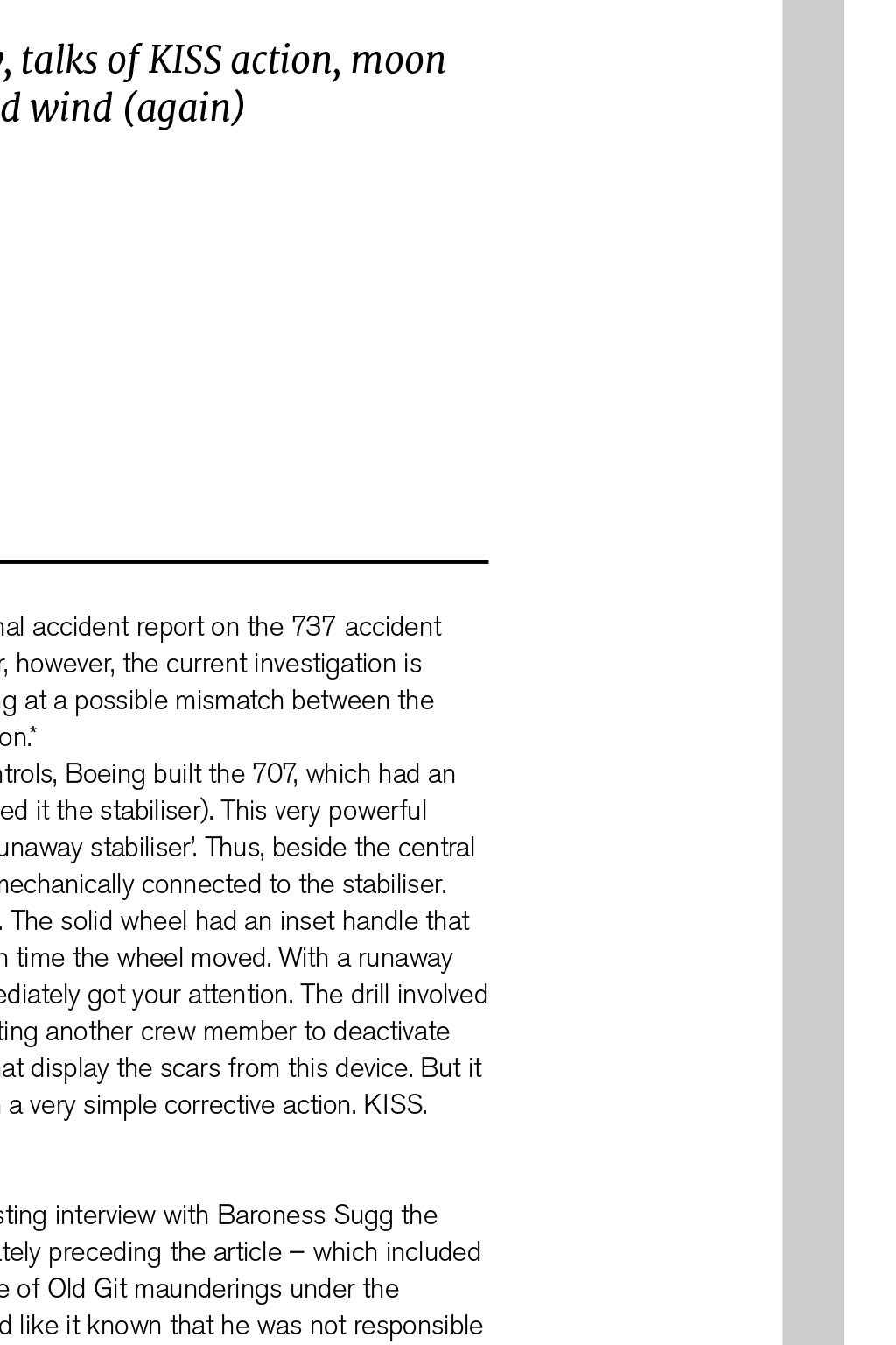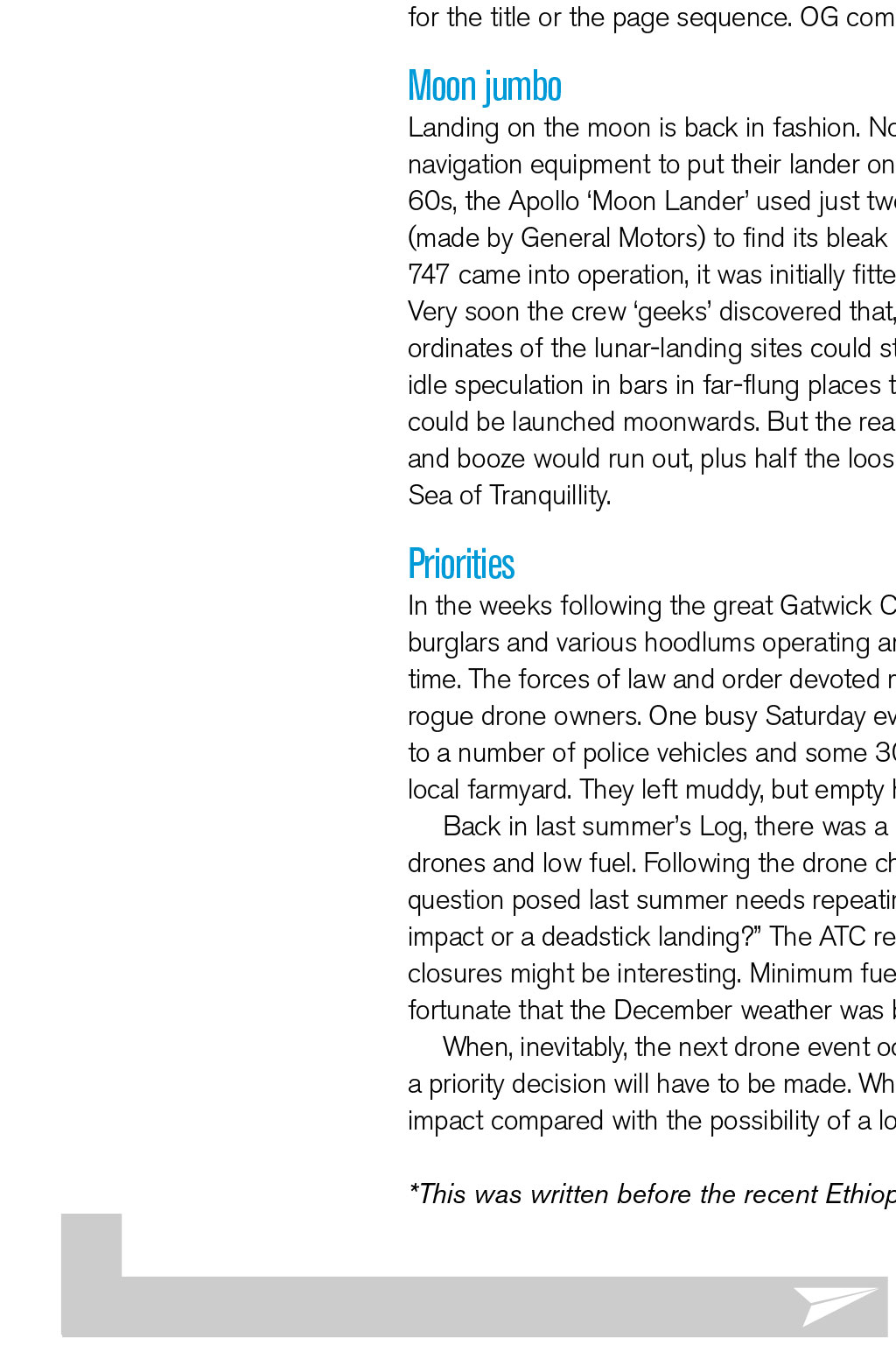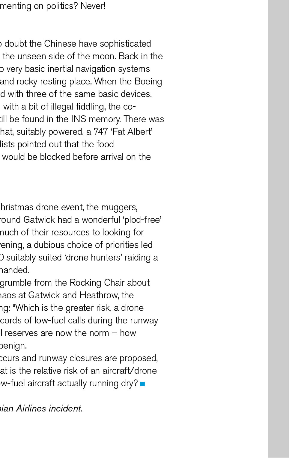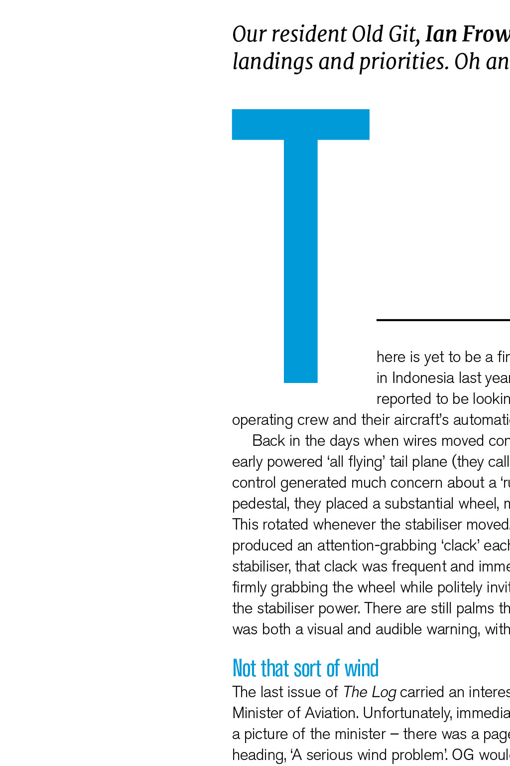 ROCKING CHAIR: Keep it simple, stupid (KISS) Our resident Old Git, Ian Frow, talks of KISS action, moon landings and priorities. Oh and wind (again) There is yet to be a final accident report on the 737 accident in Indonesia last year, however, the current investigation is reported to be looking at a possible mismatch between the operating crew and their aircraft’s automation.* Back in the days when wires moved controls, Boeing built the 707, which had an early powered ‘all flying’ tail plane (they called it the stabiliser). This very powerful control generated much concern about a ‘runaway stabiliser’. Thus, beside the central pedestal, they placed a substantial wheel, mechanically connected to the stabiliser. This rotated whenever the stabiliser moved. The solid wheel had an inset handle that produced an attention-grabbing ‘clack’ each time the wheel moved. With a runaway stabiliser, that clack was frequent and immediately got your attention. The drill involved firmly grabbing the wheel while politely inviting another crew member to deactivate the stabiliser power. There are still palms that display the scars from this device. But it was both a visual and audible warning, with a very simple corrective action. KISS. Not that sort of wind The last issue of The Log carried an interesting interview with Baroness Sugg the Minister of Aviation. Unfortunately, immediately preceding the article – which included a picture of the minister – there was a page of Old Git maunderings under the heading, ‘A serious wind problem’. OG would like it known that he was not responsible for the title or the page sequence. OG commenting on politics? Never! Moon jumbo Landing on the moon is back in fashion. No doubt the Chinese have sophisticated navigation equipment to put their lander on the unseen side of the moon. Back in the 60s, the Apollo ‘Moon Lander’ used just two very basic inertial navigation systems (made by General Motors) to find its bleak and rocky resting place. When the Boeing 747 came into operation, it was initially fitted with three of the same basic devices. Very soon the crew ‘geeks’ discovered that, with a bit of illegal fiddling, the co- ordinates of the lunar-landing sites could still be found in the INS memory. There was idle speculation in bars in far-flung places that, suitably powered, a 747 ‘Fat Albert’ could be launched moonwards. But the realists pointed out that the food and booze would run out, plus half the loos would be blocked before arrival on the Sea of Tranquillity. Priorities In the weeks following the great Gatwick Christmas drone event, the muggers, burglars and various hoodlums operating around Gatwick had a wonderful ‘plod-free’ time. The forces of law and order devoted much of their resources to looking for rogue drone owners. One busy Saturday evening, a dubious choice of priorities led to a number of police vehicles and some 30 suitably suited ‘drone hunters’ raiding a local farmyard. They left muddy, but empty handed. Back in last summer’s Log, there was a grumble from the Rocking Chair about drones and low fuel. Following the drone chaos at Gatwick and Heathrow, the question posed last summer needs repeating: “Which is the greater risk, a drone impact or a deadstick landing?” The ATC records of low-fuel calls during the runway closures might be interesting. Minimum fuel reserves are now the norm – how fortunate that the December weather was benign. When, inevitably, the next drone event occurs and runway closures are proposed, a priority decision will have to be made. What is the relative risk of an aircraft/drone impact compared with the possibility of a low-fuel aircraft actually running dry? *This was written before the recent Ethiopian Airlines incident. OPINION ROCKING CHAIR: ROCKING CHAIR: Keep it simple, stupid (KISS)
