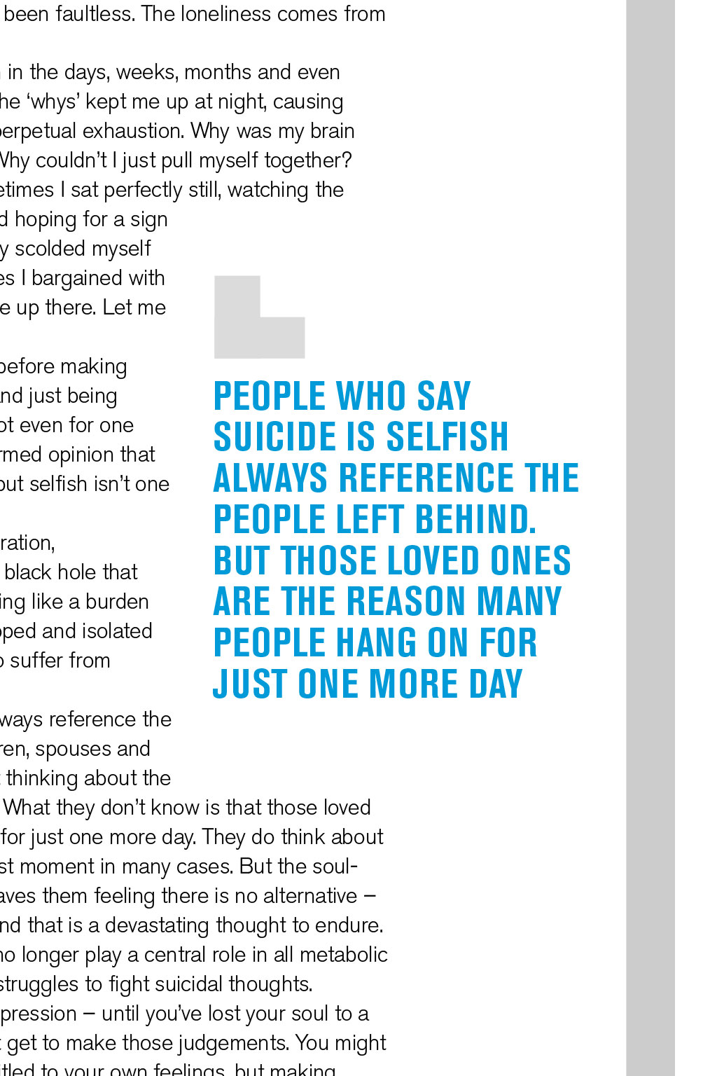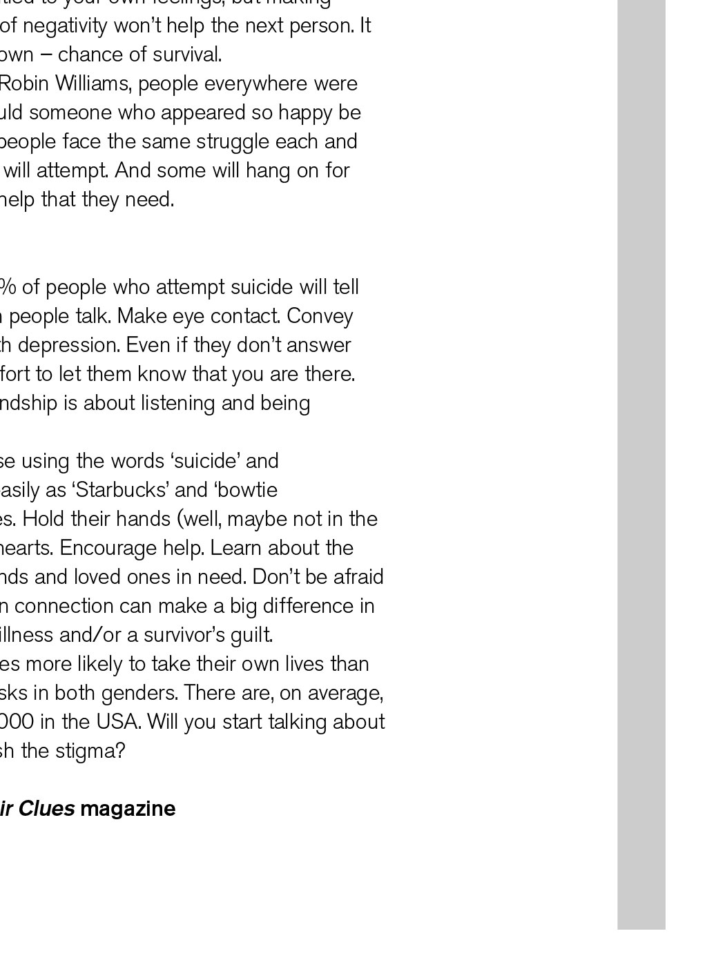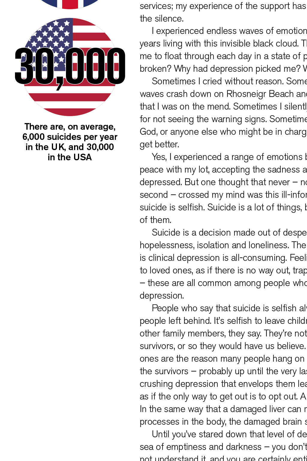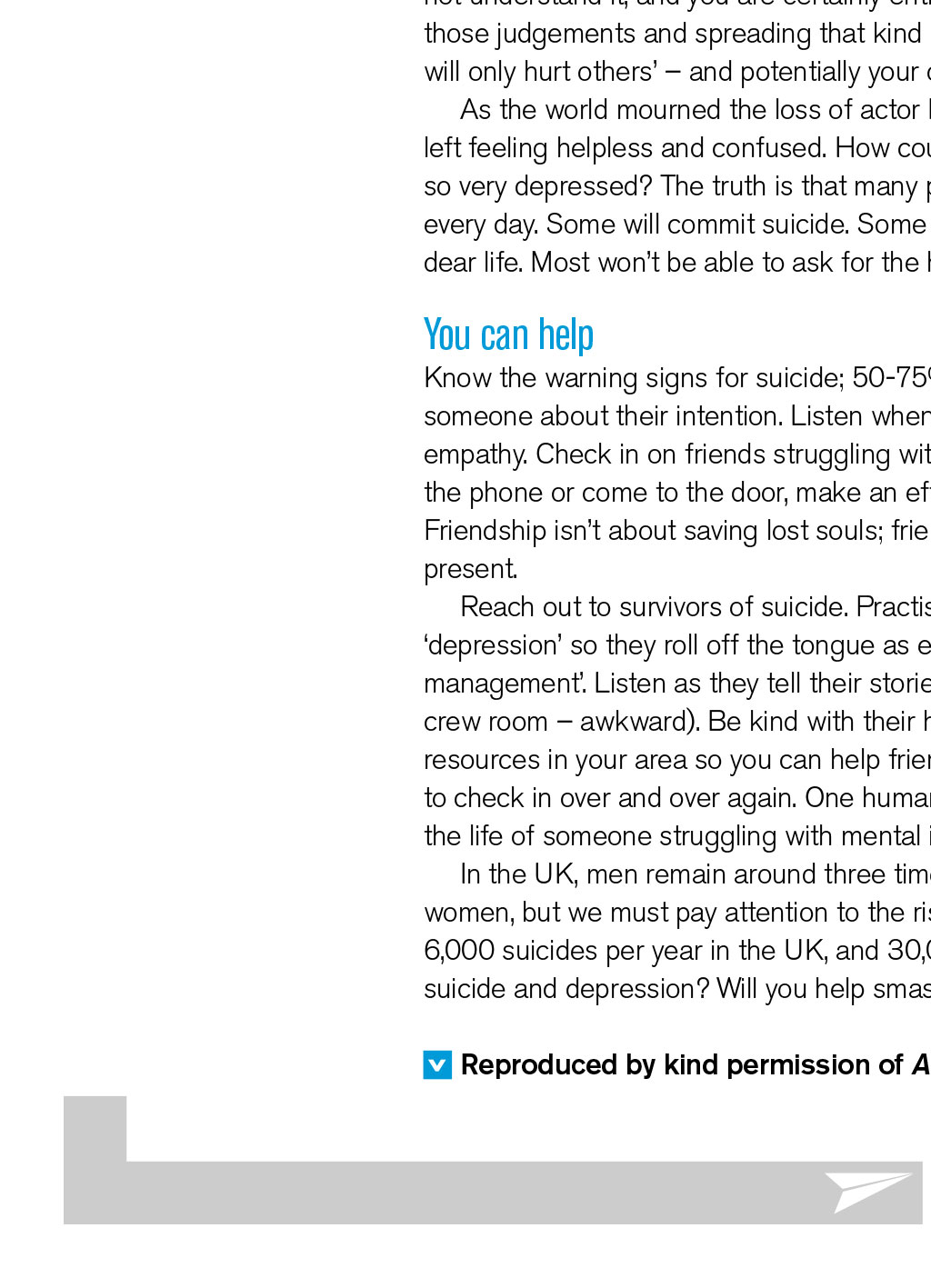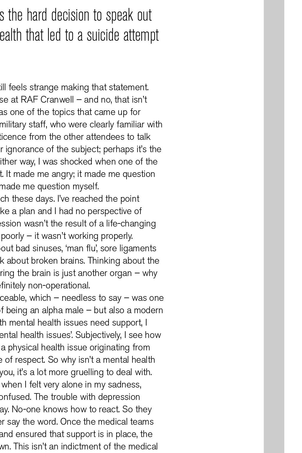 HELP THE STIGMA By Jamie Harms, Total Safety Manager, RAF Valley 6,000 30,000 There are, on average, 6,000 suicides per year in the UK, and 30,000 in the USA law of probabilities, however – and considering the brain is just another organ – why wouldn’t it break? Anyway, my brain was definitely non-operational. No-one could tell me why it was unserviceable, which – needless to say – was one of my biggest frustrations. The dichotomy of being an alpha male – but also a modern man – means that, while I accept others with mental health issues need support, I struggle to see myself as someone with ‘mental health issues’. Subjectively, I see how bizarre that is – especially considering that a physical health issue originating from a rugby injury would be considered a badge of respect. So why isn’t a mental health injury a rite of passage, too? I can promise you, it’s a lot more gruelling to deal with. There were times during my depression when I felt very alone in my sadness, and there were times when I felt lost and confused. The trouble with depression and suicide is that no-one knows what to say. No-one knows how to react. So they smile and attempt distraction, but they never say the word. Once the medical teams have made their assessment, taken action and ensured that support is in place, the survivors are often left to survive on their own. This isn’t an indictment of the medical services; my experience of the support has been faultless. The loneliness comes from the silence. I experienced endless waves of emotion in the days, weeks, months and even years living with this invisible black cloud. The ‘whys’ kept me up at night, causing me to float through each day in a state of perpetual exhaustion. Why was my brain broken? Why had depression picked me? Why couldn’t I just pull myself together? Sometimes I cried without reason. Sometimes I sat perfectly still, watching the waves crash down on Rhosneigr Beach and hoping for a sign that I was on the mend. Sometimes I silently scolded myself for not seeing the warning signs. Sometimes I bargained with God, or anyone else who might be in charge up there. Let me get better. Yes, I experienced a range of emotions before making peace with my lot, accepting the sadness and just being depressed. But one thought that never – not even for one second – crossed my mind was this ill-informed opinion that suicide is selfish. Suicide is a lot of things, but selfish isn’t one of them. Suicide is a decision made out of desperation, hopelessness, isolation and loneliness. The black hole that is clinical depression is all-consuming. Feeling like a burden to loved ones, as if there is no way out, trapped and isolated – these are all common among people who suffer from depression. PEOPLE WHO SAY SUICIDE IS SELFISH ALWAYS REFERENCE THE PEOPLE LEFT BEHIND. BUT THOSE LOVED ONES ARE THE REASON MANY PEOPLE HANG ON FOR JUST ONE MORE DAY People who say that suicide is selfish always reference the people left behind. It’s selfish to leave children, spouses and other family members, they say. They’re not thinking about the survivors, or so they would have us believe. What they don’t know is that those loved ones are the reason many people hang on for just one more day. They do think about the survivors – probably up until the very last moment in many cases. But the soul- crushing depression that envelops them leaves them feeling there is no alternative – as if the only way to get out is to opt out. And that is a devastating thought to endure. In the same way that a damaged liver can no longer play a central role in all metabolic processes in the body, the damaged brain struggles to fight suicidal thoughts. Until you’ve stared down that level of depression – until you’ve lost your soul to a sea of emptiness and darkness – you don’t get to make those judgements. You might not understand it, and you are certainly entitled to your own feelings, but making those judgements and spreading that kind of negativity won’t help the next person. It will only hurt others’ – and potentially your own – chance of survival. As the world mourned the loss of actor Robin Williams, people everywhere were left feeling helpless and confused. How could someone who appeared so happy be so very depressed? The truth is that many people face the same struggle each and every day. Some will commit suicide. Some will attempt. And some will hang on for dear life. Most won’t be able to ask for the help that they need. You can help Know the warning signs for suicide; 50-75% of people who attempt suicide will tell someone about their intention. Listen when people talk. Make eye contact. Convey empathy. Check in on friends struggling with depression. Even if they don’t answer the phone or come to the door, make an effort to let them know that you are there. Friendship isn’t about saving lost souls; friendship is about listening and being present. Reach out to survivors of suicide. Practise using the words ‘suicide’ and ‘depression’ so they roll off the tongue as easily as ‘Starbucks’ and ‘bowtie management’. Listen as they tell their stories. Hold their hands (well, maybe not in the crew room – awkward). Be kind with their hearts. Encourage help. Learn about the resources in your area so you can help friends and loved ones in need. Don’t be afraid to check in over and over again. One human connection can make a big difference in the life of someone struggling with mental illness and/or a survivor’s guilt. In the UK, men remain around three times more likely to take their own lives than women, but we must pay attention to the risks in both genders. There are, on average, 6,000 suicides per year in the UK, and 30,000 in the USA. Will you start talking about suicide and depression? Will you help smash the stigma? Reproduced by kind permission of Air Clues magazine A former Sea Harrier pilot makes the hard decision to