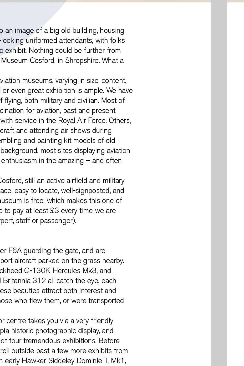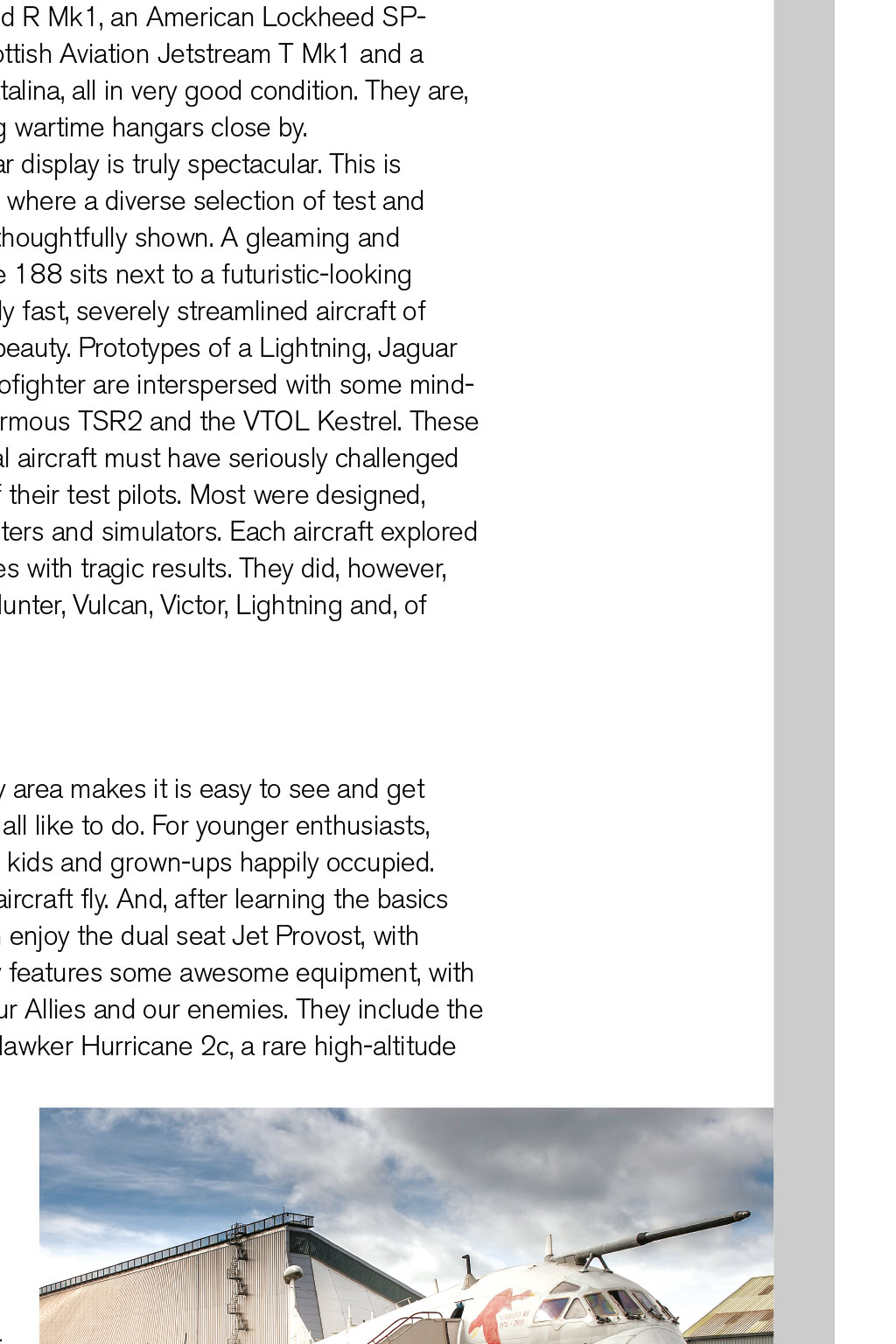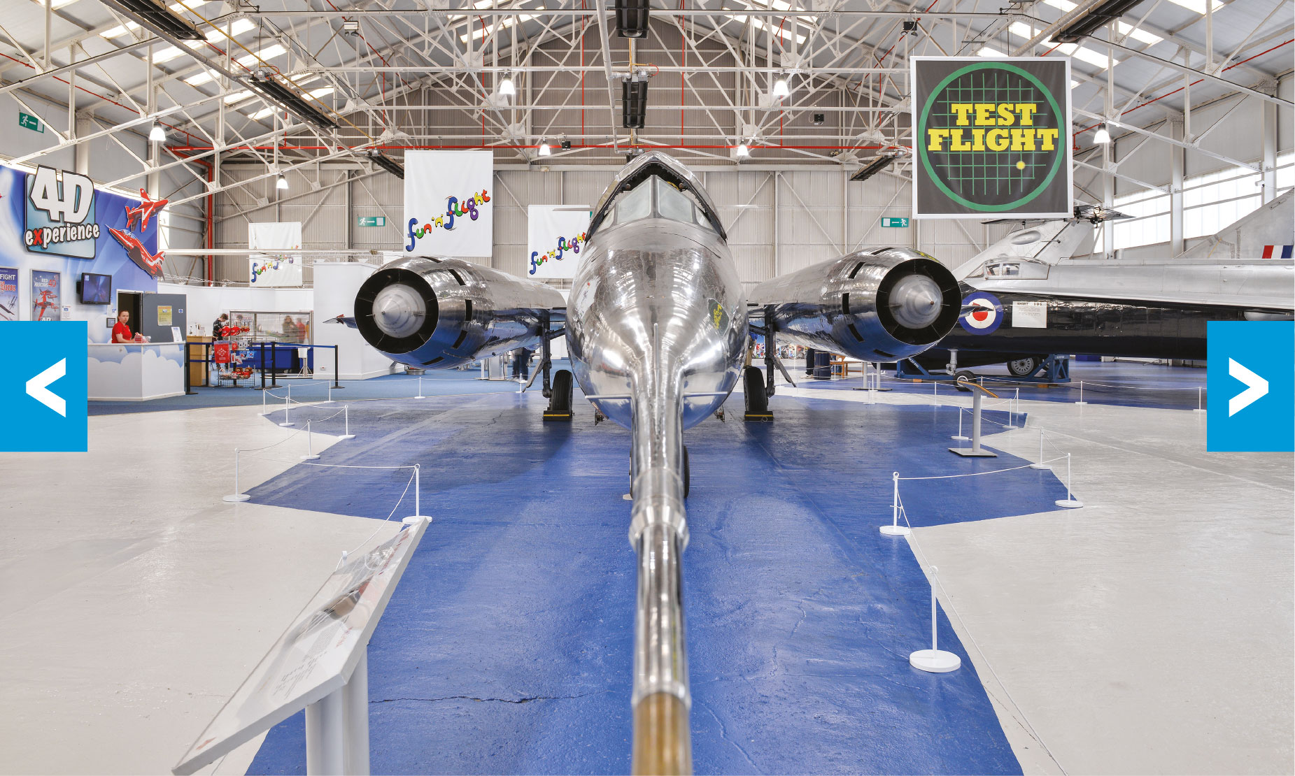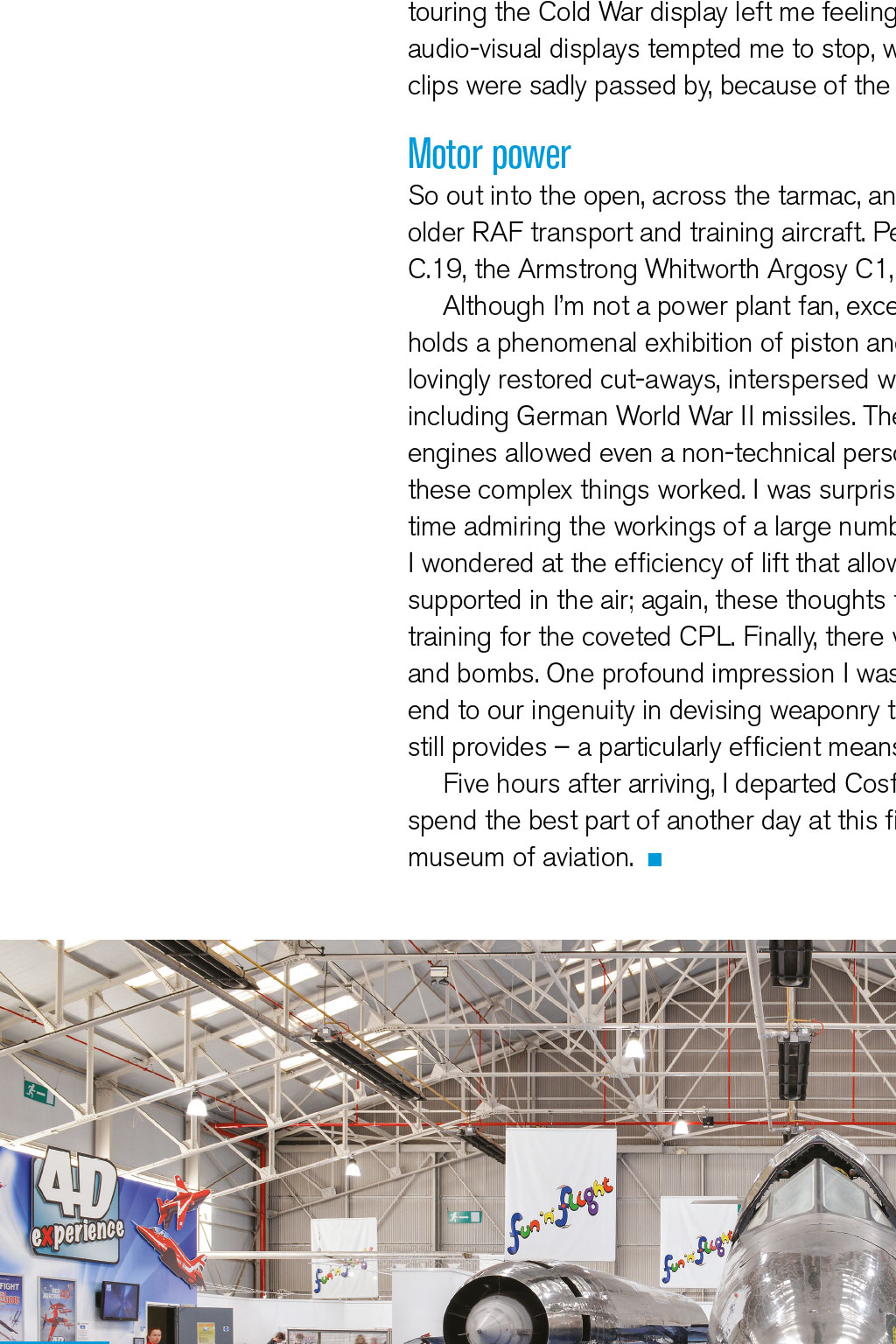 READ MORE For those fortunate enough to have access to private aircraft, flying visits to Cosford are encouraged, although Monday to Wednesday only. Training flights benefit from discounted landing fees. We take a tour of RAF Museum Cosford, which proves you don’t have to travel far to find something spectacular TRAVEL FLIGHT AT THE MUSEUM By David Keen, Log Board member The word ‘museum’ often conjures up an image of a big old building, housing silent dusty rooms, staffed by stern-looking uniformed attendants, with folks reverently filing along from exhibit to exhibit. Nothing could be further from this old-fashioned image than RAF Museum Cosford, in Shropshire. What a striking place it has become. A GLEAMING AND SHARP-POINTED BRISTOL TYPE 188 SITS NEXT TO A FUTURISTIC- LOOKING FAIREY FD2, BOTH INCREDIBLY FAST MACHINES, SEVERELY STREAMLINED AIRCRAFT OF AGGRESSIVE AERODYNAMIC BEAUTY emotion, particularly for those who flew them, or were transported inside them. Entry through the visitor centre takes you via a very friendly coffee shop, through a sepia historic photographic display, and then out towards the first of four tremendous exhibitions. Before reaching them, you can stroll outside past a few more exhibits from our recent past, notably an early Hawker Siddeley Dominie T. Mk1, a Hawker Siddeley Nimrod R Mk1, an American Lockheed SP-2H Neptune, an early Scottish Aviation Jetstream T Mk1 and a Consolidated PBY-6A Catalina, all in very good condition. They are, frankly, dwarfed by the big wartime hangars close by. Entry to the first hangar display is truly spectacular. This is the ‘Test Flight’ exhibition, where a diverse selection of test and experimental aircraft are thoughtfully shown. A gleaming and sharp-pointed Bristol Type 188 sits next to a futuristic-looking Fairey FD2, both incredibly fast, severely streamlined aircraft of aggressive aerodynamic beauty. Prototypes of a Lightning, Jaguar and a surprisingly big Eurofighter are interspersed with some mind-Great Britain is festooned with aviation museums, varying in size, content, and quality, so the scope for a good or even great exhibition is ample. We have a distinguished history in the field of flying, both military and civilian. Most of us BALPA members hold a real fascination for aviation, past and present. For some, it started in young adulthood, with service in the Royal Air Force. Others, me included, simply revelled in watching aircraft and attending air shows during their childhood. This was enhanced by assembling and painting kit models of old fighter and transport aircraft. Whatever our background, most sites displaying aviation heritage are great places for rekindling our enthusiasm in the amazing – and often very recent – history of aviation. So, onto the Midlands and, specifically, Cosford, still an active airfield and military base. This is a fascinating and enormous place, easy to locate, well-signposted, and with plenty of parking space. Entry to the museum is free, which makes this one of the best bargains in aviation today (we have to pay at least £3 every time we are dropped off or picked up at Manchester Airport, staff or passenger). Eye-catching displays Entering Cosford, you pass a Hawker Hunter F6A guarding the gate, and are immediately impressed by three large transport aircraft parked on the grass nearby. A stylish Vickers VC10, a tough-looking Lockheed C-130K Hercules Mk3, and a somewhat aristocratic and elegant Bristol Britannia 312 all catch the eye, each painted in quite different RAF markings. These beauties attract both interest and boggling older test aircraft, notably the enormous TSR2 and the VTOL Kestrel. These unusual and fearsome-looking experimental aircraft must have seriously challenged the courage, experience and intelligence of their test pilots. Most were designed, built and flown before the advent of computers and simulators. Each aircraft explored previously unknown areas of risk, sometimes with tragic results. They did, however, contribute to eventual successes like the Hunter, Vulcan, Victor, Lightning and, of course, Concorde. Getting up close The great thing is that the generous display area makes it is easy to see and get very close to all the exhibits, something we all like to do. For younger enthusiasts, a hands-on area called Fun ‘n’ Flight keeps kids and grown-ups happily occupied. Interactive displays help visitors learn how aircraft fly. And, after learning the basics of meteorology, radar and engines, one can enjoy the dual seat Jet Provost, with working controls. The War in the Air display features some awesome equipment, with an array of fighters and bombers of both our Allies and our enemies. They include the oldest surviving Supermarine Spitfire 1, a Hawker Hurricane 2c, a rare high-altitude Japanese bomber (the Mitsubishi Ki-46 Dinah), and all manner of unusual German aircraft and rocket planes. The names of Dornier, Messerschmitt, Focke Wulf, Junkers and more are all represented. The Gloster Gladiator 1 (aka Stringbag) caught my eye, beautifully restored, as did the gawky jet-powered Messerschmitt ME- 262A. Sitting high on its undercarriage, this first combat jet aircraft could have changed the course of World War II, had it been developed more rapidly and then built in sufficient numbers. Thankfully for the Allies, engine problems and Hitler’s interference with the project meant that the 262 was developed too late to have much impact. Rather morbidly, the tiny Japanese Yokosuka Ohka suicide rocket plane attracted close attention, as well as a measure of astonishment. What a devilish and unhappy killing machine it looked, automatically taking the life of its pilot while fulfilling its deadly task. Other beautiful aircraft displayed include the mighty Avro Lincoln B2, the petite Sopwith Pup, and the streamlined de Havilland Mosquito TT35. Even a Short Brothers Belfast has been squeezed into the exhibition, close to the veteran Handley Page Hasti