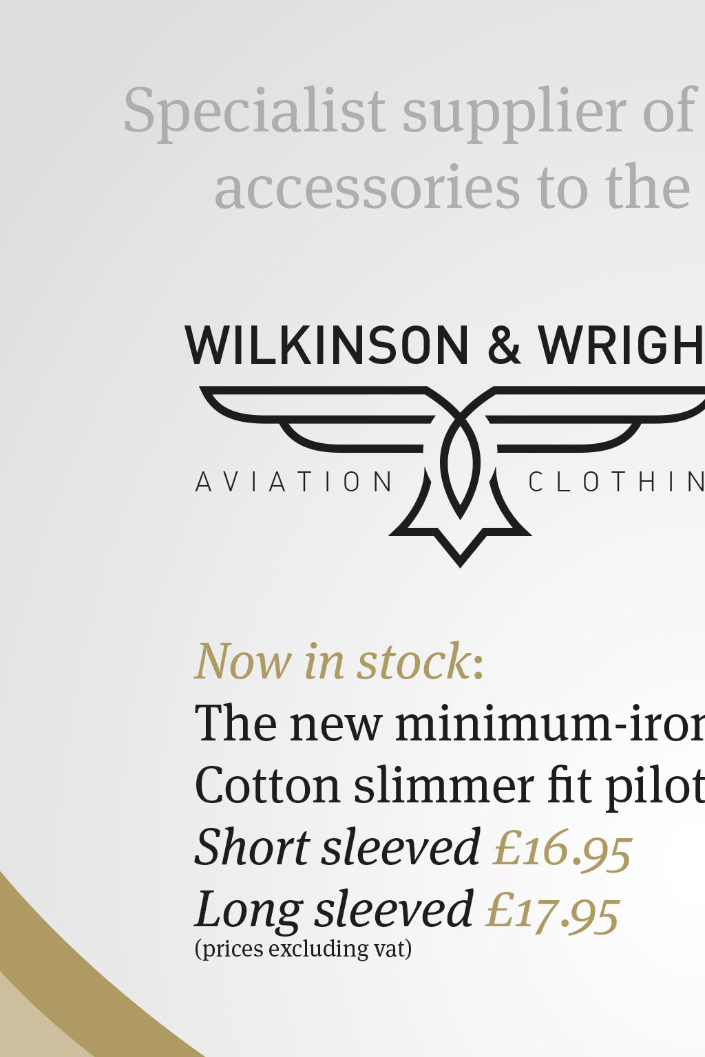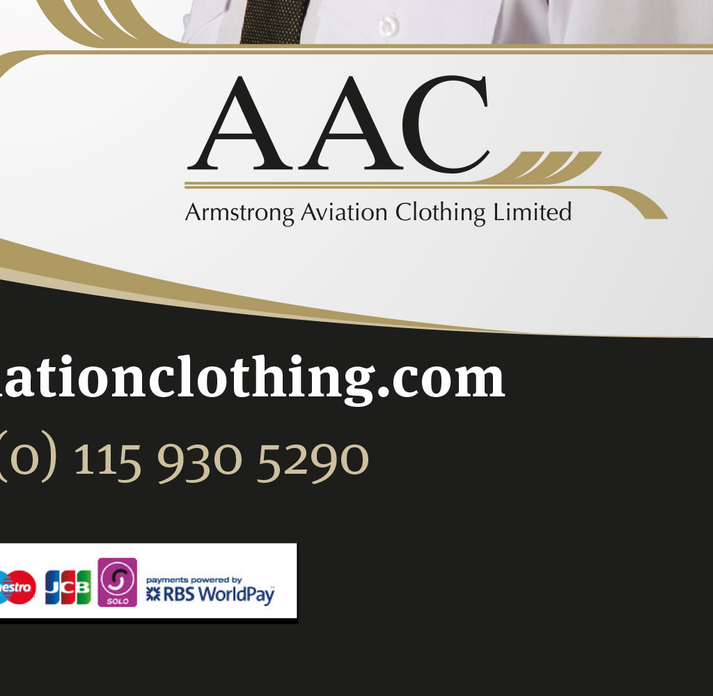 Specialist supplier of uniform apparel and accessories to the aviation industry. Proud to supply Pilots Uniforms to WILKINSON & WRIGHT AVIATION CLOTHING Now in stock: The new minimum-iron 100% Cotton slimmer fit pilot shirt Short sleeved £16.95 Long sleeved £17.95 (prices excluding vat) http://ryanair.pilotsuniform www.armstrongaviationclothing.com access only through CREWDOCK.COM or directly at www.armstrongaviationclothing.com Telephone +44 (0) 115 930 5290 Telephone +44 (0)115 850 8130 • Complete Uniforms • Epaulette Sliders • Shirts • Ties • Belts • Hi Viz