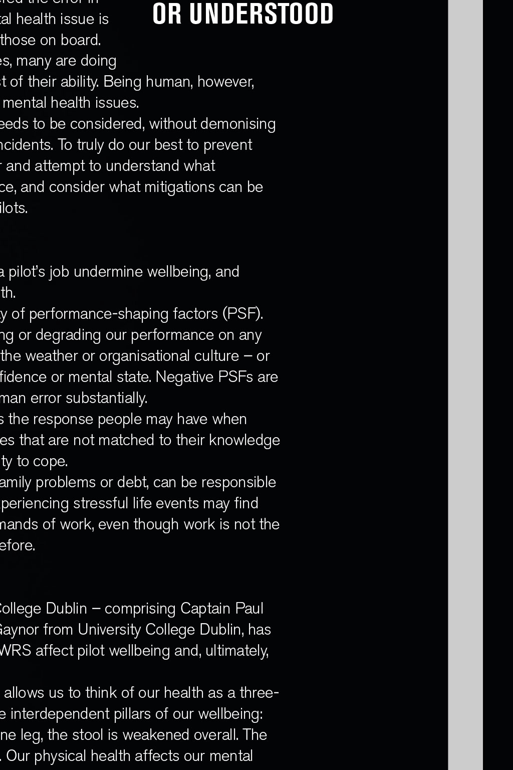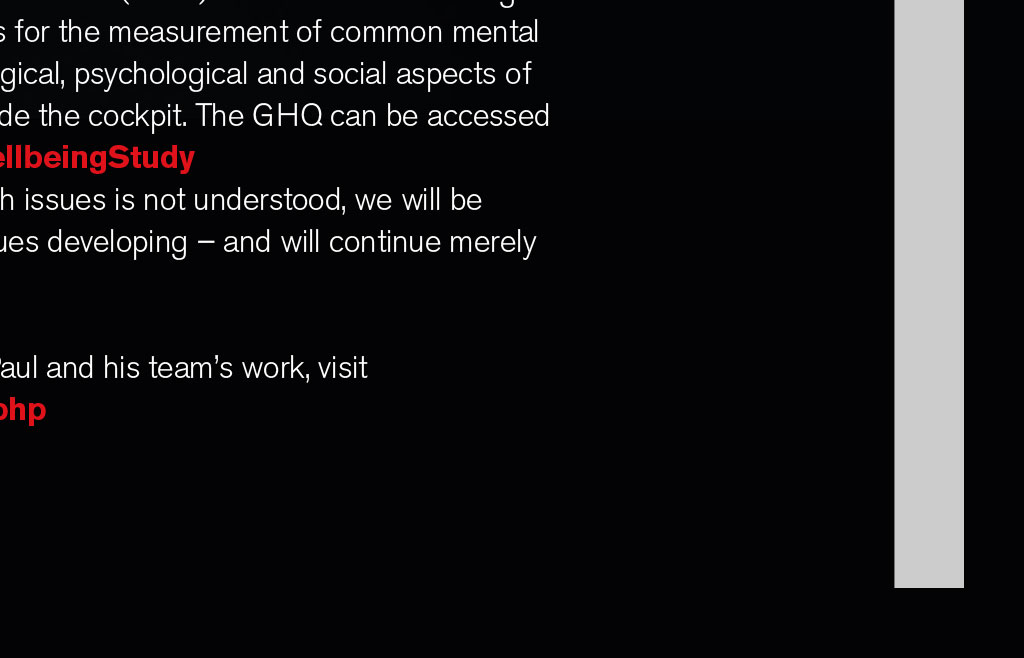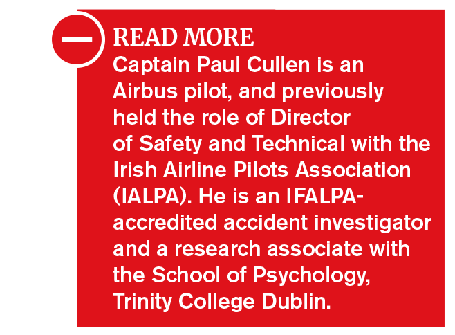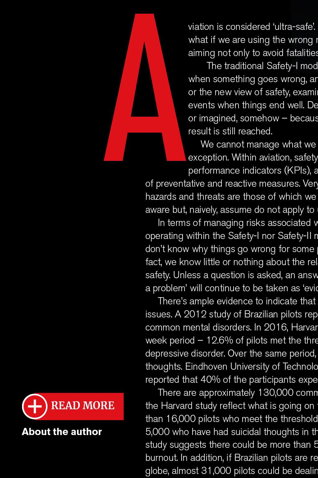 Since 2015, a research team from Trinity College Dublin has been attempting to understand how sources of work-related stress are affecting pilot wellbeing and, ultimately, impacting on performance and flight safety By Captain Paul Cullen, IFALPA-accredited Accident Investigator A READ MORE About the author viation is considered ultra-safe. Fatal accidents are exceptionally rare but what if we are using the wrongmetric to measure safety? Should we be aimingnot only to avoid fatalities, but also to do no harm in the process? SThe traditional Safety-I model focuses on the relatively rare events when something goes wrong, and things end badly. The Safety-II model, or the new view of safety, examines the relatively higher proportion of events when things end well. Despite things not going exactly as planned or imagined, somehow because of resilience in the system a safe end result is still reached. We cannot manage what we cannot measure, and safety is no exception. Within aviation, safety performance is monitored using key performance indicators (KPIs), and safety is managed using a combination of preventative and reactive measures. Very often, however, the most dangerous hazards and threats are those of which we are not aware or those of which we are aware but, naively, assume do not apply to us. In terms of managing risks associated with pilot wellbeing, we are neither operating within the Safety-I nor Safety-II model, but, instead, within Safety-ZERO. We dont know why things go wrong for some pilots, or why things go right for others. In fact, we know little or nothing about the relationship between pilot wellbeing and flight safety. Unless a question is asked, an answer will never be found, and no evidence of a problem will continue to be taken as evidence of no problem. Theres ample evidence to indicate that pilots are suffering with mental health issues. A 2012 study of Brazilian pilots reported an incidence rate of 23.7% for common mental disorders. In 2016, Harvard University reported that over a twoweek period 12.6% of pilots met the threshold for clinical depression or a major depressive disorder. Over the same period, 4.1% of pilots reported having suicidal thoughts. Eindhoven University of Technology studied British pilots and, in 2018, reported that 40% of the participants experienced high burnout. There are approximately 130,000 commercial pilots flying today. Ifthe results of the Harvard study reflect what is going on throughout the world, there could be more than 16,000 pilots who meet the threshold for clinical depression and more than 5,000 who have had suicidal thoughts in the past fortnight. Equally, the Eindhoven study suggests there could be more than 50,000 pilots flying while experiencing burnout. In addition, if Brazilian pilots are representative of their colleagues across the globe, almost 31,000 pilots could be dealing with a common mental disorder right now. NOTAMS To begin with, the flight crew were unaware or could not recall information of a runway closure at SFO. The NTSB report indicates that this pre-flight information was presented via NOTAM page eight of 27, and was the fourth line on the in-flight ACARS information. Pilots reading this will know the reality of pre-flight reviews of NOTAMs. They are not easy to digest, and there is often insufficient time to read and disentangle poorly described bits of information. This can place an intolerably heavy burden on crews to find the needle in the haystack that is relevant to their upcoming flight, particularly when priority items may be buried under pages of other irrelevant items. In this incident, the first officer did not recall a specific NOTAM about 28L closure, while the captains actions in lining up on the taxiway suggest that he did not recall that information. Hence, for this approach, both flight crew had the expectation of illuminated normally configured parallel runways 28L/28R. Expectation bias and conflicting cues The captain and first officer were experienced and familiar with the SFO runway configuration. The captain had not experienced a previous occasion in which either runway had been dark, so both flight crew expected to see two illuminated parallel runways on their descent. While there would have been light cues coming from the taxiway, such as green (not white) centreline lights and taxiway in-pavement flashing guard lights, which differ to the surface of a runway, there were also a number of visually supporting clues that fed into taxiway Cs resemblance to runway 28R. Specifically, the navigation lights on the wingtips of the aeroplanes lined up on the taxiway partially resembled the runway edge lighting, while their flashing red beacon lights were consistent with features associated with approach lighting. Another supporting cue was the presence of runway and approach lights on the actual 28R, which would have appeared to the left of the pilots primary field of vision, and hence appeared to confirm they were correctly situated with respect to the normally adjacent parallel runway 28L. This expectation bias should not be understated runway lighting aids are normally powerfully conspicuous features, but humans are vastly better at recognising salient features that pop out than detecting missing features or slightly off-hue features, particularly under night-time conditions.. The NTSB analysis also notes that while a runway closure marker a flashing white X was placed at the start of runway 28L, it would not have been in the flight crews primary field of view, and the flash rate (2.5 seconds on and off) may have been too slow to capture their attention unless they were looking in that direction. The flight crew from the preceding DA 521 flight into SFO, who were aware of the runway closure, also reported that the taxiway lights gave the impression that the surface could have been a runway, especially as no aeroplane shapes could be seen. So, even though their expectations were different a