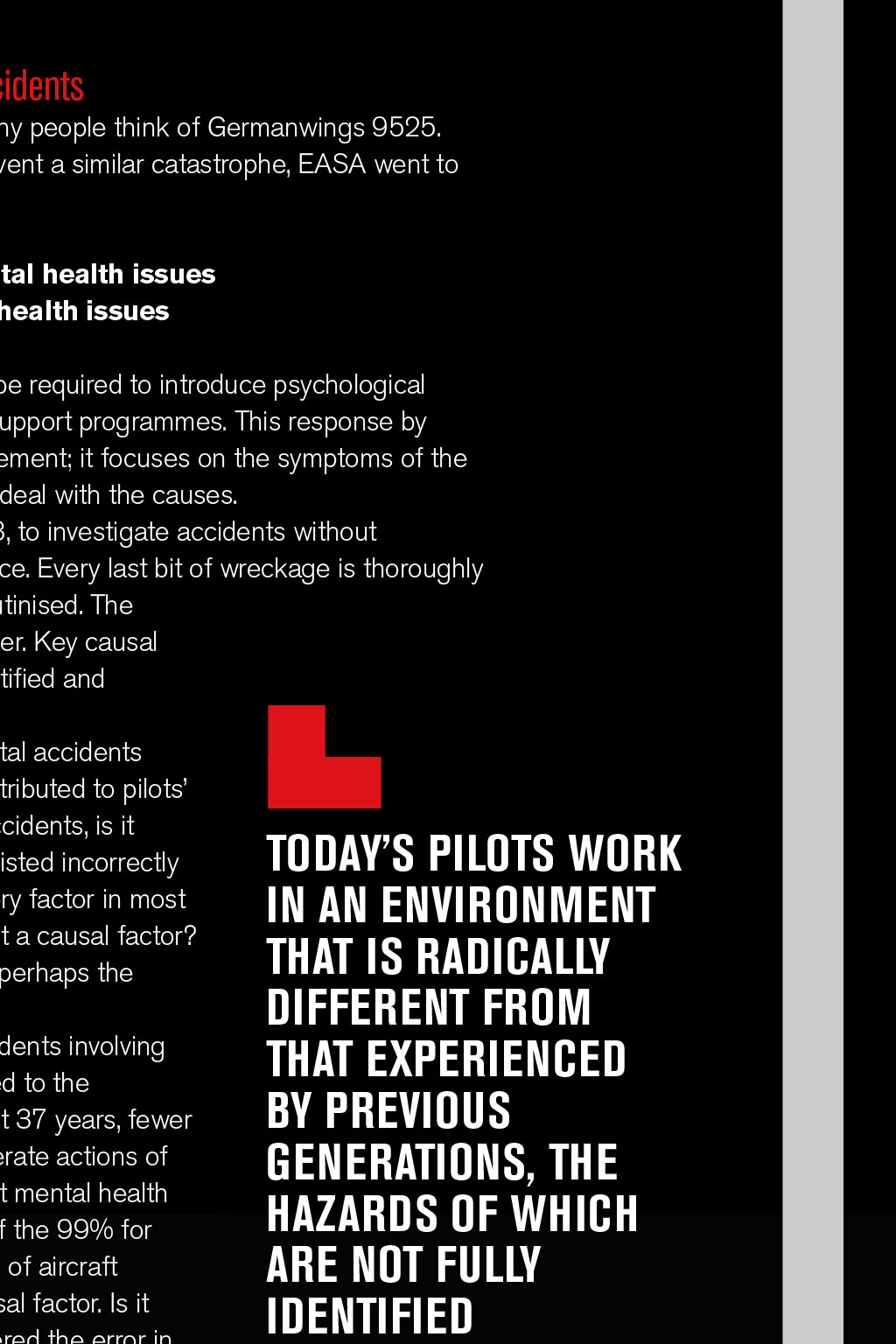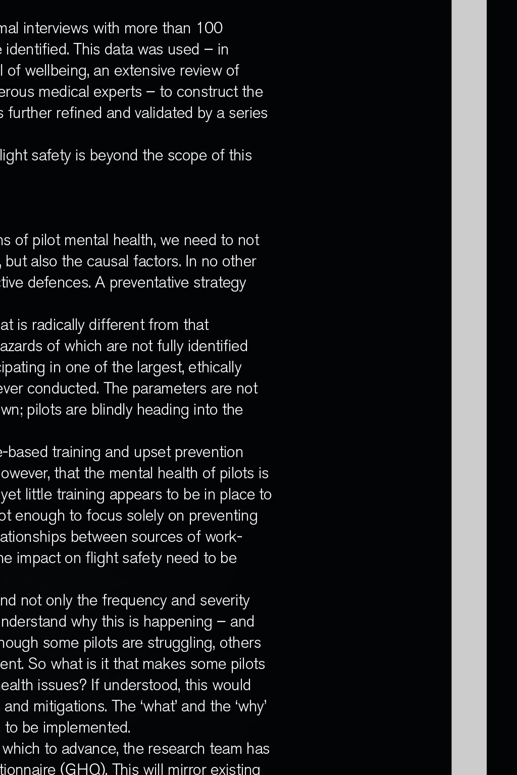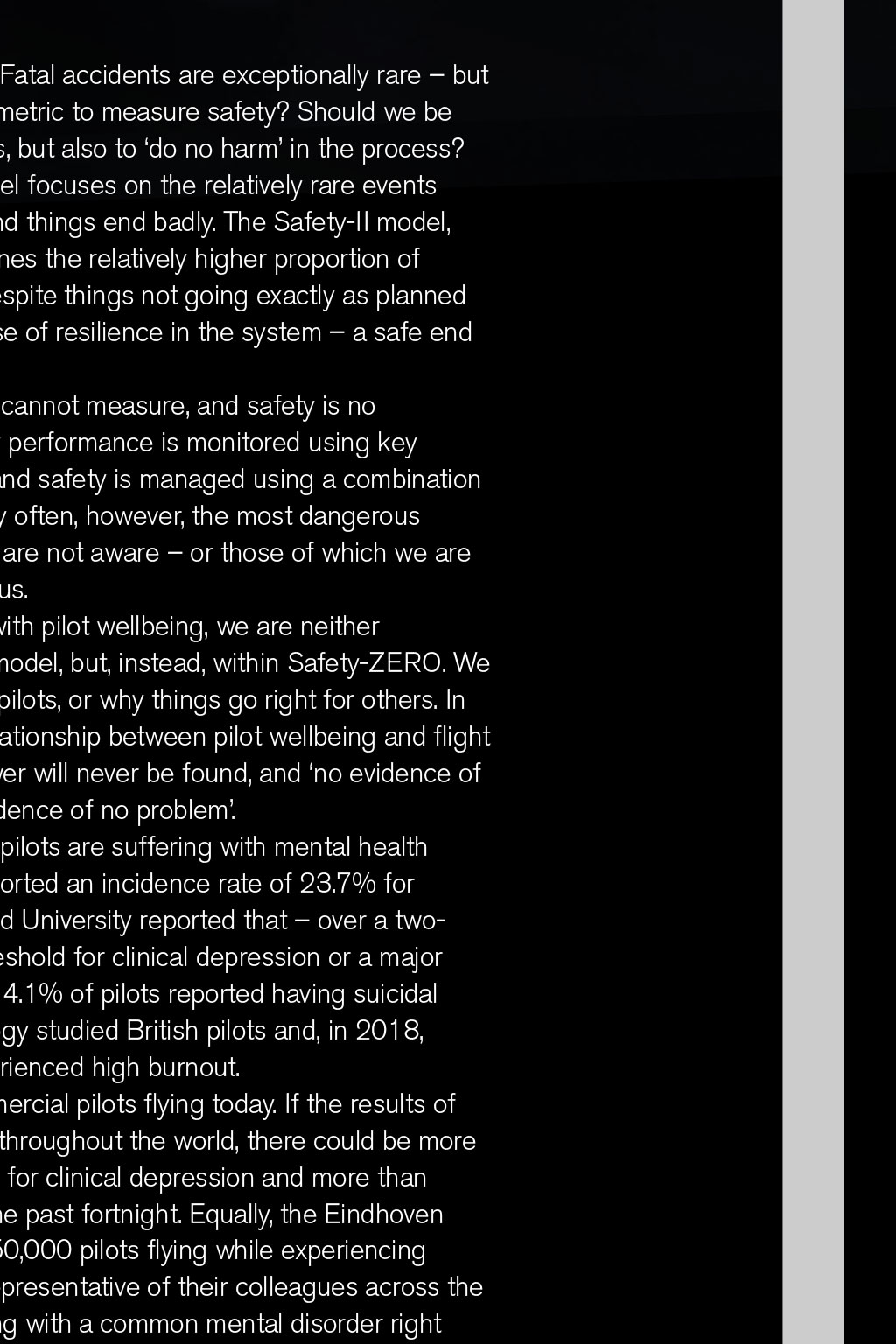 Since 2015, a research team from Trinity College Dublin has been attempting to understand how sources of work-related stress are affecting pilot wellbeing and, ultimately, impacting on performance and flight safety By Captain Paul Cullen, IFALPA-accredited Accident Investigator A READ MORE About the author viation is considered ultra-safe. Fatal accidents are exceptionally rare but what if we are using the wrongmetric to measure safety? Should we be aimingnot only to avoid fatalities, but also to do no harm in the process? SThe traditional Safety-I model focuses on the relatively rare events when something goes wrong, and things end badly. The Safety-II model, or the new view of safety, examines the relatively higher proportion of events when things end well. Despite things not going exactly as planned or imagined, somehow because of resilience in the system a safe end result is still reached. We cannot manage what we cannot measure, and safety is no exception. Within aviation, safety performance is monitored using key performance indicators (KPIs), and safety is managed using a combination of preventative and reactive measures. Very often, however, the most dangerous hazards and threats are those of which we are not aware or those of which we are aware but, naively, assume do not apply to us. In terms of managing risks associated with pilot wellbeing, we are neither operating within the Safety-I nor Safety-II model, but, instead, within Safety-ZERO. We dont know why things go wrong for some pilots, or why things go right for others. In fact, we know little or nothing about the relationship between pilot wellbeing and flight safety. Unless a question is asked, an answer will never be found, and no evidence of a problem will continue to be taken as evidence of no problem. Theres ample evidence to indicate that pilots are suffering with mental health issues. A 2012 study of Brazilian pilots reported an incidence rate of 23.7% for common mental disorders. In 2016, Harvard University reported that over a twoweek period 12.6% of pilots met the threshold for clinical depression or a major depressive disorder. Over the same period, 4.1% of pilots reported having suicidal thoughts. Eindhoven University of Technology studied British pilots and, in 2018, reported that 40% of the participants experienced high burnout. There are approximately 130,000 commercial pilots flying today. Ifthe results of the Harvard study reflect what is going on throughout the world, there could be more than 16,000 pilots who meet the threshold for clinical depression and more than 5,000 who have had suicidal thoughts in the past fortnight. Equally, the Eindhoven study suggests there could be more than 50,000 pilots flying while experiencing burnout. In addition, if Brazilian pilots are representative of their colleagues across the globe, almost 31,000 pilots could be dealing with a common mental disorder right now. NOTAMS To begin with, the flight crew were unaware or could not recall information of a runway closure at SFO. The NTSB report indicates that this pre-flight information was presented via NOTAM page eight of 27, and was the fourth line on the in-flight ACARS information. Pilots reading this will know the reality of pre-flight reviews of NOTAMs. They are not easy to digest, and there is often insufficient time to read and disentangle poorly described bits of information. This can place an intolerably heavy burden on crews to find the needle in the haystack that is relevant to their upcoming flight, particularly when priority items may be buried under pages of other irrelevant items. In this incident, the first officer did not recall a specific NOTAM about 28L closure, while the captains actions in lining up on the taxiway suggest that he did not recall that information. Hence, for this approach, both flight crew had the expectation of illuminated normally configured parallel runways 28L/28R. Expectation bias and conflicting cues The captain and first officer were experienced and familiar with the SFO runway configuration. The captain had not experienced a previous occasion in which either runway had been dark, so both flight crew expected to see two illuminated parallel runways on their descent. While there would have been light cues coming from the taxiway, such as green (not white) centreline lights and taxiway in-pavement flashing guard lights, which differ to the surface of a runway, there were also a number of visually supporting clues that fed into taxiway Cs resemblance to runway 28R. Specifically, the navigation lights on the wingtips of the aeroplanes lined up on the taxiway partially resembled the runway edge lighting, while their flashing red beacon lights were consistent with features associated with approach lighting. Another supporting cue was the presence of runway and approach lights on the actual 28R, which would have appeared to the left of the pilots primary field of vision, and hence appeared to confirm they were correctly situated with respect to the normally adjacent parallel runway 28L. This expectation bias should not be understated runway lighting aids are normally powerfully conspicuous features, but humans are vastly better at recognising salient features that pop out than detecting missing features or slightly off-hue features, particularly under night-time conditions.. The NTSB analysis also notes that while a runway closure marker a flashing white X was placed at the start of runway 28L, it would not have been in the flight crews primary field of view, and the flash rate (2.5 seconds on and off) may have been too slow to capture their attention unless they were looking in that direction. The flight crew from the preceding DA 521 flight into SFO, who were aware of the runway closure, also reported that the taxiway lights gave the impression that the surface could have been a runway, especially as no aeroplane shapes could be seen. So, even though their expectations were different a