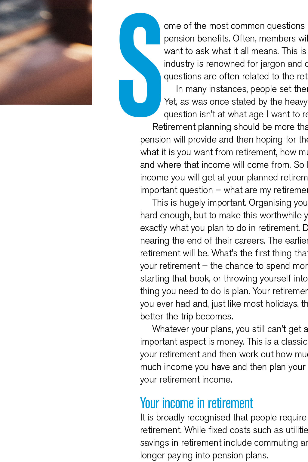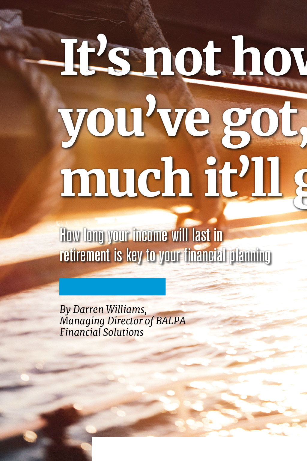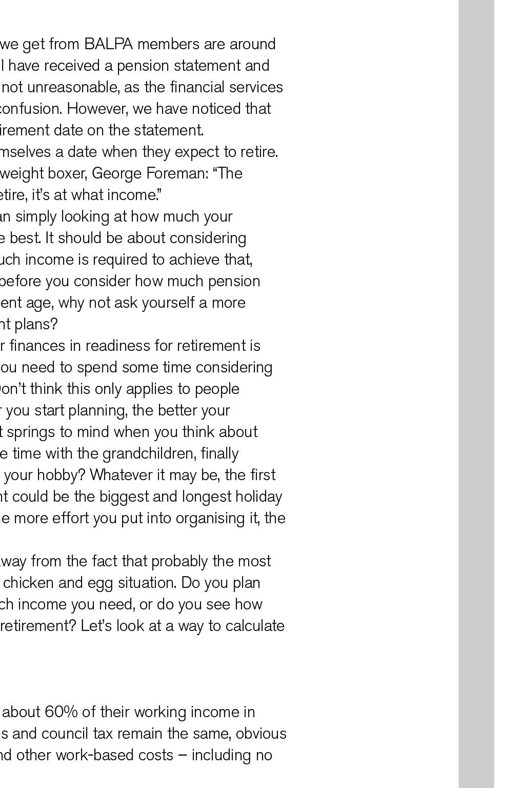 How long your income will last in retirement is key to your financial planning By Darren Williams, Managing Director of BALPA Financial Solutions ome of the most common questions we get from BALPA members are around pension benefits. Often, members will have received a pension statement and want to ask what it all means. Thisis not unreasonable, as the financial services industry is renowned for jargon and confusion. However, we have noticed that questions are often related to the retirement date on the statement. In many instances, people set themselves a date when they expect to retire. Yet, as was once stated by the heavyweight boxer, George Foreman: The question isnt at what age I want to retire, its at what income. Retirement planning should be more than simply looking at how much your pension will provide and then hoping for the best. It should be about considering what it is you want from retirement, how much income is required to achieve that, andwhere that income will come from. So before you consider how much pension income you will get at your planned retirement age, why not ask yourself a more important question what are my retirement plans? This is hugely important. Organising your finances in readiness for retirement is hard enough, but to make this worthwhile you need to spend some time considering exactly what you plan to do in retirement. Dont think this only applies to people nearing the end of their careers. The earlier you start planning, the better your retirement will be. Whats the first thing that springs to mind when you think about your retirement the chance to spend more time with the grandchildren, finally starting that book, or throwing yourself into your hobby? Whatever it may be, the first thing you need to do is plan. Your retirement could be the biggest and longest holiday you ever had and, just like most holidays, the more effort you put into organising it, the better the trip becomes. Whatever your plans, you still cant get away from the fact that probably the most important aspect is money. This is a classic chicken and egg situation. Do you plan your retirement and then work out how much income you need, or do you see how much income you have and then plan your retirement? Lets look at a way to calculate your retirement income. Your income in retirement It is broadly recognised that people require about 60% of their working income in retirement. While fixed costs such as utilities and council tax remain the same, obvious savings inretirement include commuting and other work-based costs including no longer paying into pension plans. A slightly more detailed way to consider retirement income is to do a budget analysis. The best way to do this is to consider four key elements you will need from your income in retirement: nYour monthly and annual fixed outgoings These will be your utilities, payments for the car, insurances and food. nYour day-to-day money This is simply what you need to go about your daily business coffees, lunches, the odd trip out. You may also incorporate items such as annual subscriptions and charitable giving. nRainy-day money This is to pay for emergencies, such ascar or house repairs and unexpected bills. nMajor expenditure This covers things such as holidays, car replacement, or a new kitchen. The first two sections will need to be covered by money in your current account and the third will normally be financed from cash in a savings account. Your major expenses such asholidays, car replacement and that sort of thing must still be deemed as expenditure, but may not necessarily be met out of your annual income. This should give you an idea of what sort of income is required. Remember what George Foreman said, its not your age that should drive retirement, but your financial situation. There are two further things to consider: nDoes your income need to remain the same in retirement? nHow long does your income need to last? Your income needs will clearly be driven by life expectancy and you will also have different income needs as you progress through retirement. So your income in retirement will need to be flexible to meet these requirements: nEarly retirement, high expenditure When you first retire, you may want to do READ MORE many of the things you have always wanted to do. This will feel like the perfect time to climb Mount Kilimanjaro, its a great opportunity to visit North Carolina, South Korea, the West Indies or even East Anglia. Whatever it may be, there are normally cost implications and they must be built into your expenditure plans. nMid retirement, low expenditure Once you have settled into retirement and the vast plains of East Anglia have been explored, it is more likely your biggest challenge will be the hedge that needs trimming. You may find your health is not as good as it was or you simply wish to enjoy the peace and tranquillity that retirement brings. Broadly, you can expect your income requirements to be lower than they were - but, of course, this will differ from person to person. nLate retirement, potential high expenditure Sadly, very few people live through retirement without any health issues, and the older you get, the more expensive this can become, with potential care costs a genuine concern. Finally, how long is long term? Its paradoxical that the idea of living a long life appeals to everyone, but the idea of getting old doesnt appeal to anyone. Longevity is clearly an important issue and one where advice is crucial. Working out how much income is enough is clearly a detailed calculation, but one that is also full of what ifs. You must consider all scenarios, preferably before you get to your retirement date. It is quite clear that planning for retirement is not a simple process but, by using sophisticated planning tools and support from a financial planner, you can start to think more carefully about the level of income you need in retirement and which of your assets will drive that income. Then, on
