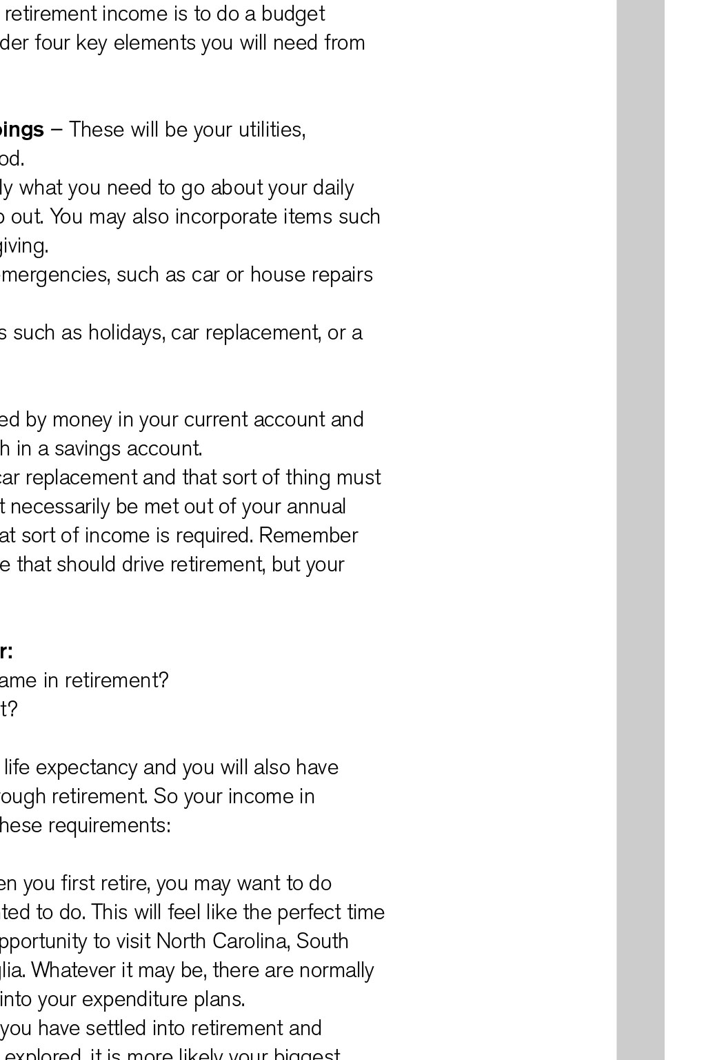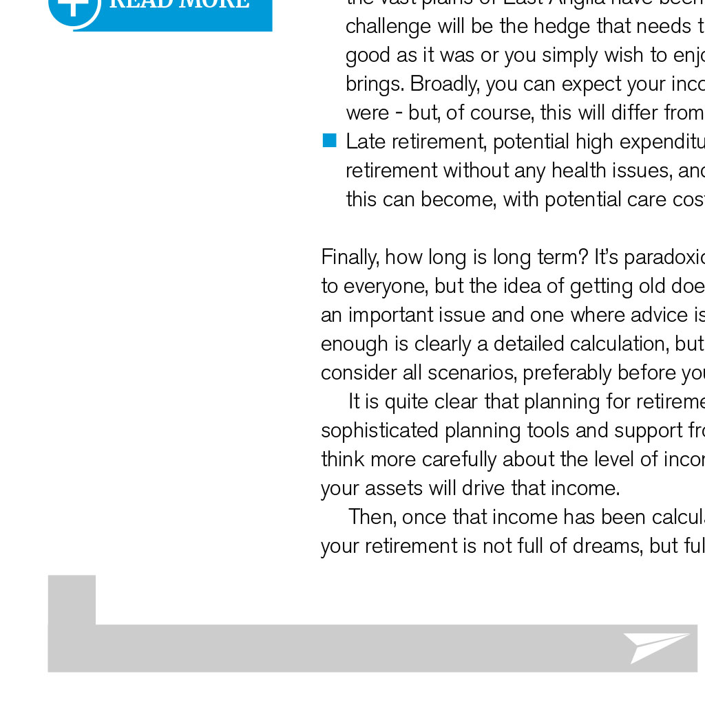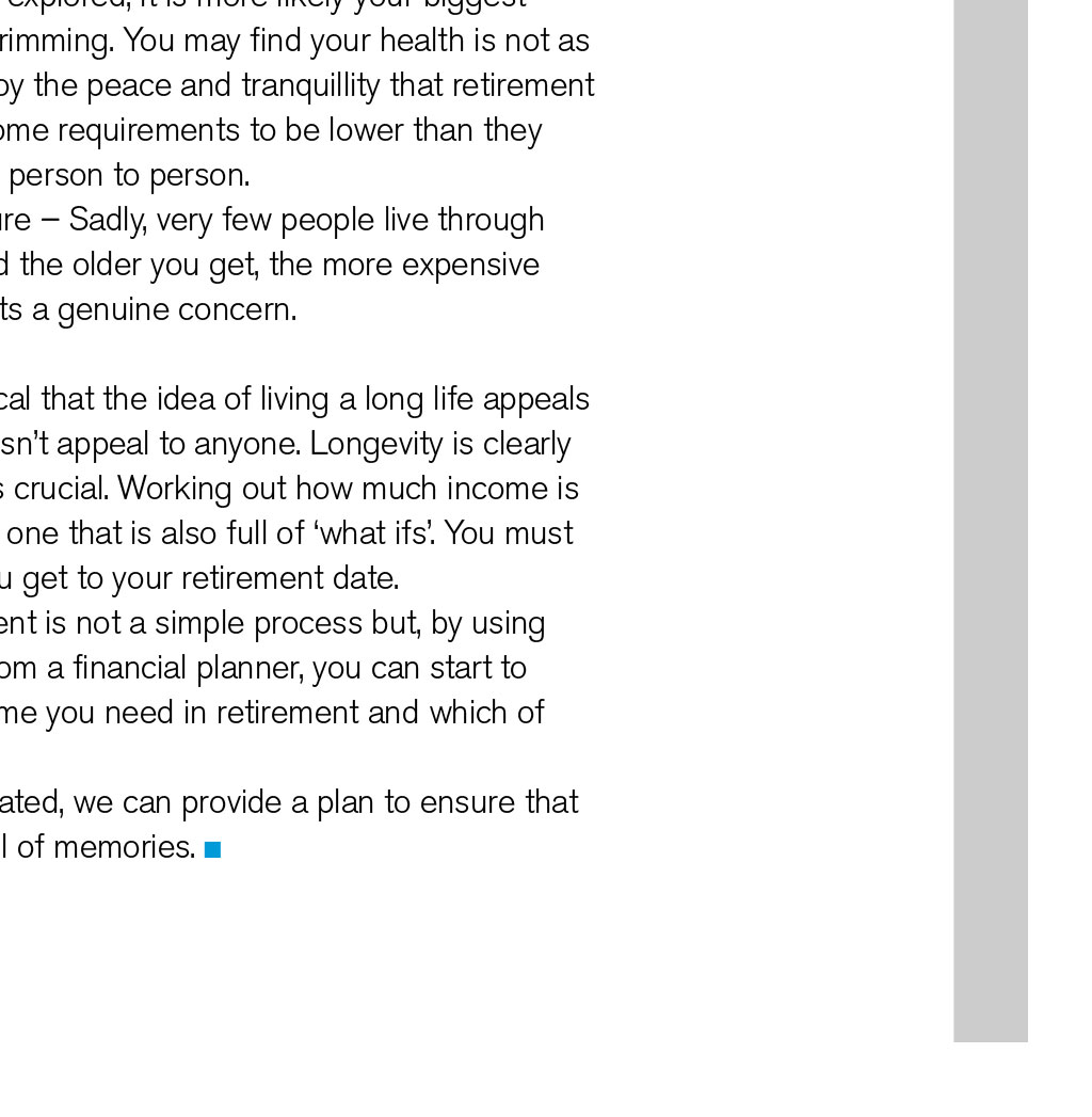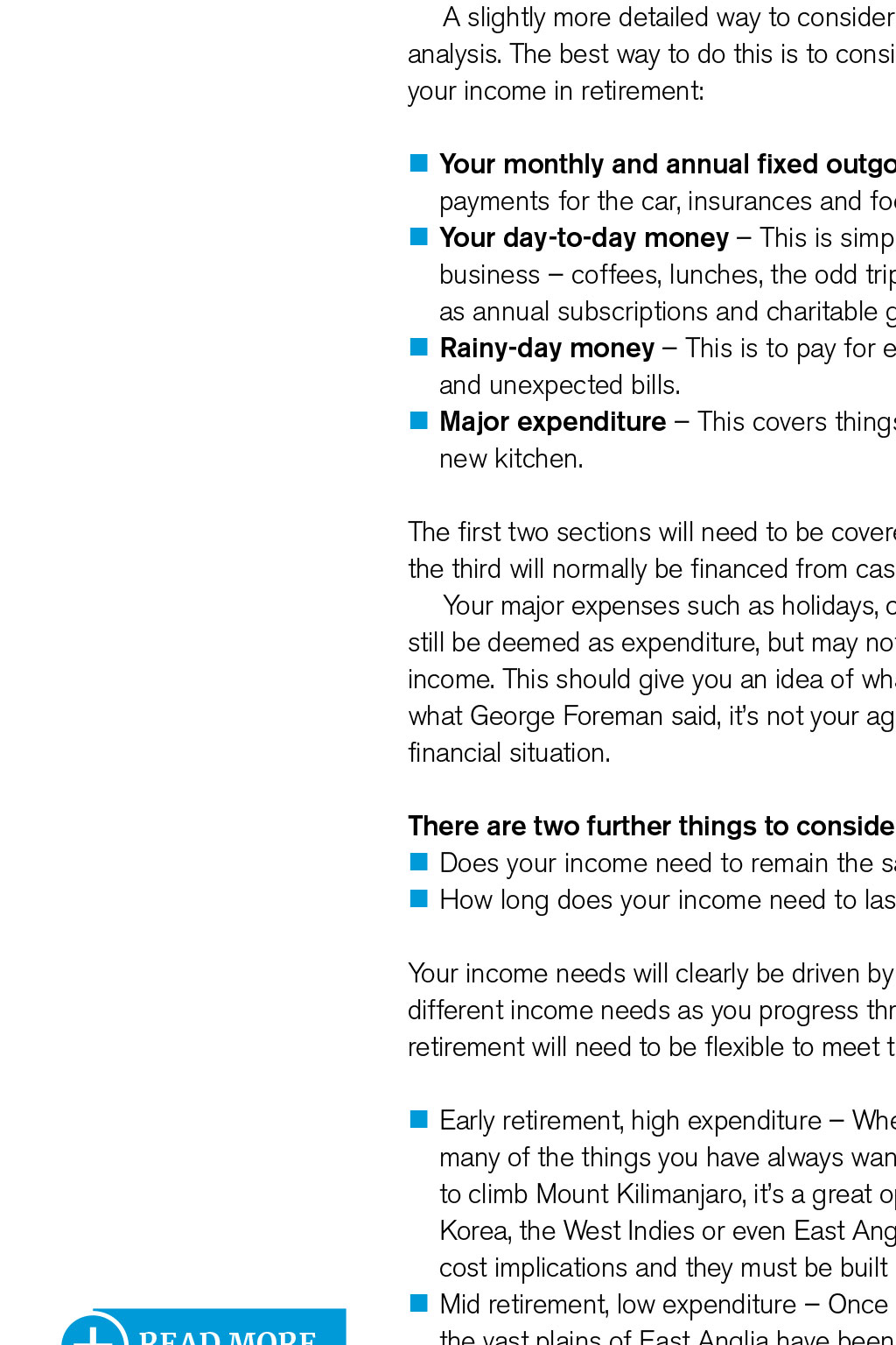 How long your income will last in retirement is key to your financial planning By Darren Williams, Managing Director of BALPA Financial Solutions ome of the most common questions we get from BALPA members are around pension benefits. Often, members will have received a pension statement and want to ask what it all means. Thisis not unreasonable, as the financial services industry is renowned for jargon and confusion. However, we have noticed that questions are often related to the retirement date on the statement. In many instances, people set themselves a date when they expect to retire. Yet, as was once stated by the heavyweight boxer, George Foreman: The question isnt at what age I want to retire, its at what income. Retirement planning should be more than simply looking at how much your pension will provide and then hoping for the best. It should be about considering what it is you want from retirement, how much income is required to achieve that, andwhere that income will come from. So before you consider how much pension income you will get at your planned retirement age, why not ask yourself a more important question what are my retirement plans? This is hugely important. Organising your finances in readiness for retirement is hard enough, but to make this worthwhile you need to spend some time considering exactly what you plan to do in retirement. Dont think this only applies to people nearing the end of their careers. The earlier you start planning, the better your retirement will be. Whats the first thing that springs to mind when you think about your retirement the chance to spend more time with the grandchildren, finally starting that book, or throwing yourself into your hobby? Whatever it may be, the first thing you need to do is plan. Your retirement could be the biggest and longest holiday you ever had and, just like most holidays, the more effort you put into organising it, the better the trip becomes. Whatever your plans, you still cant get away from the fact that probably the most important aspect is money. This is a classic chicken and egg situation. Do you plan your retirement and then work out how much income you need, or do you see how much income you have and then plan your retirement? Lets look at a way to calculate your retirement income. Your income in retirement It is broadly recognised that people require about 60% of their working income in retirement. While fixed costs such as utilities and council tax remain the same, obvious savings inretirement include commuting and other work-based costs including no longer paying into pension plans. A slightly more detailed way to consider retirement income is to do a budget analysis. The best way to do this is to consider four key elements you will need from your income in retirement: nYour monthly and annual fixed outgoings These will be your utilities, payments for the car, insurances and food. nYour day-to-day money This is simply what you need to go about your daily business coffees, lunches, the odd trip out. You may also incorporate items such as annual subscriptions and charitable giving. nRainy-day money This is to pay for emergencies, such ascar or house repairs and unexpected bills. nMajor expenditure This covers things such as holidays, car replacement, or a new kitchen. The first two sections will need to be covered by money in your current account and the third will normally be financed from cash in a savings account. Your major expenses such asholidays, car replacement and that sort of thing must still be deemed as expenditure, but may not necessarily be met out of your annual income. This should give you an idea of what sort of income is required. Remember what George Foreman said, its not your age that should drive retirement, but your financial situation. There are two further things to consider: nDoes your income need to remain the same in retirement? nHow long does your income need to last? Your income needs will clearly be driven by life expectancy and you will also have different income needs as you progress through retirement. So your income in retirement will need to be flexible to meet these requirements: nEarly retirement, high expenditure When you first retire, you may want to do READ MORE many of the things you have always wanted to do. This will feel like the perfect time to climb Mount Kilimanjaro, its a great opportunity to visit North Carolina, South Korea, the West Indies or even East Anglia. Whatever it may be, there are normally cost implications and they must be built into your expenditure plans. nMid retirement, low expenditure Once you have settled into retirement and the vast plains of East Anglia have been explored, it is more likely your biggest challenge will be the hedge that needs trimming. You may find your health is not as good as it was or you simply wish to enjoy the peace and tranquillity that retirement brings. Broadly, you can expect your income requirements to be lower than they were - but, of course, this will differ from person to person. nLate retirement, potential high expenditure Sadly, very few people live through retirement without any health issues, and the older you get, the more expensive this can become, with potential care costs a genuine concern. Finally, how long is long term? Its paradoxical that the idea of living a long life appeals to everyone, but the idea of getting old doesnt appeal to anyone. Longevity is clearly an important issue and one where advice is crucial. Working out how much income is enough is clearly a detailed calculation, but one that is also full of what ifs. You must consider all scenarios, preferably before you get to your retirement date. It is quite clear that planning for retirement is not a simple process but, by using sophisticated planning tools and support from a financial planner, you can start to think more carefully about the level of income you need in retirement and which of your assets will drive that income. Then, on