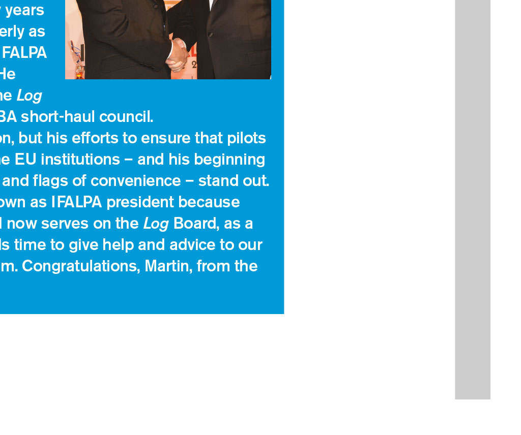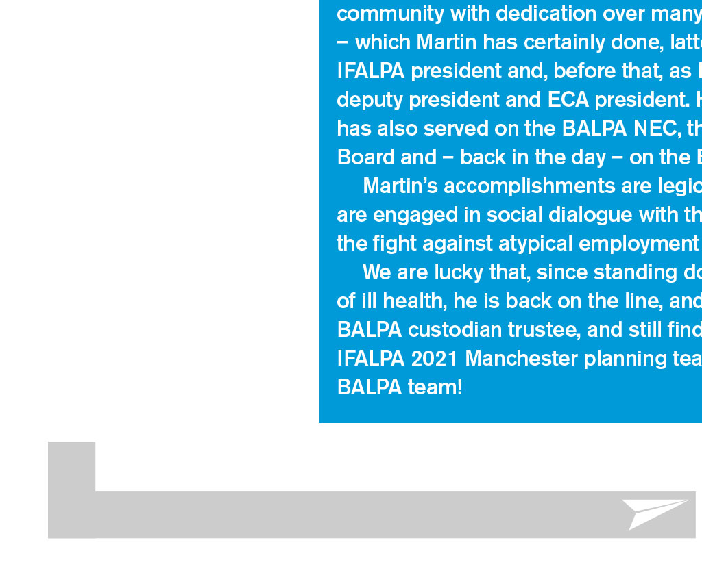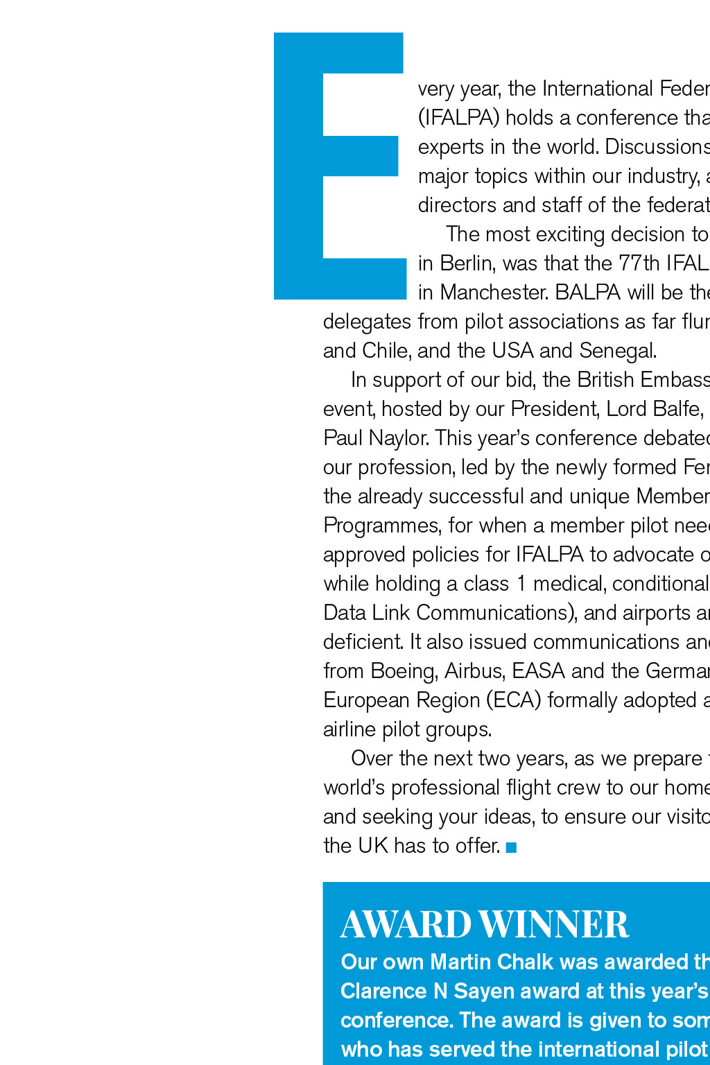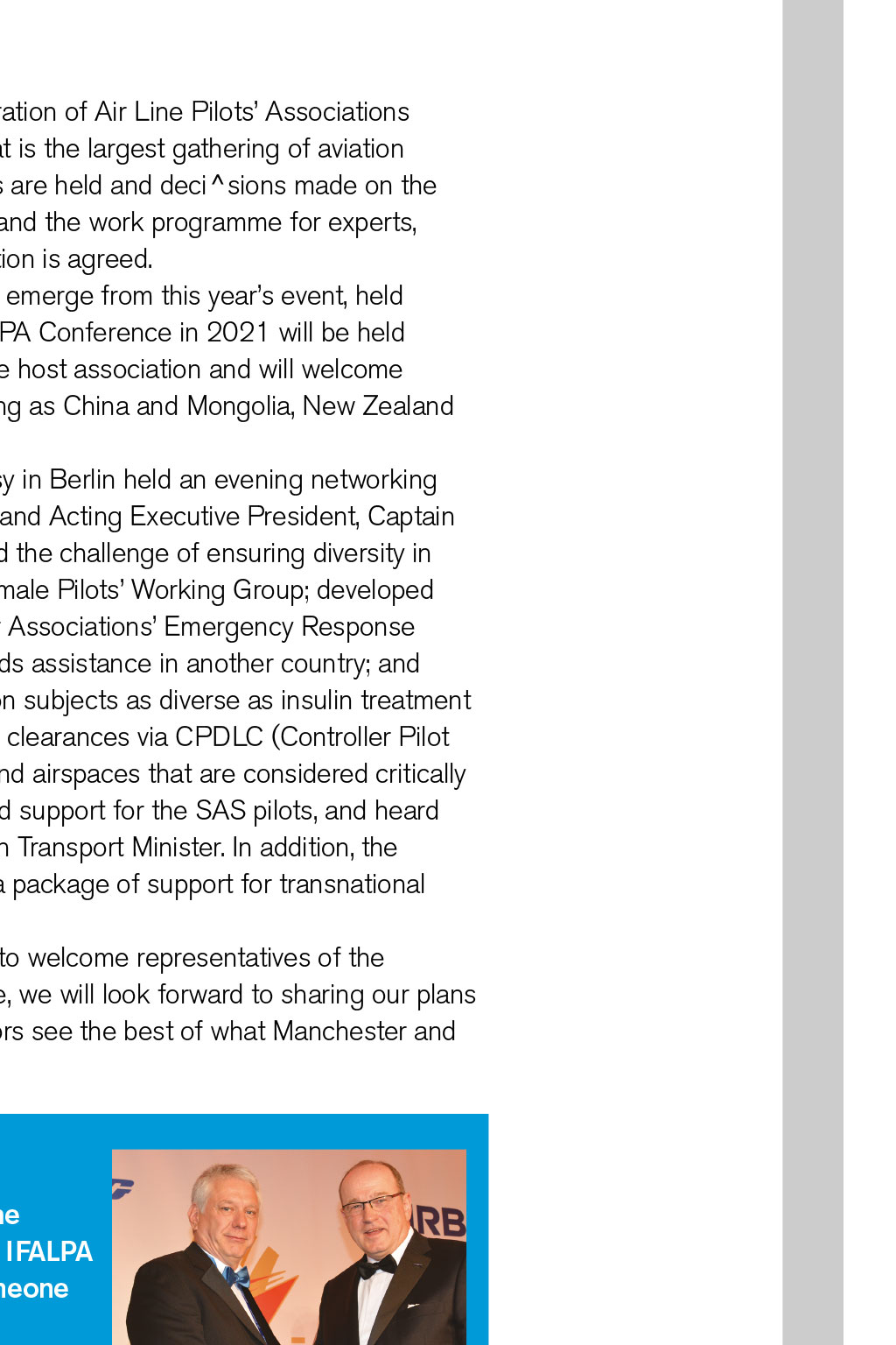 Manchester: IFALPA BID a world pilot destination Were delighted to announce that Manchester will be hosting the 2021 IFALPA Conference By Charlotte Branson, BALPA Media Officer 29 E very year, the International Federation of Air Line Pilots Associations (IFALPA) holds a conference that is the largest gathering of aviation experts in the world. Discussions are held and deci^sions made on the major topics within our industry, and the work programme for experts, directors and staff of the federation is agreed. The most exciting decision to emerge from this years event, held in Berlin, was that the 77th IFALPA Conference in 2021 will be held in Manchester. BALPA will be the host association and will welcome delegates from pilot associations as far flung as China and Mongolia, New Zealand and Chile, and the USA and Senegal. In support of our bid, the British Embassy in Berlin held an evening networking event, hosted by our President, Lord Balfe, and Acting Executive President, Captain Paul Naylor. This years conference debated the challenge of ensuring diversity in our profession, led by the newly formed Female Pilots Working Group; developed the already successful and unique Member Associations Emergency Response Programmes, for when a member pilot needs assistance in another country; and approved policies for IFALPA to advocate on subjects as diverse as insulin treatment while holding a class 1 medical, conditional clearances via CPDLC (Controller Pilot Data Link Communications), and airports and airspaces that are considered critically deficient. It also issued communications and support for the SAS pilots, and heard from Boeing, Airbus, EASA and the German Transport Minister. In addition, the European Region (ECA) formally adopted a package of support for transnational airline pilot groups. Over the next two years, as we prepare to welcome representatives of the worldsprofessional flight crew to our home, we will look forward to sharing our plans andseeking your ideas, to ensure our visitors see the best of what Manchester and the UK has to offer. AWARD WINNER Our own Martin Chalk was awarded the Clarence N Sayen award at this years IFALPA conference. The award is given to someone who has served the international pilot community withdedication over many years which Martin has certainly done, latterly as IFALPA president and, before that, as IFALPA deputy president and ECA president. He has also served on the BALPA NEC, the Log Board and back in the day on the BA short-haul council. Martins accomplishments are legion, but his efforts to ensure that pilots are engaged in social dialogue with the EU institutions and his beginning the fight against atypicalemployment and flags of convenience stand out. We are lucky that, since standing down as IFALPA president because of ill health, he is back on the line, and now serves on the Log Board, as a BALPA custodian trustee, and still finds time to give help and advice to our IFALPA 2021 Manchester planning team. Congratulations, Martin, from the BALPA team!