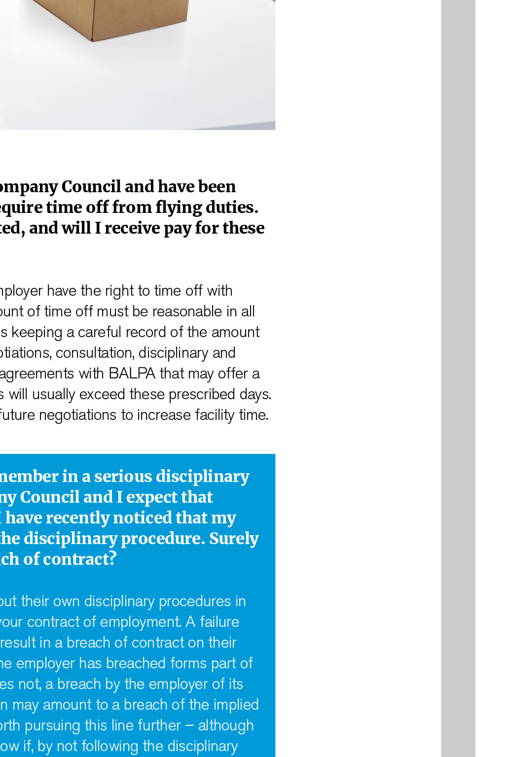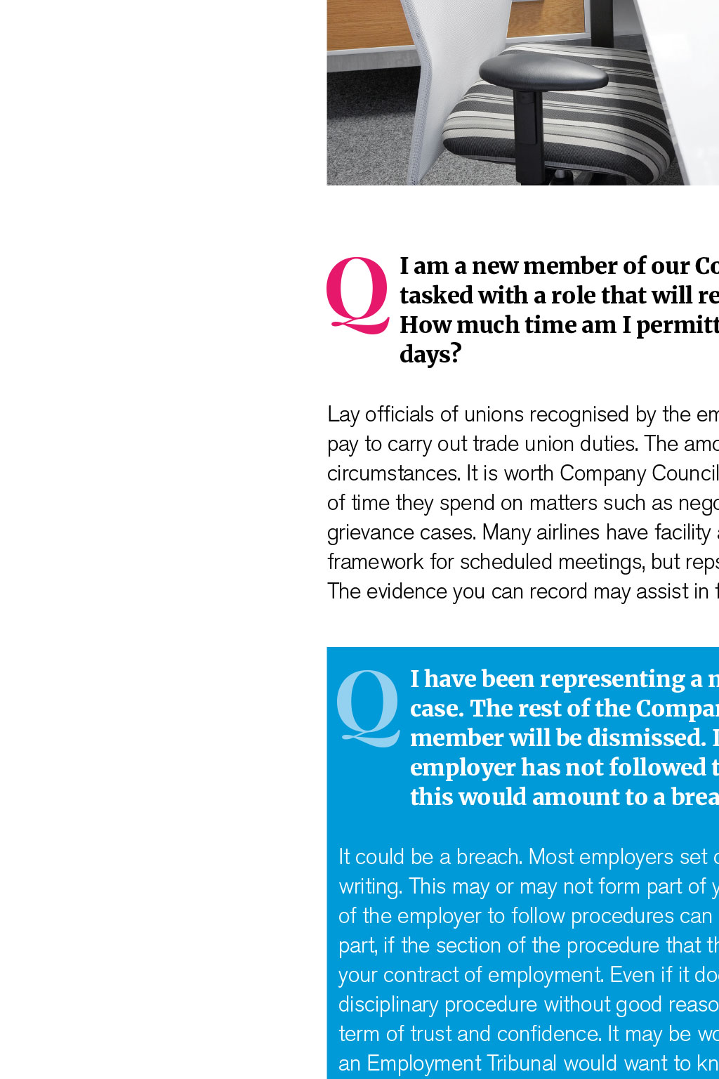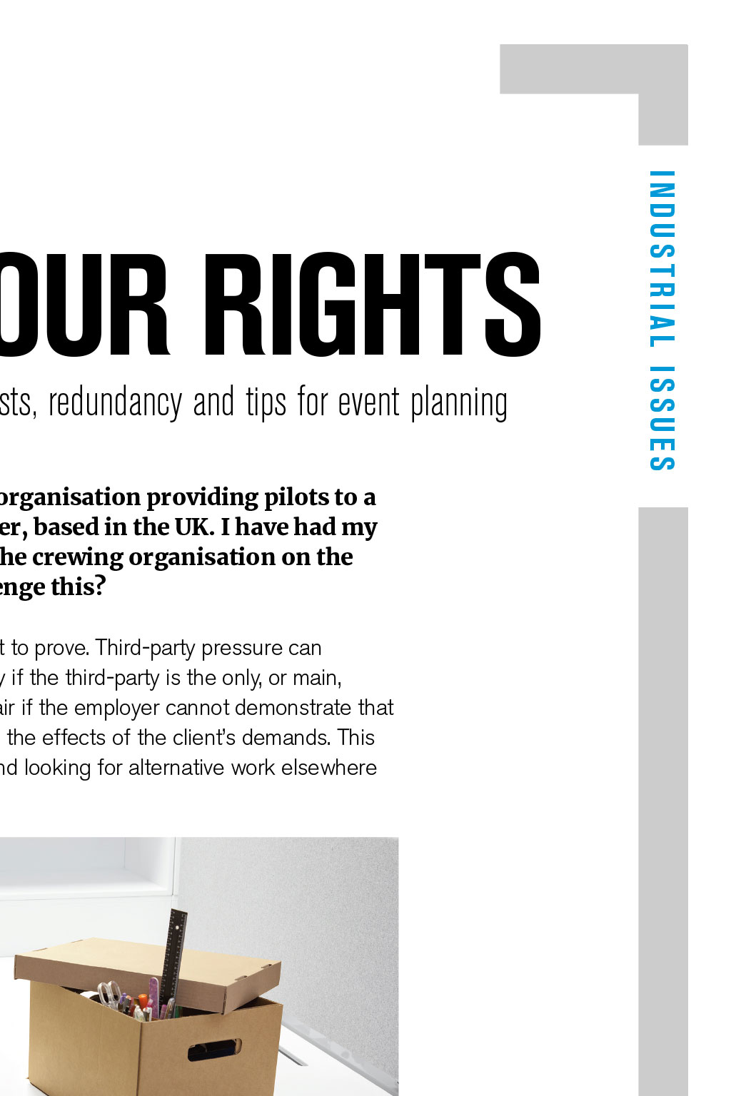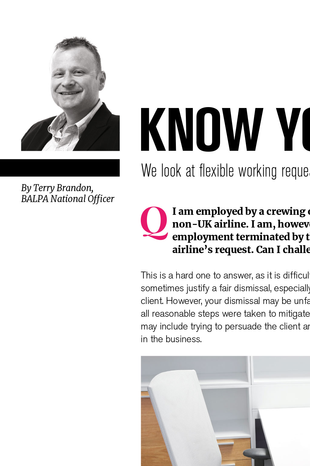 We look at flexible working requests, redundancy and tips for event planning By Terry Brandon, BALPA National Officer Q I am employed by a crewing organisation providing pilots to a non-UK airline. I am, however, based in the UK. I have had my employment terminated by the crewing organisation on the airlines request. Can I challengethis? This is a hard one to answer, as it is difficult to prove. Third-party pressure can sometimes justify a fair dismissal, especially if the third-party is the only, or main, client. However, your dismissal may be unfair if the employer cannot demonstrate that all reasonable steps were taken to mitigate the effects of the clients demands. This may include trying to persuade the client and looking for alternative work elsewhere in the business. Q I am a new member of our Company Council and have been tasked with a role that will require time off from flying duties. How much time am I permitted, and will Ireceive pay for these days? Lay officials of unions recognised by the employer have the right to time off with pay to carry out trade union duties. The amount of time off must be reasonable in all circumstances. It is worth Company Councils keeping a careful record of the amount of time they spend on matters such as negotiations, consultation, disciplinary and grievance cases. Many airlines have facility agreements with BALPA that may offer a framework for scheduled meetings, but reps will usually exceed these prescribed days. The evidence you can record may assist in future negotiations to increase facility time. Q I have been representing a member in a serious disciplinary case. The rest of the Company Council and I expect that member will be dismissed. I have recently noticed that my employer has not followed the disciplinary procedure. Surely this would amount to a breach of contract? It could be a breach. Most employers set out their own disciplinary procedures in writing. This may or may not form part of your contract of employment. A failure of the employer to follow procedures can result in a breach of contract on their part, if the section of the procedure that the employer has breached forms part of your contract of employment. Even if it does not, a breach by the employer of its disciplinary procedure without good reason may amount to a breach of the implied term of trust and confidence. It may be worth pursuing this line further although an Employment Tribunal would want to know if, by not following the disciplinary procedure, it would have materially changed the outcome of the dismissal. If you have a question youd like to put to Terry or any of our other BALPA experts, email TheLog@balpa.org INDUSTRIAL ISSUES KNOW YOUR RIGHTS