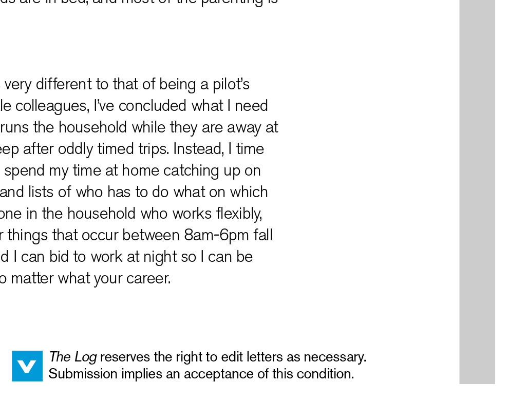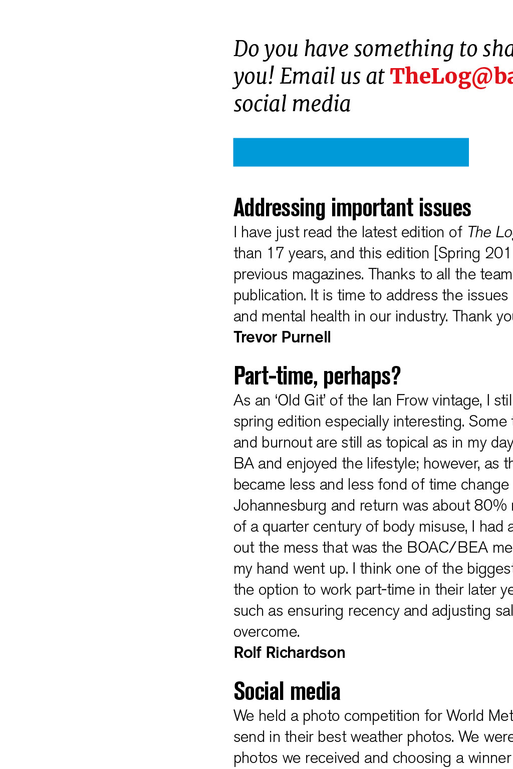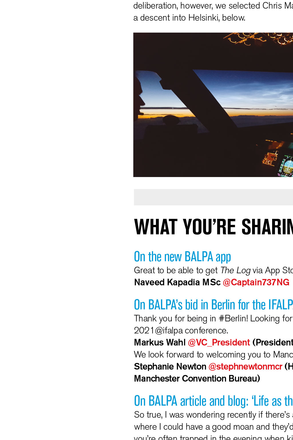 LETTERS Over to you Do you have something to share? Wed love to hear from you! Email us at TheLog@balpa.org or contact us on social media Addressing important issues I have just read the latest edition of The Log. I have been a BALPA member for more than 17 years, and this edition [Spring 2019] stands head and shoulders above all previous magazines. Thanks to all the team who have contributed to this very valuable publication. It is time to address the issues around work-life balance, stress, burnout and mental health in our industry. Thank you for stimulating the conversation. Trevor Purnell Part-time, perhaps? As an Old Git of the Ian Frow vintage, I still subscribe to TheLog and found your spring edition especially interesting. Some things never change. Lifestyle, fatigue and burnout are still as topical as in my day. I did 25 years, all long-haul, with BOAC/ BA and enjoyed the lifestyle; however, as the years went by, I found that my body became less and less fond of time change and all those night sectors. London Johannesburg and return was about 80% night. Nearing 50, and feeling the effects of a quarter century of body misuse, I had a stroke of luck: Lord King came in to sort out the mess that was the BOAC/BEA merger; he asked for early retirements, and my hand went up. I think one of the biggest lifestyle improvements for pilots would be the option to work part-time in their later years. There would, of course, be problems, such as ensuring recency and adjusting salary for less work, but these could surely be overcome. Rolf Richardson Social media We held a photo competition for World Meteorological Day and asked members to send in their best weather photos. Wewere stunned by the wealth of marvellous photos we received and choosing a winner was extremely difficult. After much deliberation, however, we selected Chris Mabbott as the winner, for this photo of a descent into Helsinki, below. WHAT YOURE SHARING On the new BALPA app Great to be able to get The Log via App Store. Naveed Kapadia MSc @Captain737NG On BALPAs bid in Berlin for the IFALPA 2021 conference Thank you for being in #Berlin! Looking forward to being in #Manchester for the 2021@ifalpa conference. Markus Wahl @VC_President (President of Vereinigung Cockpit) We look forward to welcoming you to Manchester. Stephanie Newton @stephnewtonmcr (Head of Business Tourism and Manchester Convention Bureau) On BALPA article and blog: Life as the partner of a pilot So true, I was wondering recently if theres a FB page for fellow partners of pilots where I could have a good moan and theyd understand. It can limit your own career, youre often trapped in the evening when kids are in bed, and most of the parenting is left up to you. Elaine Starkey I suspect the reality of being a pilots wife is very different to that of being a pilots husband. Having spoken to many of my male colleagues, Ive concluded what I need is a pilots wife who does the childcare and runs the household while they are away at work, who would tiptoe round me while I sleep after oddly timed trips. Instead, I time my sleep catch up round my familys needs, spend my time at home catching up on laundry and planning childcare, writing lists and lists of who has to do what on which day while away, getting food in, etc. As the one in the household who works flexibly, sports days and parents evenings and other things that occur between 8am-6pm fall to me, as my husband works in an office and I can bid to work at night so I can be around in the day. Wife work is wife work, no matter what your career. Kirsty Adams The Log reserves the right to edit letters as necessary. Submission implies an acceptance of this condition.