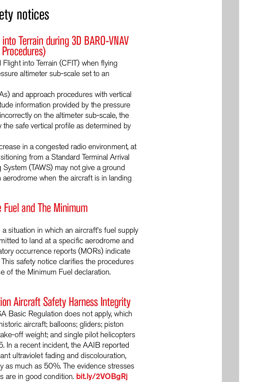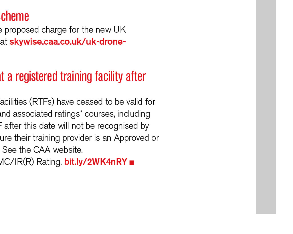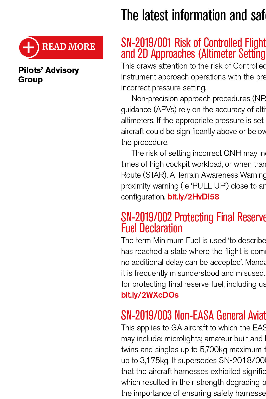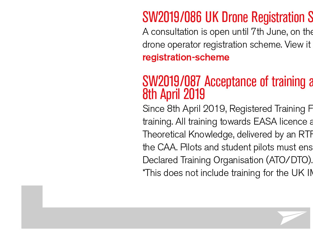 Pilots Advisory Group Heather Bennett, Surrey 07939 202294 Hayley Brewis, Suffolk 01284 386004 Amanda Calnan, Staffs 07812 151512 Russ Jones, Scotland 01337 858026 or 07713 621507 David Marshall, Leics 01164 299213 Sean Walters, Surrey 07850 077055 PilotsAdvisoryGroup @balpa.org LOG NOTICES The latest information and safety notices READ MORE Pilots Advisory Group SN-2019/001 Risk of Controlled Flight into Terrain during 3D BARO-VNAV and 2D Approaches (Altimeter Setting Procedures) This draws attention to the risk of Controlled Flight into Terrain (CFIT) when flying instrument approach operations with the pressure altimeter sub-scale set to an incorrect pressure setting. Non-precision approach procedures (NPAs) and approach procedures with vertical guidance (APVs) rely on the accuracy of altitude information provided by the pressure altimeters. If the appropriate pressure is set incorrectly on the altimeter sub-scale, the aircraft could be significantly above or below the safe vertical profile as determined by the procedure. The risk of setting incorrect QNH may increase in a congested radio environment, at times of high cockpit workload, or when transitioning from a Standard Terminal Arrival Route (STAR). A Terrain Awareness Warning System (TAWS) may not give a ground proximity warning (ie PULL UP) close to an aerodrome when the aircraft is in landing configuration. bit.ly/2HvDI58 SN-2019/002 Protecting Final Reserve Fuel and The Minimum Fuel Declaration The term Minimum Fuel is used to describe a situation in which an aircrafts fuel supply has reached a state where the flight is committed to land at a specific aerodrome and no additional delay can be accepted. Mandatory occurrence reports (MORs) indicate it is frequently misunderstood and misused. This safety notice clarifies the procedures for protecting final reserve fuel, including use of the Minimum Fuel declaration. bit.ly/2WXcDOs SN-2019/003 Non-EASA General Aviation Aircraft Safety Harness Integrity This applies to GA aircraft to which the EASA Basic Regulation does not apply, which may include: microlights; amateur built and historic aircraft; balloons; gliders; piston twins and singles up to 5,700kg maximum take-off weight; and single pilot helicopters up to 3,175kg. It supersedes SN-2018/005. In a recent incident, the AAIB reported that the aircraft harnesses exhibited significant ultraviolet fading and discolouration, which resulted in their strength degrading by as much as 50%. The evidence stresses the importance of ensuring safety harnesses are in good condition. bit.ly/2VOBgRj SW2019/086 UK Drone Registration Scheme A consultation is open until 7th June, on the proposed charge for the new UK drone operator registration scheme. View it at skywise.caa.co.uk/uk-droneregistration-scheme SW2019/087 Acceptance of training at aregistered training facility after 8th April 2019 Since 8th April 2019, Registered Training Facilities (RTFs) have ceased to be valid for training. All training towards EASA licence and associated ratings* courses, including Theoretical Knowledge, delivered by an RTF after this date will not be recognised by the CAA. Pilots and student pilots must ensure their training provider is an Approved or Declared Training Organisation (ATO/DTO). See the CAA website. *This does not include training for the UK IMC/IR(R) Rating. bit.ly/2WK4nRY TECH LOG READ MORE