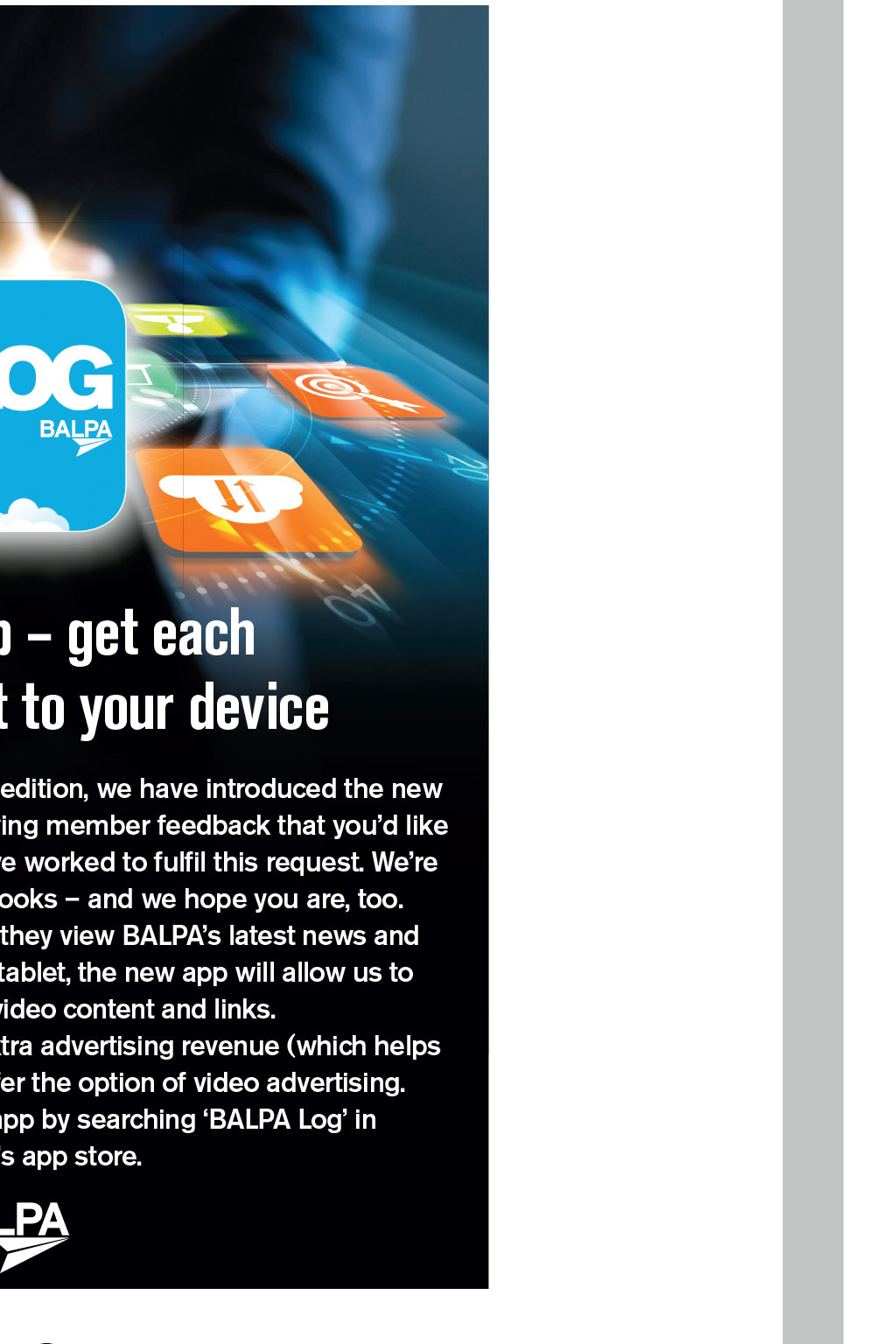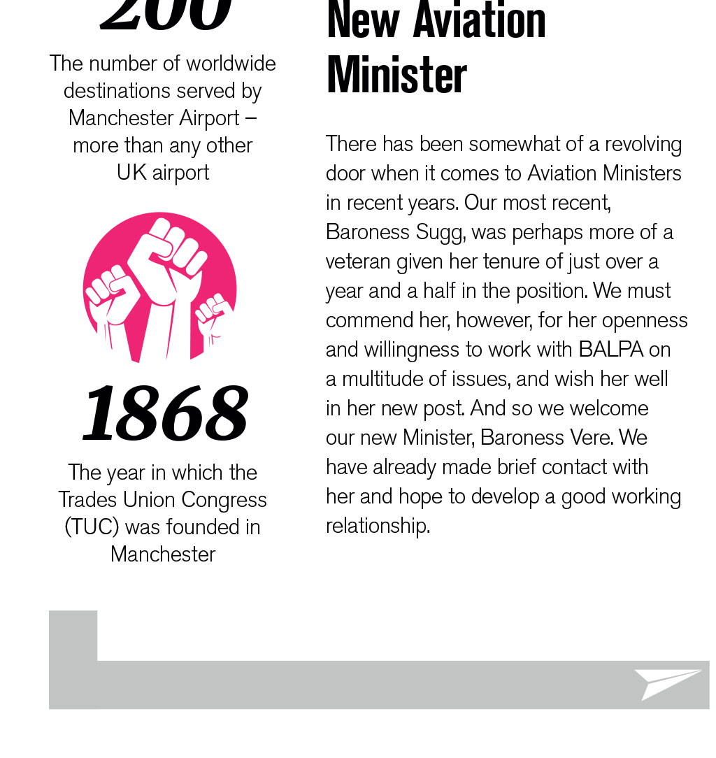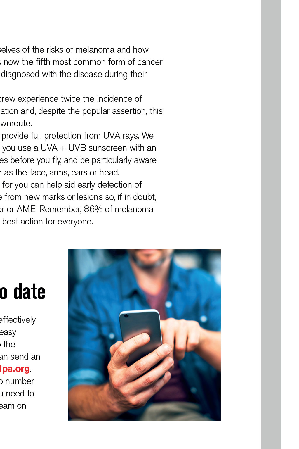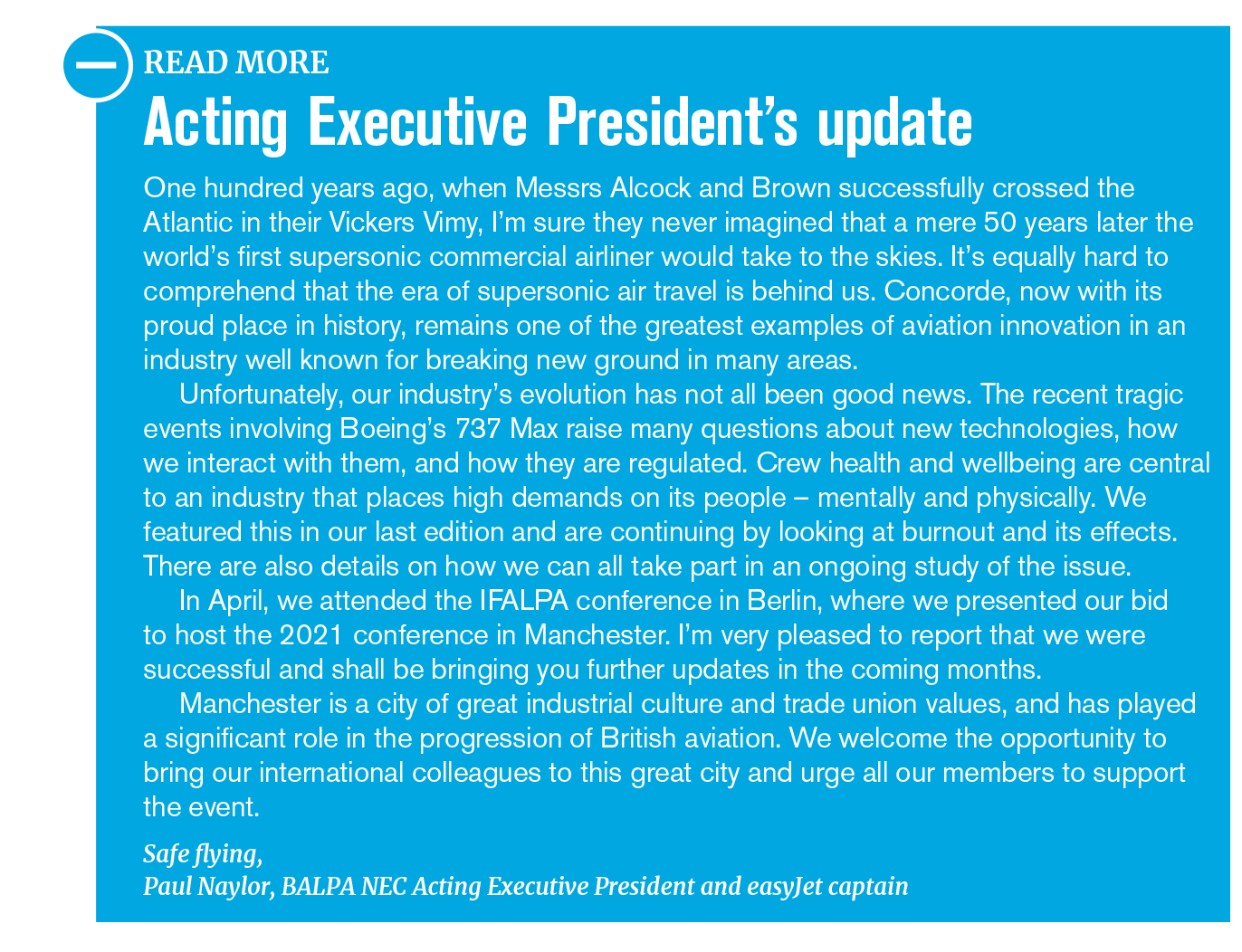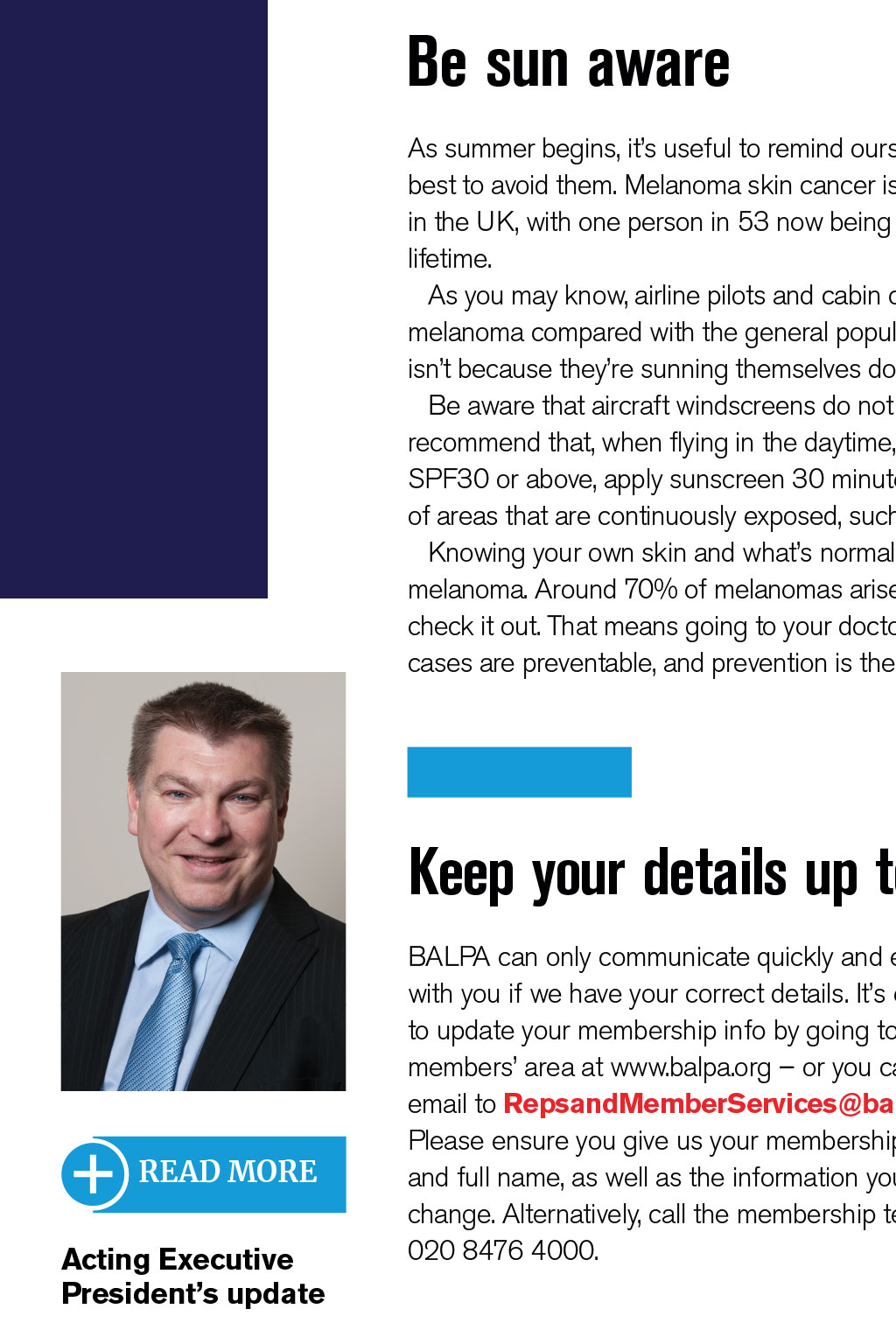 NEWS Upfront The latest in aviation and industrial news from around the world Be sun aware As summer begins, its useful to remind ourselves of the risks of melanoma and how best to avoid them. Melanoma skin cancer is now the fifth most common form of cancer in the UK, with one person in 53 now being diagnosed with the disease during their lifetime. As you may know, airline pilots and cabin crew experience twice the incidence of melanoma compared with the general population and, despite the popular assertion, this isnt because theyre sunning themselves downroute. Be aware that aircraft windscreens do not provide full protection from UVA rays. We recommend that, when flying in the daytime, you use a UVA + UVB sunscreen with an SPF30 or above, apply sunscreen 30 minutes before you fly, and be particularly aware of areas that are continuously exposed, such as the face, arms, ears or head. Knowing your own skin and whats normal for you can help aid early detection of melanoma. Around 70% of melanomas arise from new marks or lesions so, if in doubt, check it out. That means going to your doctor or AME. Remember, 86% of melanoma cases are preventable, and prevention is the best action for everyone. Keep your details up to date READ MORE Acting Executive Presidents update Industry snapshots 1 2 0 2 2021 The year Manchester will host the IFALPA conference 200 The number of worldwide destinations served by Manchester Airport more than any other UK airport 1868 The year in which the Trades Union Congress (TUC) was founded in Manchester BALPA can only communicate quickly and effectively with you if we have your correct details. Its easy to update your membership info by going to the members area at www.balpa.org or you can send an email to RepsandMemberServices@balpa.org. Please ensure you give us your membership number and full name, as well as the information you need to change. Alternatively, call the membership team on 020 8476 4000. The Log app get each edition straight to your device As you may have spotted in the last edition, we have introduced the new Log app to members. Acting on growing member feedback that youd like an electronic way to read The Log, we worked to fulfil this request. Were really pleased with how the app looks and we hope you are, too. Members can now choose how they view BALPAs latest news and features. Available for mobile and tablet, the new app will allow us to include more images, video content and links. Were also hoping it will lead to extra advertising revenue (which helps us keep costs down) if we can offer the option of video advertising. You can download The Log app by searching BALPA Log in your devices app store. New Aviation Minister Go greener go paperless There has been somewhat of a revolving door when it comes to Aviation Ministers in recent years. Our most recent, Baroness Sugg, was perhaps more of a veteran given her tenure of just over a year and a half in the position. We must commend her, however, for her openness and willingness to work with BALPA on a multitude of issues, and wish her well in her new post. And so we welcome our new Minister, Baroness Vere. We have already made brief contact with her and hope to develop a good working relationship. If youd like to do your bit for the planet, or simply dont want old magazines hanging around in your downstairs loo, you can unsubscribe from the paper version of The Log. Dont worry, you wont miss any of The Logs great content; with the app, you get a notification each time a new issue is released, and this can be downloaded and read anywhere even offline. We will also host all back editions from spring 2019, so if you ever want to pop back and read an article, you can. To unsubscribe from the paper version of the magazine, go to thelog.balpa.org READ MORE Acting Executive Presidents update One hundred years ago, when Messrs Alcock and Brown successfully crossed the Atlantic in their Vickers Vimy, Im sure they never imagined that a mere 50 years later the worlds first supersonic commercial airliner would take to the skies. Its equally hard to comprehend thatthe era of supersonic air travel is behind us. Concorde, now with its proud place in history, remains one of thegreatest examples of aviation innovation in an industry well known for breaking new ground in many areas. Unfortunately, our industrys evolution has not all been good news. The recent tragic events involving Boeings 737 Max raise many questions about new technologies, how we interact with them, and how they are regulated. Crew health and wellbeing are central to an industry that places high demands on its people mentally and physically. We featured this in our last edition and are continuing by looking at burnout and its effects. There are also details on how we can all take part in an ongoing study of the issue. In April, we attended the IFALPA conference in Berlin, where we presented our bid to host the 2021 conference in Manchester. Im very pleased to report that we were successful and shall be bringing you further updates in the coming months. Manchester is a city of great industrial culture and trade union values, and has played a significant role in the progression of British aviation. We welcome the opportunity to bring our international colleagues to this great city and urge all our members to support the event. Safe flying, Paul Naylor, BALPA NEC Acting Executive President and easyJet captain