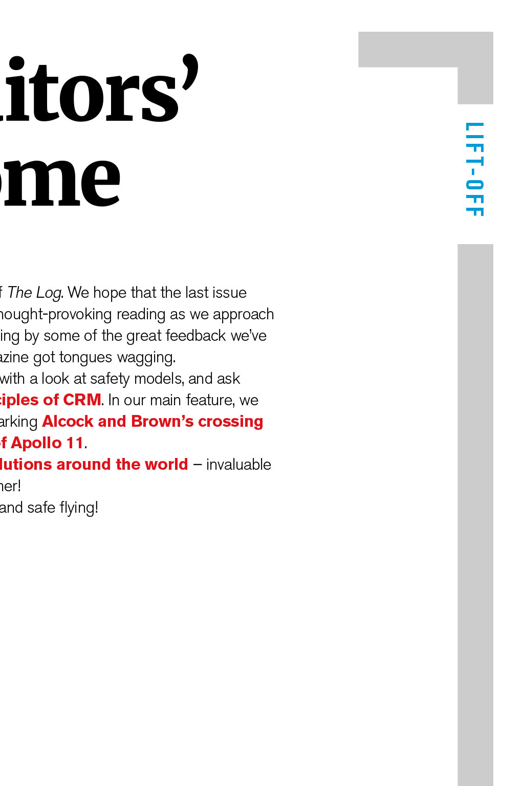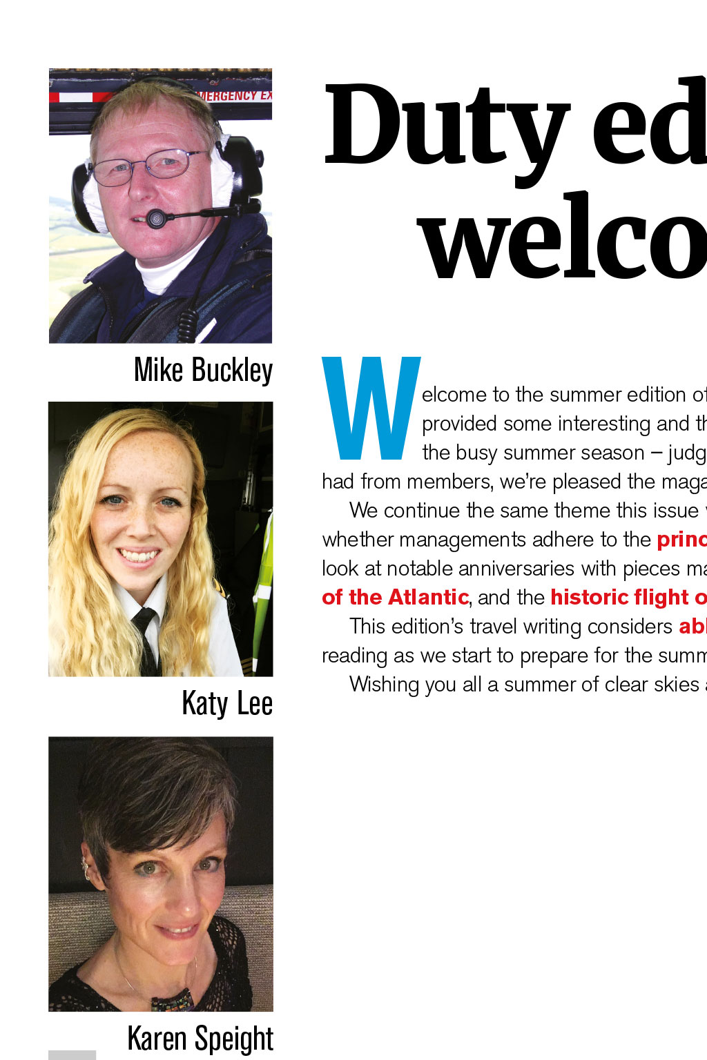 Mike Buckley Katy Lee Karen Speight W elcome to the summer edition of The Log. We hope that the last issue provided some interesting and thought-provoking reading as we approach the busy summer season judging by some of the great feedback weve had from members, were pleased the magazine got tongues wagging. We continue the same theme this issue with a look at safety models, and ask whether managements adhere to the principles of CRM. In our main feature, we look at notable anniversaries with pieces marking Alcock and Browns crossing of the Atlantic, and the historic flight of Apollo 11. This editions travel writing considers ablutions around the world invaluable reading as we start to prepare for the summer! Wishing you all a summer of clear skies and safe flying! L I F T- O F F Duty editors welcome