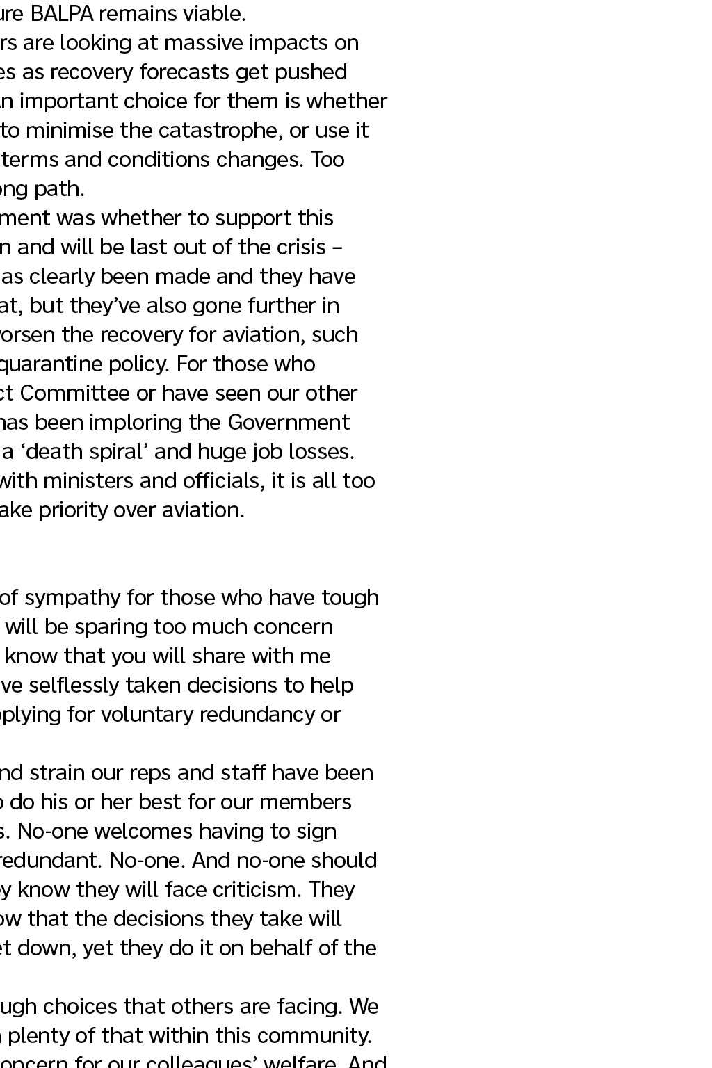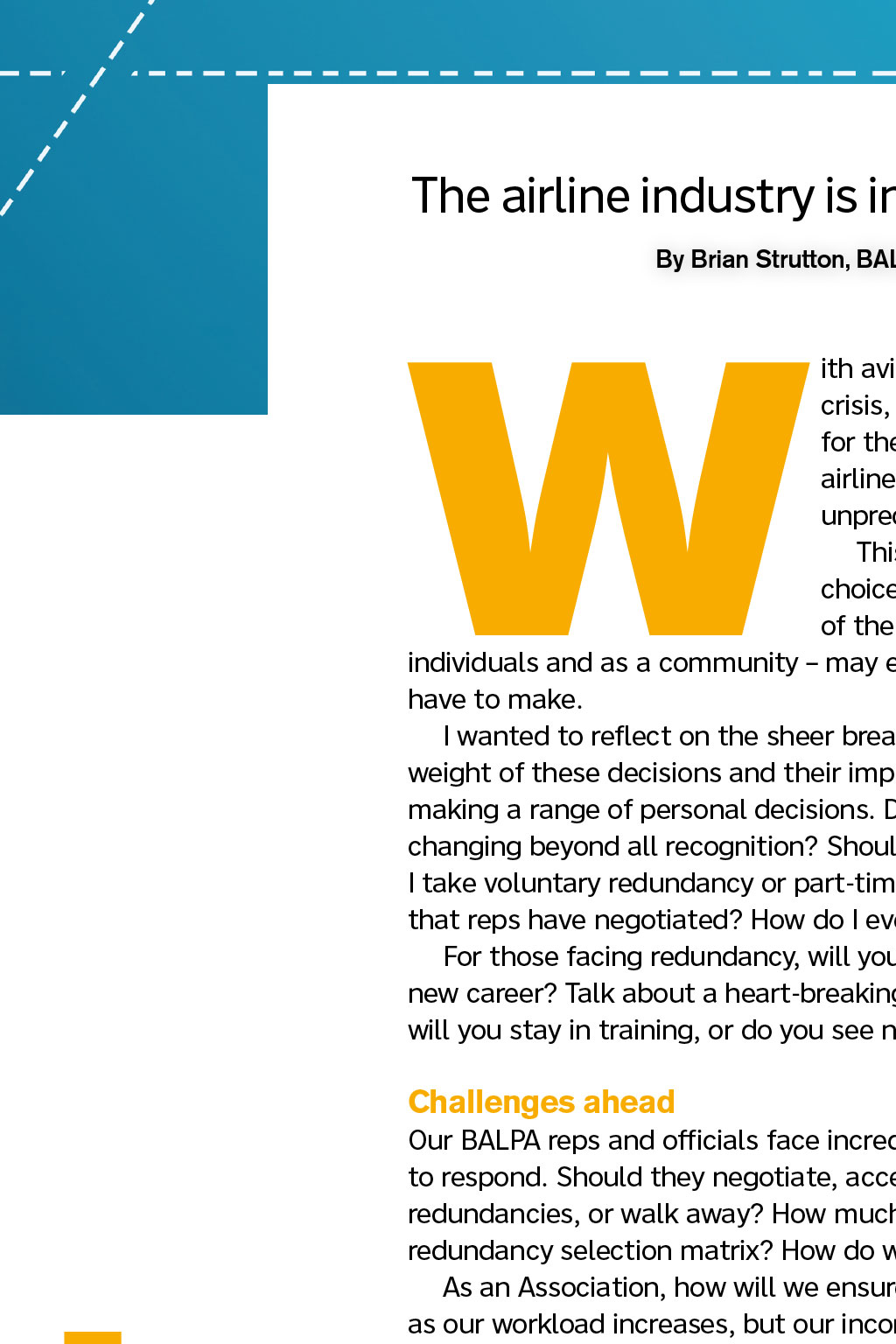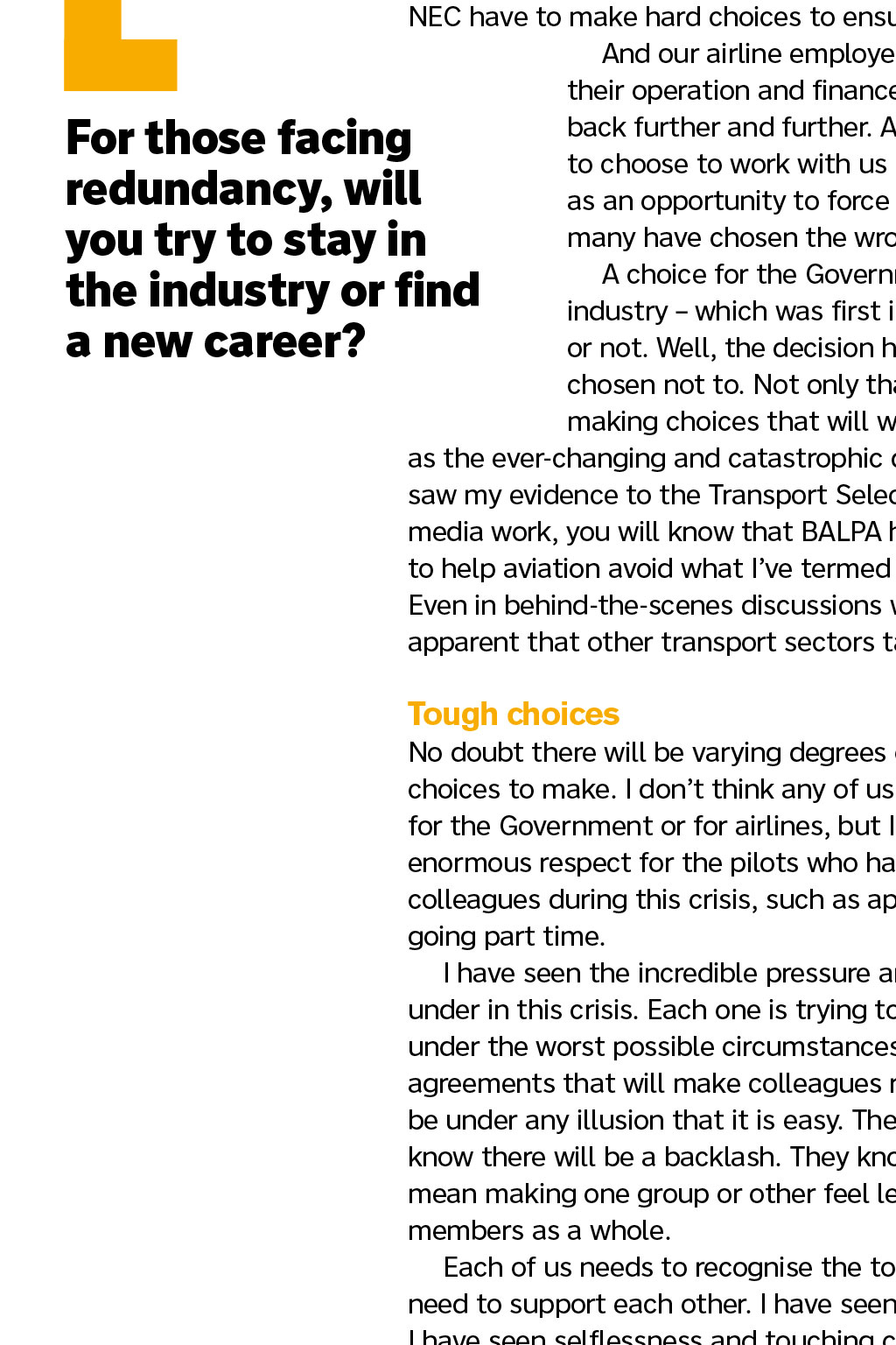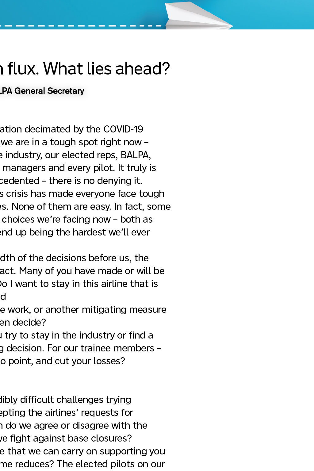 State of the nation The airline industry is in flux. What lies ahead? By Brian Strutton, BALPA General Secretary ith aviation decimated by the COVID-19 crisis, we are in a tough spot right now – for the industry, our elected reps, BALPA, airline managers and every pilot. It truly is unprecedented – there is no denying it. This crisis has made everyone face tough choices. None of them are easy. In fact, some of the choices we’re facing now – both as individuals and as a community – may end up being the hardest we’ll ever have to make. I wanted to reflect on the sheer breadth of the decisions before us, the weight of these decisions and their impact. Many of you have made or will be making a range of personal decisions. Do I want to stay in this airline that is changing beyond all recognition? Should I take voluntary redundancy or part-time work, or another mitigating measure that reps have negotiated? How do I even decide? For those facing redundancy, will you try to stay in the industry or find a new career? Talk about a heart-breaking decision. For our trainee members – will you stay in training, or do you see no point, and cut your losses? Challenges ahead Our BALPA reps and officials face incredibly difficult challenges trying to respond. Should they negotiate, accepting the airlines’ requests for redundancies, or walk away? How much do we agree or disagree with the redundancy selection matrix? How do we fight against base closures? As an Association, how will we ensure that we can carry on supporting you as our workload increases, but our income reduces? The elected pilots on our NEC have to make hard choices to ensure BALPA remains viable. For those facing redundancy, will you try to stay in the industry or find a new career? And our airline employers are looking at massive impacts on their operation and finances as recovery forecasts get pushed back further and further. An important choice for them is whether to choose to work with us to minimise the catastrophe, or use it as an opportunity to force terms and conditions changes. Too many have chosen the wrong path. A choice for the Government was whether to support this industry – which was first in and will be last out of the crisis – or not. Well, the decision has clearly been made and they have chosen not to. Not only that, but they’ve also gone further in making choices that will worsen the recovery for aviation, such as the ever-changing and catastrophic quarantine policy. For those who saw my evidence to the Transport Select Committee or have seen our other media work, you will know that BALPA has been imploring the Government to help aviation avoid what I’ve termed a ‘death spiral’ and huge job losses. Even in behind-the-scenes discussions with ministers and officials, it is all too apparent that other transport sectors take priority over aviation. Tough choices No doubt there will be varying degrees of sympathy for those who have tough choices to make. I don’t think any of us will be sparing too much concern for the Government or for airlines, but I know that you will share with me enormous respect for the pilots who have selflessly taken decisions to help colleagues during this crisis, such as applying for voluntary redundancy or going part time. I have seen the incredible pressure and strain our reps and staff have been under in this crisis. Each one is trying to do his or her best for our members under the worst possible circumstances. No-one welcomes having to sign agreements that will make colleagues redundant. No-one. And no-one should be under any illusion that it is easy. They know they will face criticism. They know there will be a backlash. They know that the decisions they take will mean making one group or other feel let down, yet they do it on behalf of the members as a whole. Each of us needs to recognise the tough choices that others are facing. We need to support each other. I have seen plenty of that within this community. I have seen selflessness and touching concern for our colleagues’ welfare. And we need to be ready to ask for help when the choice before us looks simply too hard to make. There is also plenty of anger around. That is completely understandable, but use it wisely, and direct it appropriately. And hope that the day will soon come when our choices become easier and our community happier. I am confident it will – I just don’t know when. If this feature resonates with you, or you have any concerns, email balpa@balpa.org or call us on 020 8476 4000 INDUSTRY State INDUSTRY State of the INDUSTRY State of the nation INDUSTRY