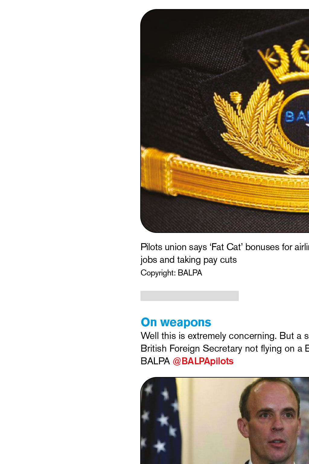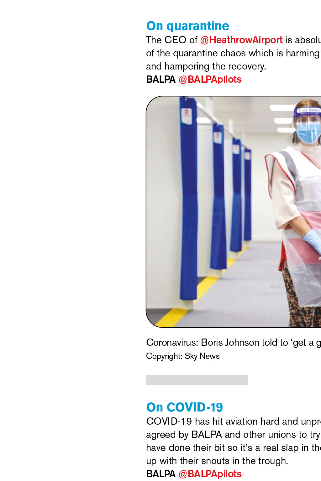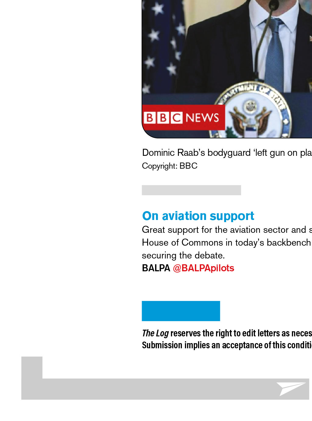 Over to you Do you have something to share? We’d love to hear from you! Email us at TheLog@balpa.org or contact us on social media WHAT YOU’RE SHARING On quarantine The CEO of @HeathrowAirport is absolutely right. The PM needs to get a grip of the quarantine chaos which is harming the aviation industry beyond measure and hampering the recovery. BALPA @BALPApilots Coronavirus: Boris Johnson told to ‘get a grip’ by Heathrow Airport Copyright: Sky News On COVID-19 COVID-19 has hit aviation hard and unprecedented measures have been agreed by BALPA and other unions to try and help companies survive. Staff have done their bit so it’s a real slap in the face to see the bosses queuing up with their snouts in the trough. BALPA @BALPApilots Pilots union says ‘Fat Cat’ bonuses for airline bosses are an insult to staff losing jobs and taking pay cuts Copyright: BALPA On weapons Well this is extremely concerning. But a side question is: why was the British Foreign Secretary not flying on a British airline? BALPA @BALPApilots Dominic Raab’s bodyguard ‘left gun on plane’ Copyright: BBC On aviation support Great support for the aviation sector and specifically for sector workers across the House of Commons in today’s backbench debate. Thanks to @HuwMerriman for securing the debate. BALPA @BALPApilots The Log reserves the right to edit letters as necessary. Submission implies an acceptance of this condition. TEA BREAK