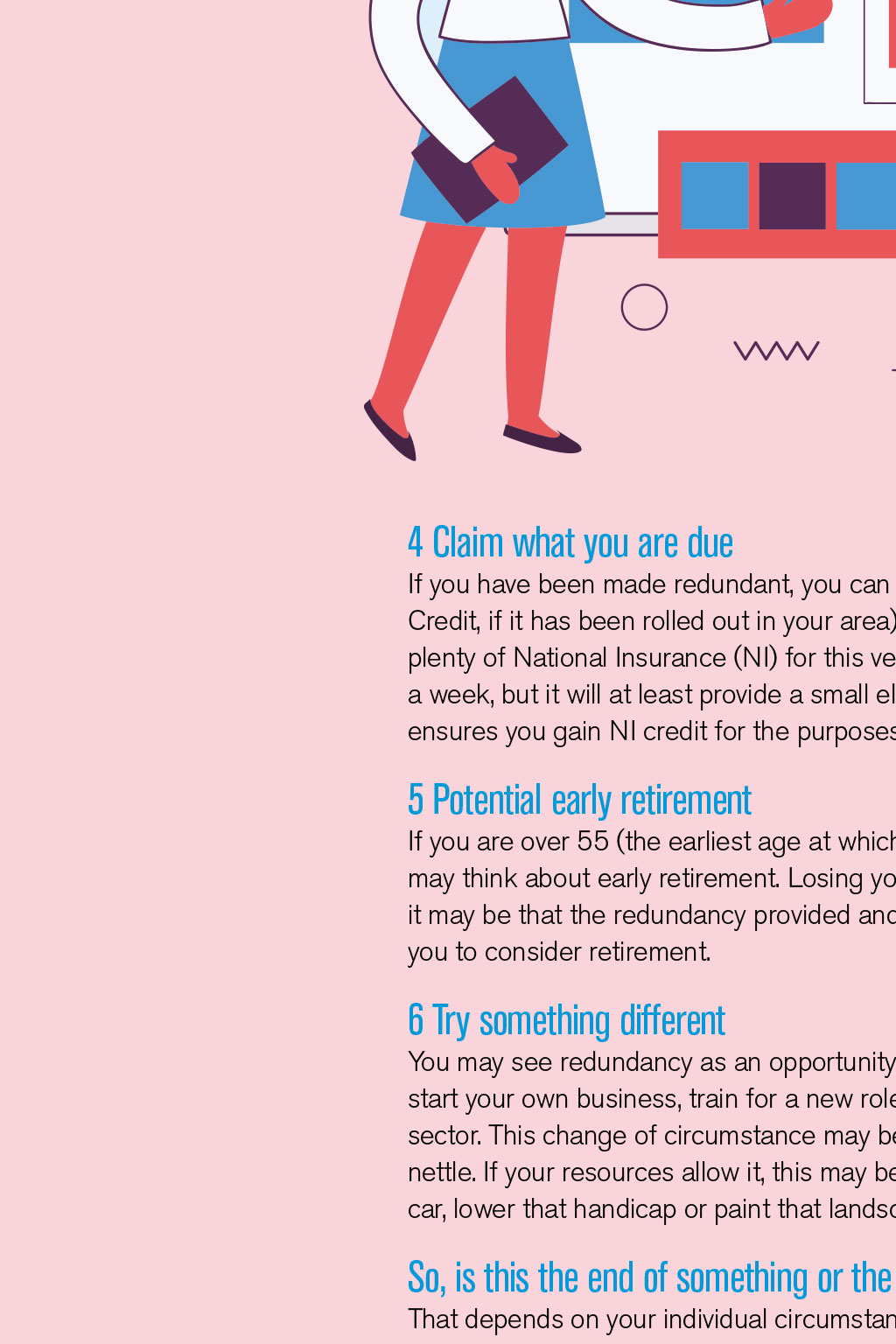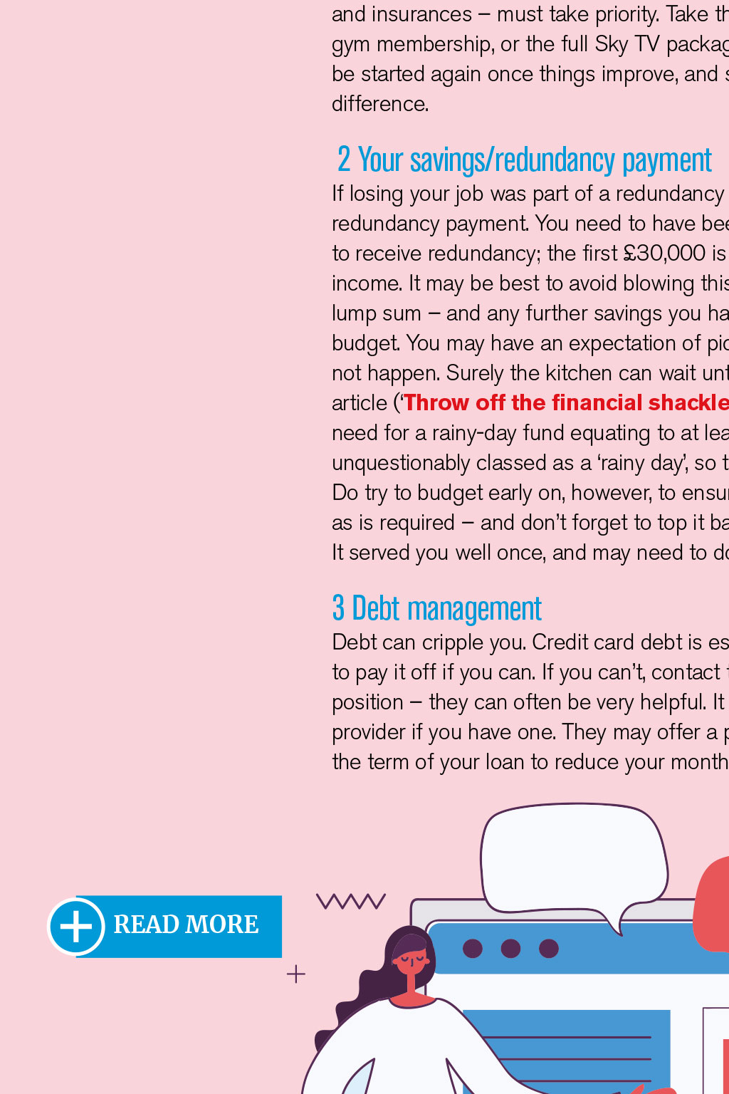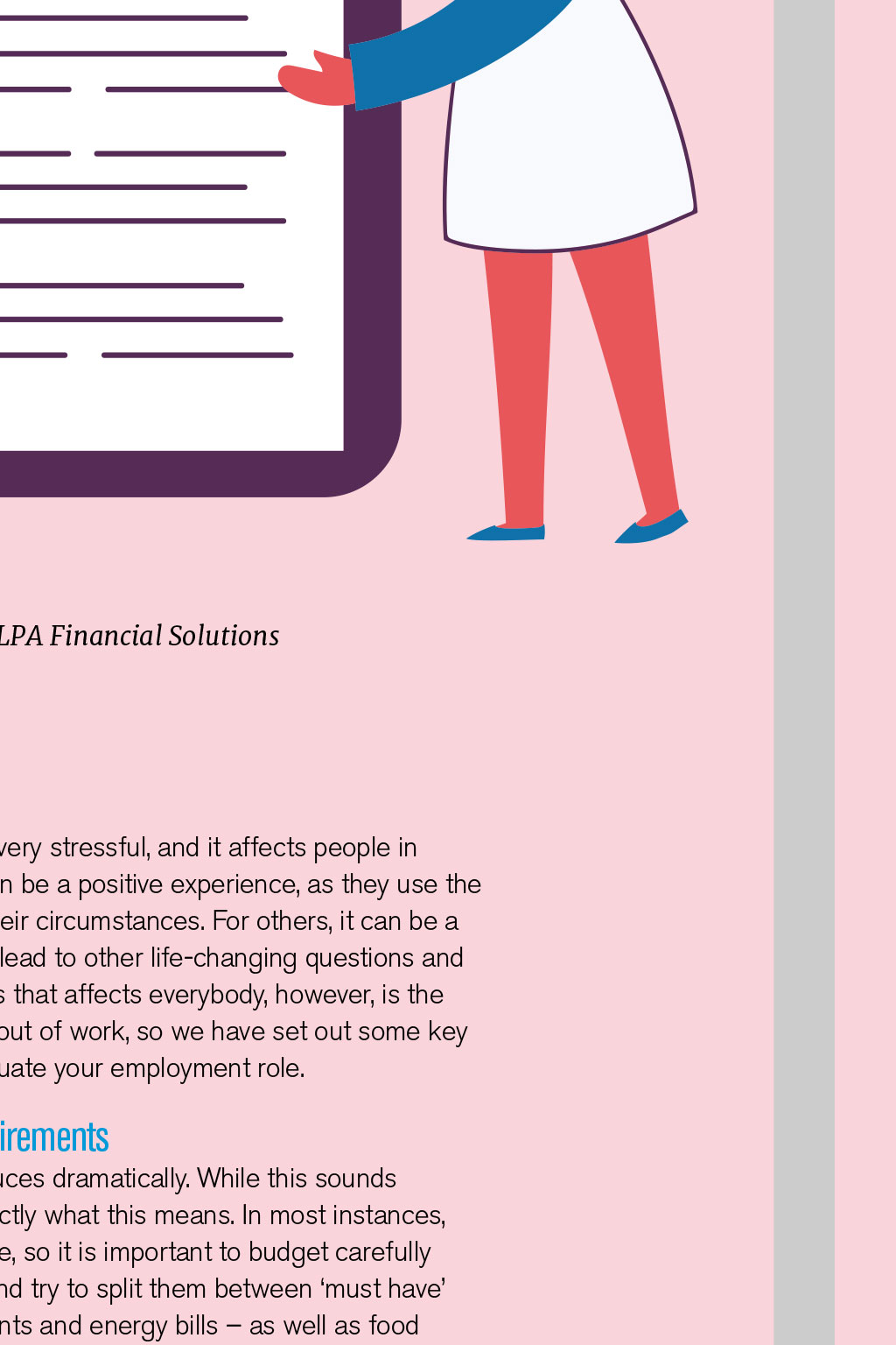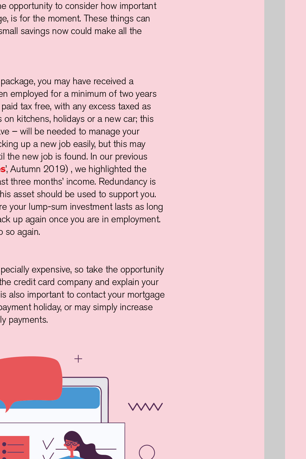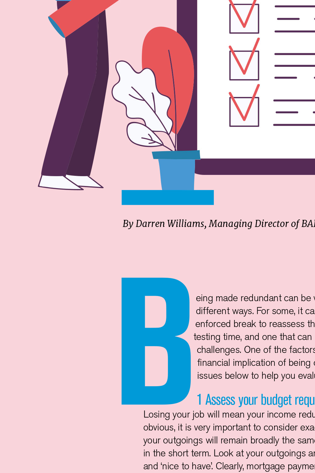 Redundancy: six things to consider Losing your job can be a blessing or a curse, depending on the state of your finances READ MORE By Darren Williams, Managing Director of BALPA Financial Solutions eing made redundant can be very stressful, and it affects people in different ways. For some, it can be a positive experience, as they use the enforced break to reassess their circumstances. For others, it can be a testing time, and one that can lead to other life-changing questions and challenges. One of the factors that affects everybody, however, is the financial implication of being out of work, so we have set out some key issues below to help you evaluate your employment role. 1 Assess your budget requirements Losing your job will mean your income reduces dramatically. While this sounds obvious, it is very important to consider exactly what this means. In most instances, your outgoings will remain broadly the same, so it is important to budget carefully in the short term. Look at your outgoings and try to split them between ‘must have’ and ‘nice to have’. Clearly, mortgage payments and energy bills – as well as food and insurances – must take priority. Take the opportunity to consider how important gym membership, or the full Sky TV package, is for the moment. These things can be started again once things improve, and small savings now could make all the difference. 2 Your savings/redundancy payment If losing your job was part of a redundancy package, you may have received a redundancy payment. You need to have been employed for a minimum of two years to receive redundancy; the first £30,000 is paid tax free, with any excess taxed as income. It may be best to avoid blowing this on kitchens, holidays or a new car; this lump sum – and any further savings you have – will be needed to manage your budget. You may have an expectation of picking up a new job easily, but this may not happen. Surely the kitchen can wait until the new job is found. In our previous article (‘Throw off the financial shackles’, Autumn 2019) , we highlighted the need for a rainy-day fund equating to at least three months’ income. Redundancy is unquestionably classed as a ‘rainy day’, so this asset should be used to support you. Do try to budget early on, however, to ensure your lump-sum investment lasts as long as is required – and don’t forget to top it back up again once you are in employment. It served you well once, and may need to do so again. 3 Debt management Debt can cripple you. Credit card debt is especially expensive, so take the opportunity to pay it off if you can. If you can’t, ontact the credit card company and explain your position – they can often be very helpful. It is also important to contact your mortgage provider if you have one. They may offer a payment holiday, or may simply increase the term of your loan to reduce your monthly payments. 4 Claim what you are due If you have been made redundant, you can claim Jobseeker’s Allowance (or Universal Credit, if it has been rolled out in your area). When all is said and done, you have paid plenty of National Insurance (NI) for this very reason. It only pays around £79 a week, but it will at least provide a small element of guaranteed income. It also ensures you gain NI credit for the purposes of state-pension provision. 5 Potential early retirement If you are over 55 (the earliest age at which you can draw a personal pension), you may think about early retirement. Losing your job may have been thrust upon you, but it may be that the redundancy provided and other assets you have are su fficient for you to consider retirement. 6 Try something different You may see redundancy as an opportunity to try something completely different: start your own business, train for a new role, or throw yourself into the voluntary sector. This change of circumstance may be the push you need to grasp the ‘training’ nettle. If your resources allow it, this may be the chance to write that book, build that car, lower that handicap or paint that landscape. So, is this the end of something or the start of something? That depends on your individual circumstances, but it is important to remain active, talk to your family – as it will affect them, too – listen to advice, and continue to plan. Clearly, your budget and savings will have a big say in your next move, and this could be a difficult time. But getting your finances (especially debt management) in order is a very wise thing to do, and will help you in the next stage of your life plan. FINANCE Redundancy: FINANCE Redundancy: six things to consider FINANCE Redundancy: six things to consider Losing your job can be a blessing or a curse, depending on the state of your finances FINANCE Redundancy: six things to consider Losing your job can be a blessing or a curse, depending on the state of your finances By Darren Williams, Managing Director of BALPA Financial Solutions FINANCE READ MORE If anything resonates with you in this article, or you would like to discuss your own financial planning, we would be pleased to hear from you. You can contact the BALPA Financial Solutions team on 020 8476 4100 or email bfs@balpa.org. For more information, visit www.balpa-bfs.co.uk