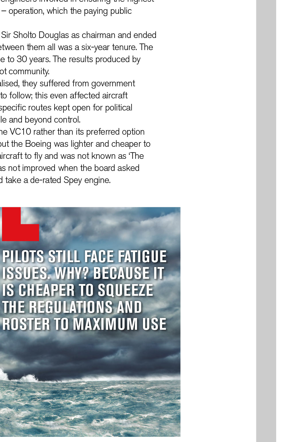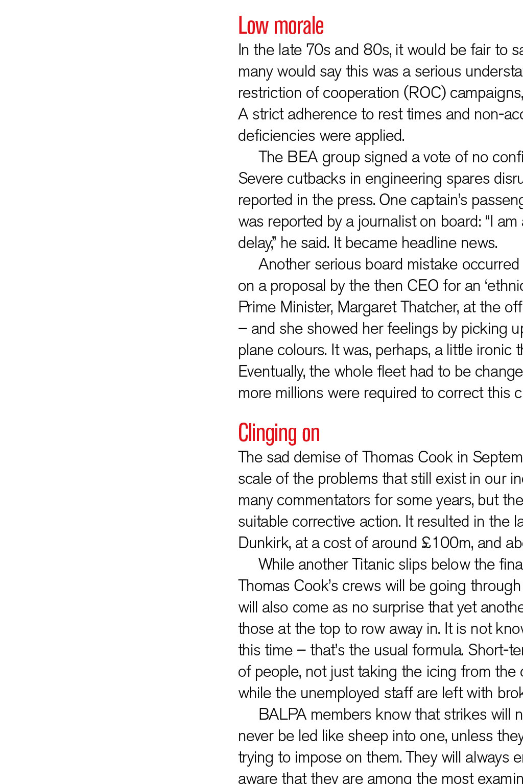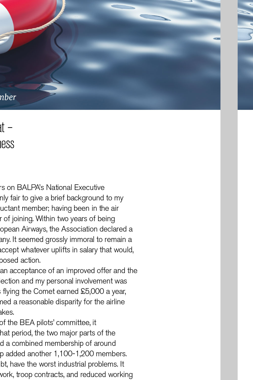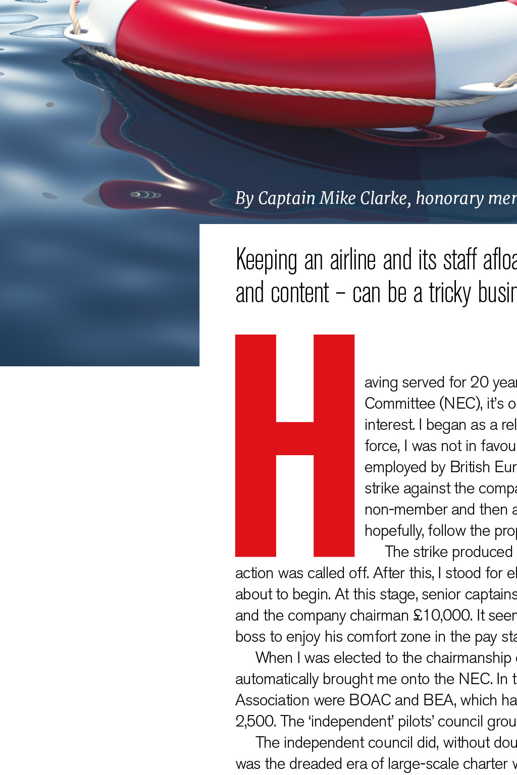 INDUSTRIAL RELATIONS FOR PILOTS: WILL IT NEVER CHANGE? By Captain Mike Clarke, honorary member Keeping an airline and its staff afloat – and content – can be a tricky business aving served for 20 years on BALPA’s National Executive Committee (NEC), it’s only fair to give a brief background to my interest. I began as a reluctant member; having been in the air force, I was not in favour of joining. Within two years of being employed by British European Airways, the Association declared a strike against the company. It seemed grossly immoral to remain a non-member and then accept whatever uplifts in salary that would, hopefully, follow the proposed action. The strike produced an acceptance of an improved offer and the action was called off. After this, I stood for election and my personal involvement was about to begin. At this stage, senior captains flying the Comet earned £5,000 a year, and the company chairman £10,000. It seemed a reasonable disparity for the airline boss to enjoy his comfort zone in the pay stakes. When I was elected to the chairmanship of the BEA pilots’ committee, it automatically brought me onto the NEC. In that period, the two major parts of the Association were BOAC and BEA, which had a combined membership of around 2,500. The ‘independent’ pilots’ council group added another 1,100-1,200 members. The independent council did, without doubt, have the worst industrial problems. It was the dreaded era of large-scale charter work, troop contracts, and reduced working benefits in comparison with the far more secure work of the two corporations, with their large, unopposed route structures. A major sadness for me throughout the 1960s and up to the 1980s was the regular financial failure, which usually peaked in the winter months. Companies that many readers will have difficulty recalling fell off the financial edge and disappeared forever, including Orion; Pegasus Skyways; Hunting Clan; Derby Airlines; Eagle; Court Line; Go, Laker; British Caledonian; Independent; and Blue Air. Some others – such as Monarch and Dan Air – disappeared later. For many of our colleagues, it often meant career termination. Jobs were very hard to find; in many cases – after serving several years in one company – they jumped into the first available lifeboat, only to suffer yet another collapse. The second problem was, of course, the pilots’ imposed discipline of seniority. This frequently pushed many very experienced pilots to the bottom of the list in their new job. It was also not unknown for pension funds to be underfunded or already used in attempts to sustain the company. Even so, one feature seemed constant: when the company went under, the pilots’ careers were frequently terminated – but one group did retire in luxury. As the various Titanics slipped below the waves, various company chairmen seemed to survive in a safe financial lifeboat. Keeping control The airline business is the most extraordinary animal. The respective boards of many airlines face the same problem: all they can control is staff costs. The aircraft they buy cost the same whatever the paint job; the insurances they have to retain, and the fuel they buy, are much the same; and charges for slots at airports – and the standing charges or landing fees – do not vary, either. The major cost that is in their control is staff. This seems to fall into two categories: what they wish to pay the company staff they employ, and how much they wish to allocate to their own rewards, including lucrative share options and bonuses. The target is simple: control one firmly and expand the other. When disparity between the chairman and his highest-earning captain was 50 per cent, this could be seen as very reasonable. Of course, we know it’s much different for today’s CEOs. Perhaps boards should have to take into account a more reasonable ratio between the benefits available at the top of the business and those of the staff who actually generate the company’s worth. It will never happen, but the scale of decisions these boards take over the purchase of aircraft A or B are far less onerous than the decisions taken every day by the crews and engineers involved in ensuring the highest standard demanded for a safe – a very safe – operation, which the paying public expects. My flying career of 30 years started with Sir Sholto Douglas as chairman and ended with Lord King. The five changes involved between them all was a six-year tenure. The majority of the pilot force usually serves close to 30 years. The results produced by respective boards did little to impress the pilot community. While BEA and BOAC were both nationalised, they suffered from government control and direction that they were obliged to follow; this even affected aircraft procurement policy. Ministers often wanted specific routes kept open for political reasons, and oil prices were frequently volatile and beyond control. In BOAC’s case, it was obliged to order the VC10 rather than its preferred option of the Boeing 707 – both very fine aircraft, but the Boeing was lighter and cheaper to operate. With BEA, the Trident was a great aircraft to fly and was not known as ‘The Gripper’ for nothing. Its field performance was not improved when the board asked De Havilland to reduce the fuselage size and take a de-rated Spey engine. Low morale In the late 70s and 80s, it would be fair to say that pilot morale was fairly low – and many would say this was a serious understatement. The BOAC pilots ran a series of restriction of cooperation (ROC) campaigns, which had a serious effect on schedules. A strict adherence to rest times and non-acceptance of various forms of aircraft deficiencies were applied. The BEA group signed a vote of no confidence in the management of the airline. Severe cutbacks in engineering spares disrupted aircraft serviceability, which was widely reported in the press. One captain’s passenger address after yet anot