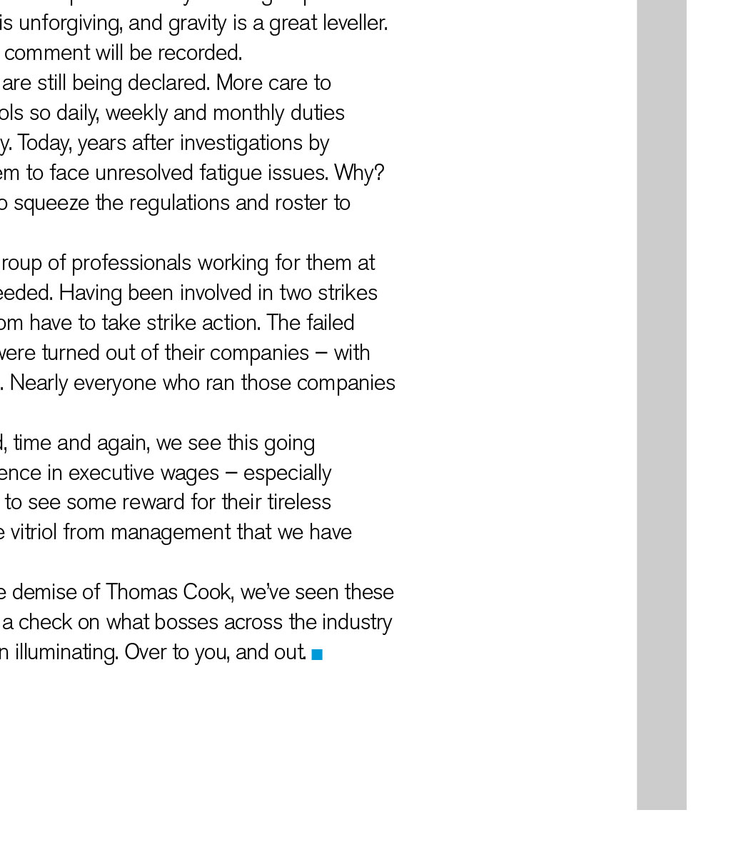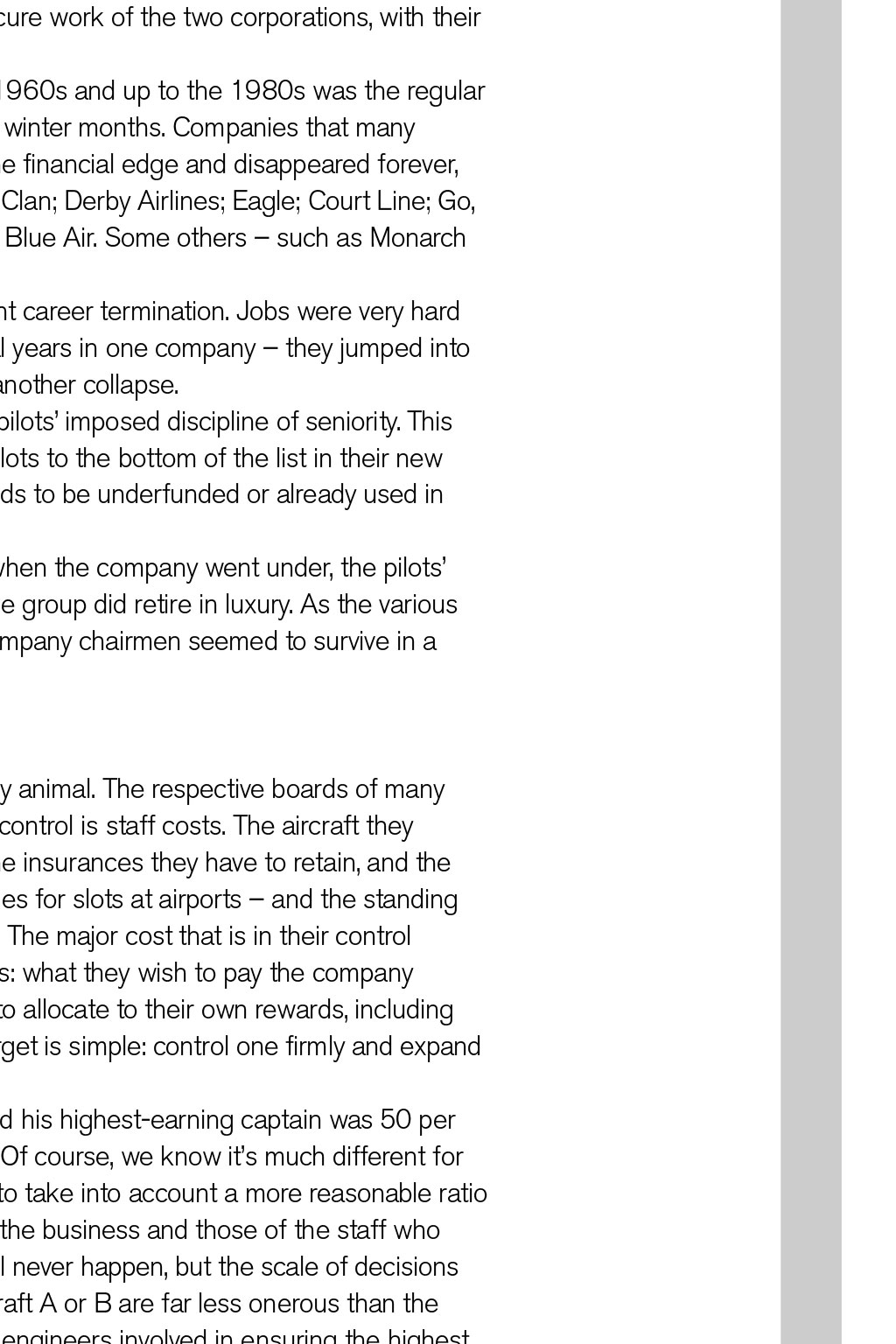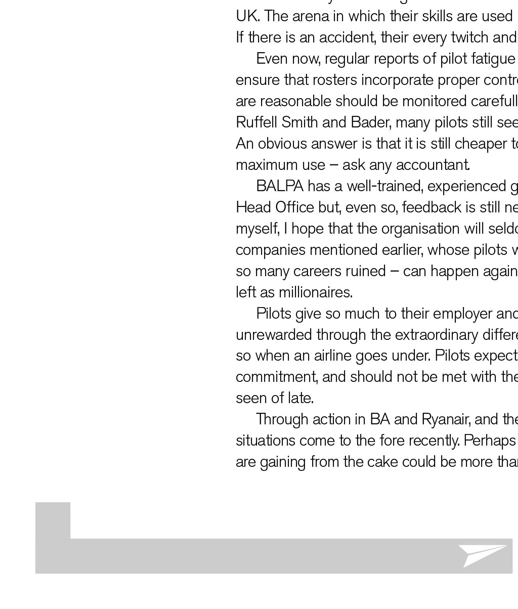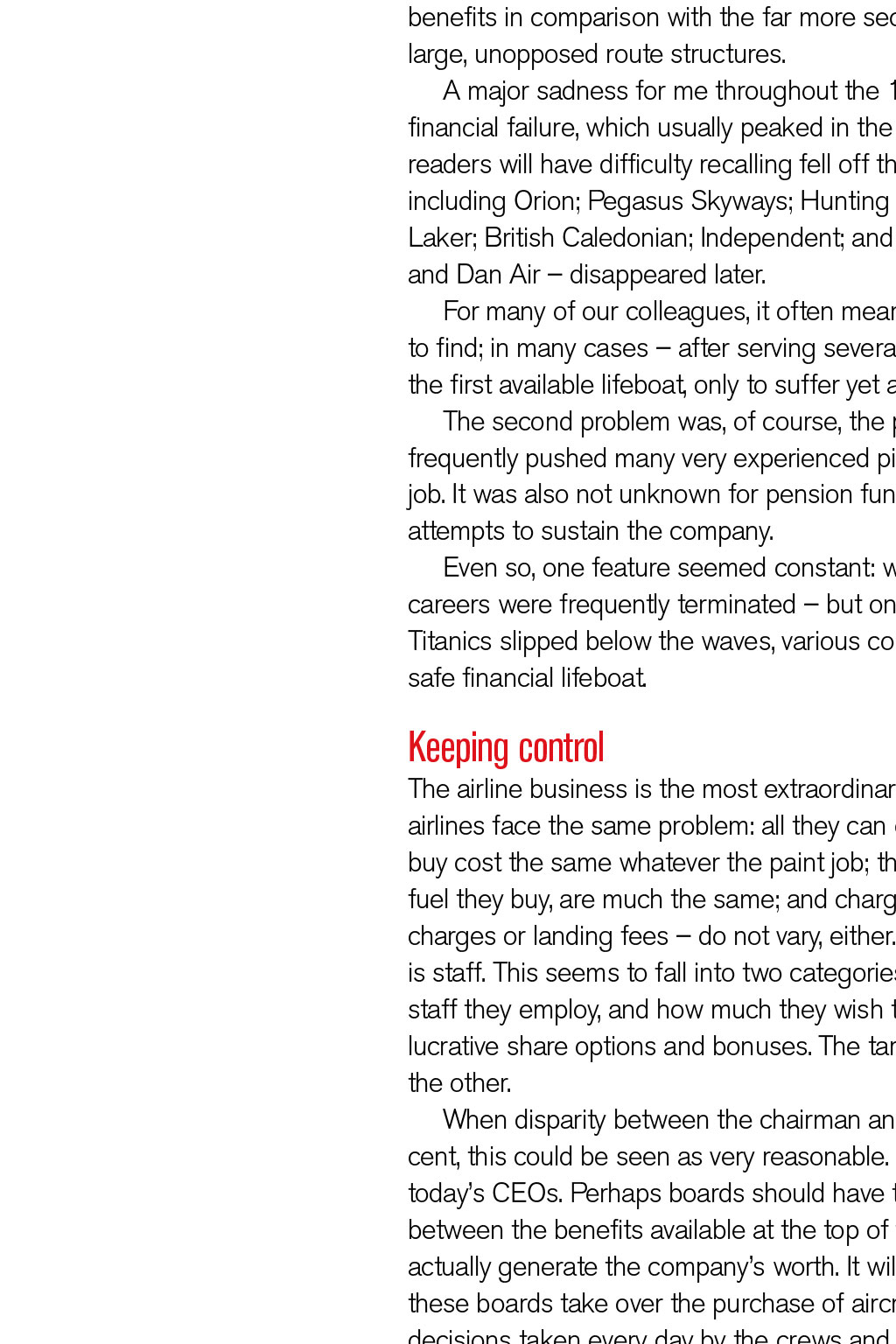 INDUSTRIAL RELATIONS FOR PILOTS: WILL IT NEVER CHANGE? By Captain Mike Clarke, honorary member Keeping an airline and its staff afloat – and content – can be a tricky business aving served for 20 years on BALPA’s National Executive Committee (NEC), it’s only fair to give a brief background to my interest. I began as a reluctant member; having been in the air force, I was not in favour of joining. Within two years of being employed by British European Airways, the Association declared a strike against the company. It seemed grossly immoral to remain a non-member and then accept whatever uplifts in salary that would, hopefully, follow the proposed action. The strike produced an acceptance of an improved offer and the action was called off. After this, I stood for election and my personal involvement was about to begin. At this stage, senior captains flying the Comet earned £5,000 a year, and the company chairman £10,000. It seemed a reasonable disparity for the airline boss to enjoy his comfort zone in the pay stakes. When I was elected to the chairmanship of the BEA pilots’ committee, it automatically brought me onto the NEC. In that period, the two major parts of the Association were BOAC and BEA, which had a combined membership of around 2,500. The ‘independent’ pilots’ council group added another 1,100-1,200 members. The independent council did, without doubt, have the worst industrial problems. It was the dreaded era of large-scale charter work, troop contracts, and reduced working benefits in comparison with the far more secure work of the two corporations, with their large, unopposed route structures. A major sadness for me throughout the 1960s and up to the 1980s was the regular financial failure, which usually peaked in the winter months. Companies that many readers will have difficulty recalling fell off the financial edge and disappeared forever, including Orion; Pegasus Skyways; Hunting Clan; Derby Airlines; Eagle; Court Line; Go, Laker; British Caledonian; Independent; and Blue Air. Some others – such as Monarch and Dan Air – disappeared later. For many of our colleagues, it often meant career termination. Jobs were very hard to find; in many cases – after serving several years in one company – they jumped into the first available lifeboat, only to suffer yet another collapse. The second problem was, of course, the pilots’ imposed discipline of seniority. This frequently pushed many very experienced pilots to the bottom of the list in their new job. It was also not unknown for pension funds to be underfunded or already used in attempts to sustain the company. Even so, one feature seemed constant: when the company went under, the pilots’ careers were frequently terminated – but one group did retire in luxury. As the various Titanics slipped below the waves, various company chairmen seemed to survive in a safe financial lifeboat. Keeping control The airline business is the most extraordinary animal. The respective boards of many airlines face the same problem: all they can control is staff costs. The aircraft they buy cost the same whatever the paint job; the insurances they have to retain, and the fuel they buy, are much the same; and charges for slots at airports – and the standing charges or landing fees – do not vary, either. The major cost that is in their control is staff. This seems to fall into two categories: what they wish to pay the company staff they employ, and how much they wish to allocate to their own rewards, including lucrative share options and bonuses. The target is simple: control one firmly and expand the other. When disparity between the chairman and his highest-earning captain was 50 per cent, this could be seen as very reasonable. Of course, we know it’s much different for today’s CEOs. Perhaps boards should have to take into account a more reasonable ratio between the benefits available at the top of the business and those of the staff who actually generate the company’s worth. It will never happen, but the scale of decisions these boards take over the purchase of aircraft A or B are far less onerous than the decisions taken every day by the crews and engineers involved in ensuring the highest standard demanded for a safe – a very safe – operation, which the paying public expects. My flying career of 30 years started with Sir Sholto Douglas as chairman and ended with Lord King. The five changes involved between them all was a six-year tenure. The majority of the pilot force usually serves close to 30 years. The results produced by respective boards did little to impress the pilot community. While BEA and BOAC were both nationalised, they suffered from government control and direction that they were obliged to follow; this even affected aircraft procurement policy. Ministers often wanted specific routes kept open for political reasons, and oil prices were frequently volatile and beyond control. In BOAC’s case, it was obliged to order the VC10 rather than its preferred option of the Boeing 707 – both very fine aircraft, but the Boeing was lighter and cheaper to operate. With BEA, the Trident was a great aircraft to fly and was not known as ‘The Gripper’ for nothing. Its field performance was not improved when the board asked De Havilland to reduce the fuselage size and take a de-rated Spey engine. Low morale In the late 70s and 80s, it would be fair to say that pilot morale was fairly low – and many would say this was a serious understatement. The BOAC pilots ran a series of restriction of cooperation (ROC) campaigns, which had a serious effect on schedules. A strict adherence to rest times and non-acceptance of various forms of aircraft deficiencies were applied. The BEA group signed a vote of no confidence in the management of the airline. Severe cutbacks in engineering spares disrupted aircraft serviceability, which was widely reported in the press. One captain’s passenger address after yet anot
