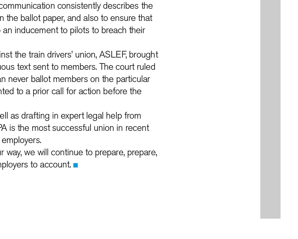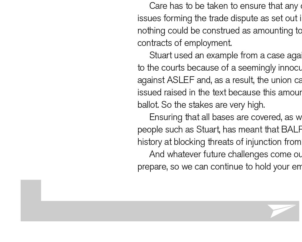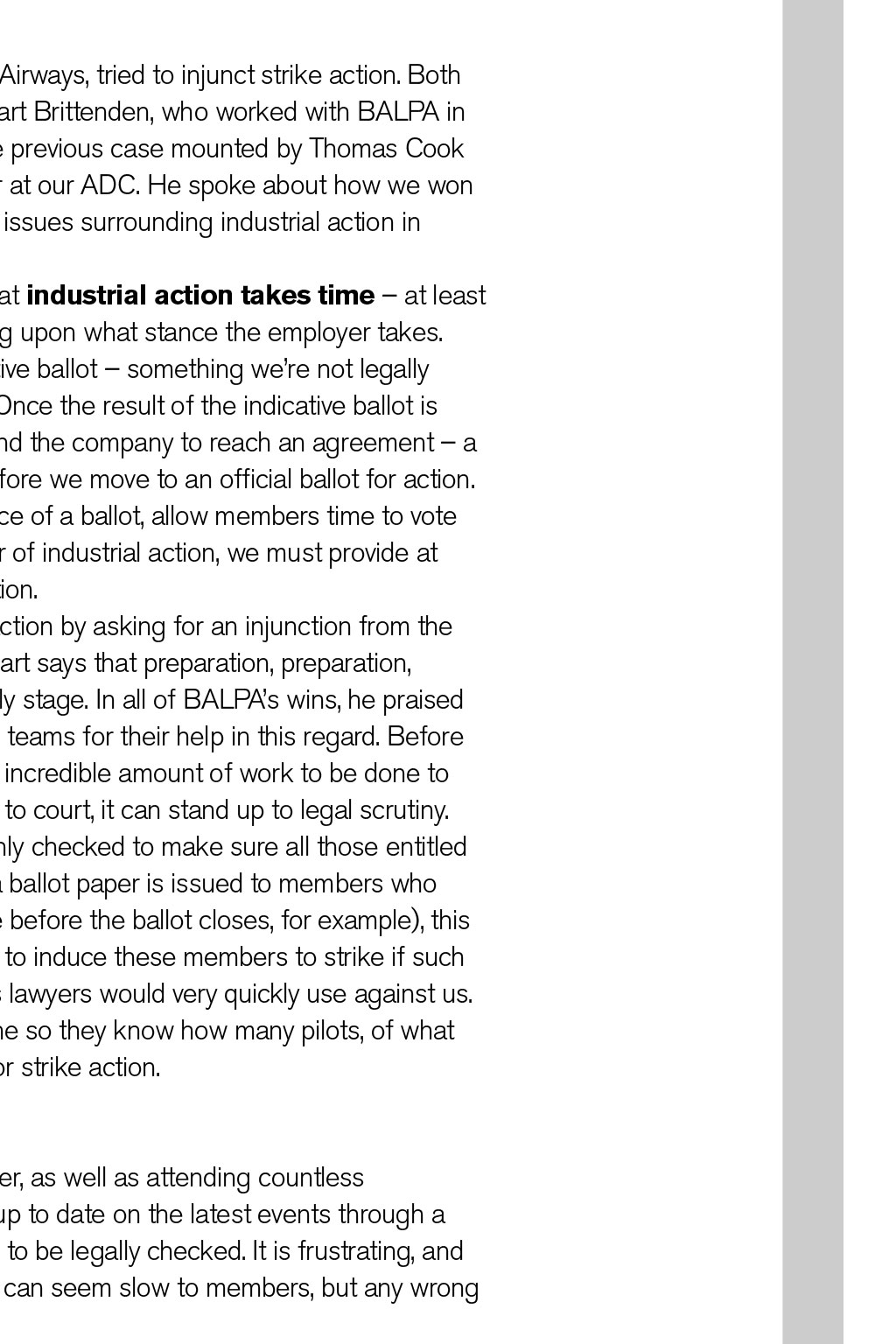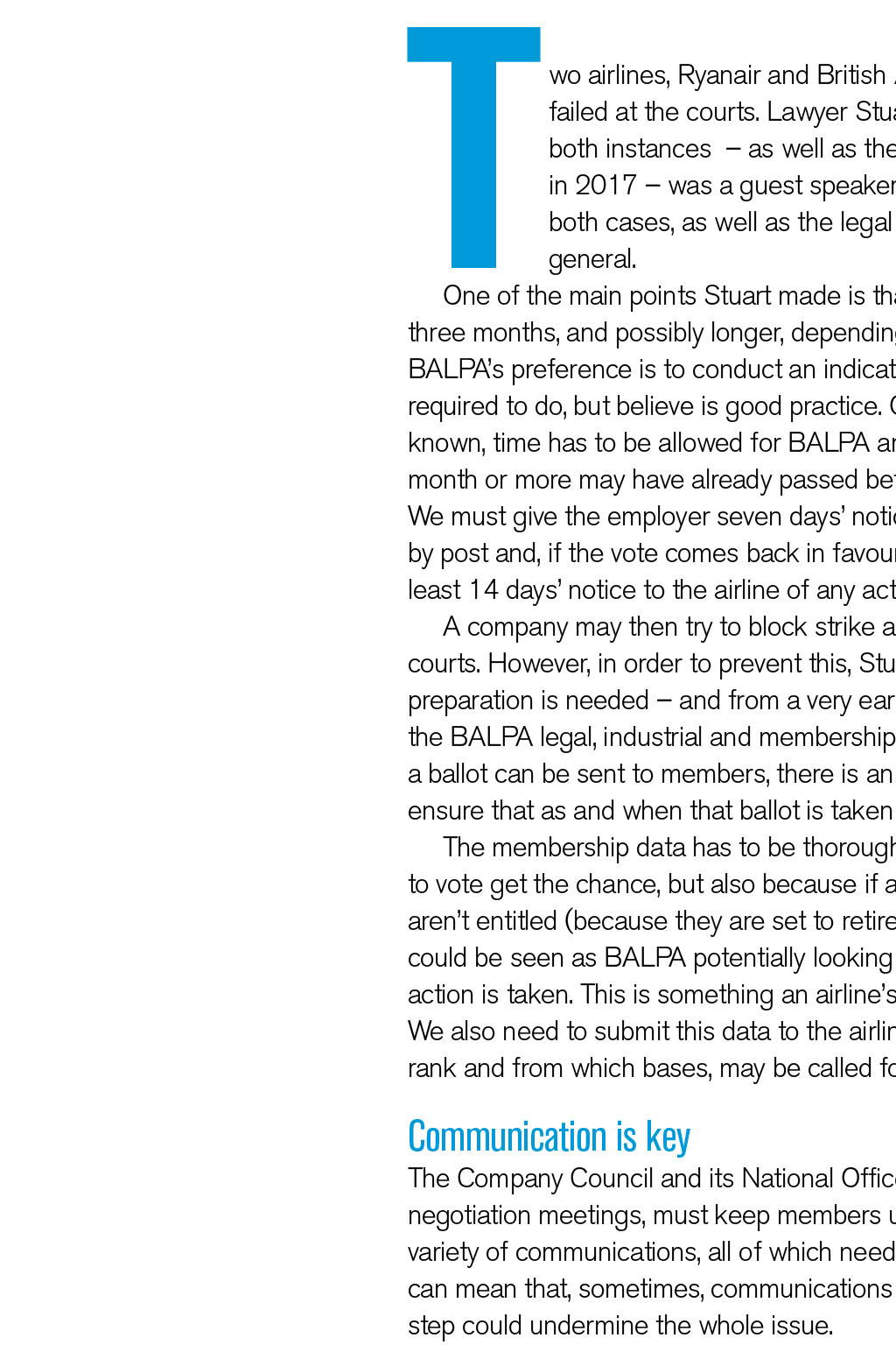 By Charlotte Branson, BALPA Media Officer Back in the day, training was free – and mostly only for men. But was it any better? THE LEGAL VIEWPOINT Two airlines, Ryanair and British Airways, tried to injunct strike action. Both failed at the courts. Lawyer Stuart Brittenden, who worked with BALPA in both instances – as well as the previous case mounted by Thomas Cook in 2017 – was a guest speaker at our ADC. He spoke about how we won both cases, as well as the legal issues surrounding industrial action in general. One of the main points Stuart made is that industrial action takes time – at least three months, and possibly longer, depending upon what stance the employer takes. BALPA’s preference is to conduct an indicative ballot – something we’re not legally required to do, but believe is good practice. Once the result of the indicative ballot is known, time has to be allowed for BALPA and the company to reach an agreement – a month or more may have already passed before we move to an official ballot for action. We must give the employer seven days’ notice of a ballot, allow members time to vote by post and, if the vote comes back in favour of industrial action, we must provide at least 14 days’ notice to the airline of any action. A company may then try to block strike action by asking for an injunction from the courts. However, in order to prevent this, Stuart says that preparation, preparation, preparation is needed – and from a very early stage. In all of BALPA’s wins, he praised the BALPA legal, industrial and membership teams for their help in this regard. Before a ballot can be sent to members, there is an incredible amount of work to be done to ensure that as and when that ballot is taken to court, it can stand up to legal scrutiny. The membership data has to be thoroughly checked to make sure all those entitled to vote get the chance, but also because if a ballot paper is issued to members who aren’t entitled (because they are set to retire before the ballot closes, for example), this could be seen as BALPA potentially looking to induce these members to strike if such action is taken. This is something an airline’s lawyers would very quickly use against us. We also need to submit this data to the airline so they know how many pilots, of what rank and from which bases, may be called for strike action. Communication is key The Company Council and its National Officer, as well as attending countless negotiation meetings, must keep members up to date on the latest events through a variety of communications, all of which need to be legally checked. It is frustrating, and can mean that, sometimes, communications can seem slow to members, but any wrong step could undermine the whole issue. Care has to be taken to ensure that any communication consistently describes the issues forming the trade dispute as set out in the ballot paper, and also to ensure that nothing could be construed as amounting to an inducement to pilots to breach their contracts of employment. Stuart used an example from a case against the train drivers’ union, ASLEF, brought to the courts because of a seemingly innocuous text sent to members. The court ruled against ASLEF and, as a result, the union can never ballot members on the particular issued raised in the text because this amounted to a prior call for action before the ballot. So the stakes are very high. Ensuring that all bases are covered, as well as drafting in expert legal help from people such as Stuart, has meant that BALPA is the most successful union in recent history at blocking threats of injunction from employers. And whatever future challenges come our way, we will continue to prepare, prepare, prepare, so we can continue to hold your employers to account. INDUSTRIAL
