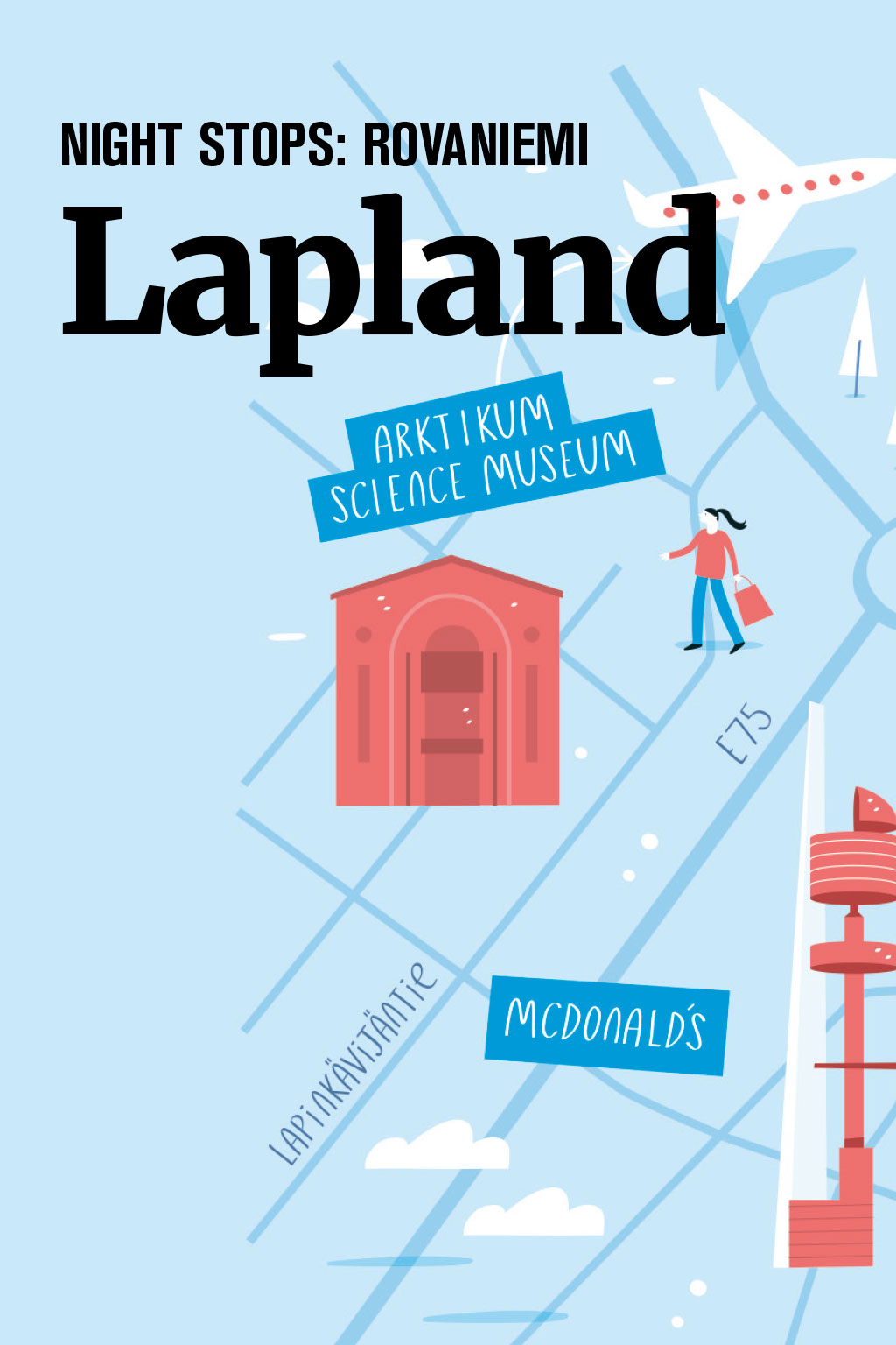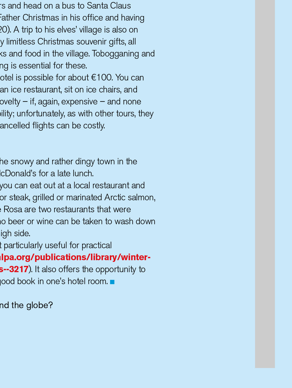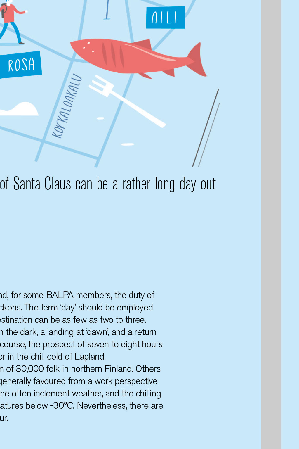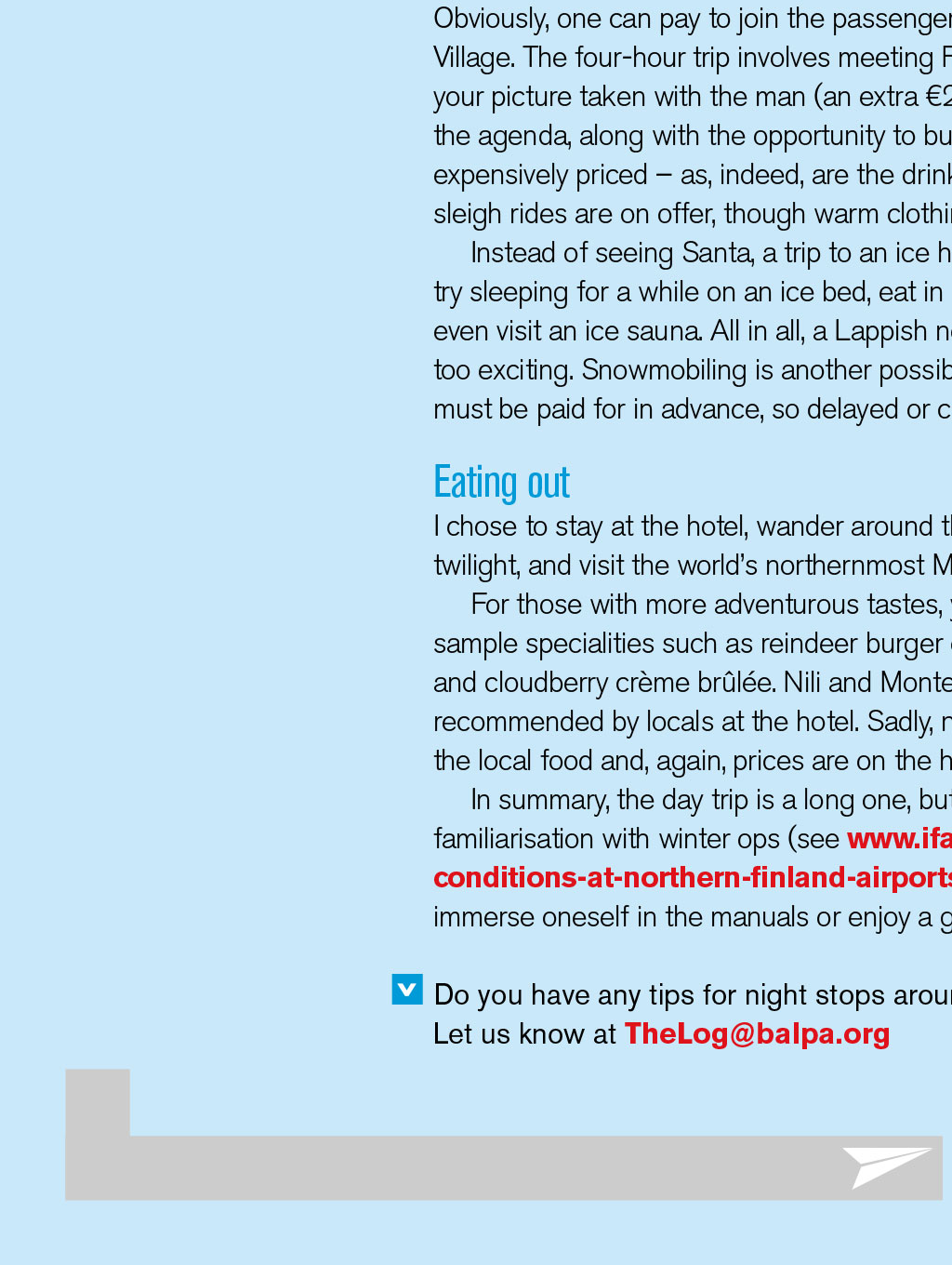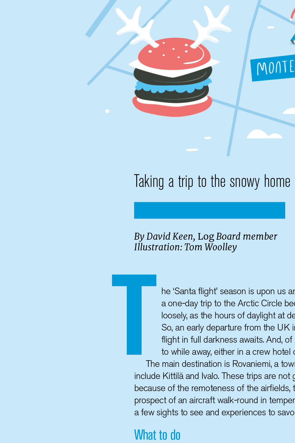 NIGHT STOPS: ROVANIEMI Lapland Taking a trip to the snowy home of Santa Claus can be a rather long day out By David Keen, Log Board member TIllustration: Tom Woolley he ‘Santa flight’ season is upon us and, for some BALPA members, the duty of a one-day trip to the Arctic Circle beckons. The term ‘day’ should be employed loosely, as the hours of daylight at destination can be as few as two to three. So, an early departure from the UK in the dark, a landing at ‘dawn’, and a return flight in full darkness awaits. And, of course, the prospect of seven to eight hours to while away, either in a crew hotel or in the chill cold of Lapland. The main destination is Rovaniemi, a town of 30,000 folk in northern Finland. Others include Kittilä and Ivalo. These trips are not generally favoured from a work perspective because of the remoteness of the airfields, the often inclement weather, and the chilling prospect of an aircraft walk-round in temperatures below -30°C. Nevertheless, there are a few sights to see and experiences to savour. What to do Obviously, one can pay to join the passengers and head on a bus to Santa Claus Village. The four-hour trip involves meeting Father Christmas in his office and having your picture taken with the man (an extra €20). A trip to his elves’ village is also on the agenda, along with the opportunity to buy limitless Christmas souvenir gifts, all expensively priced – as, indeed, are the drinks and food in the village. Tobogganing and sleigh rides are on offer, though warm clothing is essential for these. Instead of seeing Santa, a trip to an ice hotel is possible for about €100. You can try sleeping for a while on an ice bed, eat in an ice restaurant, sit on ice chairs, and even visit an ice sauna. All in all, a Lappish novelty – if, again, expensive – and none too exciting. Snowmobiling is another possibility; unfortunately, as with other tours, they must be paid for in advance, so delayed or cancelled flights can be costly. Eating out I chose to stay at the hotel, wander around the snowy and rather dingy town in the twilight, and visit the world’s northernmost McDonald’s for a late lunch. For those with more adventurous tastes, you can eat out at a local restaurant and sample specialities such as reindeer burger or steak, grilled or marinated Arctic salmon, and cloudberry crème brûlée. Nili and Monte Rosa are two restaurants that were recommended by locals at the hotel. Sadly, no beer or wine can be taken to wash down the local food and, again, prices are on the high side. In summary, the day trip is a long one, but particularly useful for practical familiarisation with winter ops (see www.ifalpa.org/publications/library/winter- conditions-at-northern-finland-airports--3217). It also offers the opportunity to immerse oneself in the manuals or enjoy a good book in one’s hotel room. Do you have any tips for night stops around the globe? Let us know at TheLog@balpa.org NIGHT STOPS
