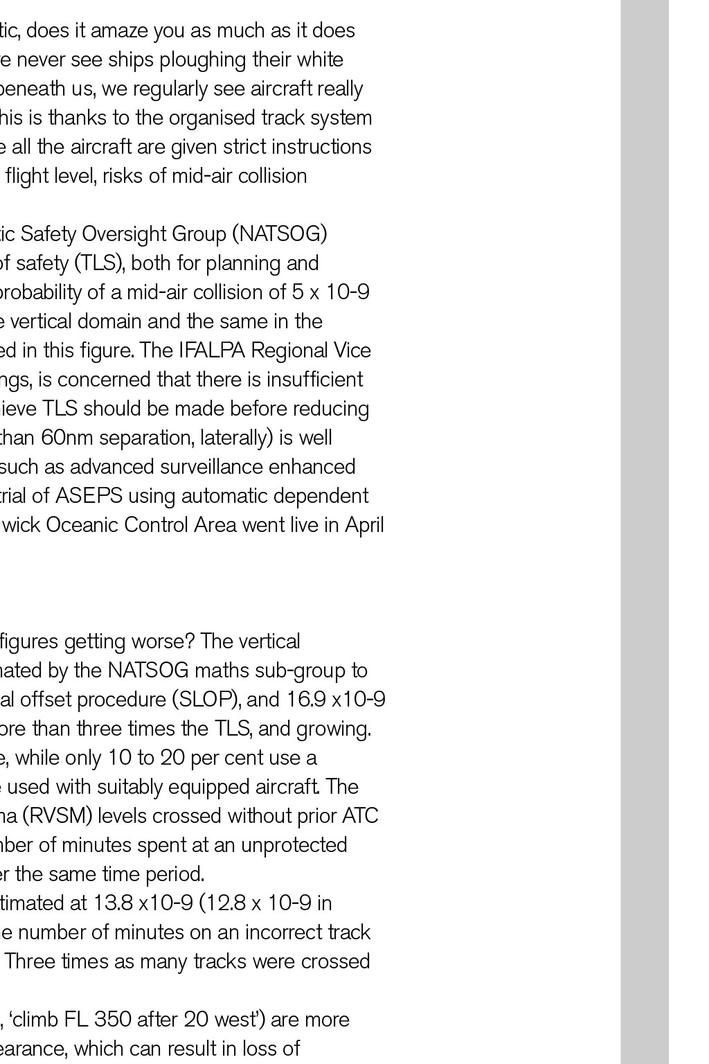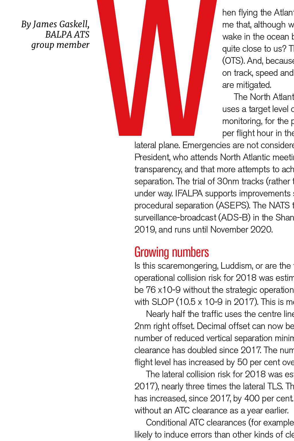 By James Gaskell, BALPA ATS group member When flying the Atlantic, does it amaze you as much as it does me that, although we never see ships ploughing their white wake in the ocean beneath us, we regularly see aircraft really quite close to us? This is thanks to the organised track system (OTS). And, because all the aircraft are given strict instructions on track, speed and flight level, risks of mid-air collision are mitigated. The North Atlantic Safety Oversight Group (NATSOG) uses a target level of safety (TLS), both for planning and monitoring, for the probability of a mid-air collision of 5 x 10-9 per flight hour in the vertical domain and the same in the lateral plane. Emergencies are not considered in this figure. The IFALPA Regional Vice President, who attends North Atlantic meetings, is concerned that there is insufficient transparency, and that more attempts to achieve TLS should be made before reducing separation. The trial of 30nm tracks (rather than 60nm separation, laterally) is well under way. IFALPA supports improvements such as advanced surveillance enhanced procedural separation (ASEPS). The NATS trial of ASEPS using automatic dependent surveillance-broadcast (ADS-B) in the Shanwick Oceanic Control Area went live in April 2019, and runs until November 2020. Growing numbers RISKY BUSINESS Is the risk of a North Atlantic mid-air collision increasing? Is this scaremongering, Luddism, or are the figures getting worse? The vertical operational collision risk for 2018 was estimated by the NATSOG maths sub-group to be 76 x10-9 without the strategic operational offset procedure (SLOP), and 16.9 x10-9 with SLOP (10.5 x 10-9 in 2017). This is more than three times the TLS, and growing. Nearly half the traffic uses the centre line, while only 10 to 20 per cent use a 2nm right offset. Decimal offset can now be used with suitably equipped aircraft. The number of reduced vertical separation minima (RVSM) levels crossed without prior ATC clearance has doubled since 2017. The number of minutes spent at an unprotected flight level has increased by 50 per cent over the same time period. The lateral collision risk for 2018 was estimated at 13.8 x10-9 (12.8 x 10-9 in 2017), nearly three times the lateral TLS. The number of minutes on an incorrect track has increased, since 2017, by 400 per cent. Three times as many tracks were crossed without an ATC clearance as a year earlier. Conditional ATC clearances (for example, ‘climb FL 350 after 20 west’) are more likely to induce errors than other kinds of clearance, which can result in loss of separation with other aircraft or flying at an incorrect level or on the wrong track. As flight crew, we should report all errors and our belief as to why they happened, and take particular care when receiving conditional clearances or re-routes. TECH LOG