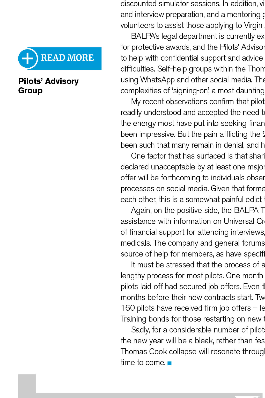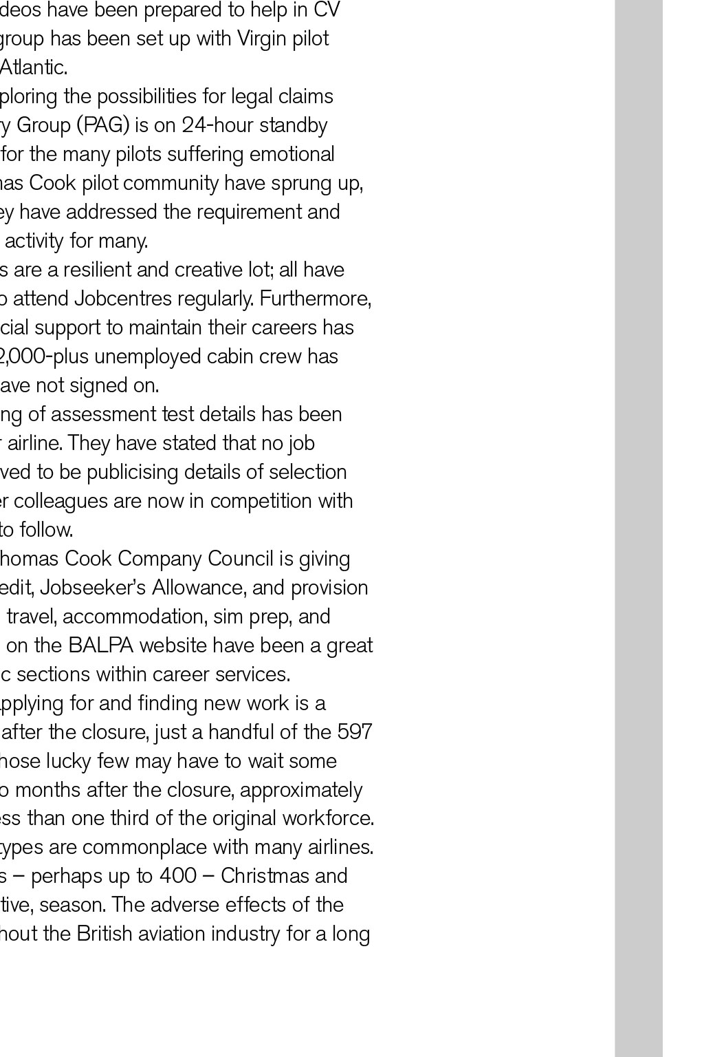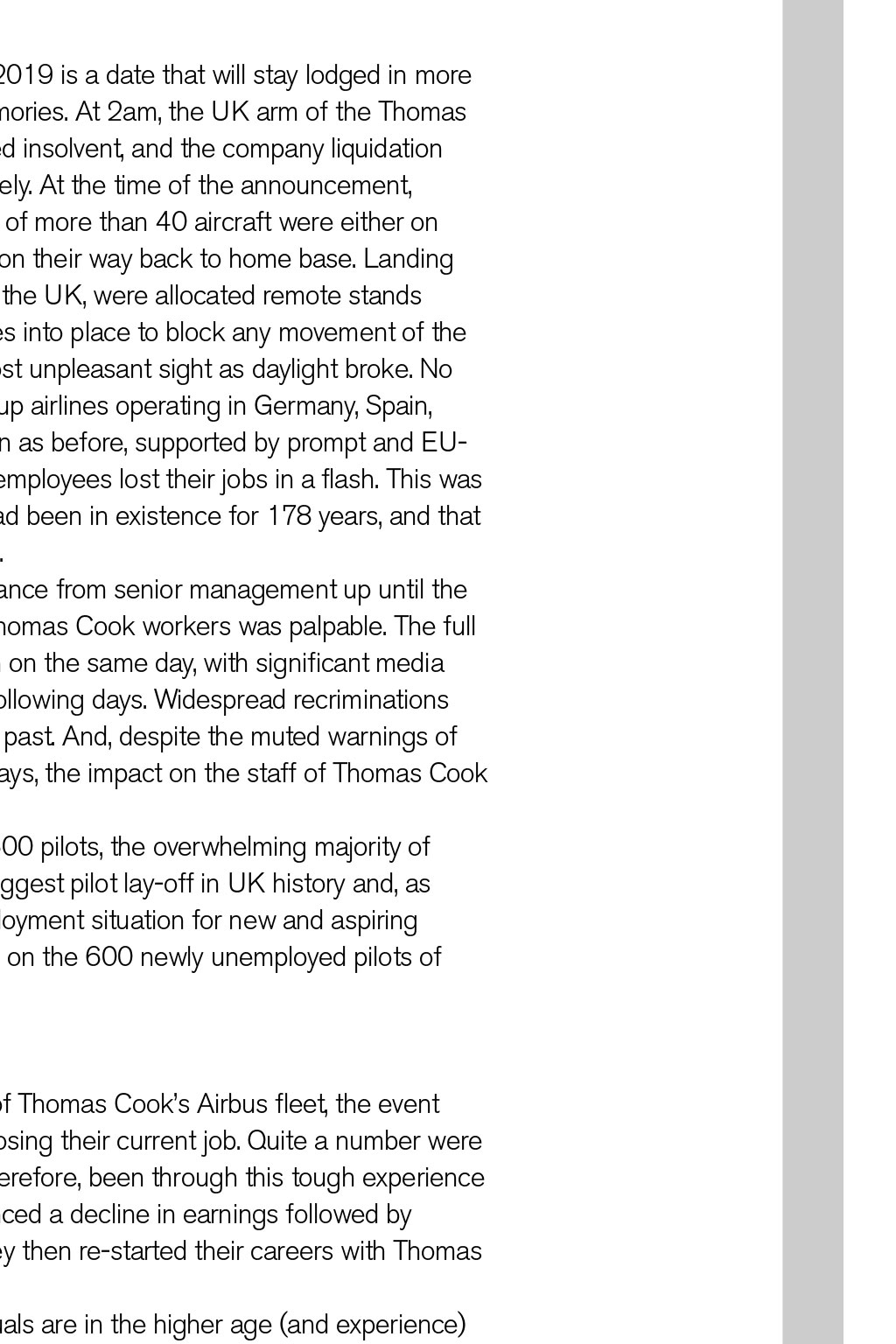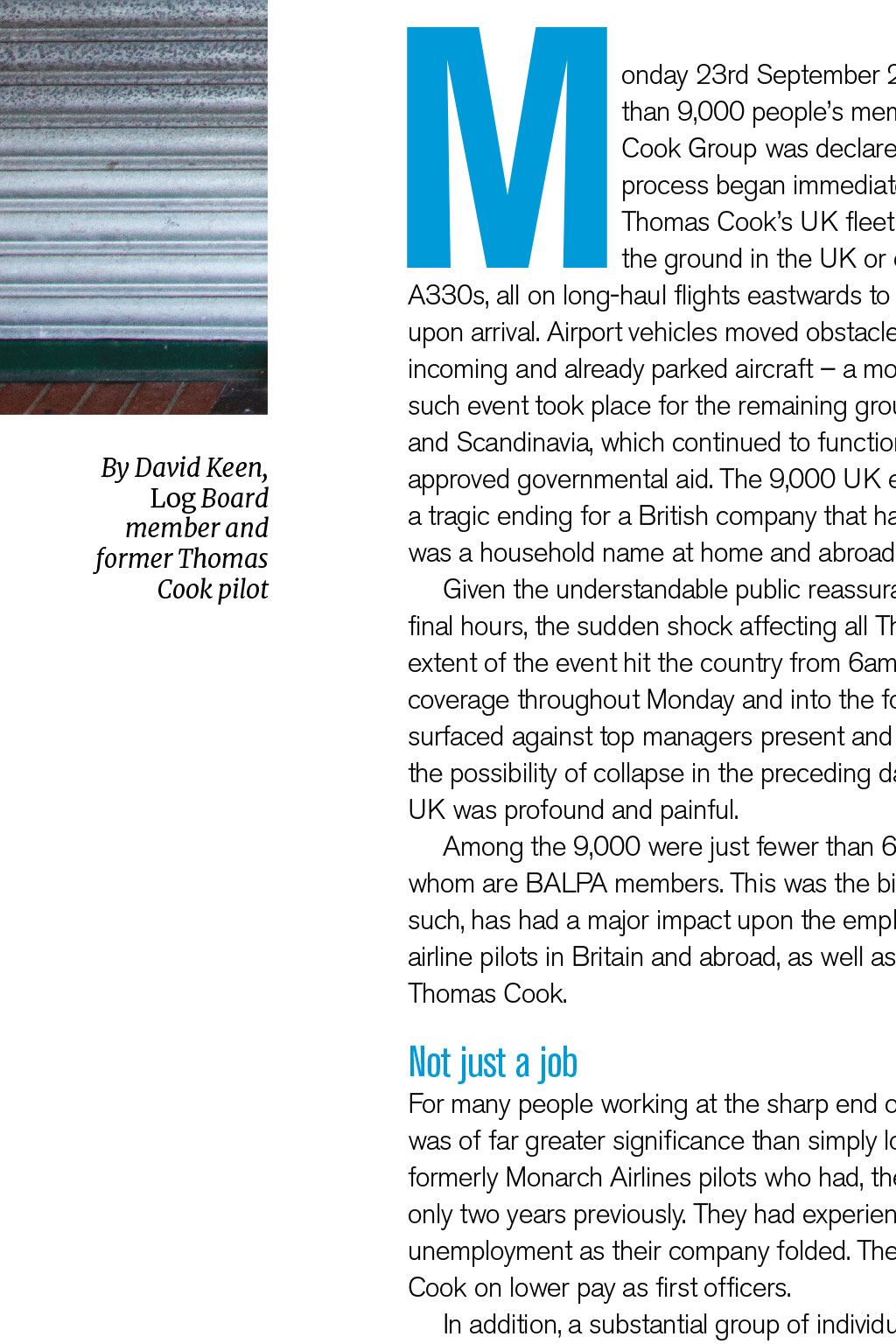 FINAL DESTINATION We take a look at the human cost of the collapse of the oldest travel business in the world, Thomas Cook By David Keen, Log Board member and former Thomas Cook pilot Monday 23rd September 2019 is a date that will stay lodged in more than 9,000 people’s memories. At 2am, the UK arm of the Thomas Cook Group was declared insolvent, and the company liquidation process began immediately. At the time of the announcement, Thomas Cook’s UK fleet of more than 40 aircraft were either on the ground in the UK or on their way back to home base. Landing A330s, all on long-haul flights eastwards to the UK, were allocated remote stands upon arrival. Airport vehicles moved obstacles into place to block any movement of the incoming and already parked aircraft – a most unpleasant sight as daylight broke. No such event took place for the remaining group airlines operating in Germany, Spain, and Scandinavia, which continued to function as before, supported by prompt and EU- approved governmental aid. The 9,000 UK employees lost their jobs in a flash. This was a tragic ending for a British company that had been in existence for 178 years, and that was a household name at home and abroad. Given the understandable public reassurance from senior management up until the final hours, the sudden shock affecting all Thomas Cook workers was palpable. The full extent of the event hit the country from 6am on the same day, with significant media coverage throughout Monday and into the following days. Widespread recriminations surfaced against top managers present and past. And, despite the muted warnings of the possibility of collapse in the preceding days, the impact on the staff of Thomas Cook UK was profound and painful. Among the 9,000 were just fewer than 600 pilots, the overwhelming majority of whom are BALPA members. This was the biggest pilot lay-off in UK history and, as such, has had a major impact upon the employment situation for new and aspiring airline pilots in Britain and abroad, as well as on the 600 newly unemployed pilots of Thomas Cook. Not just a job For many people working at the sharp end of Thomas Cook’s Airbus fleet, the event was of far greater significance than simply losing their current job. Quite a number were formerly Monarch Airlines pilots who had, therefore, been through this tough experience only two years previously. They had experienced a decline in earnings followed by unemployment as their company folded. They then re-started their careers with Thomas Cook on lower pay as first officers. In addition, a substantial group of individuals are in the higher age (and experience) bracket, meaning that their future employment prospects are, realistically, limited. Sadly, many non-EU airlines stipulate age limits and medical requirements that rule out a large number of competent and available pilots. Notable among these are the Middle East and Far East airlines, well known to us all. Perfectly understandable comments from friends in this age group were that they did not relish the prospect of aptitude tests, having flown professionally for more than 30 years. Many selection processes follow a strict format, despite the enormous differences in experience that exist between individuals in a large company. Premature retirement is proving necessary for some, with the associated financial hardship. Recently qualified pilots, with fewer than 500 hours on type, are also limited in the number of carriers to which they can apply. And, for the many pilots aged between 40 and 55, simply not holding the right type rating excludes them from serious consideration by future employers. Paying up to £30,000 for a new rating is simply not a possibility for most. Life change But other factors have come into play, which are creating enormous life and family problems for many – both captains and first officers. Thomas Cook Airlines UK operated from a main base in Manchester, with a focus on long-haul A330 operations, which had been expanded significantly and successfully in recent years. Many employees had relocated to the north west, bringing their families with them. The number of pilot openings at Manchester is clearly limited. Nevertheless, Jet2 and TUI have been quick to respond, and have rapidly set up recruitment programmes to hire significant numbers of pilots for their Manchester and UK bases. In the past three years, Thomas Cook shut down bases at Stansted, Cardiff and East Midlands, and reduced operations out of Belfast. Again, many of our colleagues had relocated to other bases to continue working for the company at Gatwick, Newcastle, Glasgow, Bristol, and Birmingham. Job opportunities are limited or non-existent at some of these airports. Disruption to lives has – and will – continue to take place, for pilots and their families. The consequences are enormous. Pressures within families are taking their toll, both because of loss of income and the likely need to move home and downsize. Schooling, friendships and support networks will all be disrupted, and the psychological effects upon families are not to be under-estimated. The hard facts remain – mortgages and loans need to be repaid. Once the redundancy and loss of notice payments have been deployed, there is no possibility to meet outgoings on Jobseeker’s Allowance. Loss of hard-won benefits, such as family medical insurance and permanent health insurance (PHI), is hitting people hard. For individuals such as Captain Jerry Ward, paralysed from the neck down after an accident down route, the news that PHI will not be paid to him beyond the age of 60 is truly catastrophic. He will now have to live on a meagre RAF pension and disability living allowance, and start to draw down his pension immediately. He has no prospect of any further employment as a pilot up to normal retirement age. Playing a part On the positive side, BALPA has sprung into effective action on many fronts, with the Membership and Careers Servi