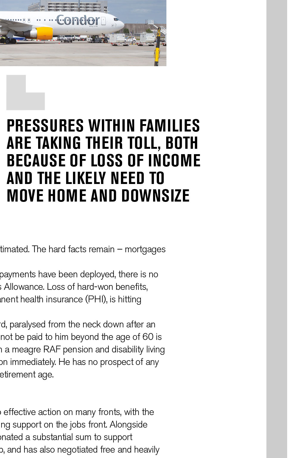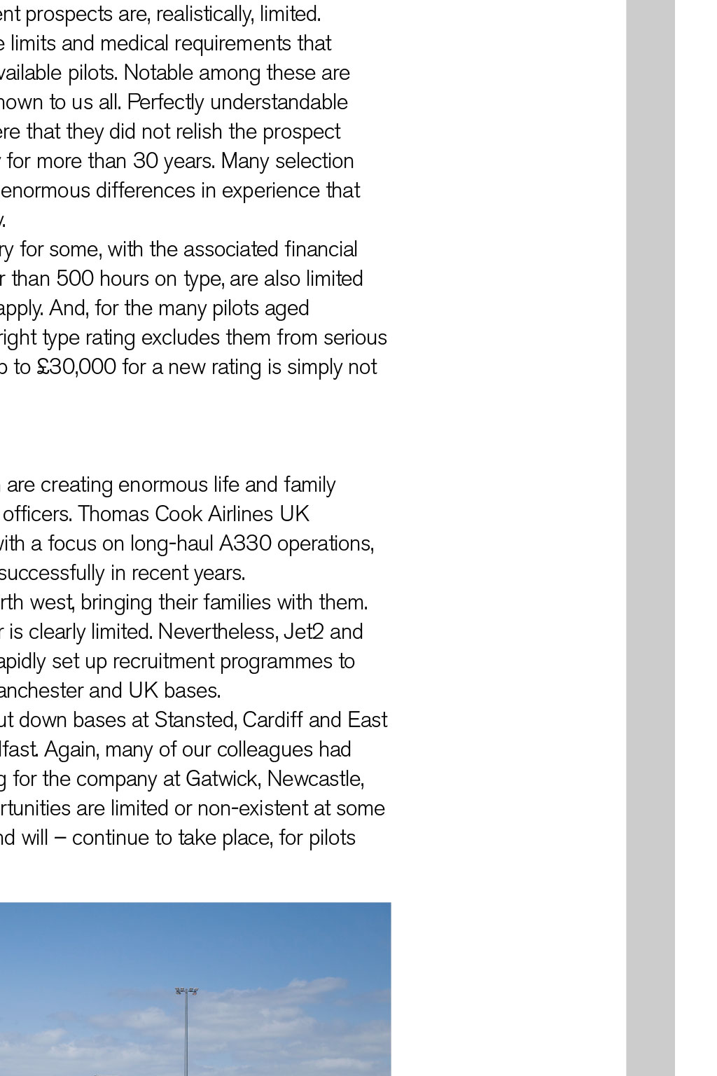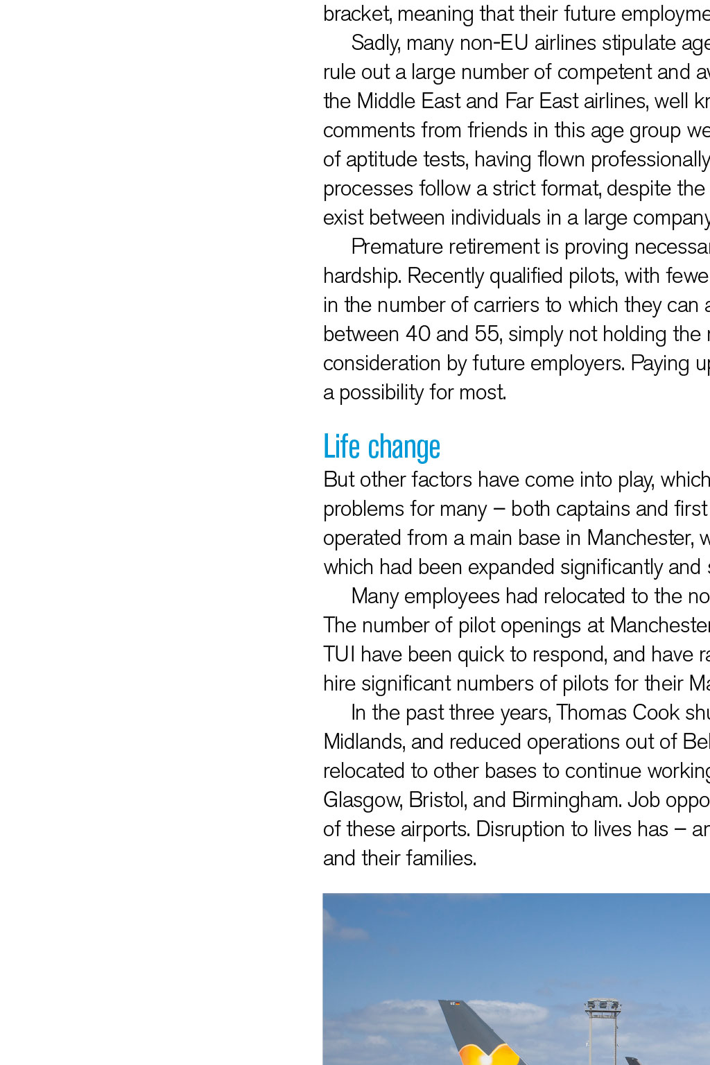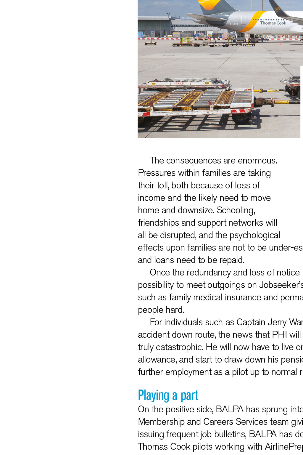 FINAL DESTINATION We take a look at the human cost of the collapse of the oldest travel business in the world, Thomas Cook By David Keen, Log Board member and former Thomas Cook pilot Monday 23rd September 2019 is a date that will stay lodged in more than 9,000 people’s memories. At 2am, the UK arm of the Thomas Cook Group was declared insolvent, and the company liquidation process began immediately. At the time of the announcement, Thomas Cook’s UK fleet of more than 40 aircraft were either on the ground in the UK or on their way back to home base. Landing A330s, all on long-haul flights eastwards to the UK, were allocated remote stands upon arrival. Airport vehicles moved obstacles into place to block any movement of the incoming and already parked aircraft – a most unpleasant sight as daylight broke. No such event took place for the remaining group airlines operating in Germany, Spain, and Scandinavia, which continued to function as before, supported by prompt and EU- approved governmental aid. The 9,000 UK employees lost their jobs in a flash. This was a tragic ending for a British company that had been in existence for 178 years, and that was a household name at home and abroad. Given the understandable public reassurance from senior management up until the final hours, the sudden shock affecting all Thomas Cook workers was palpable. The full extent of the event hit the country from 6am on the same day, with significant media coverage throughout Monday and into the following days. Widespread recriminations surfaced against top managers present and past. And, despite the muted warnings of the possibility of collapse in the preceding days, the impact on the staff of Thomas Cook UK was profound and painful. Among the 9,000 were just fewer than 600 pilots, the overwhelming majority of whom are BALPA members. This was the biggest pilot lay-off in UK history and, as such, has had a major impact upon the employment situation for new and aspiring airline pilots in Britain and abroad, as well as on the 600 newly unemployed pilots of Thomas Cook. Not just a job For many people working at the sharp end of Thomas Cook’s Airbus fleet, the event was of far greater significance than simply losing their current job. Quite a number were formerly Monarch Airlines pilots who had, therefore, been through this tough experience only two years previously. They had experienced a decline in earnings followed by unemployment as their company folded. They then re-started their careers with Thomas Cook on lower pay as first officers. In addition, a substantial group of individuals are in the higher age (and experience) bracket, meaning that their future employment prospects are, realistically, limited. Sadly, many non-EU airlines stipulate age limits and medical requirements that rule out a large number of competent and available pilots. Notable among these are the Middle East and Far East airlines, well known to us all. Perfectly understandable comments from friends in this age group were that they did not relish the prospect of aptitude tests, having flown professionally for more than 30 years. Many selection processes follow a strict format, despite the enormous differences in experience that exist between individuals in a large company. Premature retirement is proving necessary for some, with the associated financial hardship. Recently qualified pilots, with fewer than 500 hours on type, are also limited in the number of carriers to which they can apply. And, for the many pilots aged between 40 and 55, simply not holding the right type rating excludes them from serious consideration by future employers. Paying up to £30,000 for a new rating is simply not a possibility for most. Life change But other factors have come into play, which are creating enormous life and family problems for many – both captains and first officers. Thomas Cook Airlines UK operated from a main base in Manchester, with a focus on long-haul A330 operations, which had been expanded significantly and successfully in recent years. Many employees had relocated to the north west, bringing their families with them. The number of pilot openings at Manchester is clearly limited. Nevertheless, Jet2 and TUI have been quick to respond, and have rapidly set up recruitment programmes to hire significant numbers of pilots for their Manchester and UK bases. In the past three years, Thomas Cook shut down bases at Stansted, Cardiff and East Midlands, and reduced operations out of Belfast. Again, many of our colleagues had relocated to other bases to continue working for the company at Gatwick, Newcastle, Glasgow, Bristol, and Birmingham. Job opportunities are limited or non-existent at some of these airports. Disruption to lives has – and will – continue to take place, for pilots and their families. The consequences are enormous. Pressures within families are taking their toll, both because of loss of income and the likely need to move home and downsize. Schooling, friendships and support networks will all be disrupted, and the psychological effects upon families are not to be under-estimated. The hard facts remain – mortgages and loans need to be repaid. Once the redundancy and loss of notice payments have been deployed, there is no possibility to meet outgoings on Jobseeker’s Allowance. Loss of hard-won benefits, such as family medical insurance and permanent health insurance (PHI), is hitting people hard. For individuals such as Captain Jerry Ward, paralysed from the neck down after an accident down route, the news that PHI will not be paid to him beyond the age of 60 is truly catastrophic. He will now have to live on a meagre RAF pension and disability living allowance, and start to draw down his pension immediately. He has no prospect of any further employment as a pilot up to normal retirement age. Playing a part On the positive side, BALPA has sprung into effective action on many fronts, with the Membership and Careers Servi