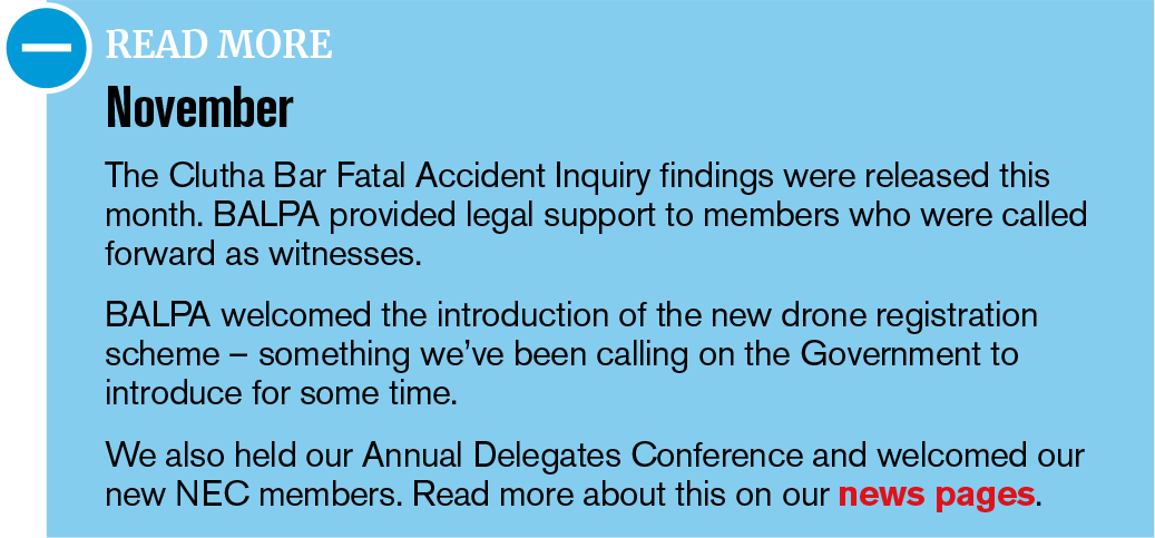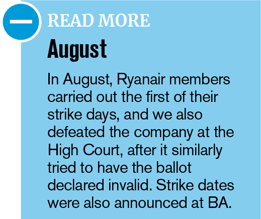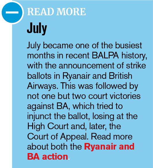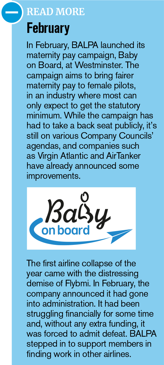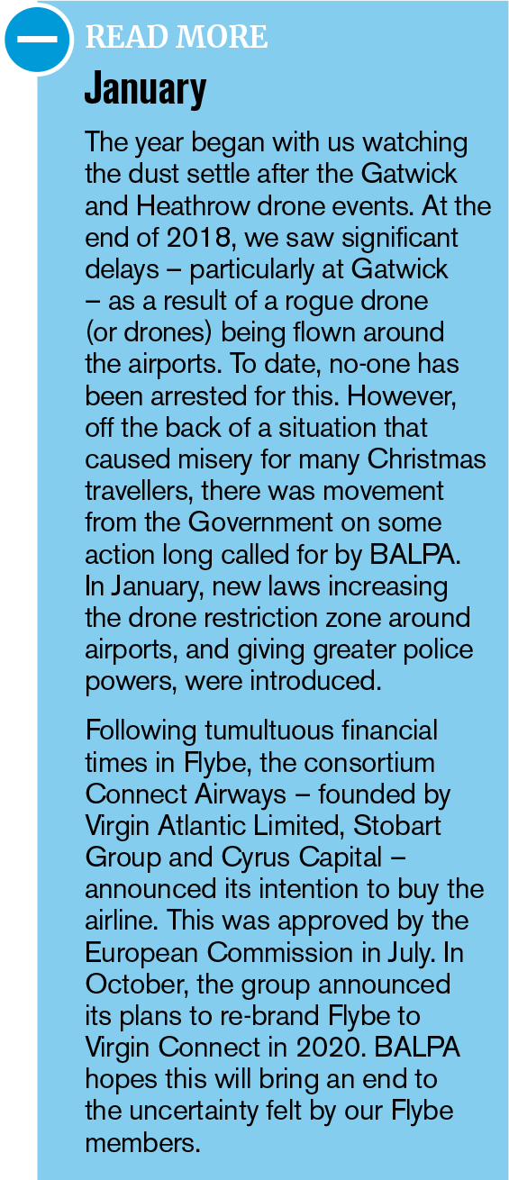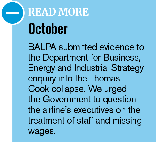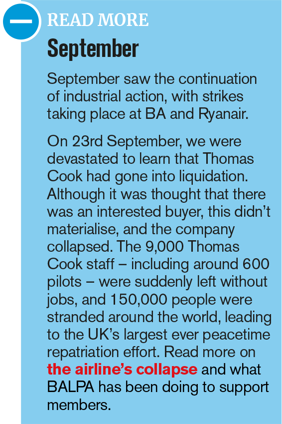 By Charlotte Branson, BALPA Media Officer We take a look back at an incredibly busy year 2019: A TIMELINE January READ MORE February READ MORE March READ MORE April READ MORE May READ MORE July READ MORE 22 August READ MORE September READ MORE October READ MORE November READ MORE December READ MORE INDUSTRIAL READ MORE January The year began with us watching the dust settle after the Gatwick and Heathrow drone events. At the end of 2018, we saw significant delays – particularly at Gatwick – as a result of a rogue drone (or drones) being flown around the airports. To date, no-one has been arrested for this. However, off the back of a situation that caused misery for many Christmas travellers, there was movement from the Government on some action long called for by BALPA. In January, new laws increasing the drone restriction zone around airports, and giving greater police powers, were introduced. Following tumultuous financial times in Flybe, the consortium Connect Airways – founded by Virgin Atlantic Limited, Stobart Group and Cyrus Capital – announced its intention to buy the airline. This was approved by the European Commission in July. In October, the group announced its plans to re-brand Flybe to Virgin Connect in 2020. BALPA hopes this will bring an end to the uncertainty felt by our Flybe members. READ MORE February In February, BALPA launched its maternity pay campaign, Baby on Board, at Westminster. The campaign aims to bring fairer maternity pay to female pilots, in an industry where most can only expect to get the statutory minimum. While the campaign has had to take a back seat publicly, it’s still on various Company Councils’ agendas, and companies such as Virgin Atlantic and AirTanker have already announced some improvements. The first airline collapse of the year came with the distressing demise of Flybmi. In February, the company announced it had gone into administration. It had been struggling financially for some time and, without any extra funding, it was forced to admit defeat. BALPA stepped in to support members in finding work in other airlines. READ MORE March Airlines and aviation authorities around the world took the decision to ground the Boeing 737 Max following the crash of Ethiopian Airlines Flight 302, which came less than six months after the Lion Air flight 610 crash in October 2018. A total of 346 people were killed in these disasters. Questions began to surface around the safety of the aircraft and its automation system. While investigations are still ongoing, the aircraft remains grounded worldwide. READ MORE April BALPA announced it is to host the IFALPA (International Federation of Airline Pilots’ Associations) Conference 2021 in Manchester. We hope the event will highlight the importance of Manchester and the UK in the aviation industry. READ MORE May Our CHC Scotia Company Council announced the results of its industrial action ballot, becoming the first of three of BALPA’s recognised companies to call one this year. Ninety four per cent of members voted ‘yes’ to strike action (with a 77% turnout). Months of negotiations had failed to bring an acceptable pay deal to members. Following the announcement, the company revised its offer, which was accepted by 68% of members. READ MORE July July became one of the busiest months in recent BALPA history, with the announcement of strike ballots in Ryanair and British Airways. This was followed by not one but two court victories against BA, which tried to injunct the ballot, losing at the High Court and, later, the Court of Appeal. Read more about both the Ryanair and BA action. READ MORE August In August, Ryanair members carried out the first of their strike days, and we also defeated the company at the High Court, after it similarly tried to have the ballot declared invalid. Strike dates were also announced at BA. READ MORE September September saw the continuation of industrial action, with strikes taking place at BA and Ryanair. On 23rd September, we were devastated to learn that Thomas Cook had gone into liquidation. Although it was thought that there was an interested buyer, this didn’t materialise, and the company collapsed. The 9,000 Thomas Cook staff – including around 600 pilots – were suddenly left without jobs, and 150,000 people were stranded around the world, leading to the UK’s largest ever peacetime repatriation effort. Read more on the airline’s collapse and what BALPA has been doing to support members. READ MORE October BALPA submitted evidence to the Department for Business, Energy and Industrial Strategy enquiry into the Thomas Cook collapse. We urged the Government to question the airline’s executives on the treatment of staff and missing wages. READ MORE November The Clutha Bar Fatal Accident Inquiry findings were released this month. BALPA provided legal support to members who were called forward as witnesses. BALPA welcomed the introduction of the new drone registration scheme – something we’ve been calling on the Government to introduce for some time. We also held our Annual Delegates Conference and welcomed our new NEC members. Read more about this on our news pages. READ MORE December As industrial issues continue, keep an eye out in our newsletters for the latest as the situations develop.
