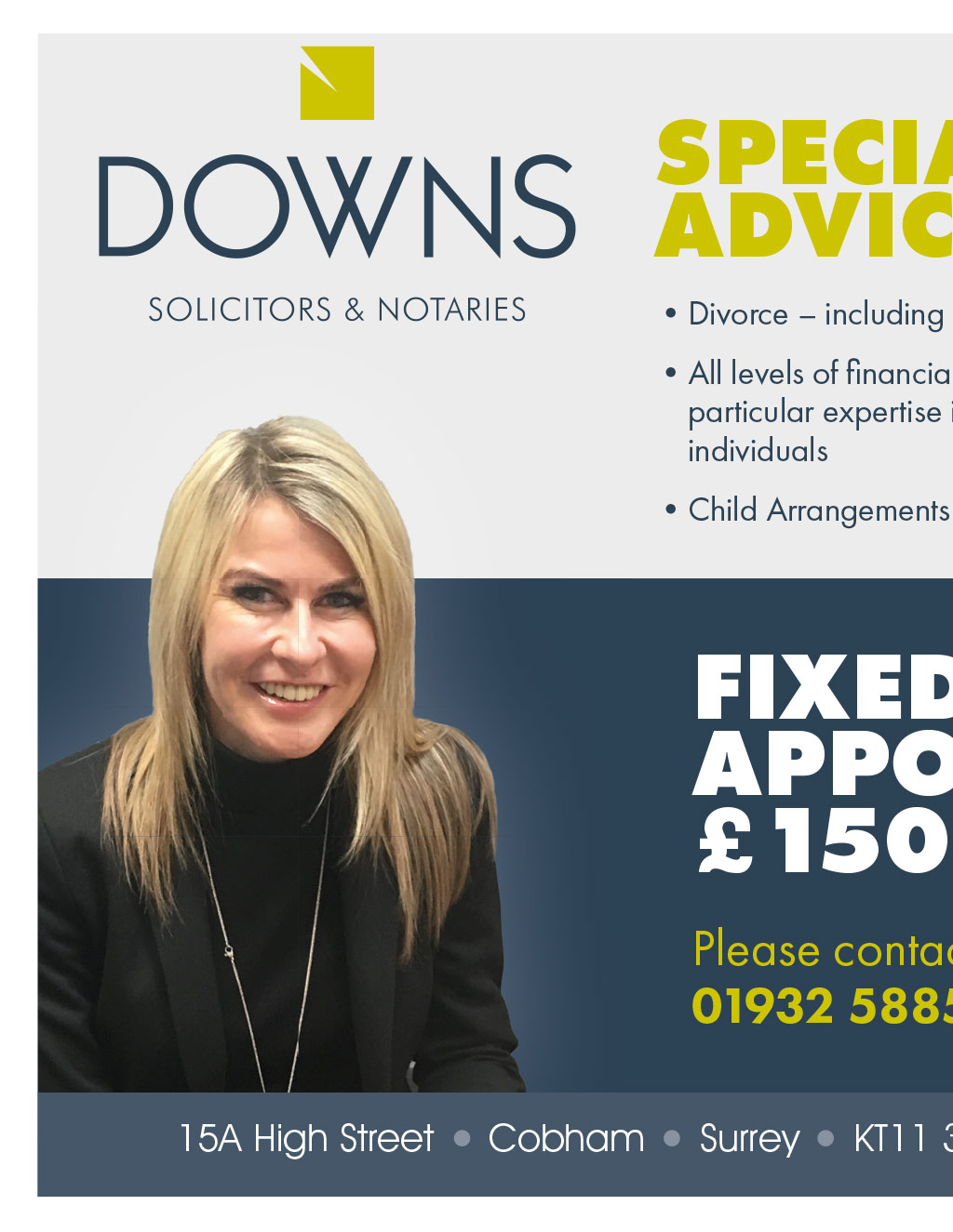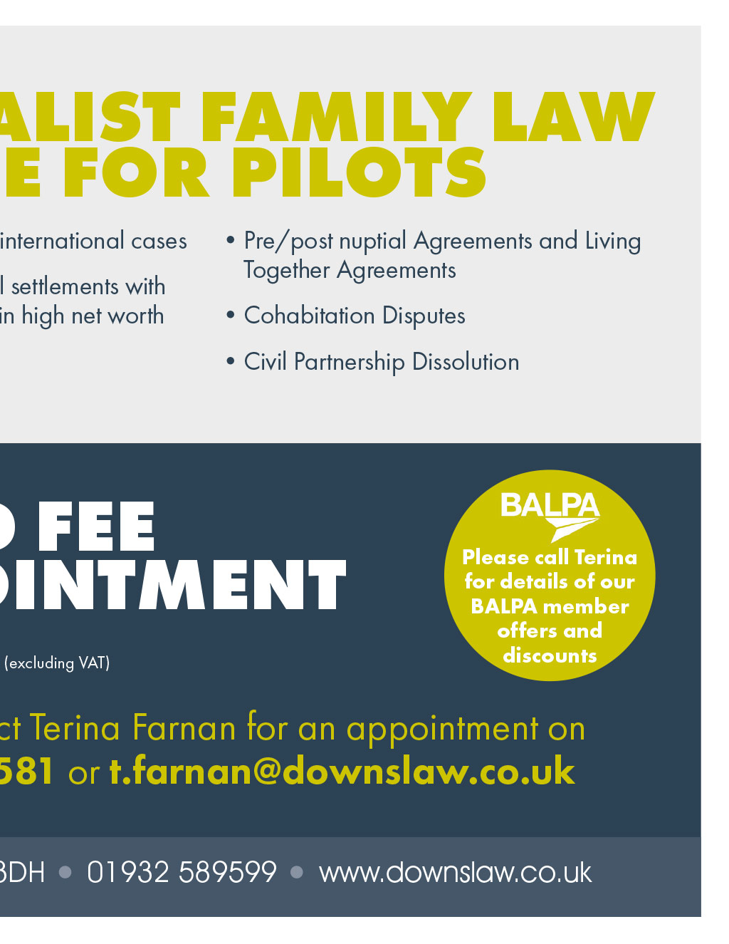 Divorce including international cases All levels of financial settlements with particular expertise in high net worth individuals Child Arrangements Pre/post nuptial Agreements and Living Together Agreements Cohabitation Disputes Civil Partnership Dissolution FIXED FEE APPOINTMENT 150 (excluding VAT) Please call Terina for details of our BALPA member offers and discounts Please contact Terina Farnan for an appointment on 01932 588581 or t.farnan@downslaw.co.uk 15A High Street Cobham Surrey KT11 3DH 01932 589599 www.downslaw.co.uk
