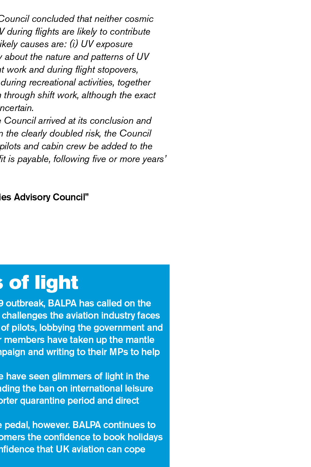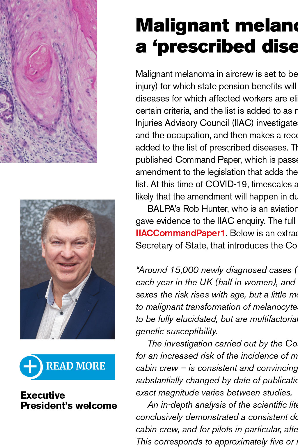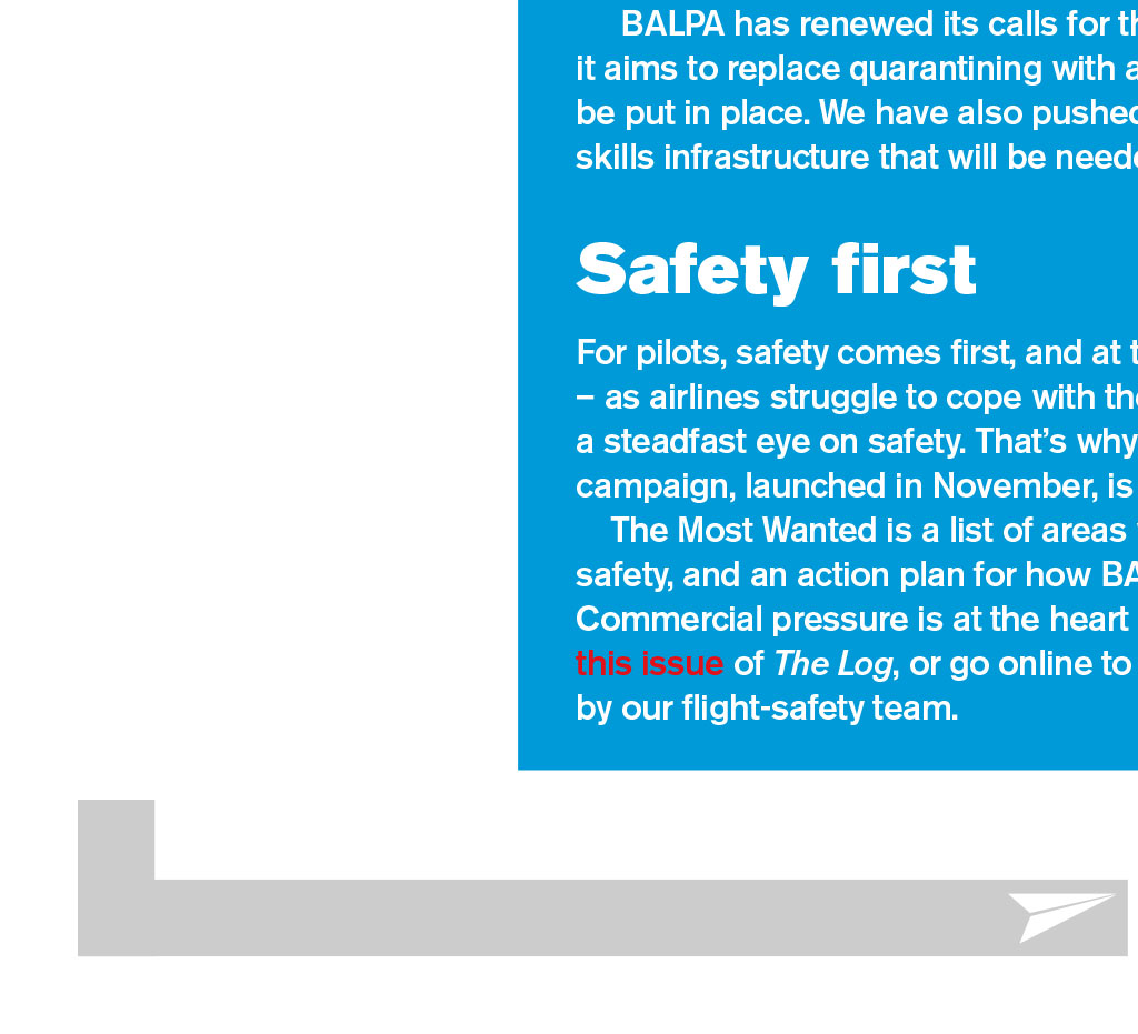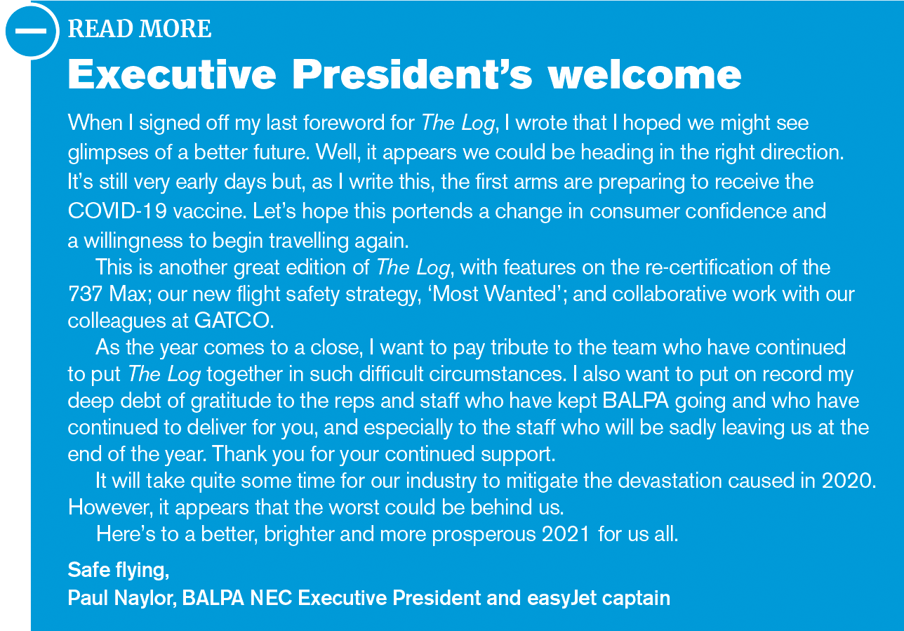 The latest in aviation and industrial news from around the world READ MORE Executive Presidents welcome Invasive keratinising squamous cell carcinoma of the skin When I signed off my last foreword for The Log, I wrote that I hoped we might see glimpses of a better future. Well, it appears we could be heading in the right direction. Its still very early days but, as I write this, the first arms are preparing to receive the COVID-19 vaccine. Lets hope this portends a change in consumer confidence and a willingness to begin travelling again. This is another great edition of The Log, with features on the re-certification of the 737 Max; our new flight safety strategy, Most Wanted; and collaborative work with our colleagues at GATCO. As the year comes to a close, I want to pay tribute to the team who have continued to put The Log together in such difficult circumstances. I also want to put on record my deep debt of gratitude to the reps and staff who have kept BALPA going and who have continued to deliver for you, and especially to the staff who will be sadly leaving us at the end of the year. Thank you for your continued support. It will take quite some time for our industry to mitigate the devastation caused in 2020. However, it appears that the worst could be behind us. Heres to a better, brighter and more prosperous 2021 for us all. Safe flying, Paul Naylor, BALPA NEC Executive President and easyJet captain Malignant melanoma a prescribed disease Malignant melanoma in aircrew is set to become a prescribed disease (industrial injury) for which state pension benefits will be payable. There is a list of occupational diseases for which affected workers are eligible for pension payments, subject to certain criteria, and the list is added to as medical knowledge grows. The Industrial Injuries Advisory Council (IIAC) investigates the relationship between the disease and the occupation, and then makes a recommendation, or not, that the disease be added to the list of prescribed diseases. The recommendation takes the form of a published Command Paper, which is passed to the Secretary of State to initiate the amendment to the legislation that adds the new prescribed disease to the existing list. At this time of COVID-19, timescales are a little uncertain. However, it is highly likely that the amendment will happen in due course. BALPAs Rob Hunter, who is an aviation medicine and radiation specialist, gave evidence to the IIAC enquiry. The full Command Paper can be read at bit.ly/ IIACCommandPaper1. Below is an extract of the letter, from the IIAC chair to the Secretary of State, that introduces the Command Paper: READ MORE Executive Presidents welcome Around 15,000 newly diagnosed cases (cancer registrations) of melanoma occur each year in the UK (half in women), and approximately 2,500 deaths. In both sexes the risk rises with age, but a little more so in men. The key triggers leading to malignant transformation of melanocytes (the pigment cells of the skin) have yet to be fully elucidated, but are multifactorial and include UV radiation damage and genetic susceptibility. The investigation carried out by the Council established that the evidence base for an increased risk of the incidence of melanoma in aircrew both pilots and cabin crew is consistent and convincing; the pattern of an excess risk has not substantially changed by date of publication over the last 30 years although the exact magnitude varies between studies. An in-depth analysis of the scientific literature of melanoma incidence conclusively demonstrated a consistent doubling of risk for both pilots and cabin crew, and for pilots in particular, after 5,000 aggregated hours flying time. This corresponds to approximately five or more years aggregated duration of employment. From currently available evidence, the Council concluded that neither cosmic radiation nor occupational exposures to UV during flights are likely to contribute substantially to the excess risk. The most likely causes are: (i) UV exposure outside the aircraft, but there is uncertainty about the nature and patterns of UV exposure that might occur during non-flight work and during flight stopovers, and the potential contribution of exposure during recreational activities, together with; (ii) disruption of the circadian rhythm through shift work, although the exact relationship of this combination is as yet uncertain. This Command Paper sets out how the Council arrived at its conclusion and details the evidence it has reviewed. Given the clearly doubled risk, the Council recommends that malignant melanoma in pilots and cabin crew be added to the list of prescribed diseases for which benefit is payable, following five or more years duration of employment. Yours sincerely Dr Lesley Rushton, chair, Industrial Injuries Advisory Council Some glimmers of light Since the beginning of the COVID-19 outbreak, BALPA has called on the government to recognise the unique challenges the aviation industry faces in the crisis. We have been the voice of pilots, lobbying the government and pushing for action and many of our members have taken up the mantle by supporting our six demands campaign and writing to their MPs to help build the pressure. While there is a long way to go, we have seen glimmers of light in the latest government announcement ending the ban on international leisure travel, introducing the option of a shorter quarantine period and direct financial support for airports. We are not lifting the foot from the pedal, however. BALPA continues to call for more to be done to give customers the confidence to book holidays for next year, and businesses the confidence that UK aviation can cope post-Brexit. BALPA has renewed its calls for the government to set a date for when it aims to replace quarantining with airport testing, so that systems can be put in place. We have also pushed for it to support the operational and skills infrastructure that will be needed for aviation to 