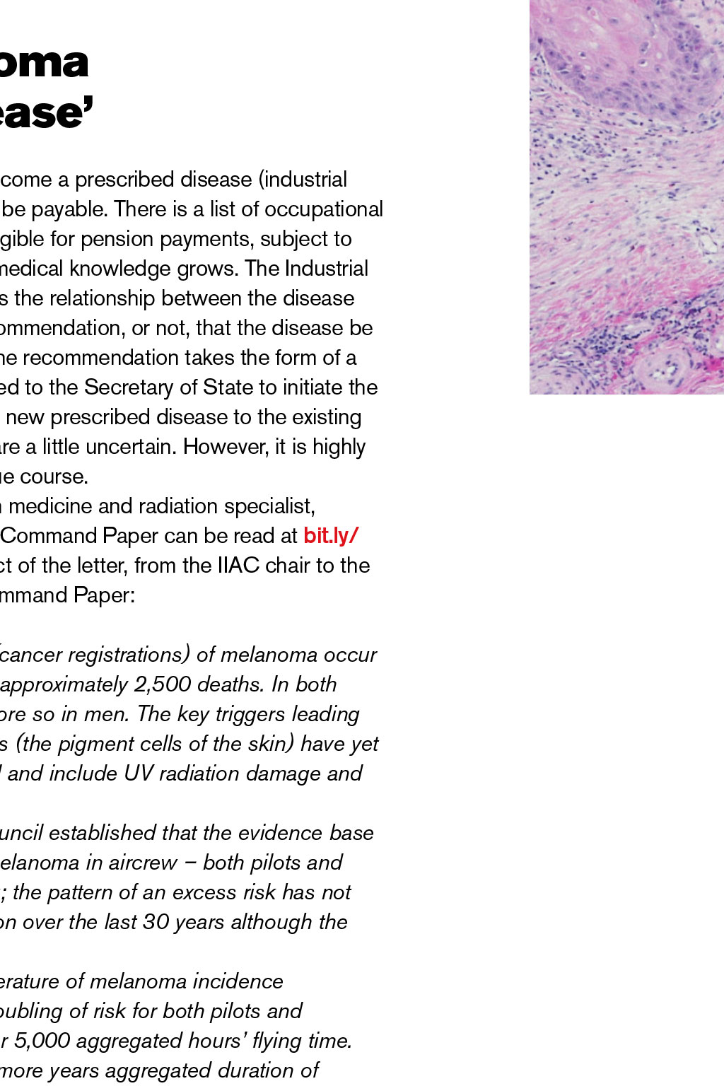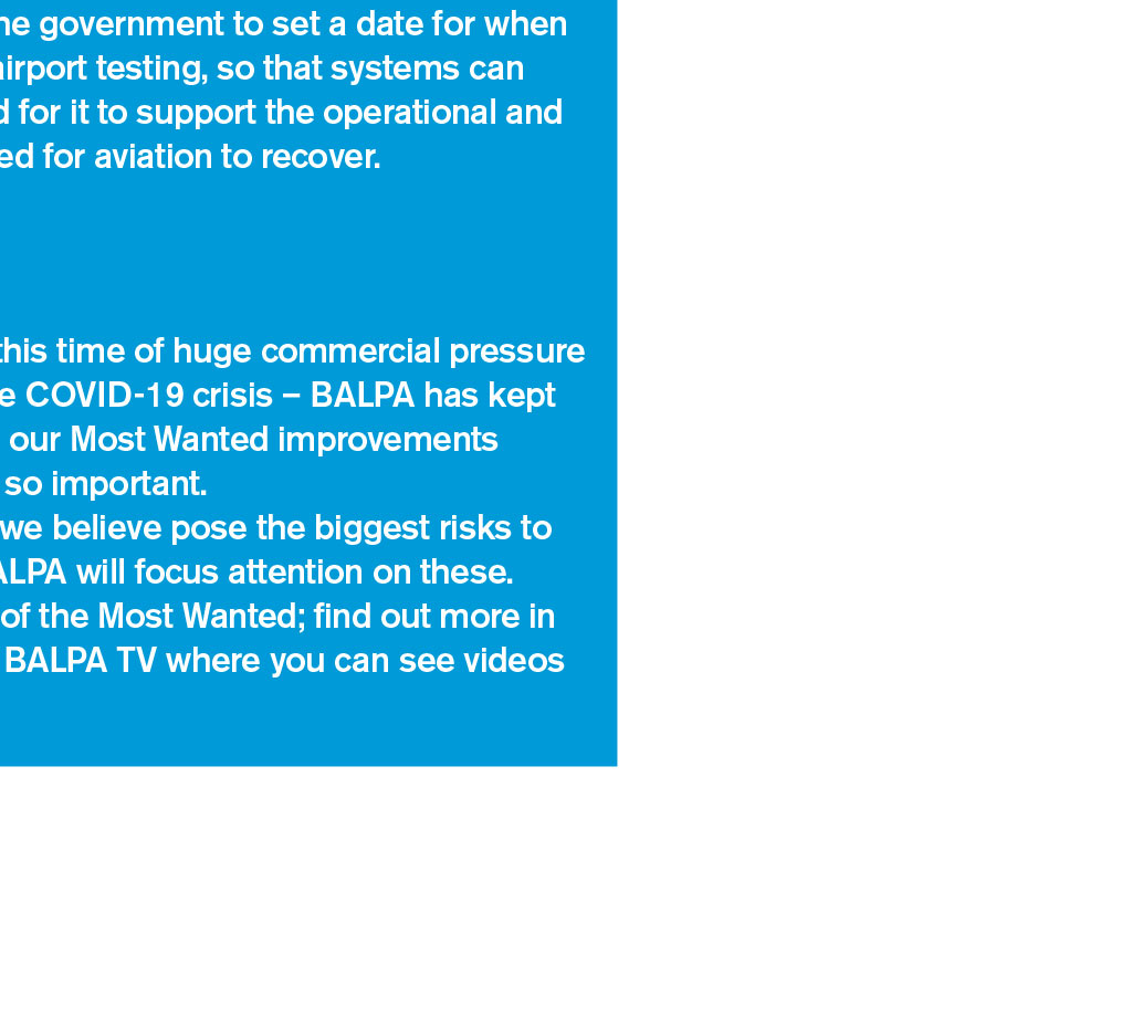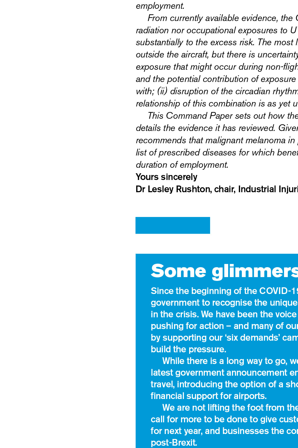 The latest in aviation and industrial news from around the world READ MORE Executive Presidents welcome Invasive keratinising squamous cell carcinoma of the skin When I signed off my last foreword for The Log, I wrote that I hoped we might see glimpses of a better future. Well, it appears we could be heading in the right direction. Its still very early days but, as I write this, the first arms are preparing to receive the COVID-19 vaccine. Lets hope this portends a change in consumer confidence and a willingness to begin travelling again. This is another great edition of The Log, with features on the re-certification of the 737 Max; our new flight safety strategy, Most Wanted; and collaborative work with our colleagues at GATCO. As the year comes to a close, I want to pay tribute to the team who have continued to put The Log together in such difficult circumstances. I also want to put on record my deep debt of gratitude to the reps and staff who have kept BALPA going and who have continued to deliver for you, and especially to the staff who will be sadly leaving us at the end of the year. Thank you for your continued support. It will take quite some time for our industry to mitigate the devastation caused in 2020. However, it appears that the worst could be behind us. Heres to a better, brighter and more prosperous 2021 for us all. Safe flying, Paul Naylor, BALPA NEC Executive President and easyJet captain Malignant melanoma a prescribed disease Malignant melanoma in aircrew is set to become a prescribed disease (industrial injury) for which state pension benefits will be payable. There is a list of occupational diseases for which affected workers are eligible for pension payments, subject to certain criteria, and the list is added to as medical knowledge grows. The Industrial Injuries Advisory Council (IIAC) investigates the relationship between the disease and the occupation, and then makes a recommendation, or not, that the disease be added to the list of prescribed diseases. The recommendation takes the form of a published Command Paper, which is passed to the Secretary of State to initiate the amendment to the legislation that adds the new prescribed disease to the existing list. At this time of COVID-19, timescales are a little uncertain. However, it is highly likely that the amendment will happen in due course. BALPAs Rob Hunter, who is an aviation medicine and radiation specialist, gave evidence to the IIAC enquiry. The full Command Paper can be read at bit.ly/ IIACCommandPaper1. Below is an extract of the letter, from the IIAC chair to the Secretary of State, that introduces the Command Paper: READ MORE Executive Presidents welcome Around 15,000 newly diagnosed cases (cancer registrations) of melanoma occur each year in the UK (half in women), and approximately 2,500 deaths. In both sexes the risk rises with age, but a little more so in men. The key triggers leading to malignant transformation of melanocytes (the pigment cells of the skin) have yet to be fully elucidated, but are multifactorial and include UV radiation damage and genetic susceptibility. The investigation carried out by the Council established that the evidence base for an increased risk of the incidence of melanoma in aircrew both pilots and cabin crew is consistent and convincing; the pattern of an excess risk has not substantially changed by date of publication over the last 30 years although the exact magnitude varies between studies. An in-depth analysis of the scientific literature of melanoma incidence conclusively demonstrated a consistent doubling of risk for both pilots and cabin crew, and for pilots in particular, after 5,000 aggregated hours flying time. This corresponds to approximately five or more years aggregated duration of employment. From currently available evidence, the Council concluded that neither cosmic radiation nor occupational exposures to UV during flights are likely to contribute substantially to the excess risk. The most likely causes are: (i) UV exposure outside the aircraft, but there is uncertainty about the nature and patterns of UV exposure that might occur during non-flight work and during flight stopovers, and the potential contribution of exposure during recreational activities, together with; (ii) disruption of the circadian rhythm through shift work, although the exact relationship of this combination is as yet uncertain. This Command Paper sets out how the Council arrived at its conclusion and details the evidence it has reviewed. Given the clearly doubled risk, the Council recommends that malignant melanoma in pilots and cabin crew be added to the list of prescribed diseases for which benefit is payable, following five or more years duration of employment. Yours sincerely Dr Lesley Rushton, chair, Industrial Injuries Advisory Council Some glimmers of light Since the beginning of the COVID-19 outbreak, BALPA has called on the government to recognise the unique challenges the aviation industry faces in the crisis. We have been the voice of pilots, lobbying the government and pushing for action and many of our members have taken up the mantle by supporting our six demands campaign and writing to their MPs to help build the pressure. While there is a long way to go, we have seen glimmers of light in the latest government announcement ending the ban on international leisure travel, introducing the option of a shorter quarantine period and direct financial support for airports. We are not lifting the foot from the pedal, however. BALPA continues to call for more to be done to give customers the confidence to book holidays for next year, and businesses the confidence that UK aviation can cope post-Brexit. BALPA has renewed its calls for the government to set a date for when it aims to replace quarantining with airport testing, so that systems can be put in place. We have also pushed for it to support the operational and skills infrastructure that will be needed for aviation to 