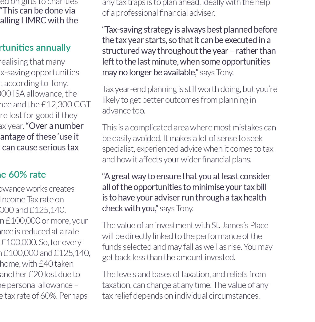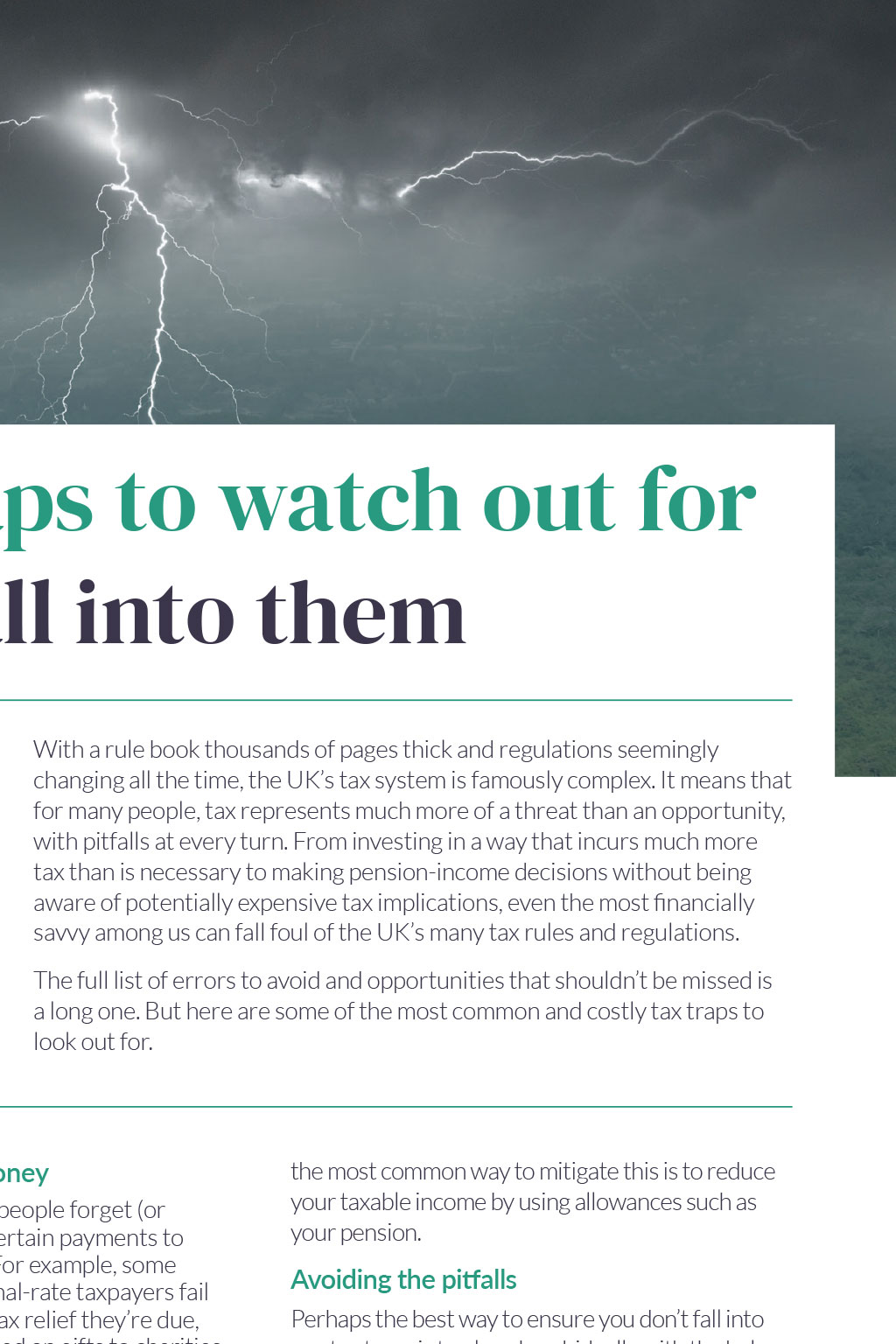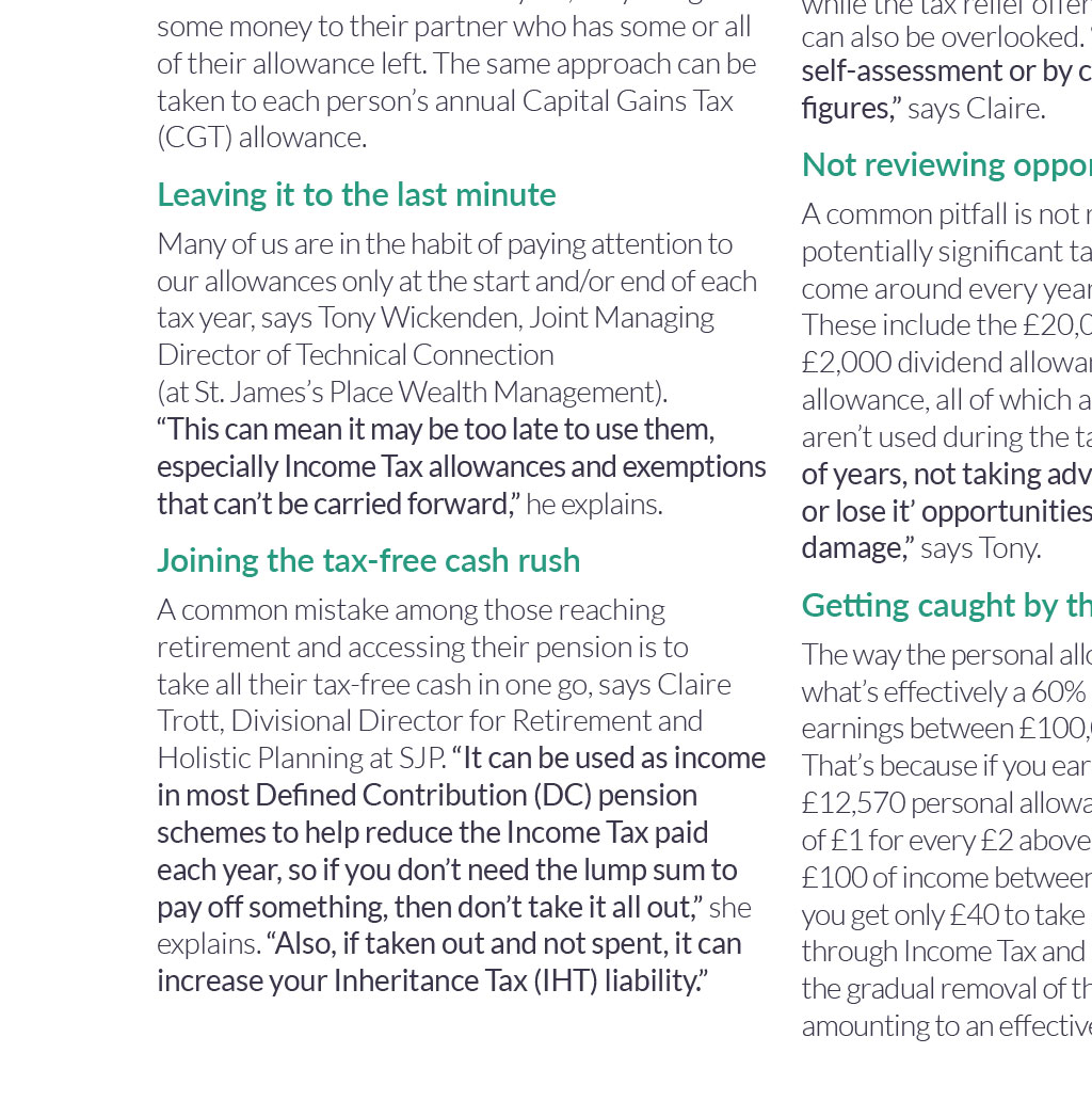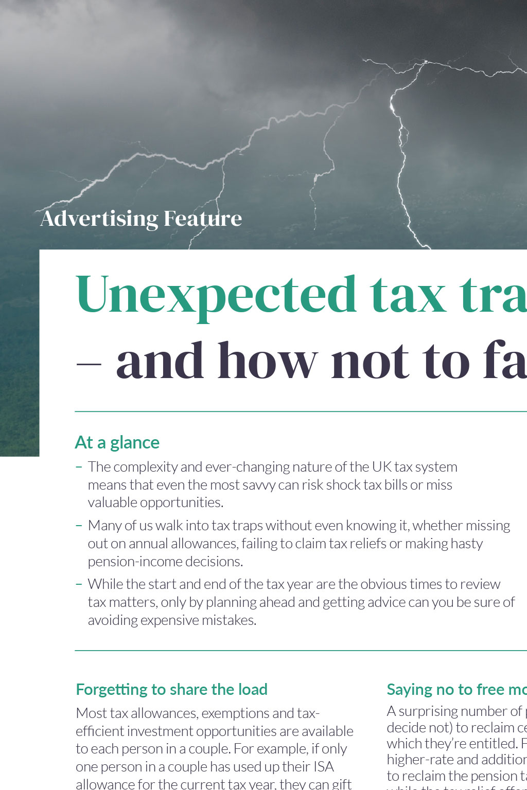 Advertising Feature Unexpected tax traps to watch out for and how not to fall into them At a glance The complexity and ever-changing nature of the UK tax system means that even the most savvy can risk shock tax bills or miss valuable opportunities. Many of us walk into tax traps without even knowing it, whether missing out on annual allowances, failing to claim tax reliefs or making hasty pension-income decisions. While the start and end of the tax year are the obvious times to review tax matters, only by planning ahead and getting advice can you be sure of avoiding expensive mistakes. With a rule book thousands of pages thick and regulations seemingly changing all the time, the UKs tax system is famously complex. It means that for many people, tax represents much more of a threat than an opportunity, with pitfalls at every turn. From investing in a way that incurs much more tax than is necessary to making pension-income decisions without being aware of potentially expensive tax implications, even the most financially savvy among us can fall foul of the UKs many tax rules and regulations. The full list of errors to avoid and opportunities that shouldnt be missed is a long one. But here are some of the most common and costly tax traps to look out for. Forgetting to share the load Saying no to free money Most tax allowances, exemptions and taxefficient investment opportunities are available to each person in a couple. For example, if only one person in a couple has used up their ISA allowance for the current tax year, they can gift some money to their partner who has some or all of their allowance left. The same approach can be taken to each persons annual Capital Gains Tax (CGT) allowance. A surprising number of people forget (or decide not) to reclaim certain payments to which theyre entitled. For example, some higher-rate and additional-rate taxpayers fail to reclaim the pension tax relief theyre due, while the tax relief offered on gifts to charities can also be overlooked. This can be done via self-assessment or by calling HMRC with the figures, says Claire. Leaving it to the last minute Many of us are in the habit of paying attention to our allowances only at the start and/or end of each tax year, says Tony Wickenden, Joint Managing Director of Technical Connection (at St. Jamess Place Wealth Management). This can mean it may be too late to use them, especially Income Tax allowances and exemptions that cant be carried forward, he explains. Joining the tax-free cash rush A common mistake among those reaching retirement and accessing their pension is to take all their tax-free cash in one go, says Claire Trott, Divisional Director for Retirement and Holistic Planning at SJP. It can be used as income in most Defined Contribution (DC) pension schemes to help reduce the Income Tax paid each year, so if you dont need the lump sum to pay off something, then dont take it all out, she explains. Also, if taken out and not spent, it can increase your Inheritance Tax (IHT) liability. Not reviewing opportunities annually A common pitfall is not realising that many potentially significant tax-saving opportunities come around every year, according to Tony. These include the 20,000 ISA allowance, the 2,000 dividend allowance and the 12,300 CGT allowance, all of which are lost for good if they arent used during the tax year. Over a number of years, not taking advantage of these use it or lose it opportunities can cause serious tax damage, says Tony. Getting caught by the 60% rate The way the personal allowance works creates whats effectively a 60% Income Tax rate on earnings between 100,000 and 125,140. Thats because if you earn 100,000 or more, your 12,570 personal allowance is reduced at a rate of 1 for every 2 above 100,000. So, for every 100 of income between 100,000 and 125,140, you get only 40 to take home, with 40 taken through Income Tax and another 20 lost due to the gradual removal of the personal allowance amounting to an effective tax rate of 60%. Perhaps the most common way to mitigate this is to reduce your taxable income by using allowances such as your pension. Avoiding the pitfalls Perhaps the best way to ensure you dont fall into any tax traps is to plan ahead, ideally with the help of a professional financial adviser. Tax-saving strategy is always best planned before the tax year starts, so that it can be executed in a structured way throughout the year rather than left to the last minute, when some opportunities may no longer be available, says Tony. Tax year-end planning is still worth doing, but youre likely to get better outcomes from planning in advance too. This is a complicated area where most mistakes can be easily avoided. It makes a lot of sense to seek specialist, experienced advice when it comes to tax and how it affects your wider financial plans. A great way to ensure that you at least consider all of the opportunities to minimise your tax bill is to have your adviser run through a tax health check with you, says Tony. The value of an investment with St. Jamess Place will be directly linked to the performance of the funds selected and may fall as well as rise. You may get back less than the amount invested. The levels and bases of taxation, and reliefs from taxation, can change at any time. The value of any tax relief depends on individual circumstances.
