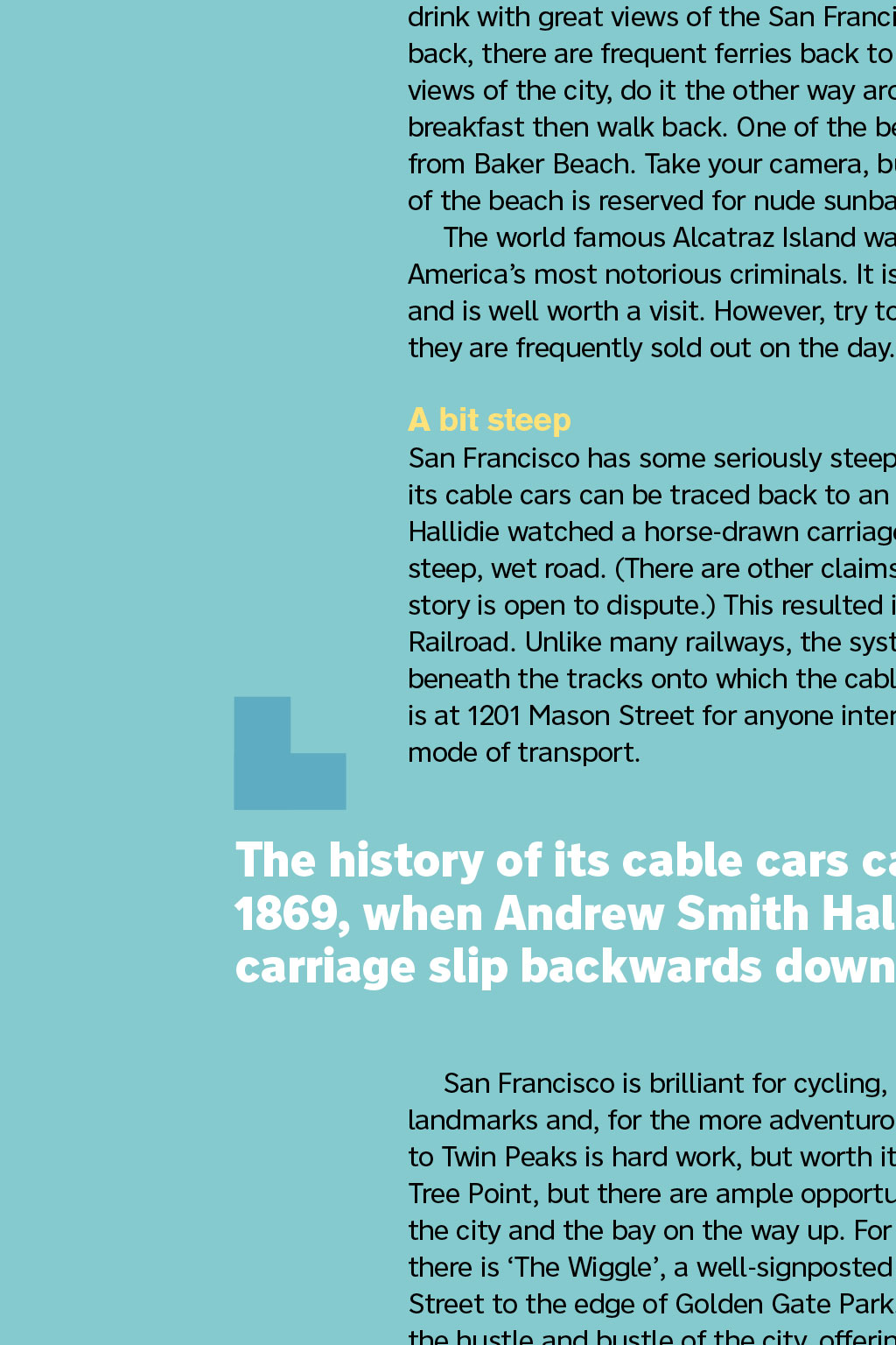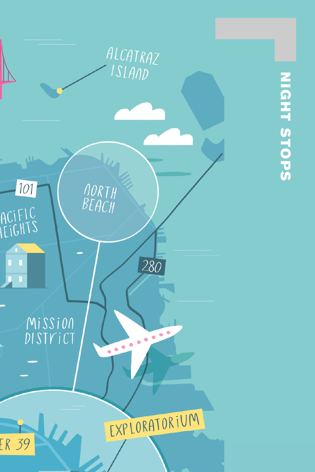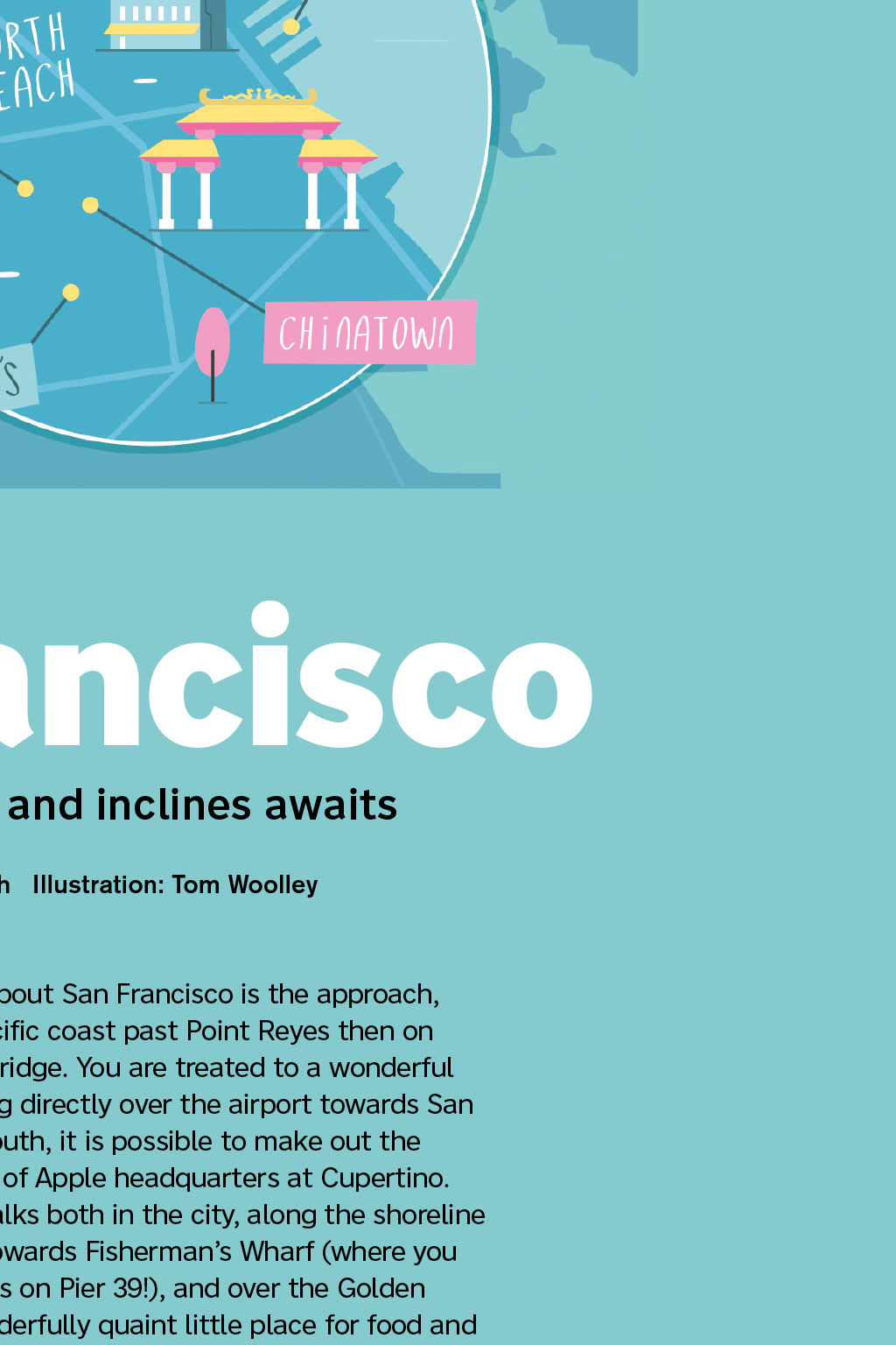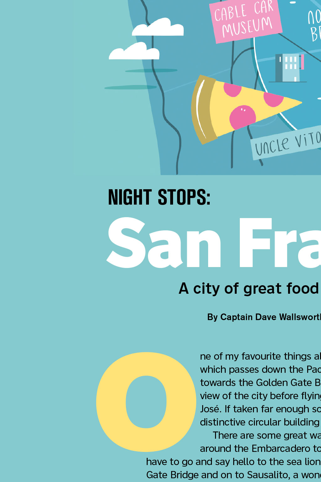 NIGHT STOPS: San Francisco A city of great food and inclines awaits By Captain Dave Wallsworth Illustration: Tom Woolley ne of my favourite things about San Francisco is the approach, which passes down the Pacific coast past Point Reyes then on towards the Golden Gate Bridge. You are treated to a wonderful view of the city before flying directly over the airport towards San Jos. If taken far enough south, it is possible to make out the distinctive circular building of Apple headquarters at Cupertino. There are some great walks both in the city, along the shoreline around the Embarcadero towards Fishermans Wharf (where you have to go and say hello to the sea lions on Pier 39!), and over the Golden Gate Bridge and on to Sausalito, a wonderfully quaint little place for food and drink with great views of the San Francisco skyline. If you dont want to walk back, there are frequent ferries back to the city. Alternatively, for the best views of the city, do it the other way around and take the ferry to Sausalito for breakfast then walk back. One of the best views of the Golden Gate Bridge is from Baker Beach. Take your camera, but be careful where you point it as part of the beach is reserved for nude sunbathing! The world famous Alcatraz Island was once a federal prison holding Americas most notorious criminals. It is only 15 minutes by ferry from the city, and is well worth a visit. However, try to book your tickets in advance because they are frequently sold out on the day. A bit steep San Francisco has some seriously steep roads and sidewalks. The history of its cable cars can be traced back to an incident in 1869, when Andrew Smith Hallidie watched a horse-drawn carriage slip backwards down a particularly steep, wet road. (There are other claims to the origin of the cable cars, so this story is open to dispute.) This resulted in the creation of the Clay Street Hill Railroad. Unlike many railways, the system uses a constantly moving cable beneath the tracks onto which the cable cars grip. The Cable Car Museum is at 1201 Mason Street for anyone interested in the full history of this iconic mode of transport. The history of its cable cars can be traced back to 1869, when Andrew Smith Hallidie watched a horse carriage slip backwards down a steep, wet road San Francisco is brilliant for cycling, both within the city, around the historic landmarks and, for the more adventurous, the surrounding areas. The ride up to Twin Peaks is hard work, but worth it. The top of the climb is at Christmas Tree Point, but there are ample opportunities to stop and enjoy the views over the city and the bay on the way up. For those who prefer a flatter cycle route, there is The Wiggle, a well-signposted mile around the city from Market Street to the edge of Golden Gate Park. This is a wonderful getaway from the hustle and bustle of the city, offering more than 1,000 acres of parkland and attractions such as the Japanese Tea Garden, the California Academy of Sciences, the de Young Museum and the Conservatory of Flowers. Exploring the area The Exploratorium on Pier 15 is fabulous. I took my kids when they were 11 and seven. It was a good job we arrived early because we spent the whole day there. Im still not sure if it was the adults or children who didnt want to leave. It has an enormous number of displays and exhibitions, but the best parts are the hands-on experiments and demonstrations. You will spend a whole day here if you have an inquisitive mind. San Franciscos Chinatown is the oldest of its kind in north America and the largest outside Asia, created as a result of the large number of immigrants during the 1800s. You probably wont find a better Chinese meal anywhere else in the USA. Other notable areas for superb food are Japantown, Little Italy and my favourite pizzeria, Uncle Vitos, which is towards the top of the wonderfully named Nob Hill, on the corner of Powell Street and Bush Street. Dont expect anywhere plush, but do expect the best pizza in San Francisco.