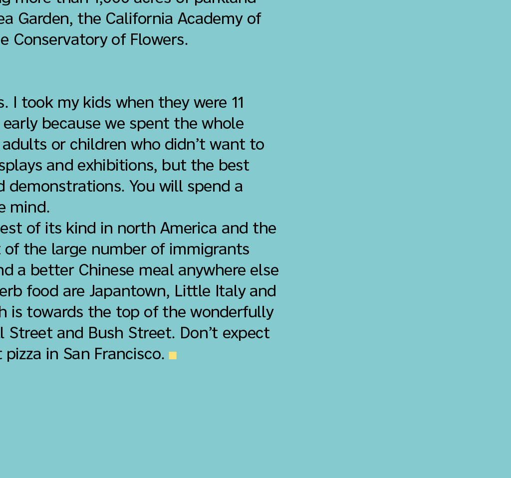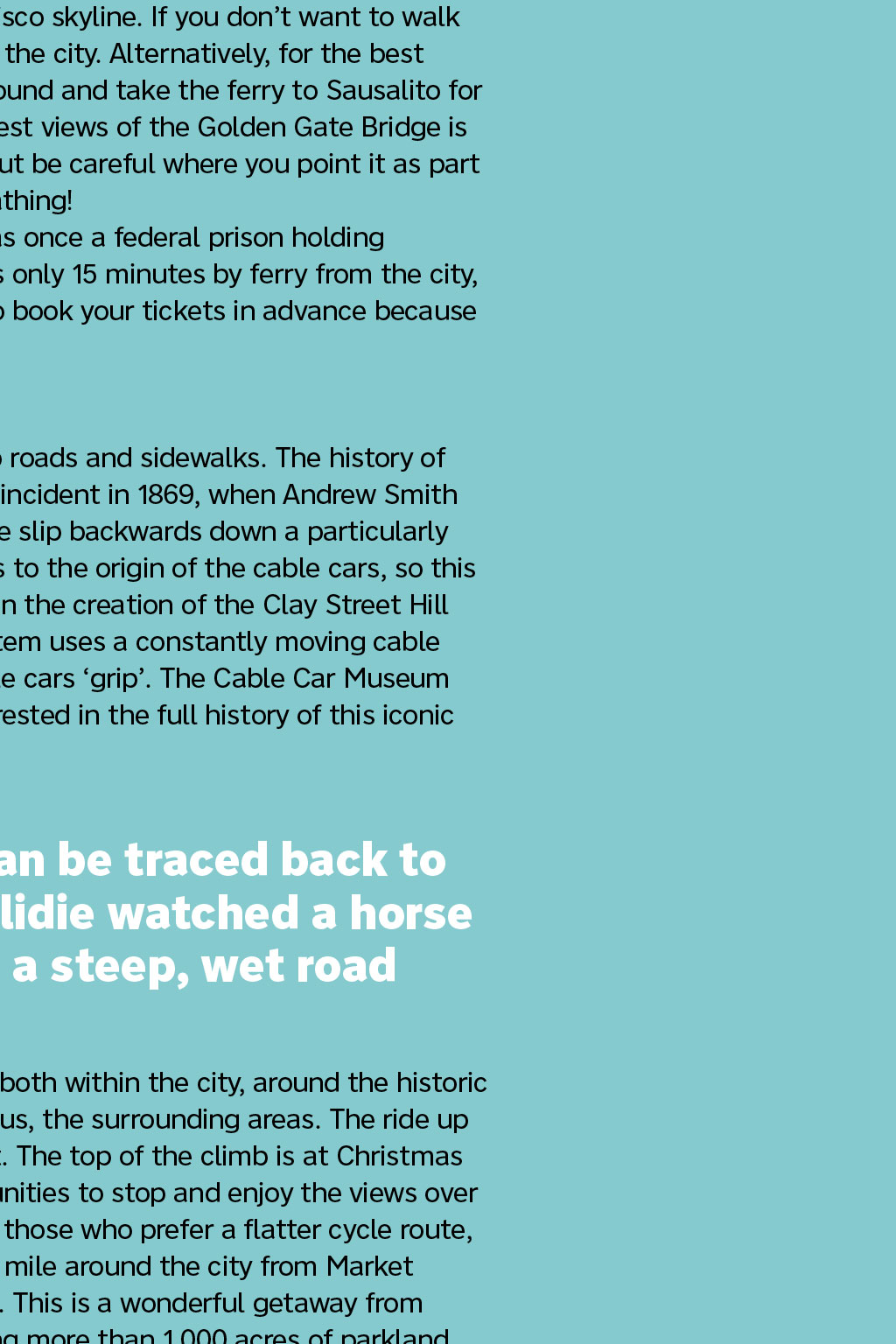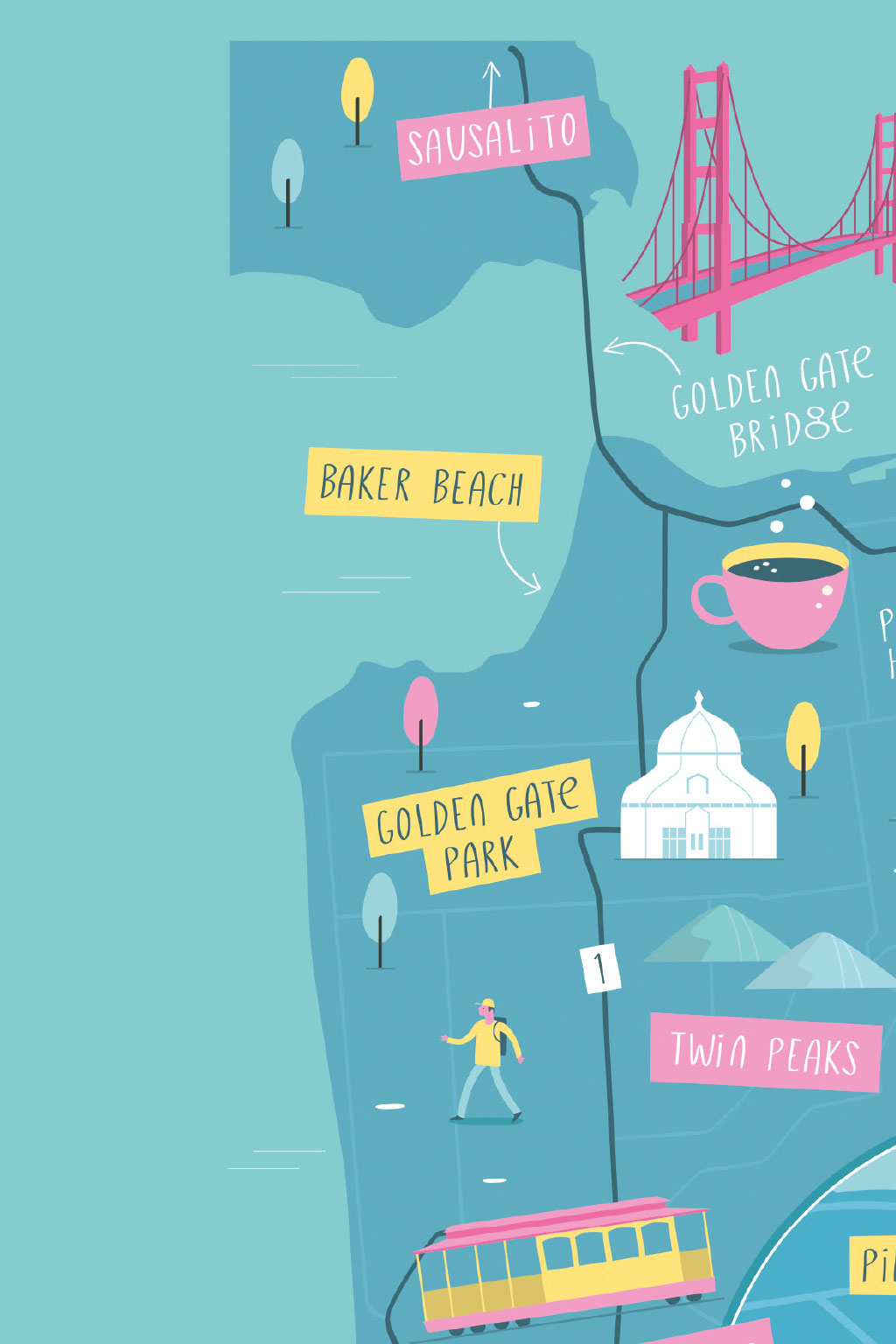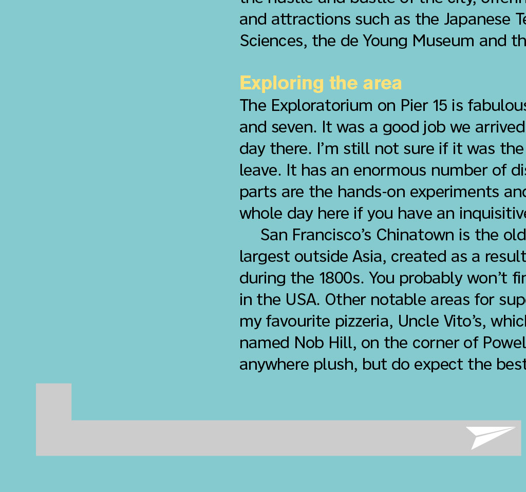 NIGHT STOPS: San Francisco A city of great food and inclines awaits By Captain Dave Wallsworth Illustration: Tom Woolley ne of my favourite things about San Francisco is the approach, which passes down the Pacific coast past Point Reyes then on towards the Golden Gate Bridge. You are treated to a wonderful view of the city before flying directly over the airport towards San Jos. If taken far enough south, it is possible to make out the distinctive circular building of Apple headquarters at Cupertino. There are some great walks both in the city, along the shoreline around the Embarcadero towards Fishermans Wharf (where you have to go and say hello to the sea lions on Pier 39!), and over the Golden Gate Bridge and on to Sausalito, a wonderfully quaint little place for food and drink with great views of the San Francisco skyline. If you dont want to walk back, there are frequent ferries back to the city. Alternatively, for the best views of the city, do it the other way around and take the ferry to Sausalito for breakfast then walk back. One of the best views of the Golden Gate Bridge is from Baker Beach. Take your camera, but be careful where you point it as part of the beach is reserved for nude sunbathing! The world famous Alcatraz Island was once a federal prison holding Americas most notorious criminals. It is only 15 minutes by ferry from the city, and is well worth a visit. However, try to book your tickets in advance because they are frequently sold out on the day. A bit steep San Francisco has some seriously steep roads and sidewalks. The history of its cable cars can be traced back to an incident in 1869, when Andrew Smith Hallidie watched a horse-drawn carriage slip backwards down a particularly steep, wet road. (There are other claims to the origin of the cable cars, so this story is open to dispute.) This resulted in the creation of the Clay Street Hill Railroad. Unlike many railways, the system uses a constantly moving cable beneath the tracks onto which the cable cars grip. The Cable Car Museum is at 1201 Mason Street for anyone interested in the full history of this iconic mode of transport. The history of its cable cars can be traced back to 1869, when Andrew Smith Hallidie watched a horse carriage slip backwards down a steep, wet road San Francisco is brilliant for cycling, both within the city, around the historic landmarks and, for the more adventurous, the surrounding areas. The ride up to Twin Peaks is hard work, but worth it. The top of the climb is at Christmas Tree Point, but there are ample opportunities to stop and enjoy the views over the city and the bay on the way up. For those who prefer a flatter cycle route, there is The Wiggle, a well-signposted mile around the city from Market Street to the edge of Golden Gate Park. This is a wonderful getaway from the hustle and bustle of the city, offering more than 1,000 acres of parkland and attractions such as the Japanese Tea Garden, the California Academy of Sciences, the de Young Museum and the Conservatory of Flowers. Exploring the area The Exploratorium on Pier 15 is fabulous. I took my kids when they were 11 and seven. It was a good job we arrived early because we spent the whole day there. Im still not sure if it was the adults or children who didnt want to leave. It has an enormous number of displays and exhibitions, but the best parts are the hands-on experiments and demonstrations. You will spend a whole day here if you have an inquisitive mind. San Franciscos Chinatown is the oldest of its kind in north America and the largest outside Asia, created as a result of the large number of immigrants during the 1800s. You probably wont find a better Chinese meal anywhere else in the USA. Other notable areas for superb food are Japantown, Little Italy and my favourite pizzeria, Uncle Vitos, which is towards the top of the wonderfully named Nob Hill, on the corner of Powell Street and Bush Street. Dont expect anywhere plush, but do expect the best pizza in San Francisco.