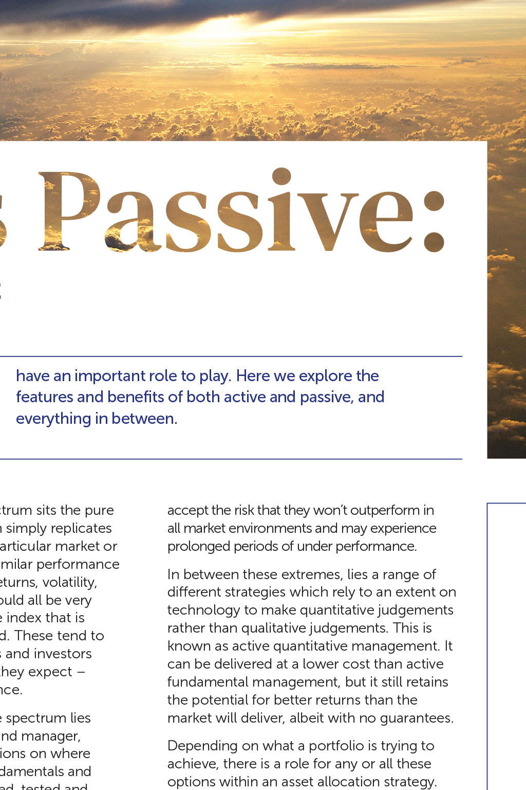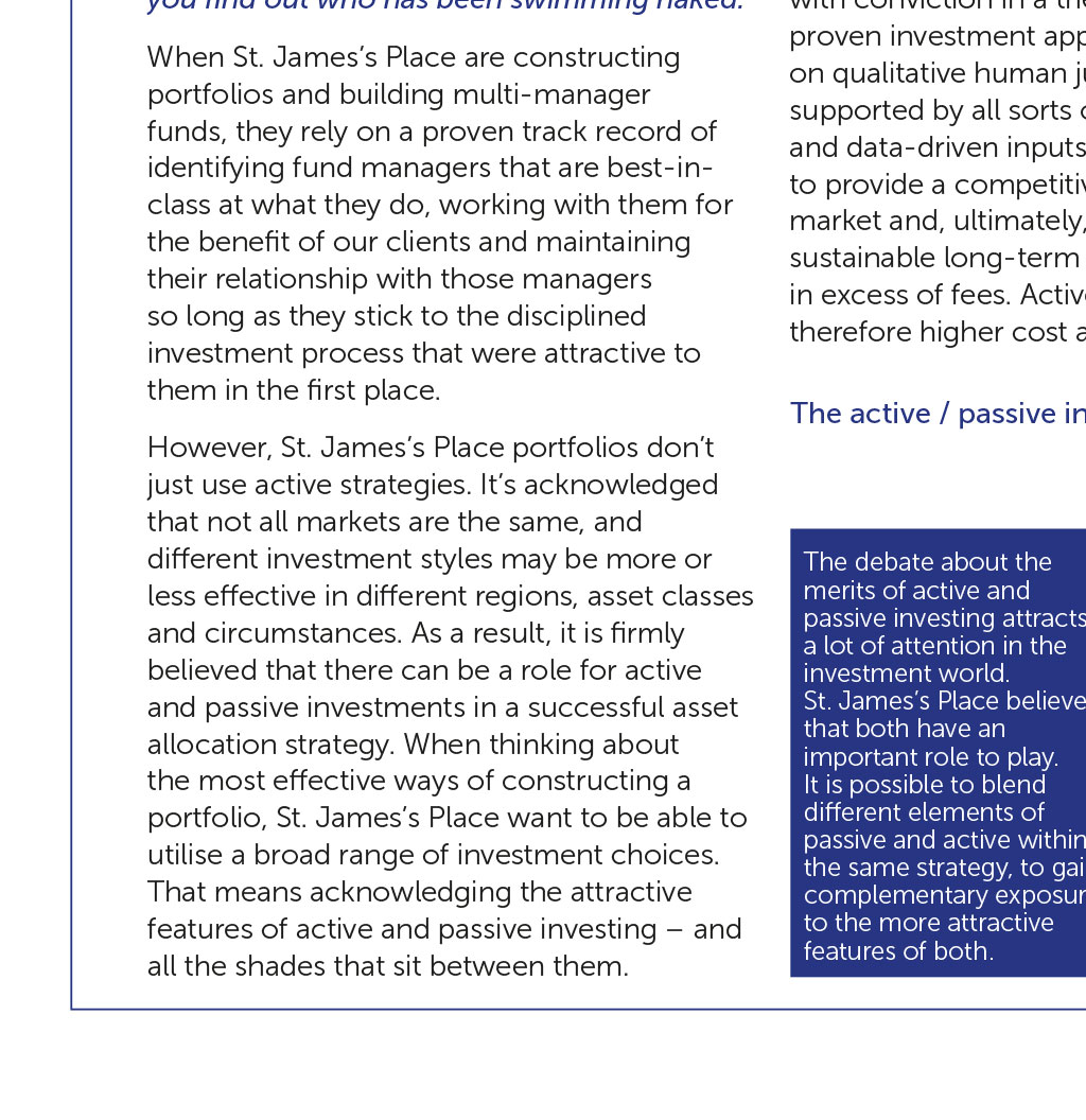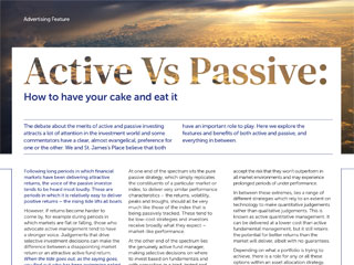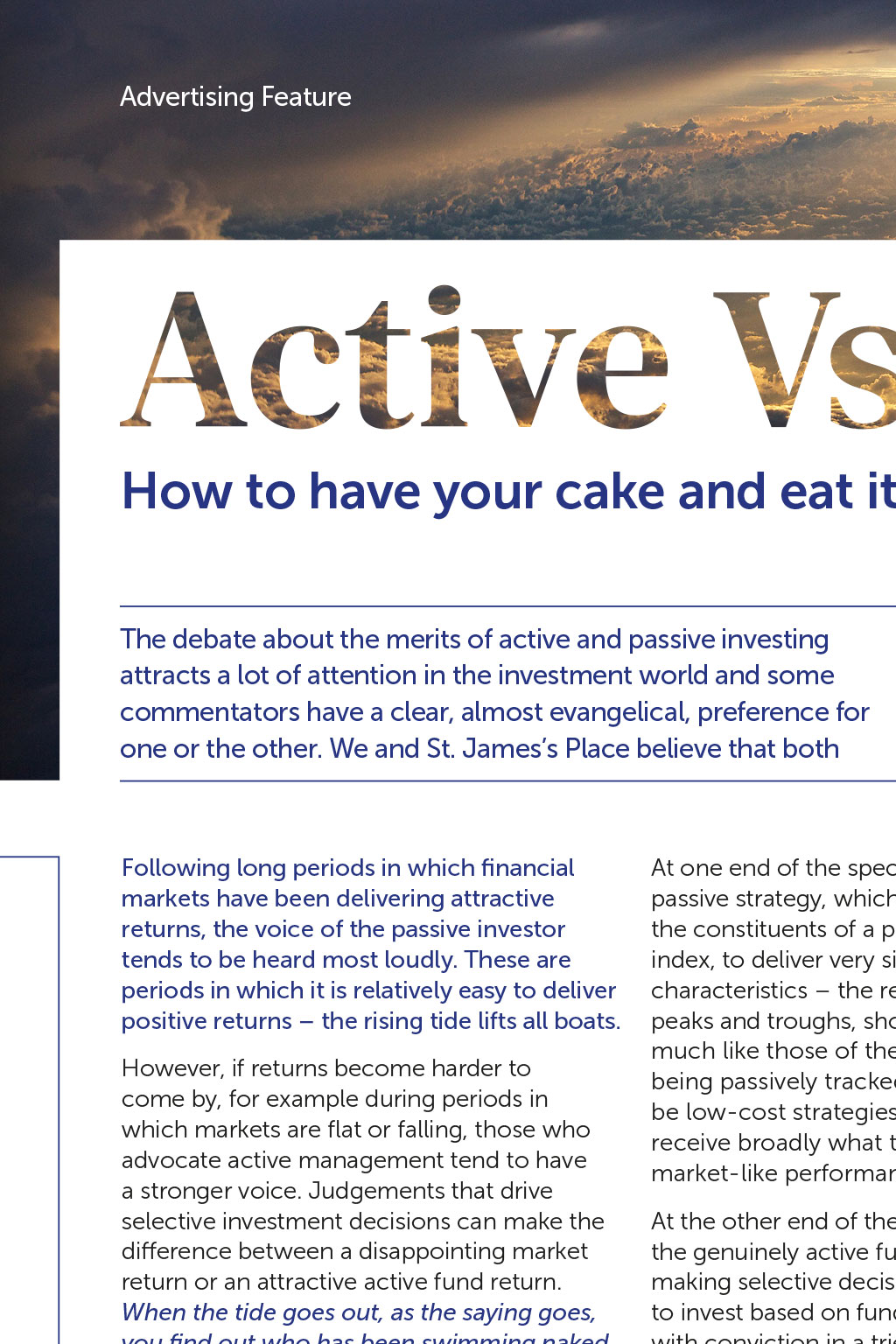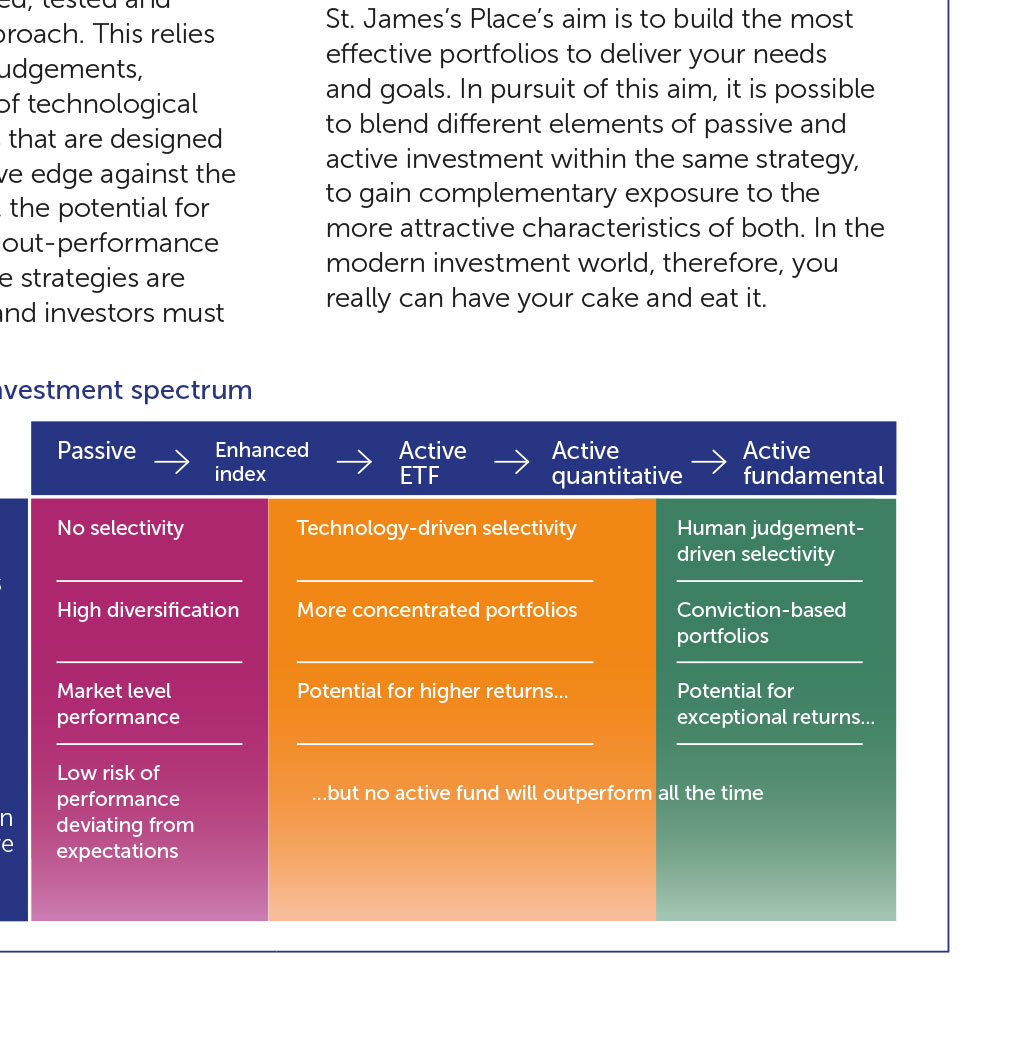 Advertising Feature How to have your cake and eat it The debate about the merits of active and passive investing attracts a lot of attention in the investment world and some commentators have a clear, almost evangelical, preference for one or the other. We and St. Jamess Place believe that both Following long periods in which financial markets have been delivering attractive returns, the voice of the passive investor tends to be heard most loudly. These are periods in which it is relatively easy to deliver positive returns the rising tide lifts all boats. However, if returns become harder to come by, for example during periods in which markets are flat or falling, those who advocate active management tend to have a stronger voice. Judgements that drive selective investment decisions can make the difference between a disappointing market return or an attractive active fund return. When the tide goes out, as the saying goes, you find out who has been swimming naked. When St. Jamess Place are constructing portfolios and building multi-manager funds, they rely on a proven track record of identifying fund managers that are best-inclass at what they do, working with them for the benefit of our clients and maintaining their relationship with those managers so long as they stick to the disciplined investment process that were attractive to them in the first place. However, St. Jamess Place portfolios dont just use active strategies. Its acknowledged that not all markets are the same, and different investment styles may be more or less effective in different regions, asset classes and circumstances. As a result, it is firmly believed that there can be a role for active and passive investments in a successful asset allocation strategy. When thinking about the most effective ways of constructing a portfolio, St. Jamess Place want to be able to utilise a broad range of investment choices. That means acknowledging the attractive features of active and passive investing and all the shades that sit between them.rsay. have an important role to play. Here we explore the features and benefits of both active and passive, and everything in between. At one end of the spectrum sits the pure passive strategy, which simply replicates the constituents of a particular market or index, to deliver very similar performance characteristics the returns, volatility, peaks and troughs, should all be very much like those of the index that is being passively tracked. These tend to be low-cost strategies and investors receive broadly what they expect market-like performance. accept the risk that they wont outperform in all market environments and may experience prolonged periods of under performance. In between these extremes, lies a range of different strategies which rely to an extent on technology to make quantitative judgements rather than qualitative judgements. This is known as active quantitative management. It can be delivered at a lower cost than active fundamental management, but it still retains the potential for better returns than the market will deliver, albeit with no guarantees. At the other end of the spectrum lies the genuinely active fund manager, making selective decisions on where to invest based on fundamentals and with conviction in a tried, tested and proven investment approach. This relies on qualitative human judgements, supported by all sorts of technological and data-driven inputs that are designed to provide a competitive edge against the market and, ultimately, the potential for sustainable long-term out-performance in excess of fees. Active strategies are therefore higher cost and investors must Depending on what a portfolio is trying to achieve, there is a role for any or all these options within an asset allocation strategy. St. Jamess Places aim is to build the most effective portfolios to deliver your needs and goals. In pursuit of this aim, it is possible to blend different elements of passive and active investment within the same strategy, to gain complementary exposure to the more attractive characteristics of both. In the modern investment world, therefore, you really can have your cake and eat it. The active / passive investment spectrum Passive The debate about the merits of active and passive investing attracts a lot of attention in the investment world. St. Jamess Place believe that both have an important role to play. It is possible to blend different elements of passive and active within the same strategy, to gain complementary exposure to the more attractive features of both. Enhanced index Active ETF Active quantitative Active fundamental No selectivity Technology-driven selectivity Human judgementdriven selectivity High diversification More concentrated portfolios Conviction-based portfolios Market level performance Potential for higher returns... Potential for exceptional returns... Low risk of performance deviating from expectations ...but no active fund will outperform all the time